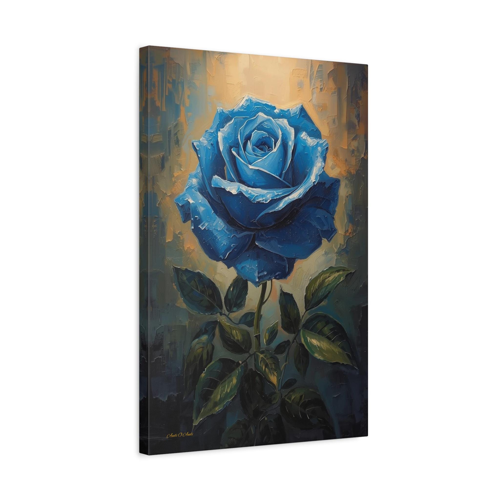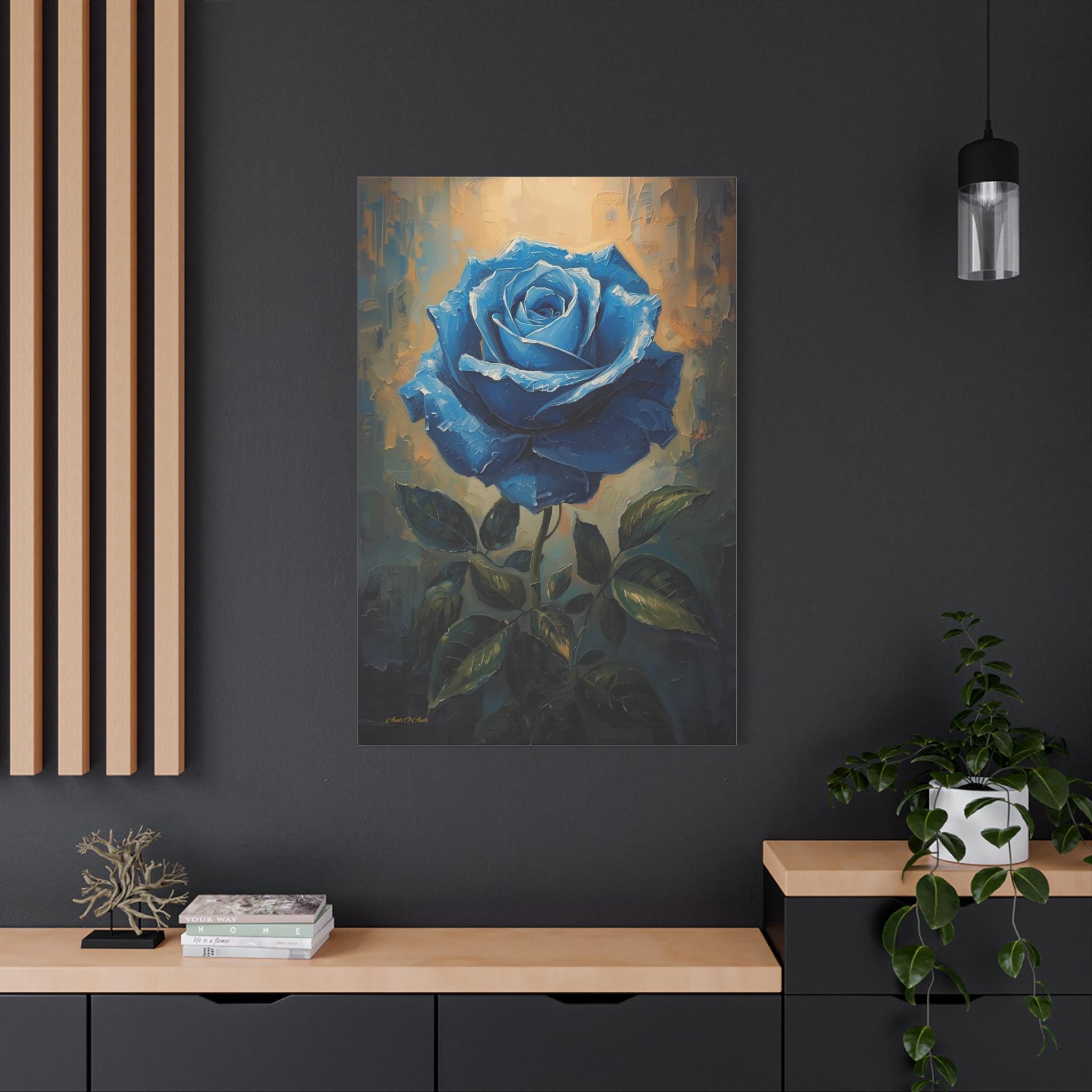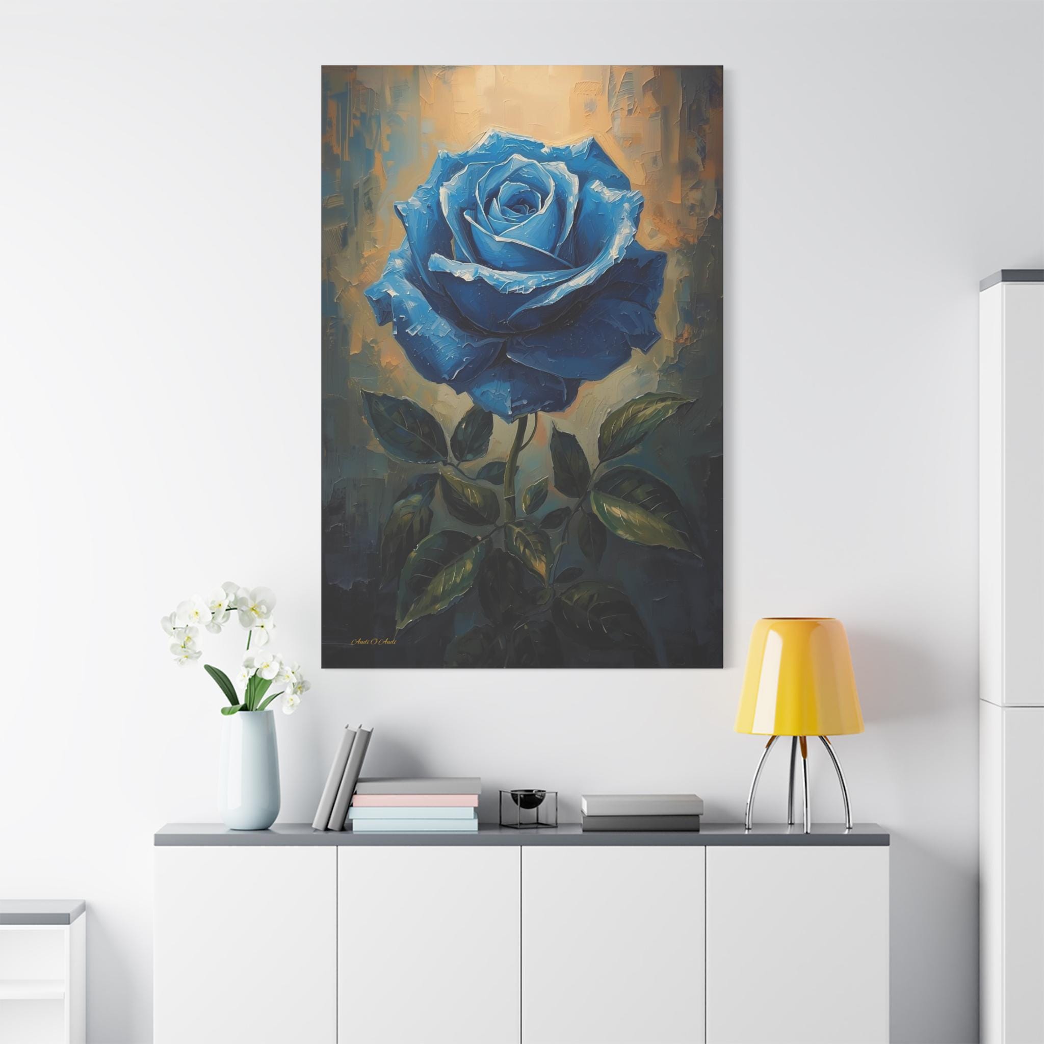 Capture the allure of the impossible with this stunning canvas print of a blooming Blue Rose. A symbol of mystery and unique beauty, this artwork features a large, majestic rose in shades of deep sapphire, cerulean, and icy blue, set against a warm, abstract background of gold and ochre.