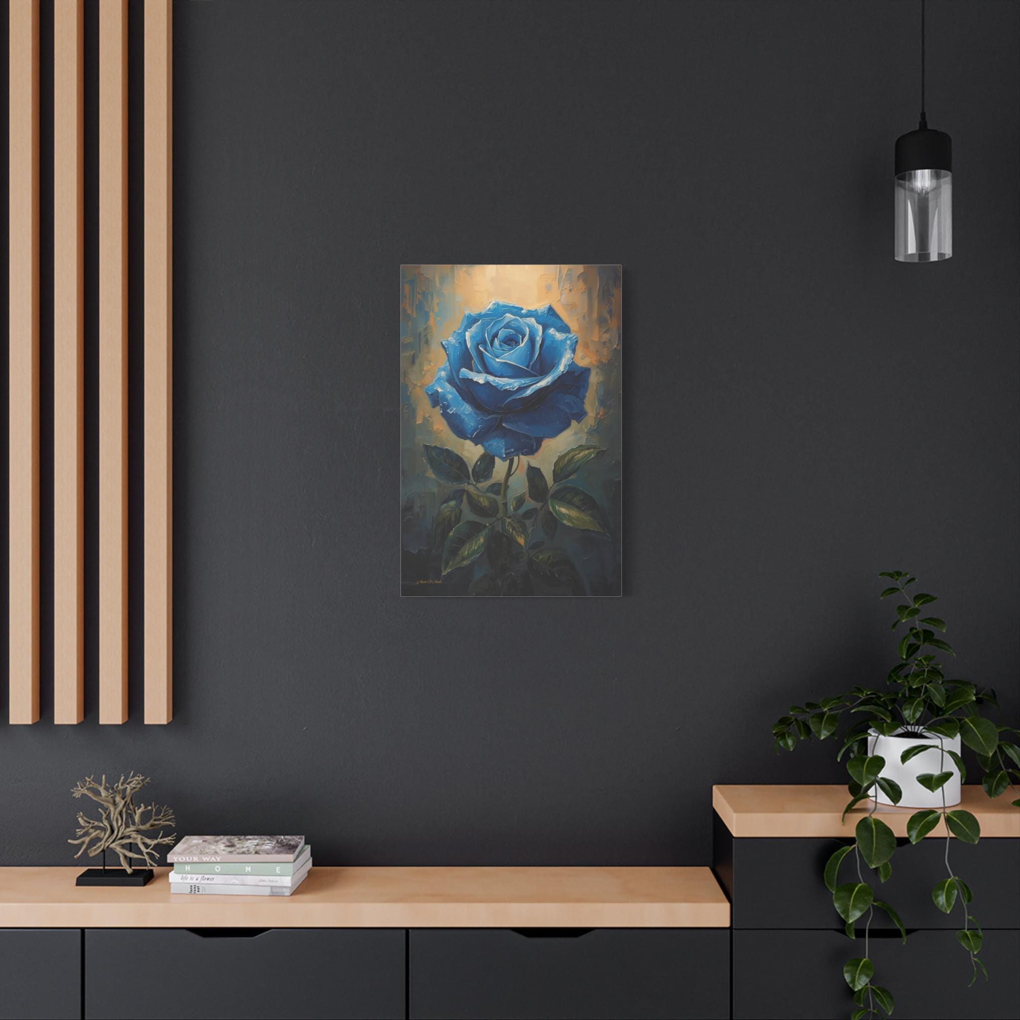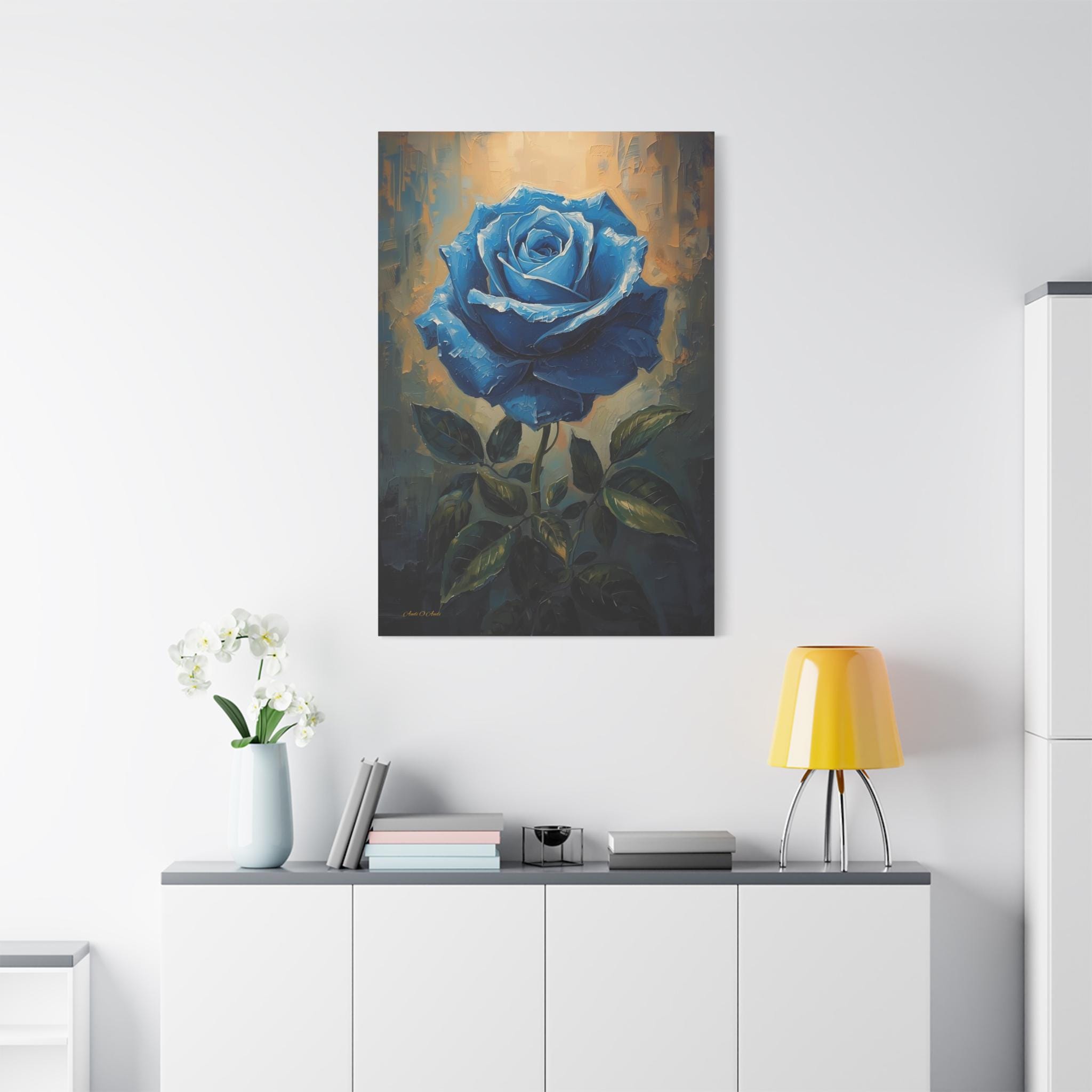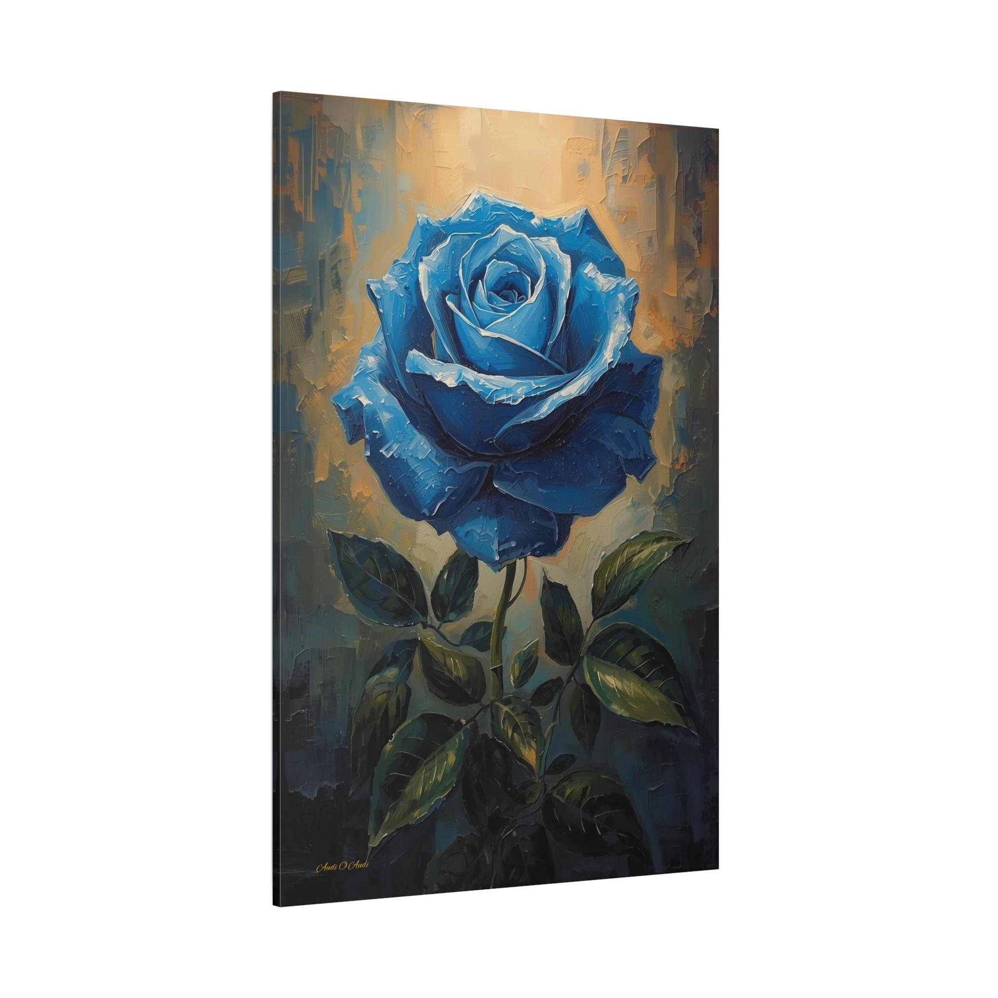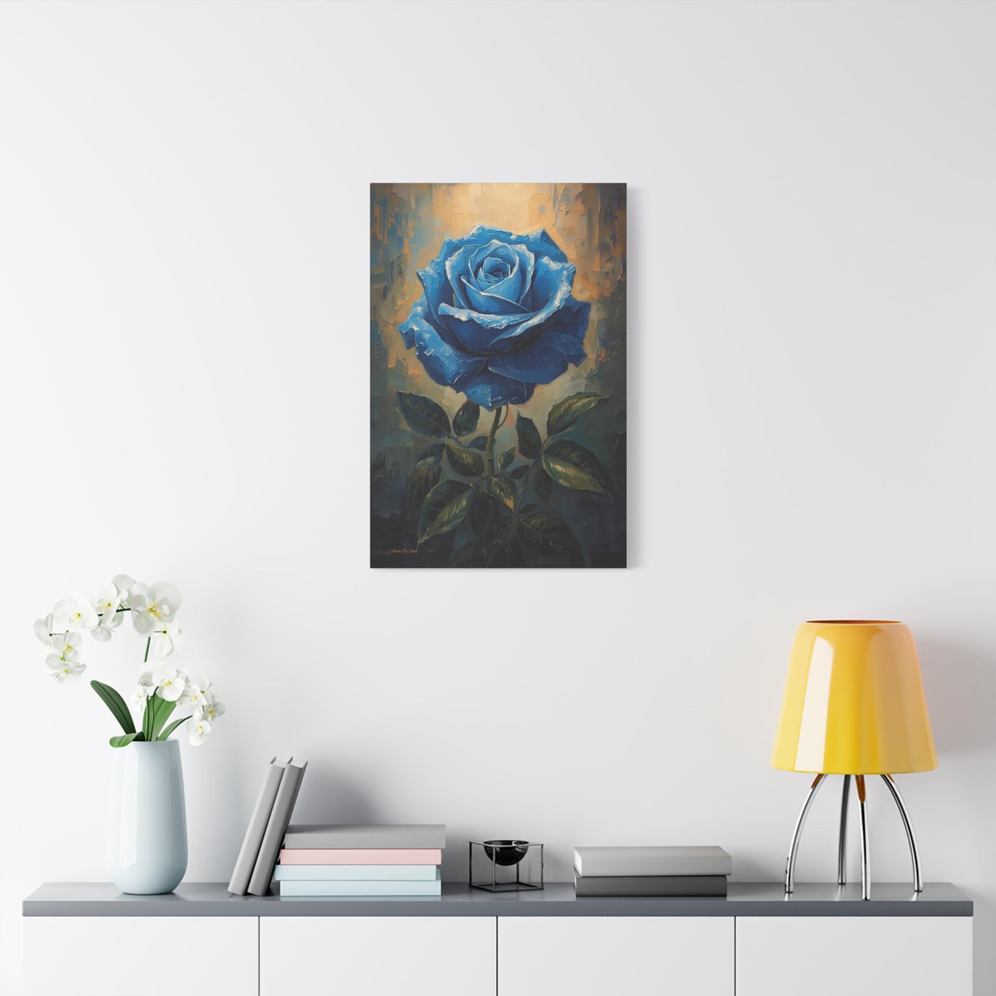 Capture the allure of the impossible with this stunning canvas print of a blooming Blue Rose. A symbol of mystery and unique beauty, this artwork features a large, majestic rose in shades of deep sapphire, cerulean, and icy blue, set against a warm, abstract background of gold and ochre.