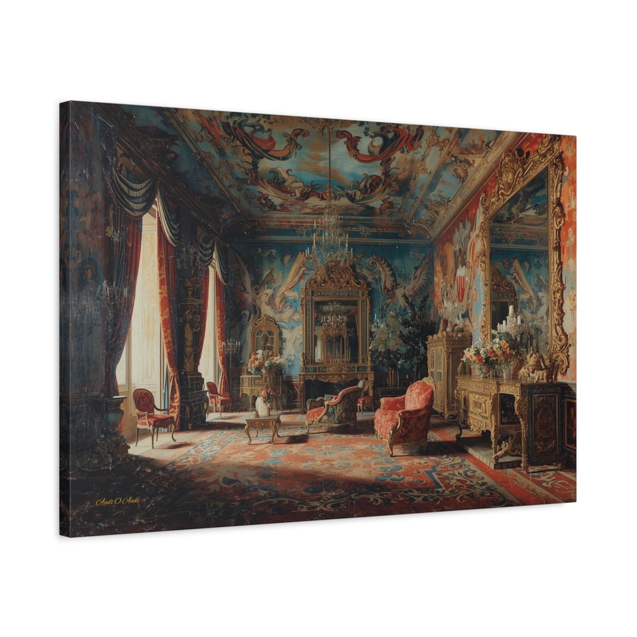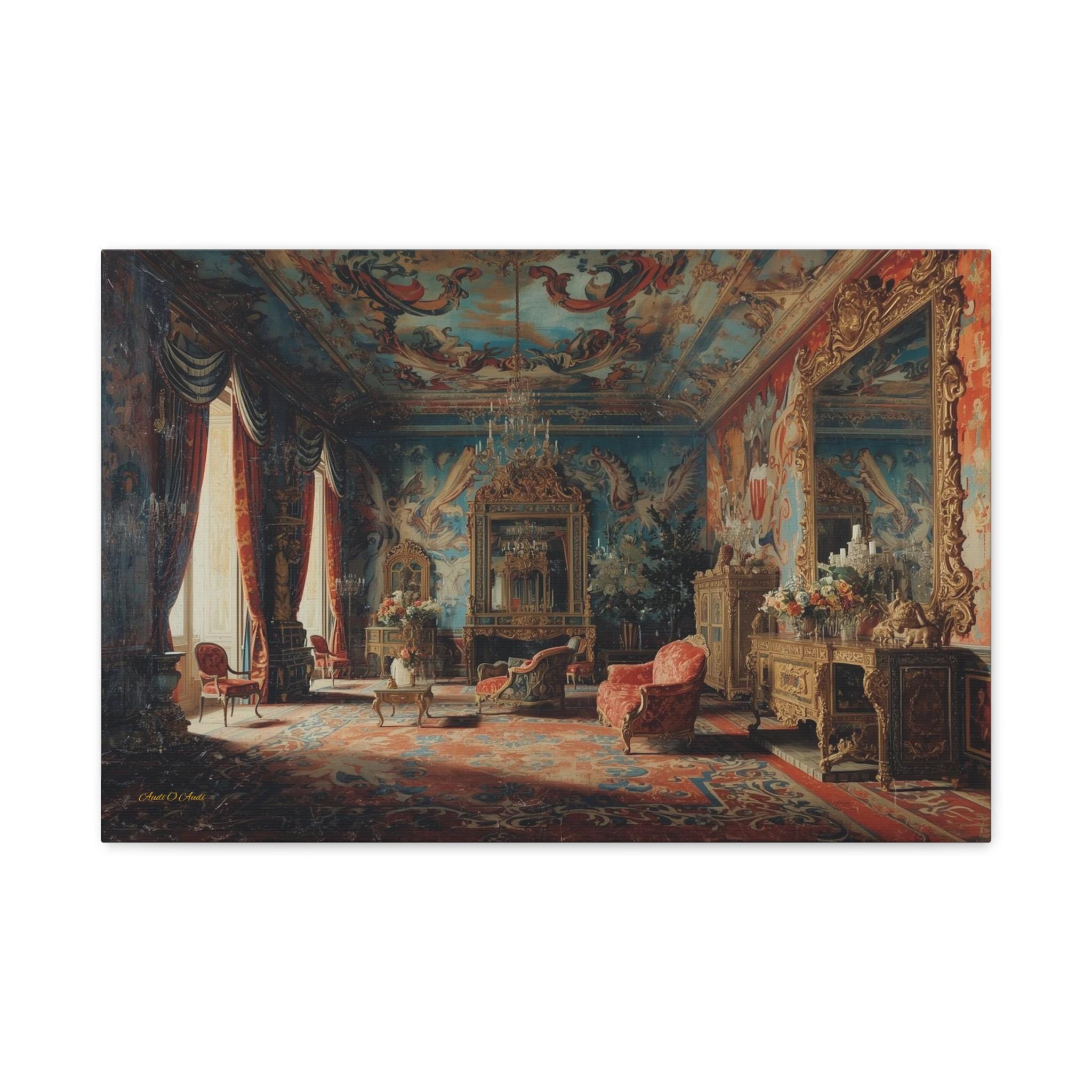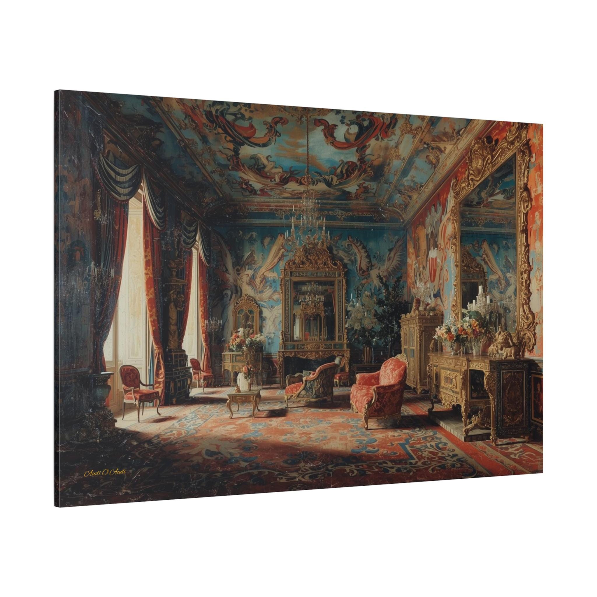 Transform your home into a royal estate with this magnificent canvas print of an 18th-century palace interior. This incredibly detailed artwork captures a grand salon dripping with Rococo opulence—featuring frescoed ceilings, massive gilded mirrors, and plush red velvet furniture.