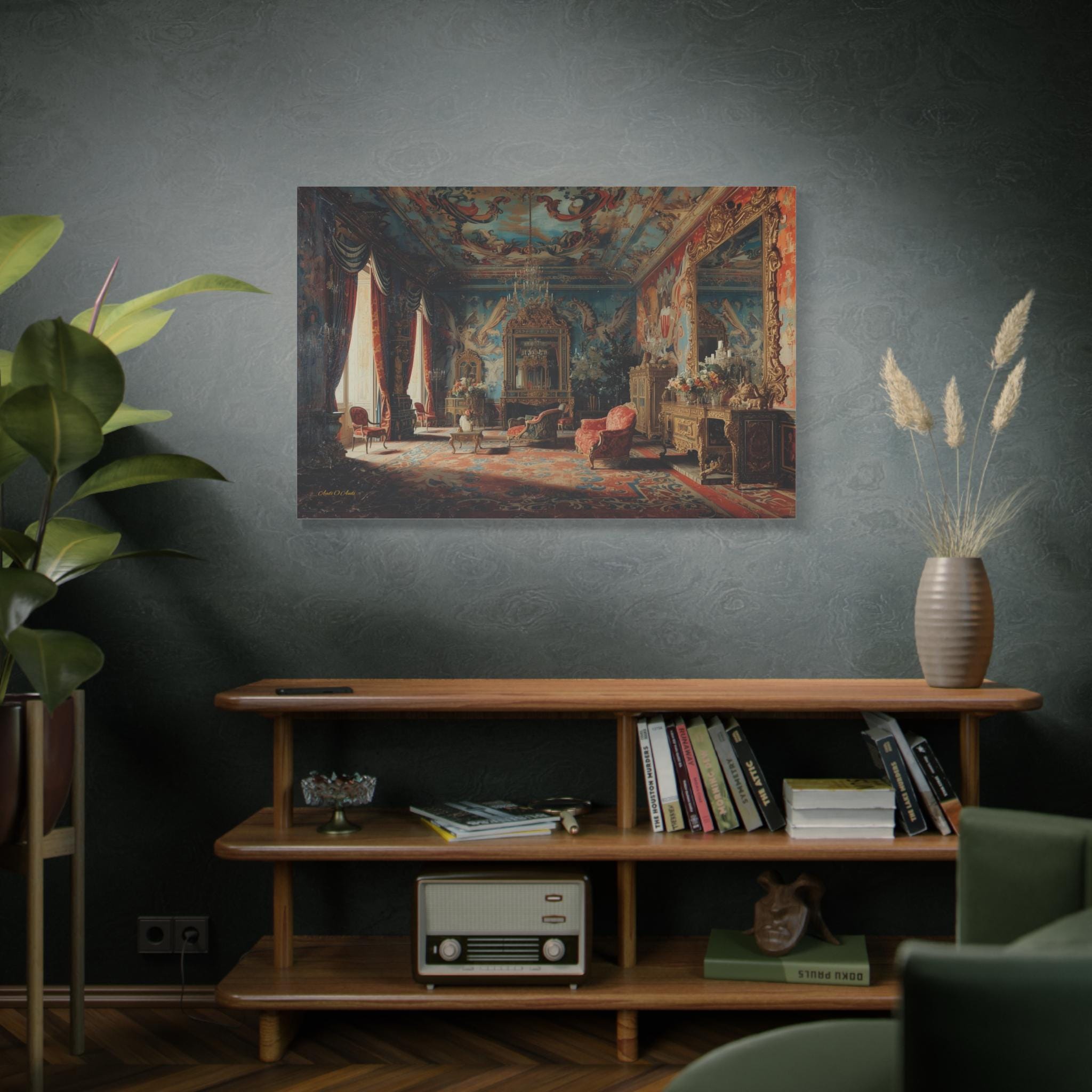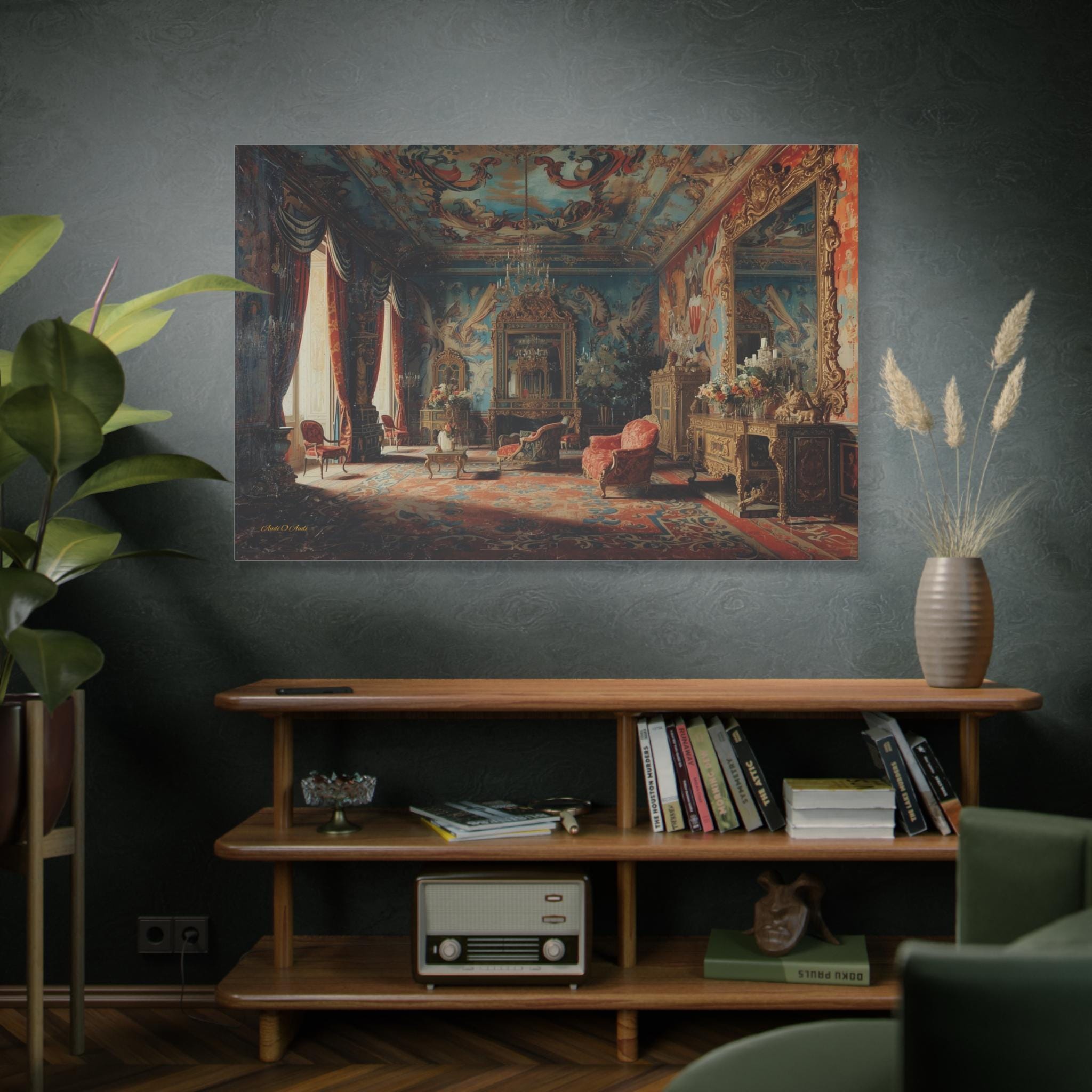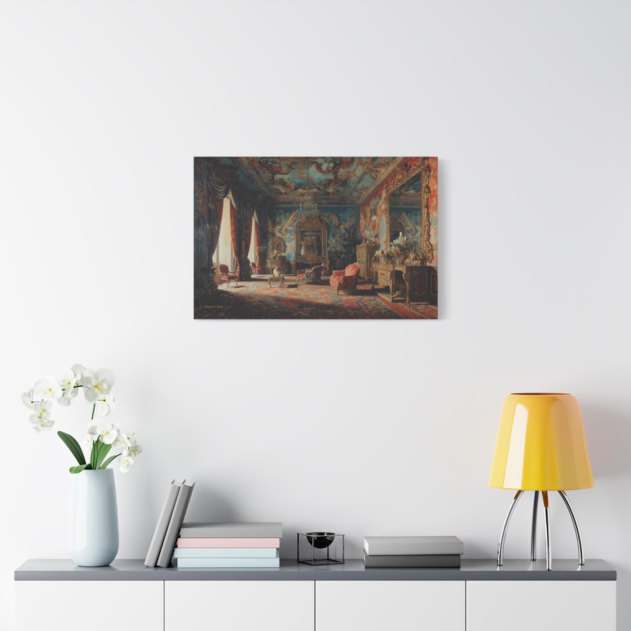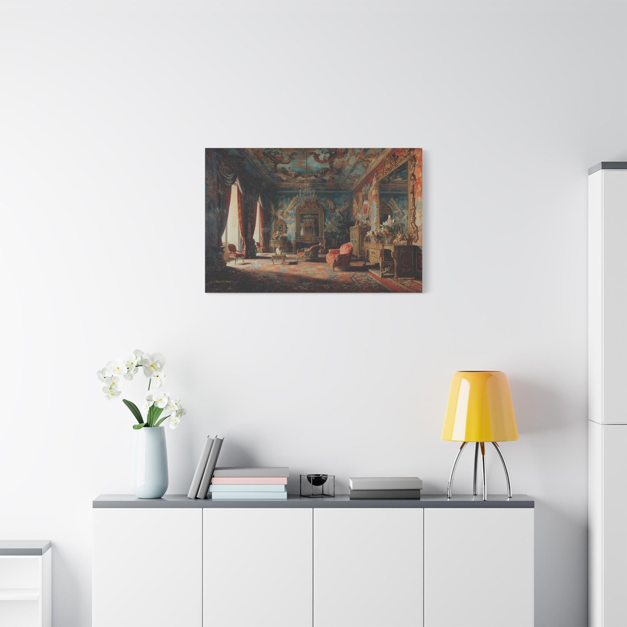 Transform your home into a royal estate with this magnificent canvas print of an 18th-century palace interior. This incredibly detailed artwork captures a grand salon dripping with Rococo opulence—featuring frescoed ceilings, massive gilded mirrors, and plush red velvet furniture.