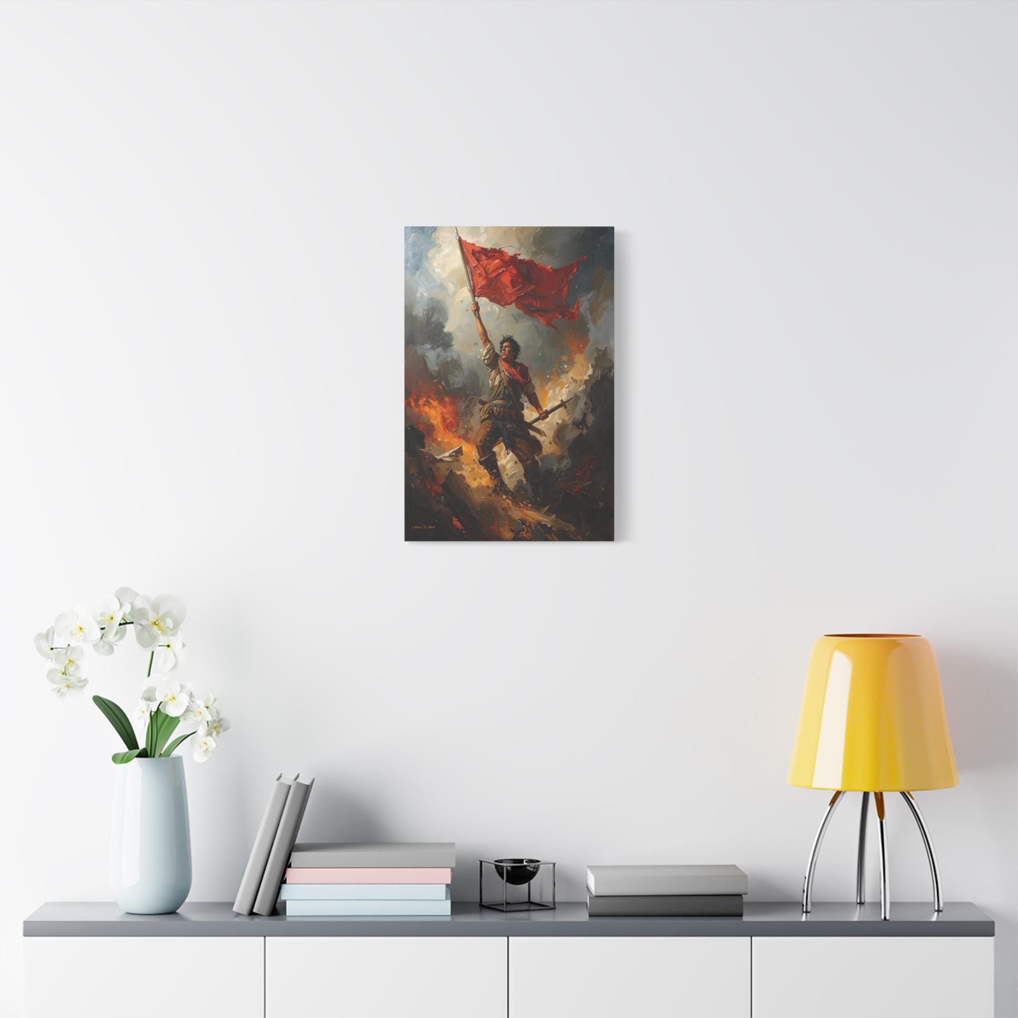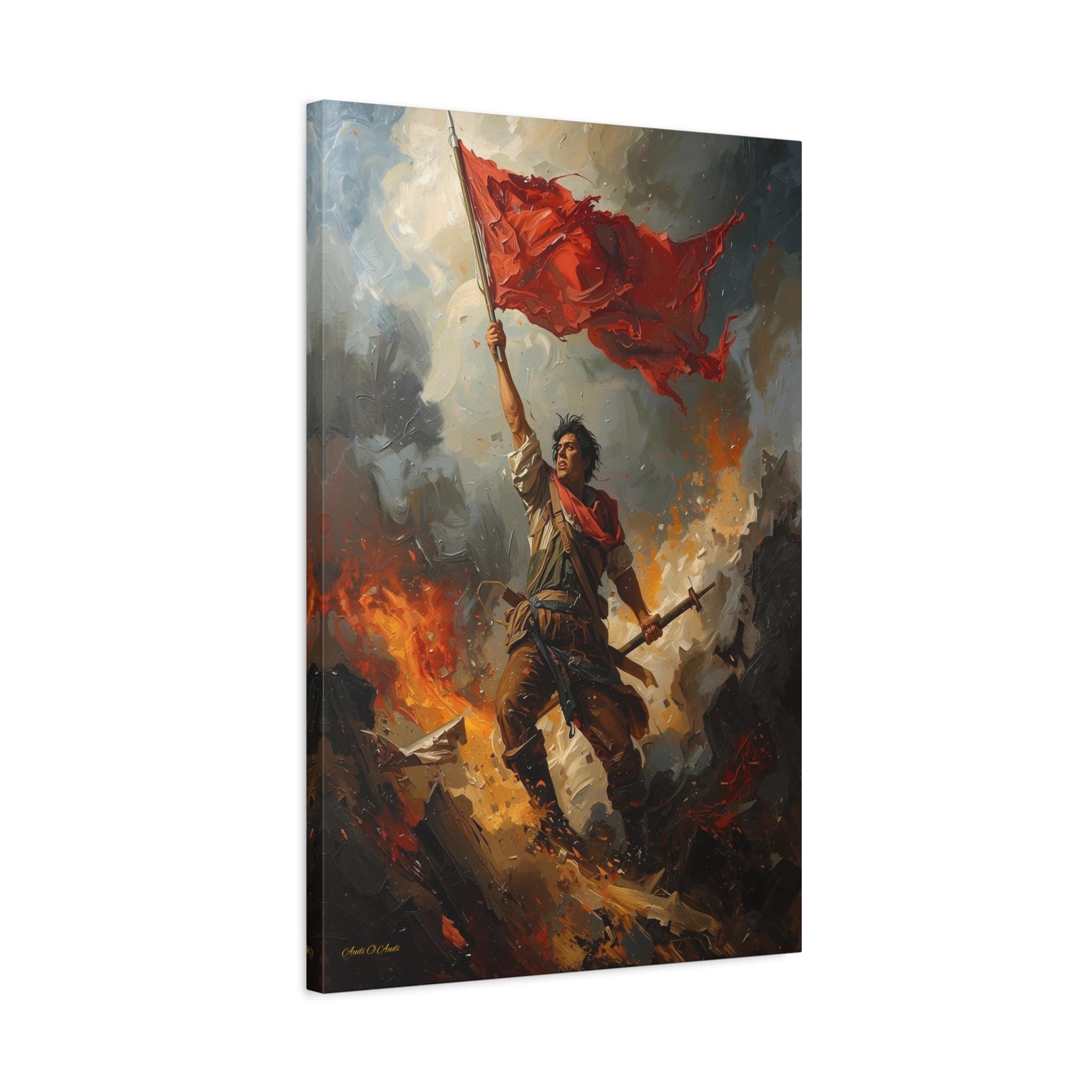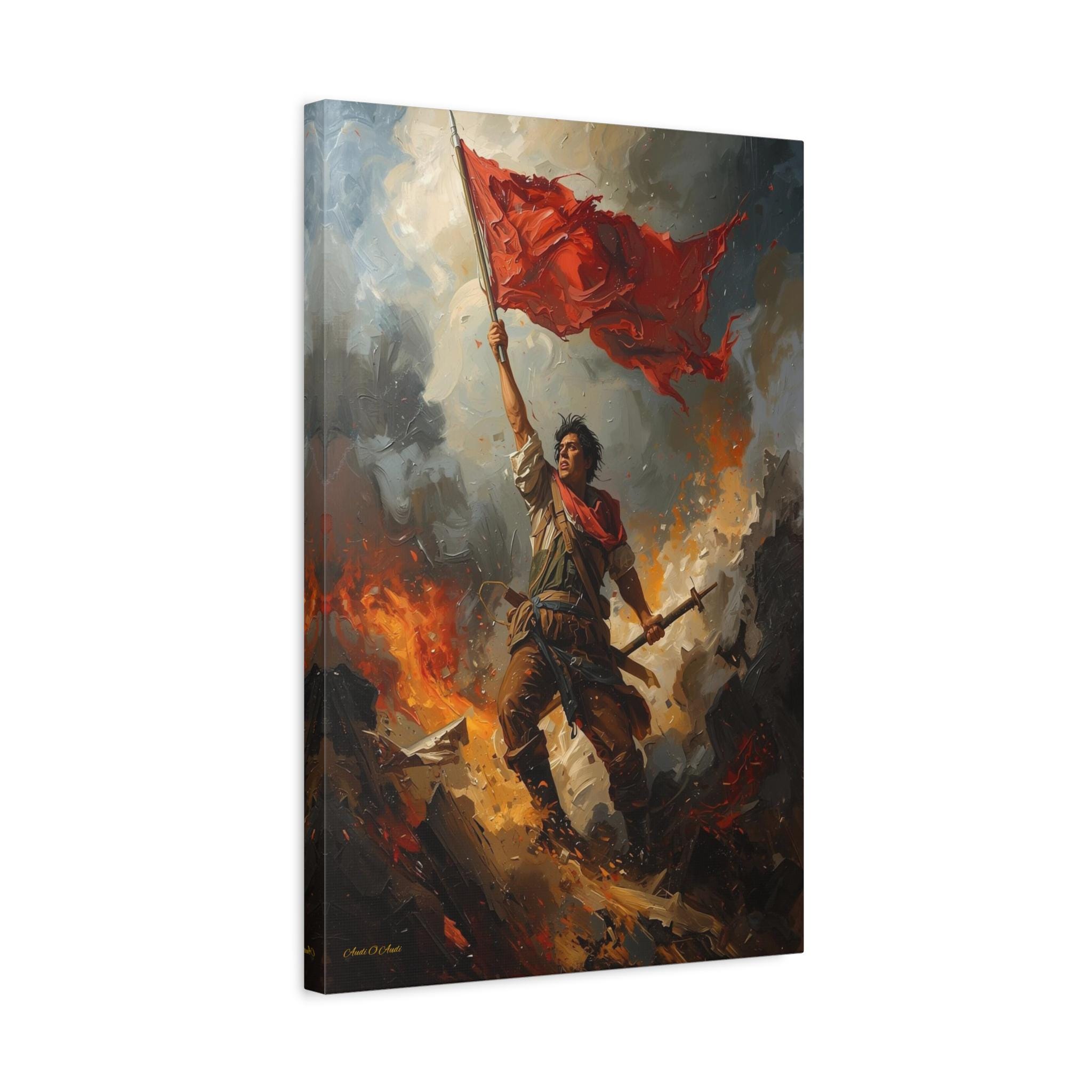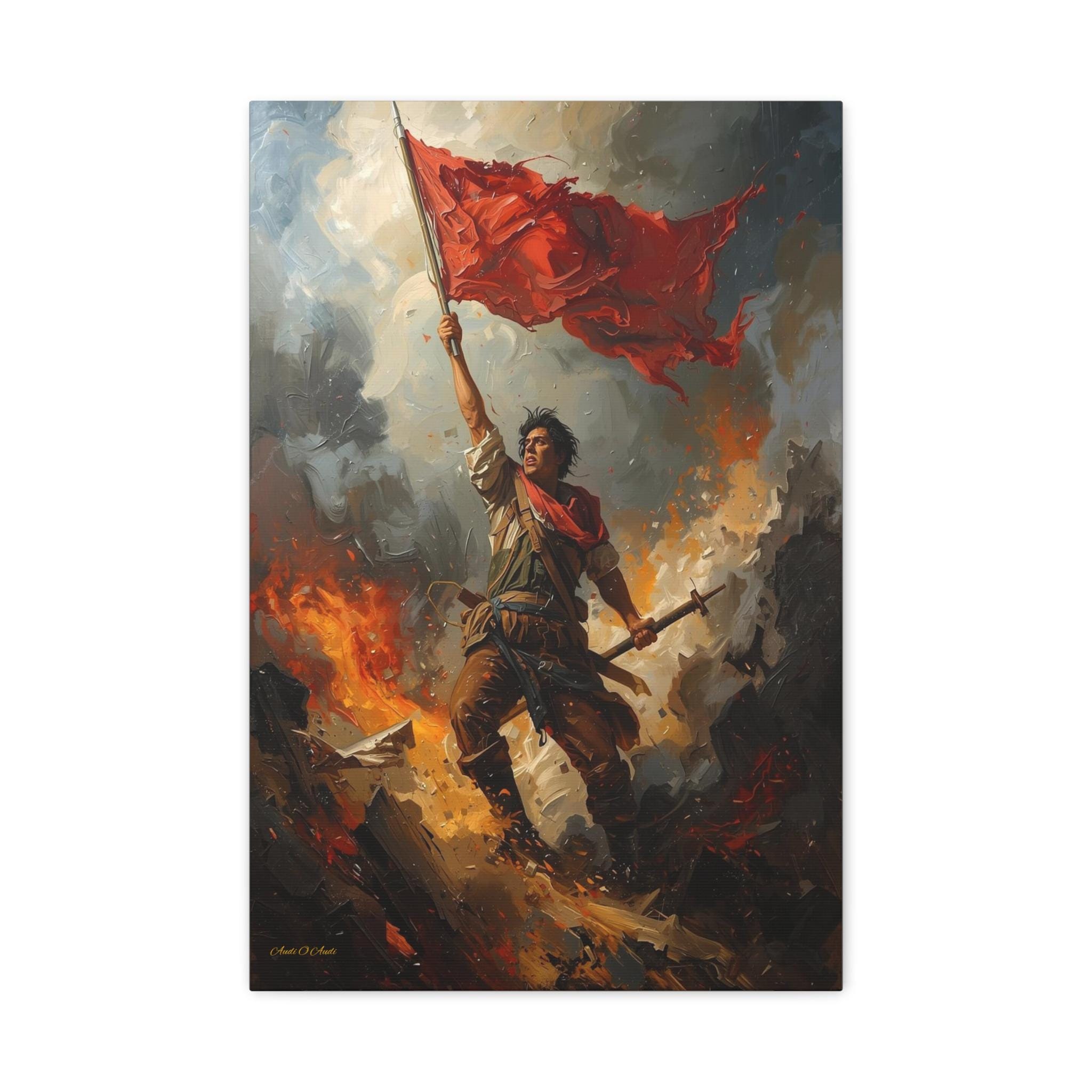 Capture the unyielding spirit of freedom with this dramatic canvas print of a revolutionary hero. This powerful artwork features a defiant figure standing atop a pile of rubble and debris, holding a tattered red flag high against a backdrop of smoke and fire.