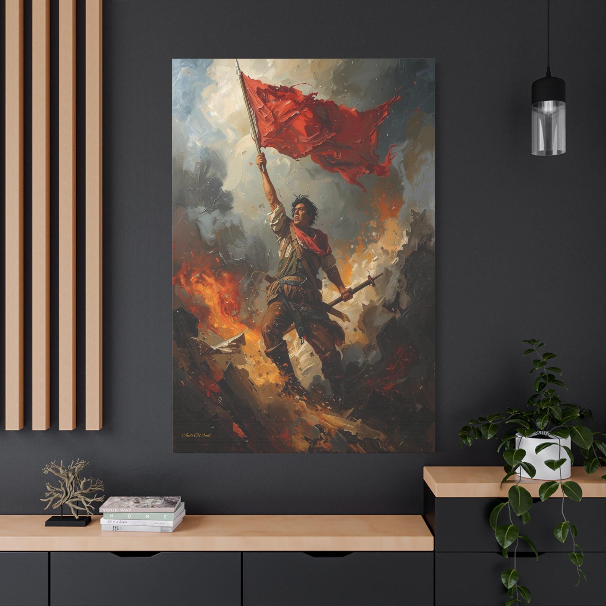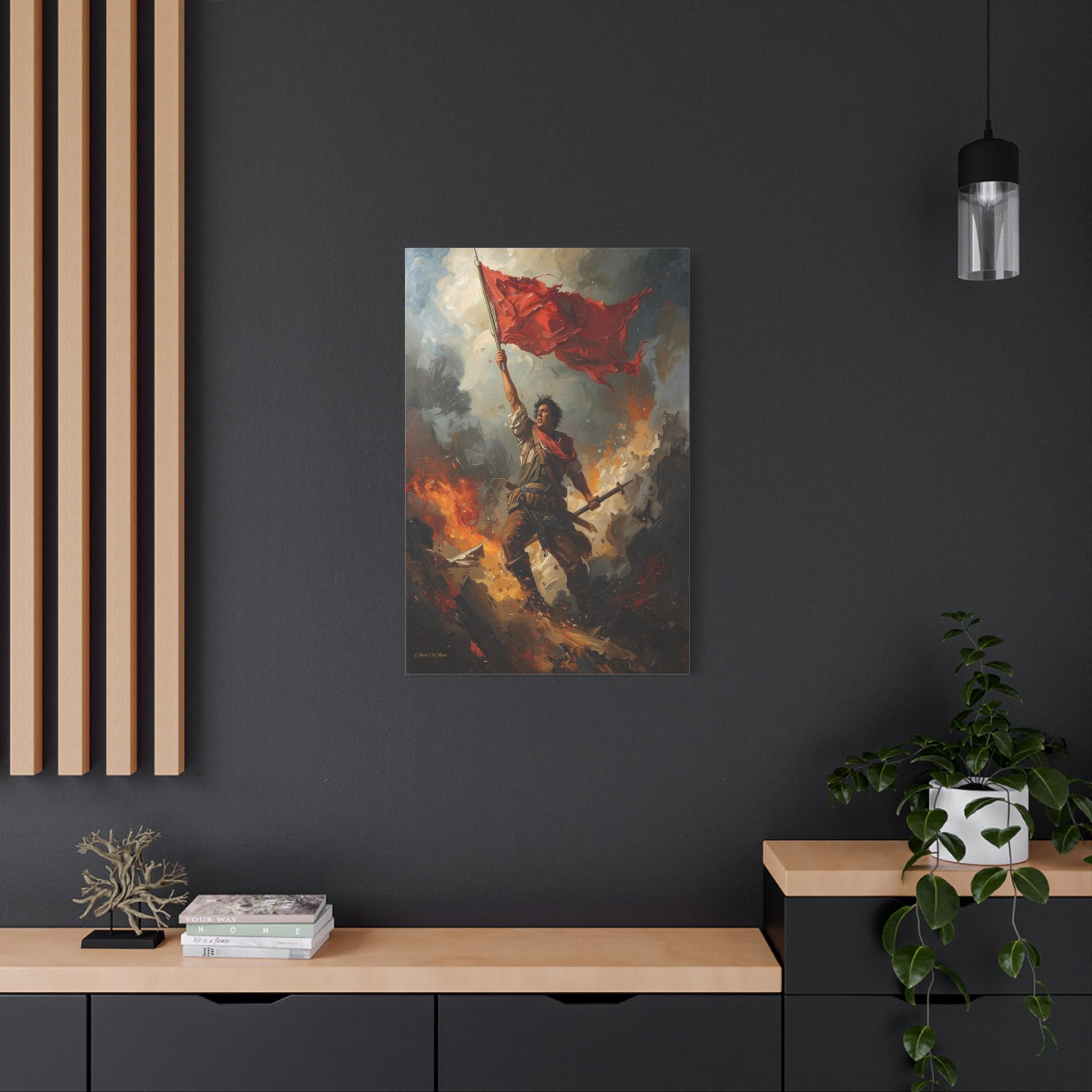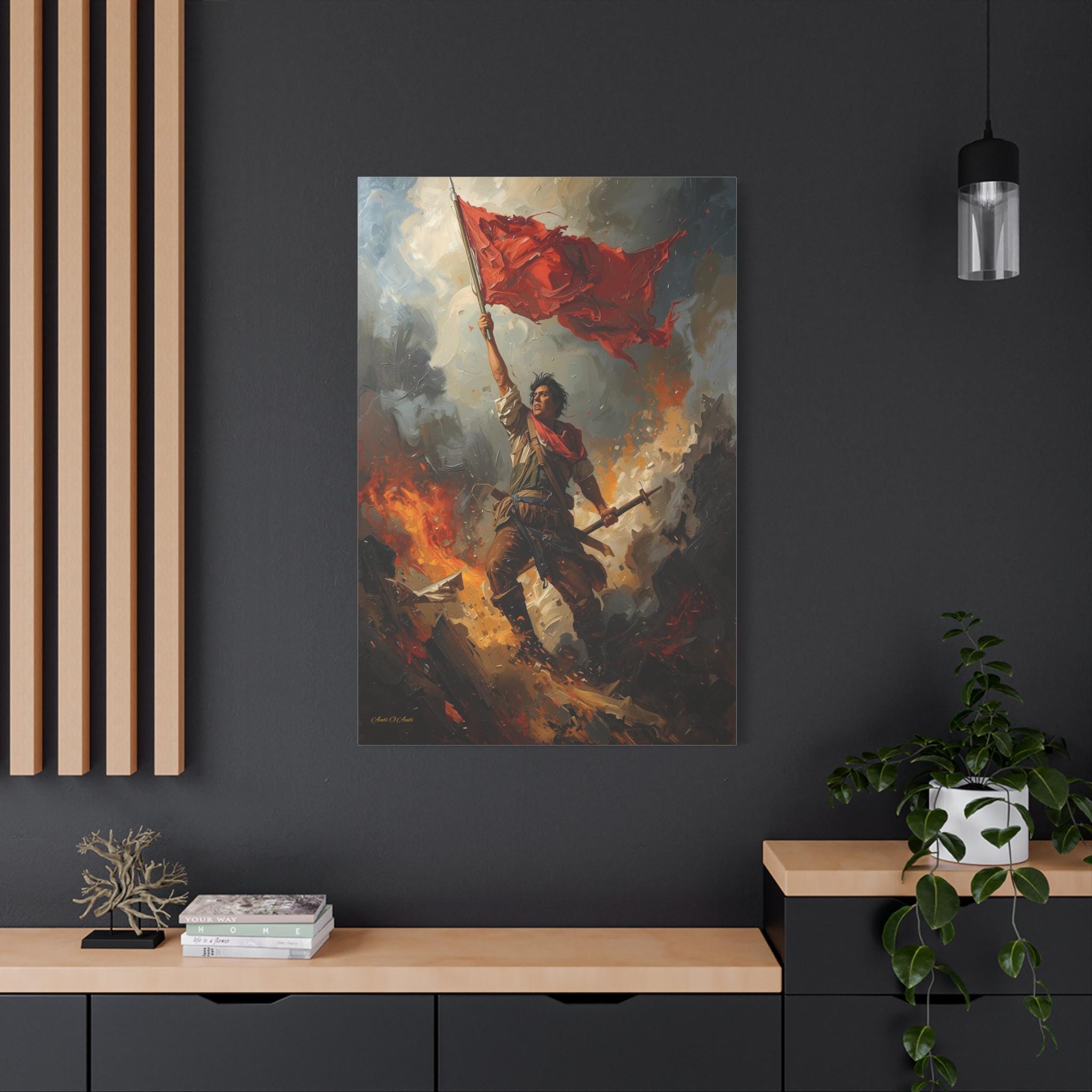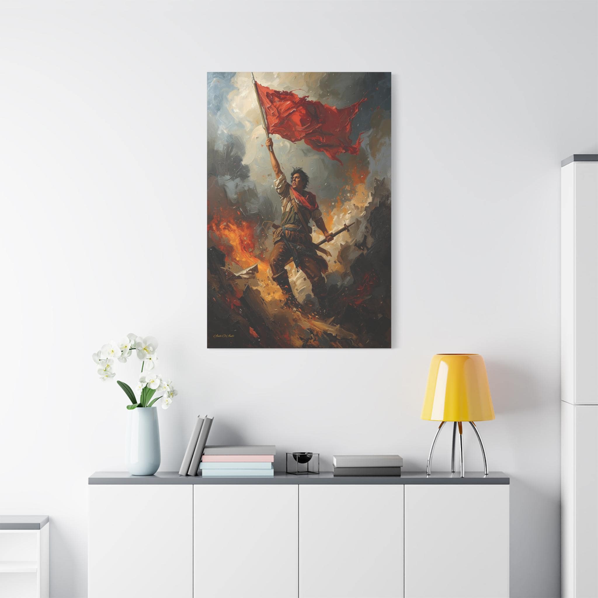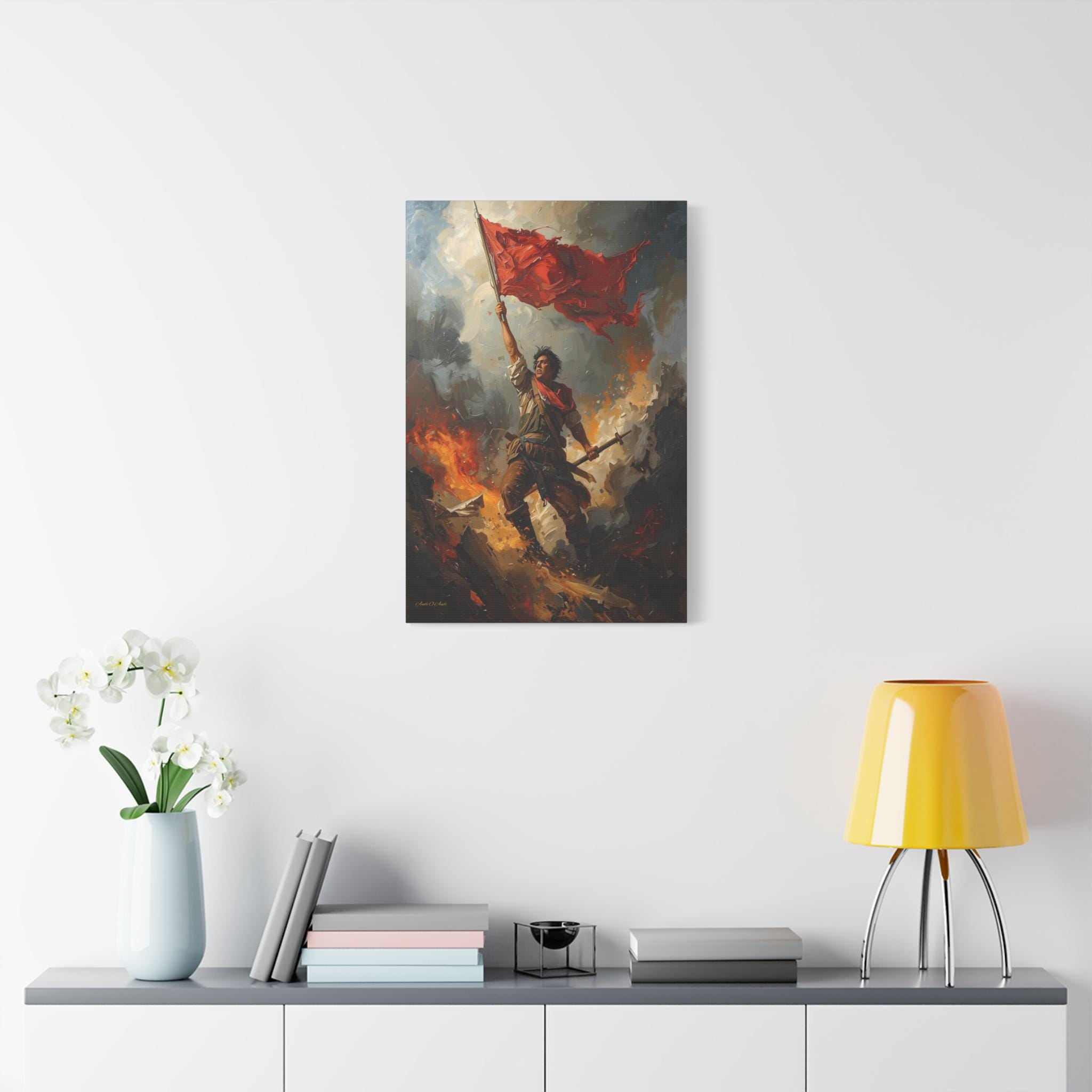 Capture the unyielding spirit of freedom with this dramatic canvas print of a revolutionary hero. This powerful artwork features a defiant figure standing atop a pile of rubble and debris, holding a tattered red flag high against a backdrop of smoke and fire.