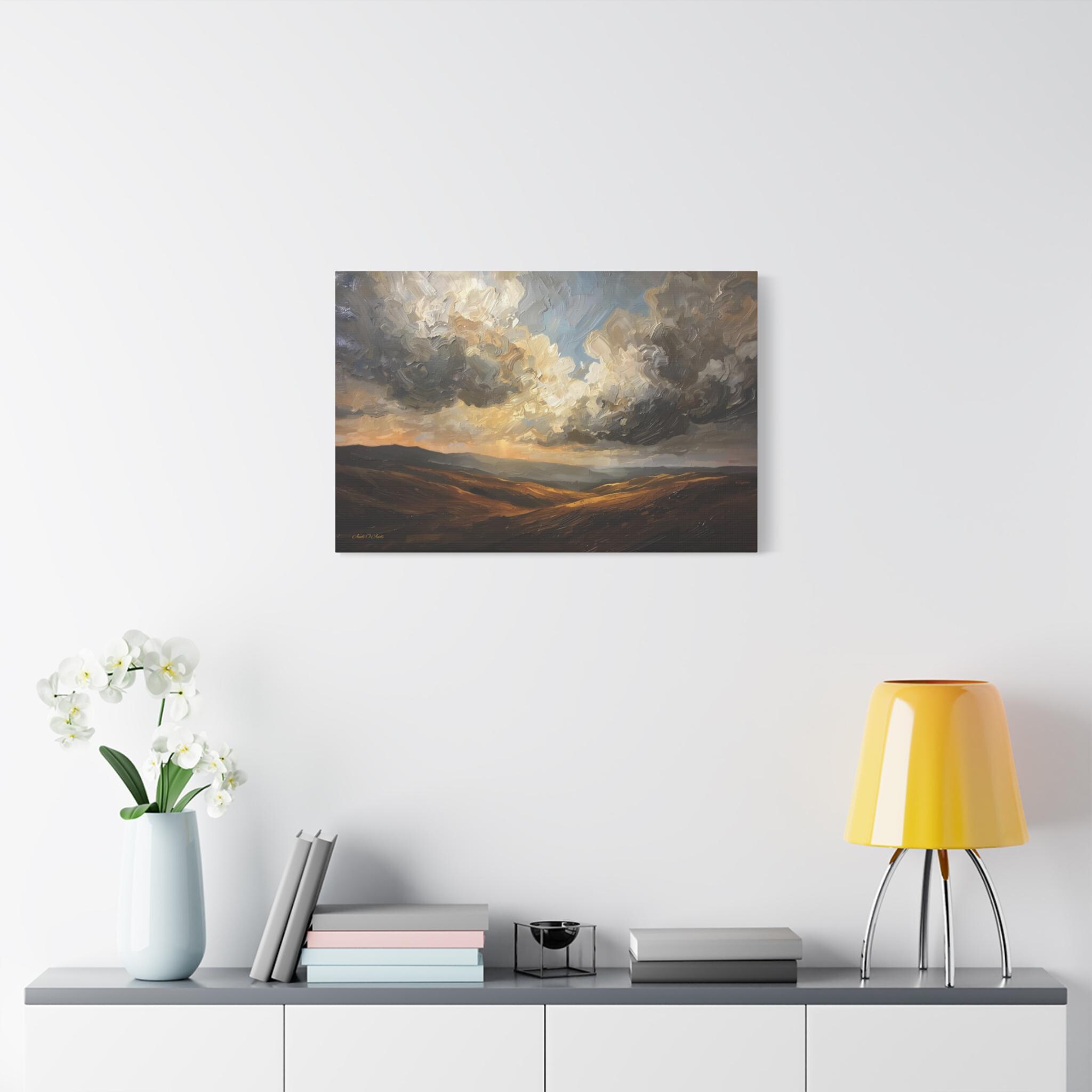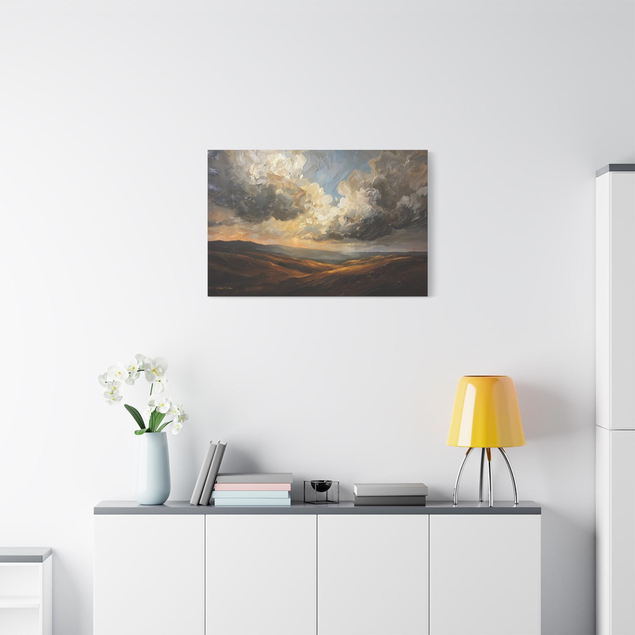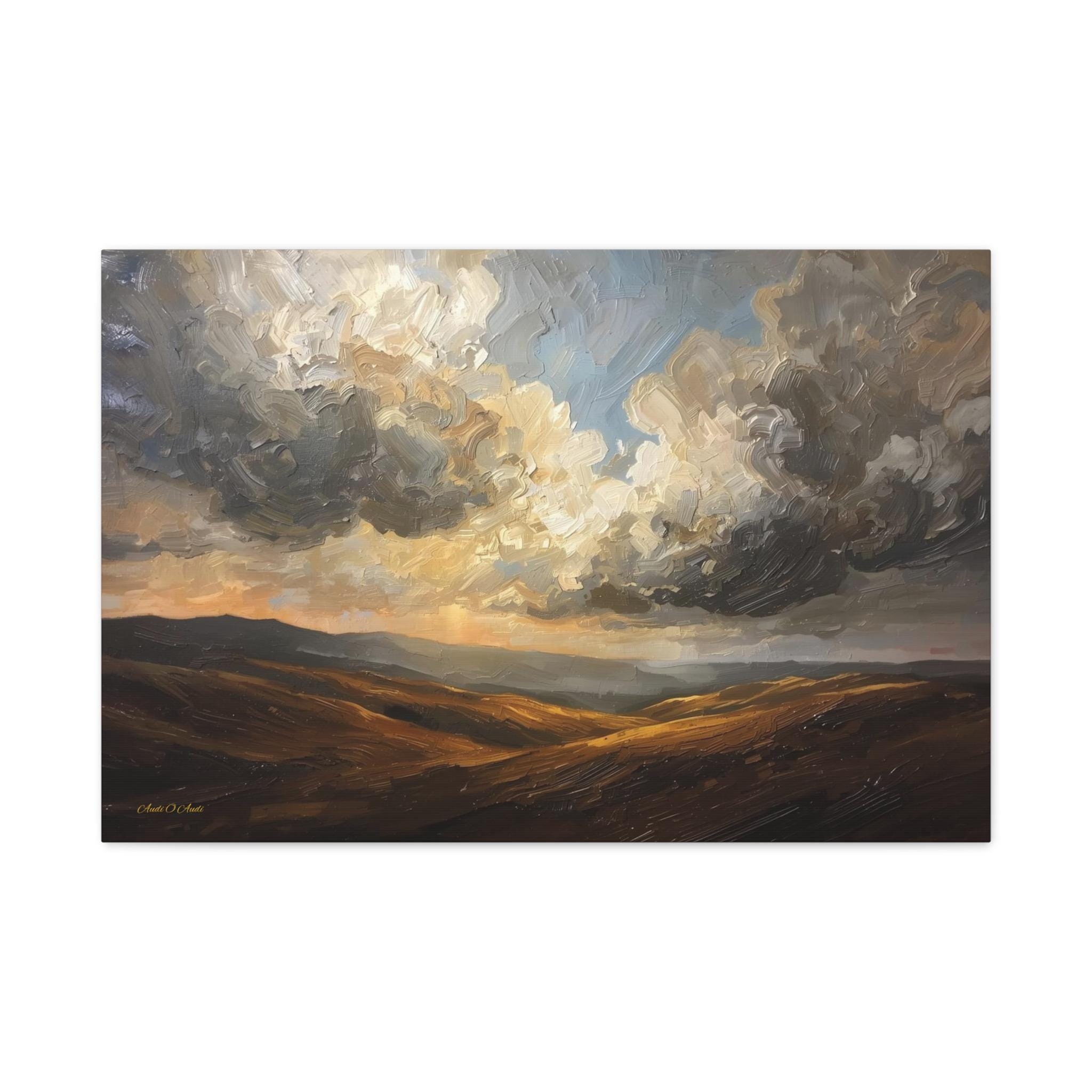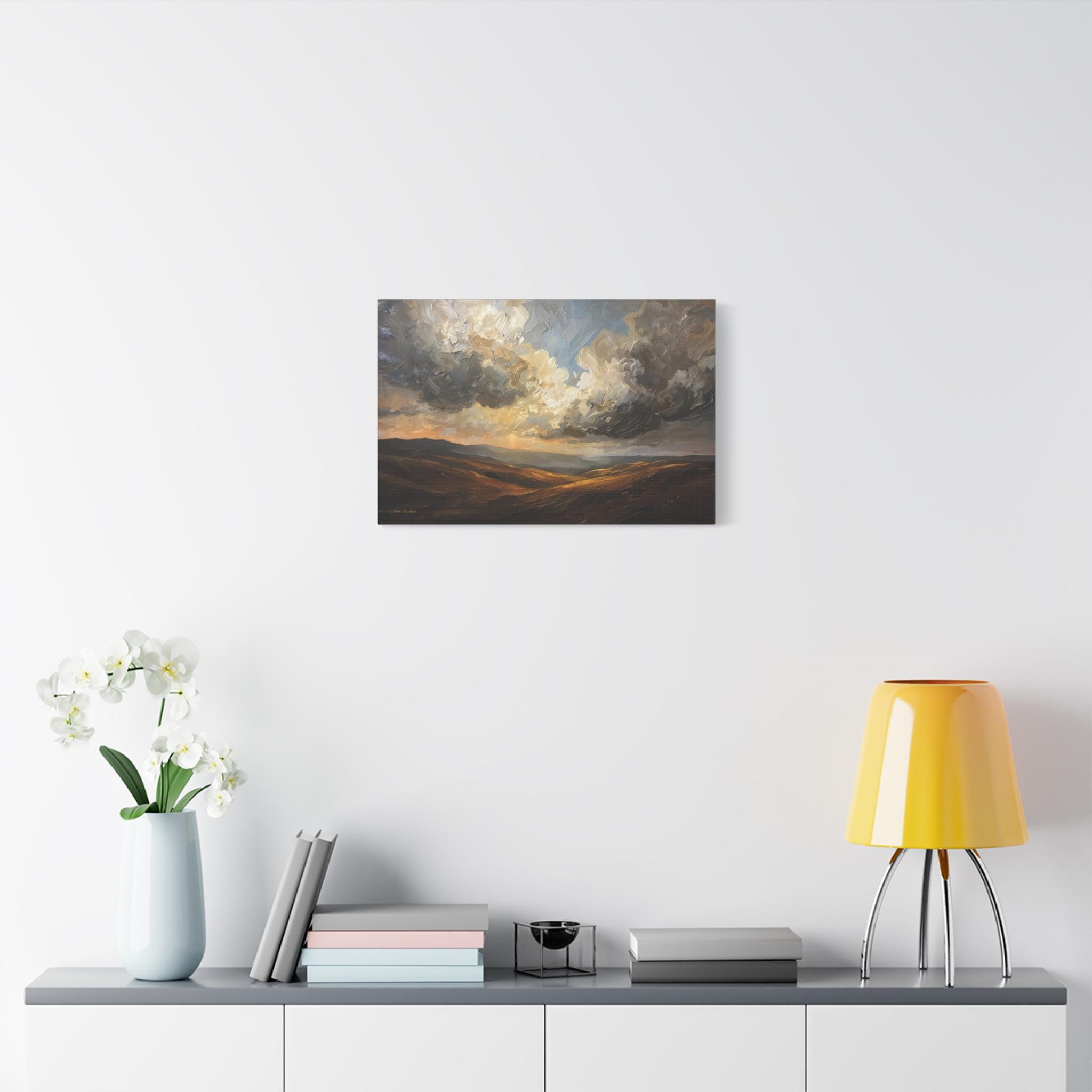 Bring the breathtaking vastness of the open country into your home with this atmospheric canvas print of a dramatic landscape. This sweeping artwork features rolling hills in rich shades of ochre and deep brown, sitting beneath a massive, texture-filled sky of swirling grey and white clouds.