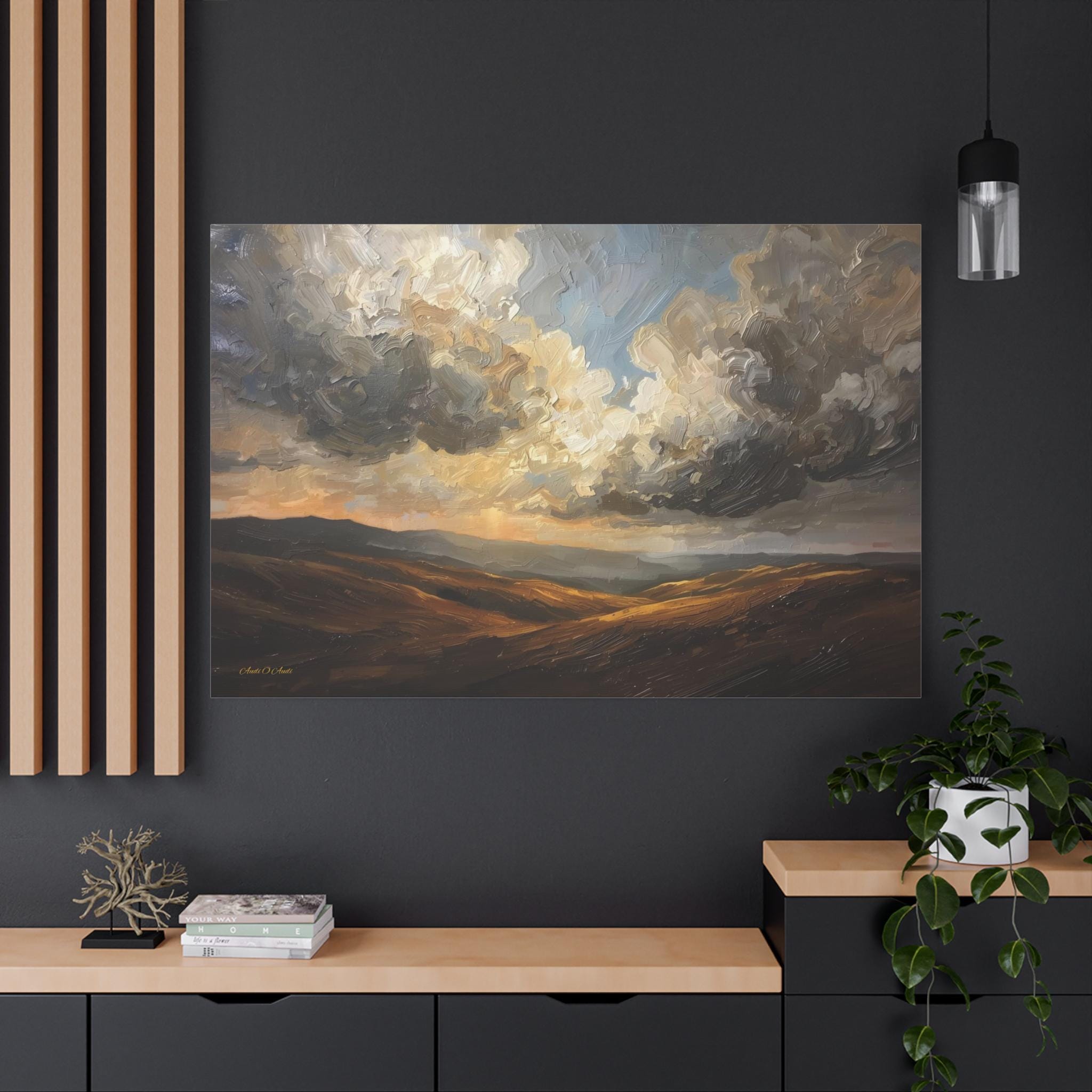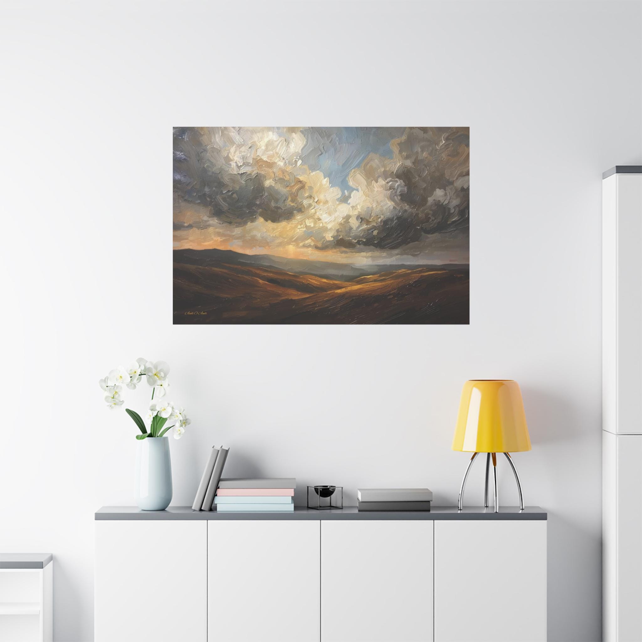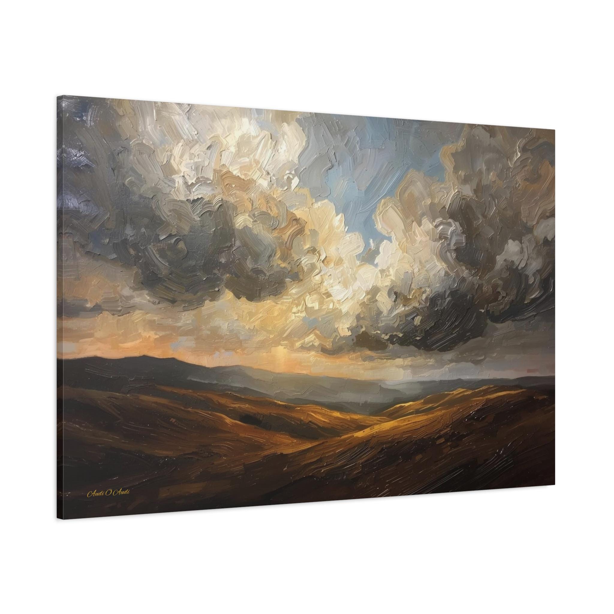 Bring the breathtaking vastness of the open country into your home with this atmospheric canvas print of a dramatic landscape. This sweeping artwork features rolling hills in rich shades of ochre and deep brown, sitting beneath a massive, texture-filled sky of swirling grey and white clouds.