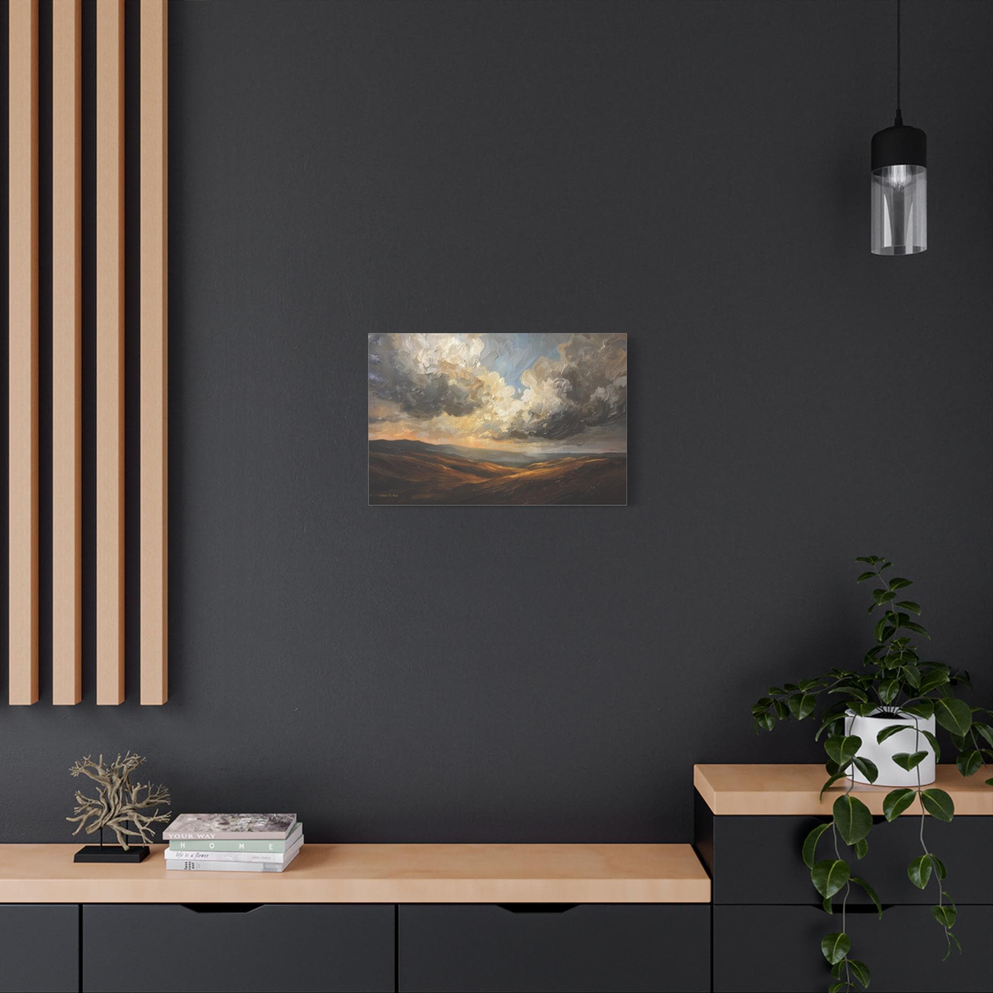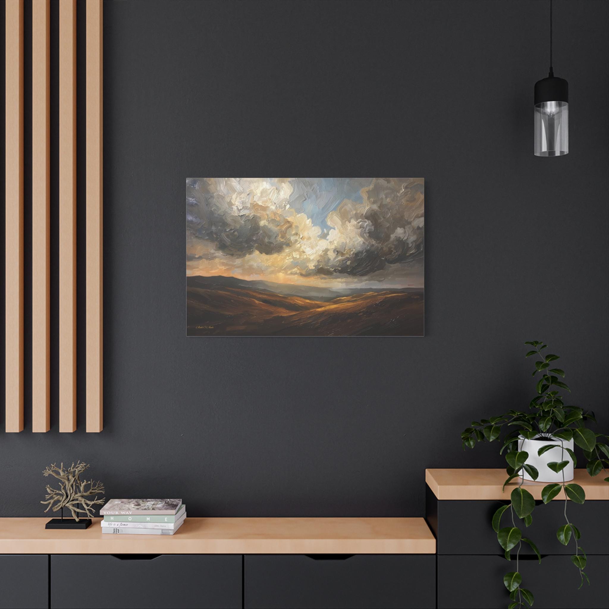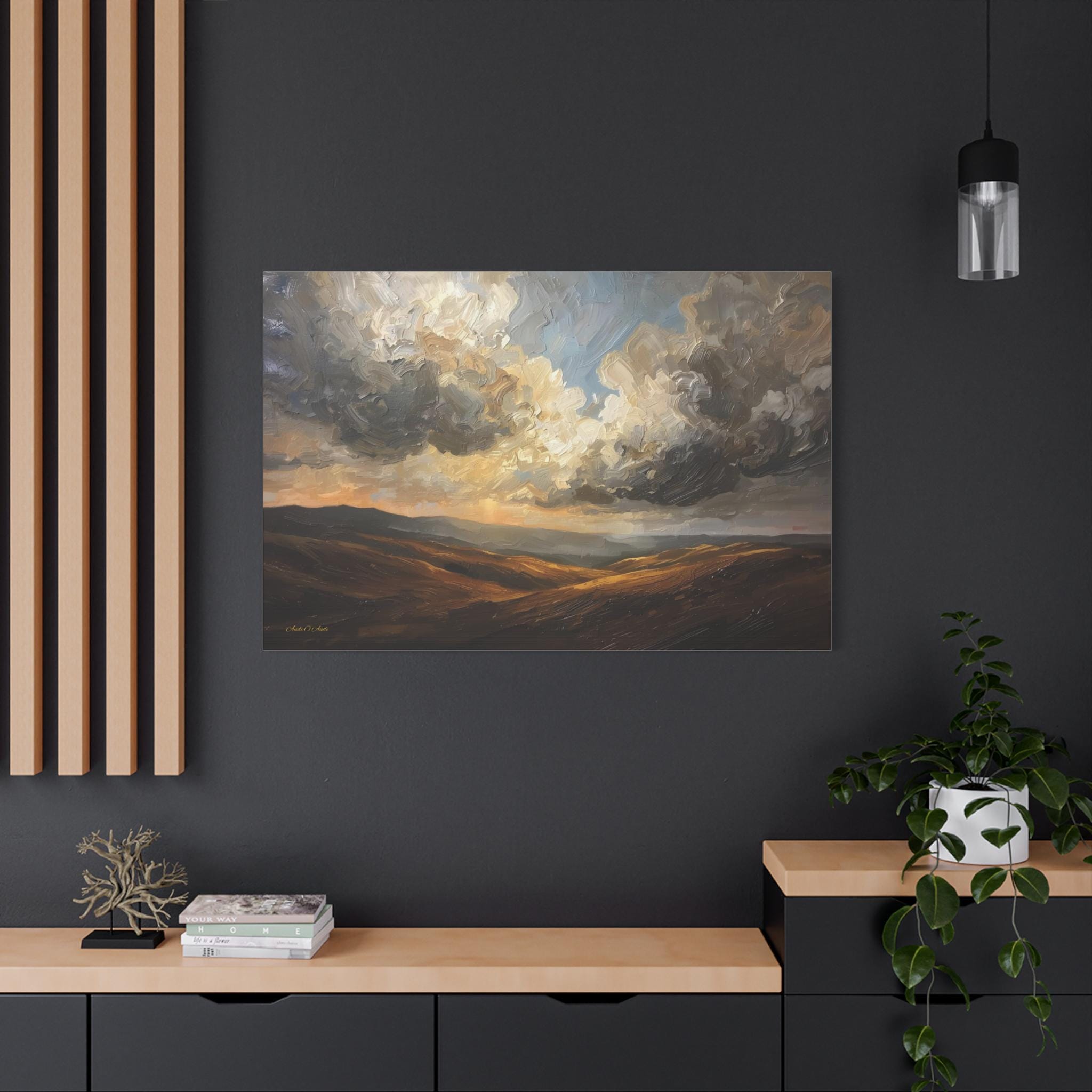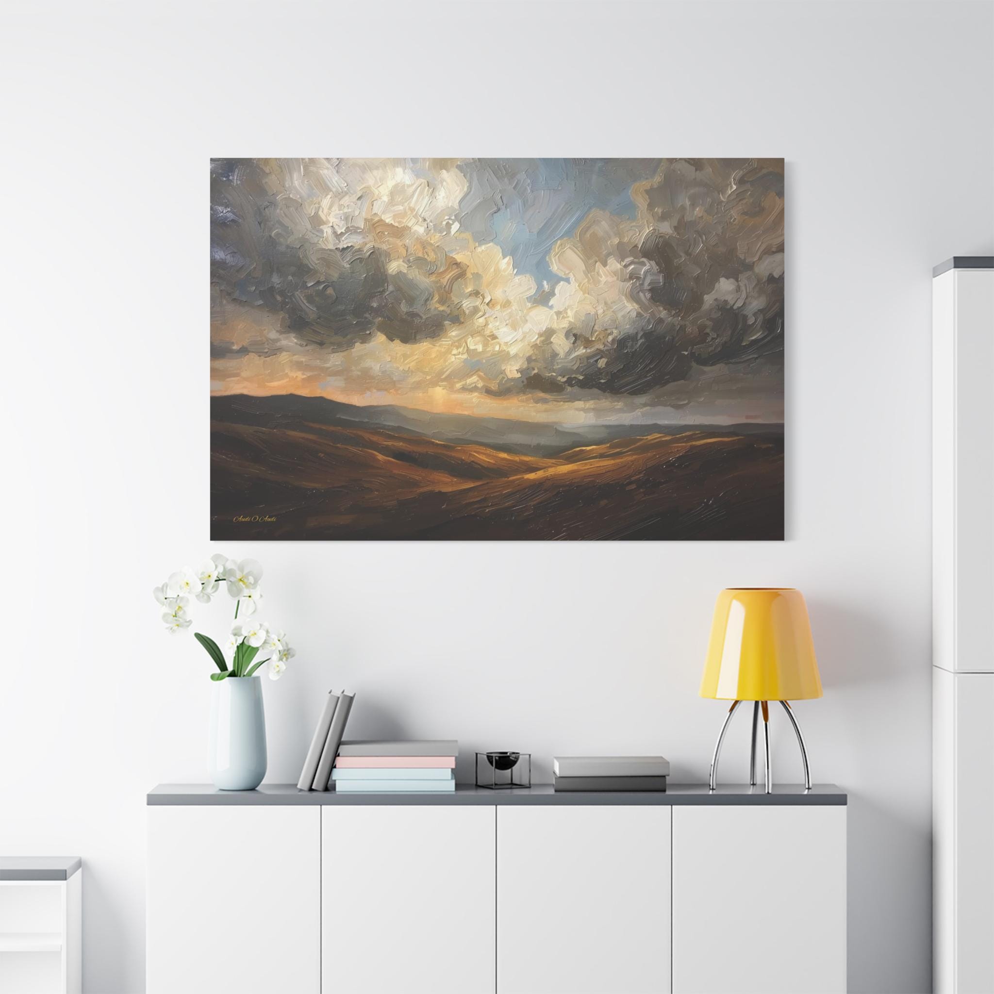 Bring the breathtaking vastness of the open country into your home with this atmospheric canvas print of a dramatic landscape. This sweeping artwork features rolling hills in rich shades of ochre and deep brown, sitting beneath a massive, texture-filled sky of swirling grey and white clouds.