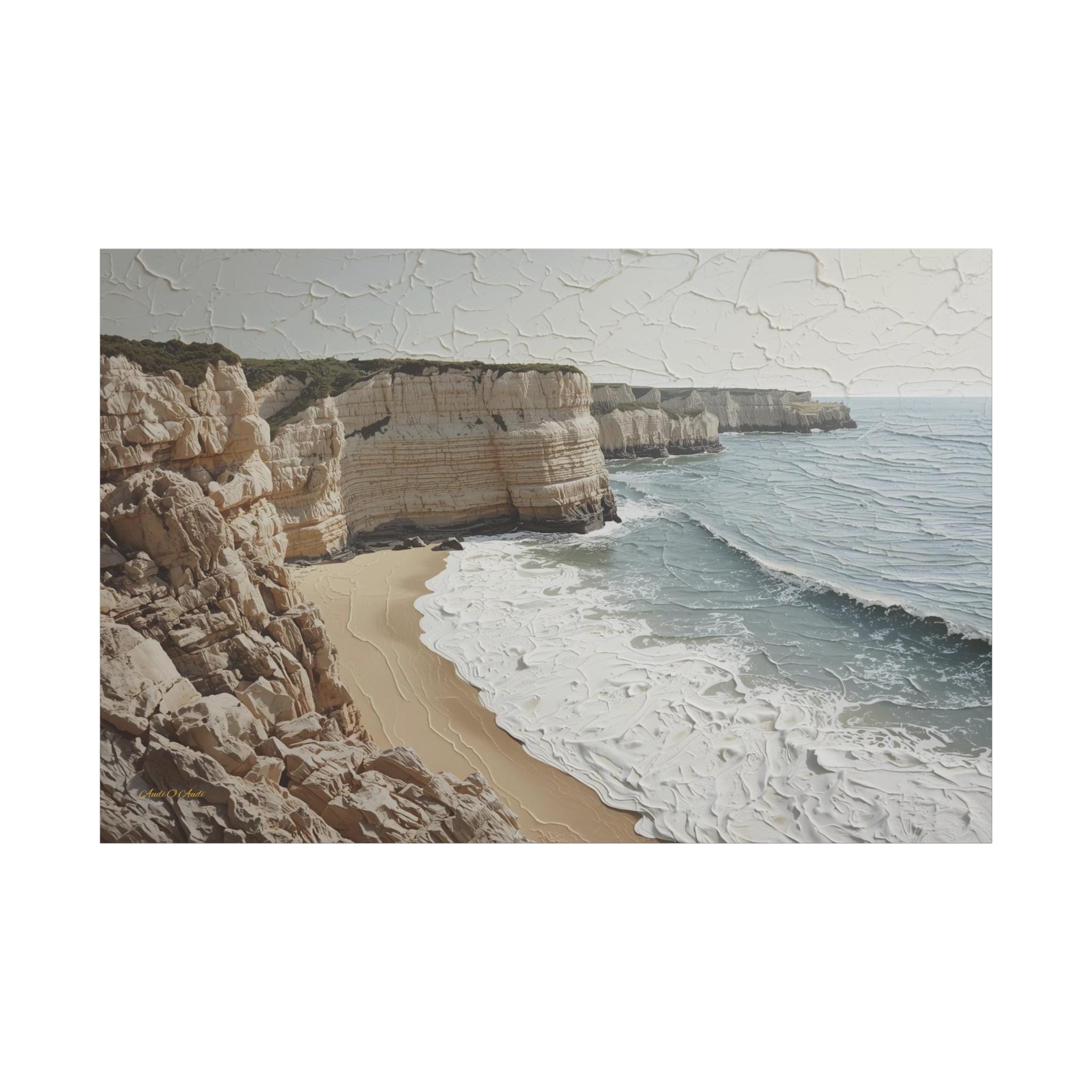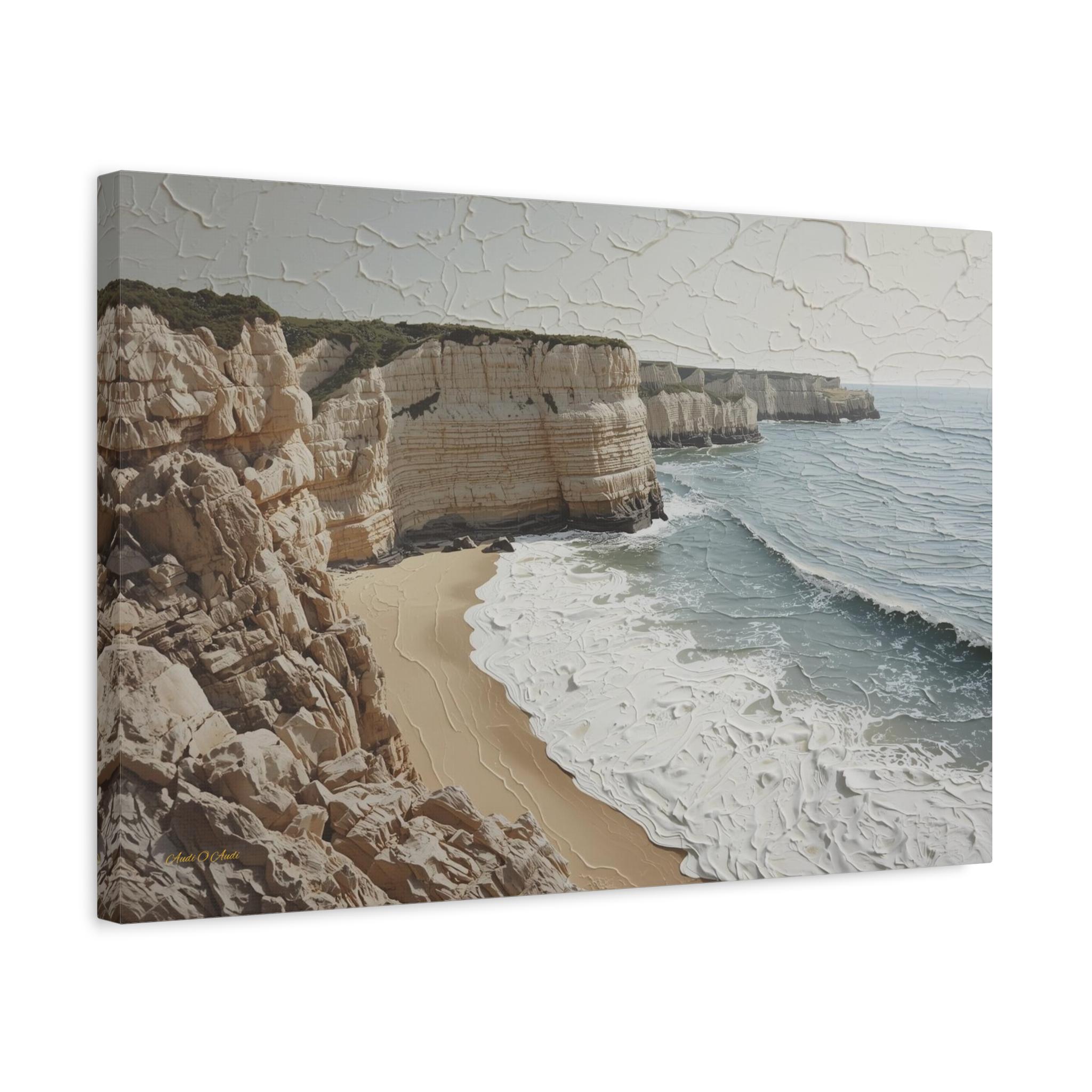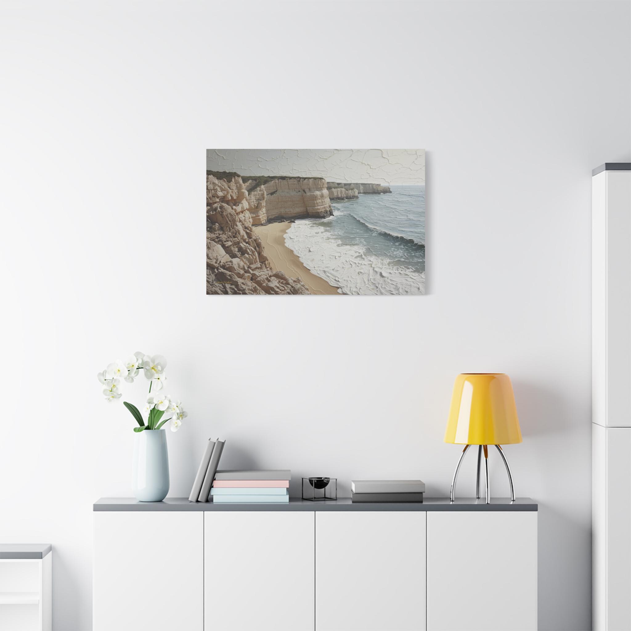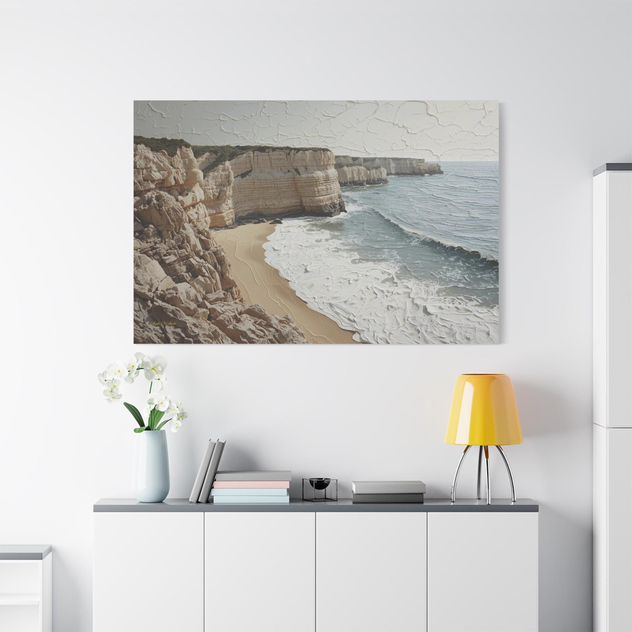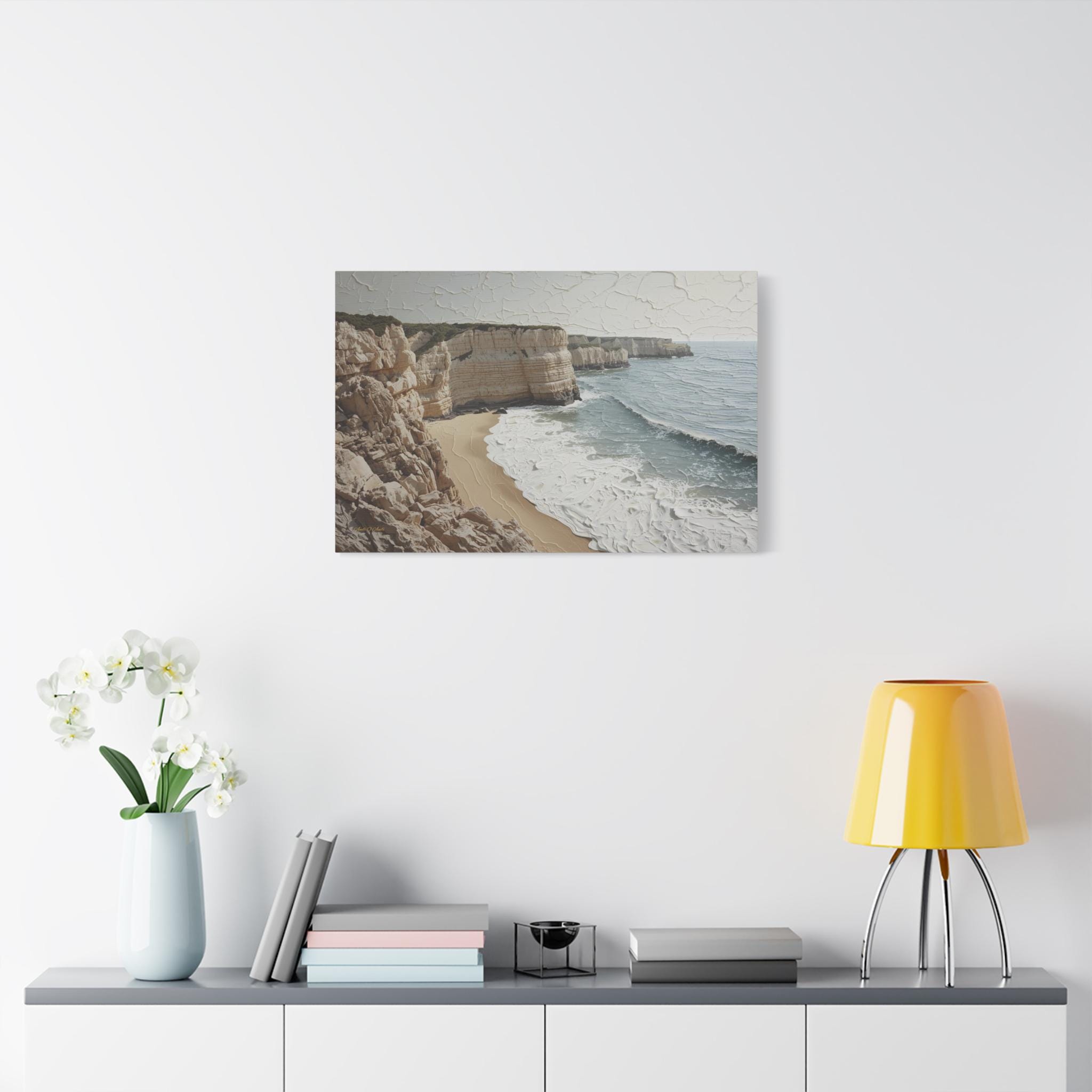 Bring the fresh, airy beauty of the coast into your home with this stunning neutral seascape canvas. This modern artwork captures towering limestone cliffs overlooking a churning ocean, rendered in a sophisticated palette of creamy whites, soft sands, and muted grey-blues.