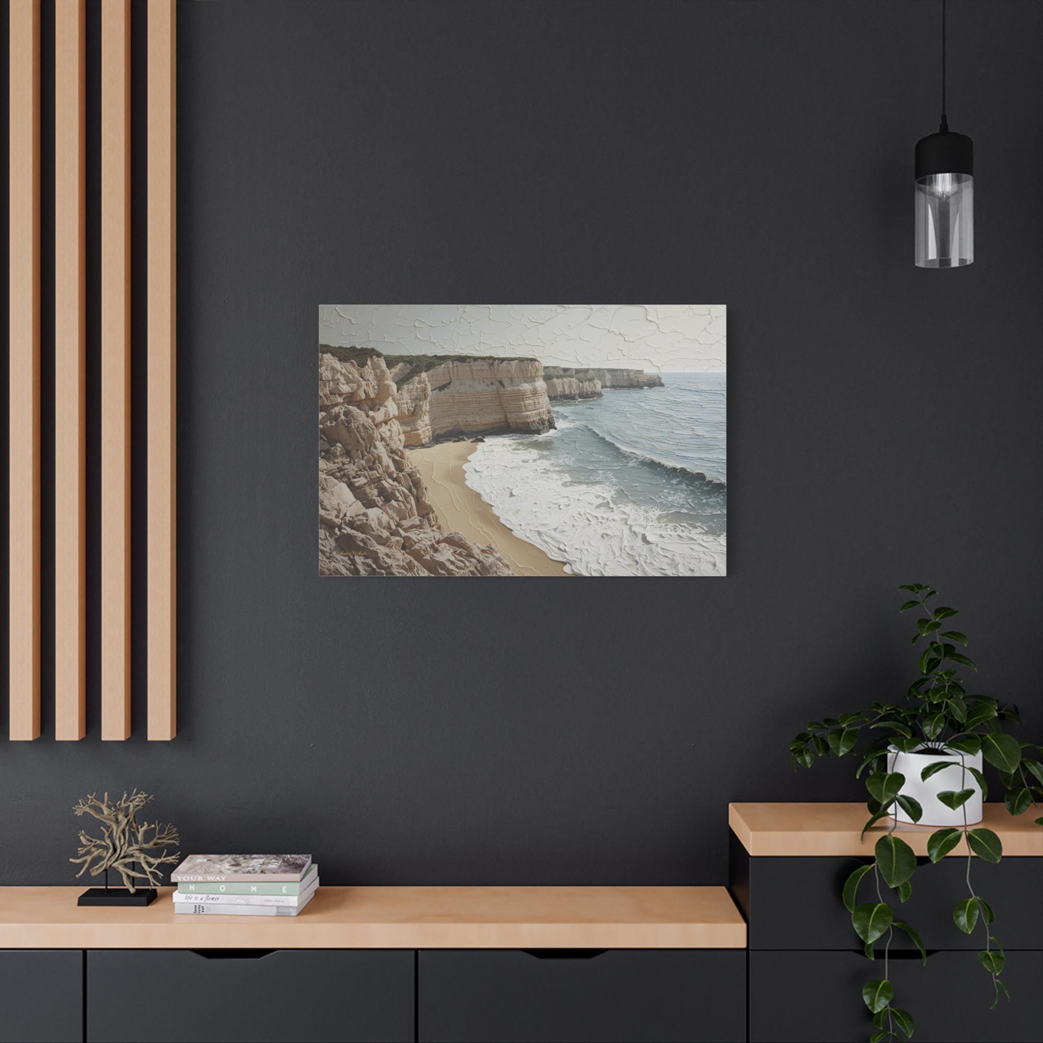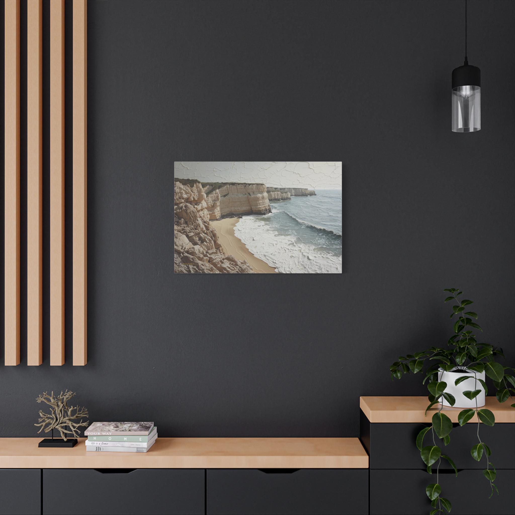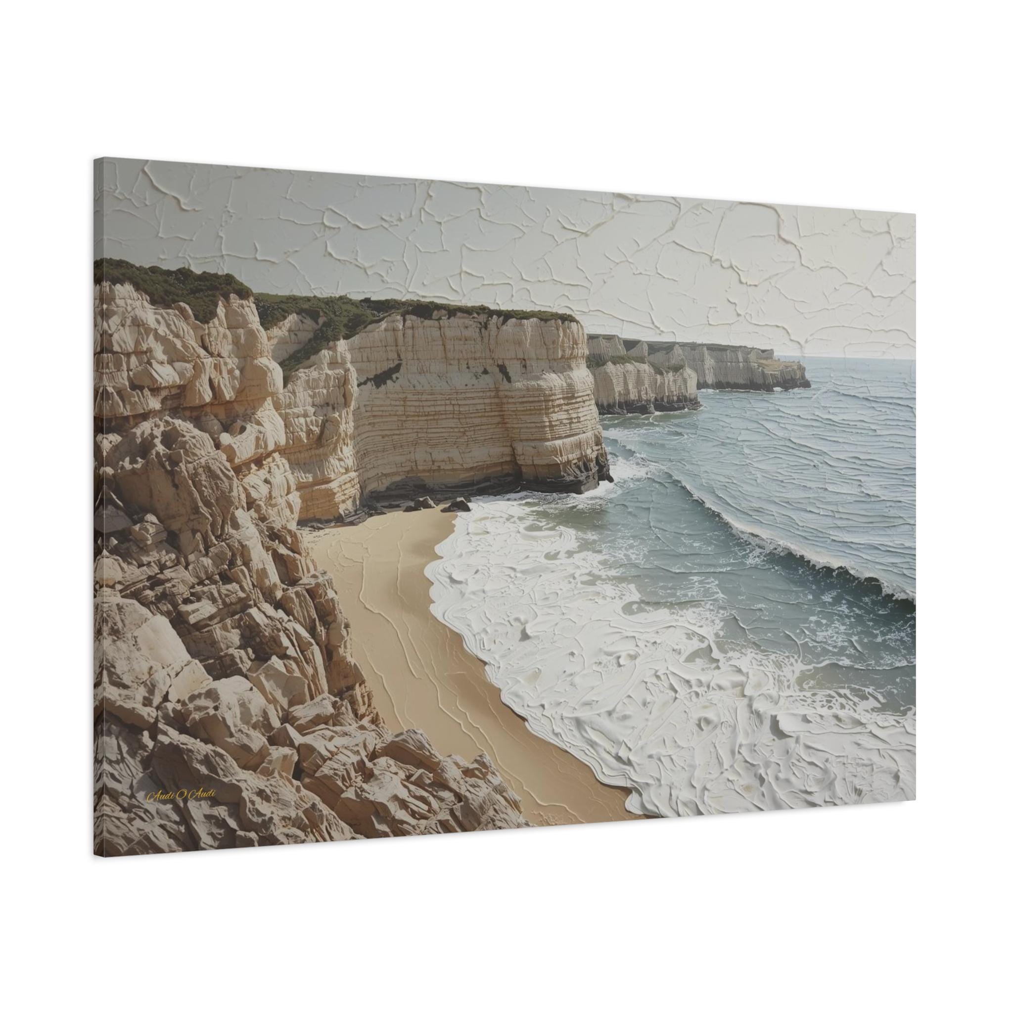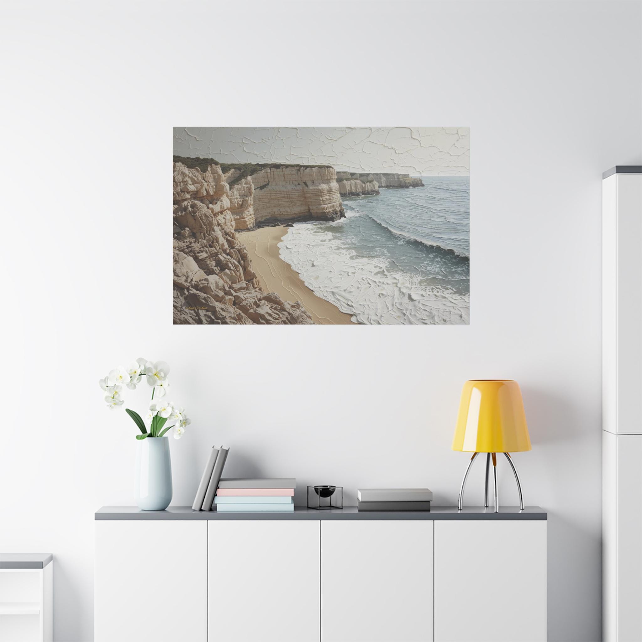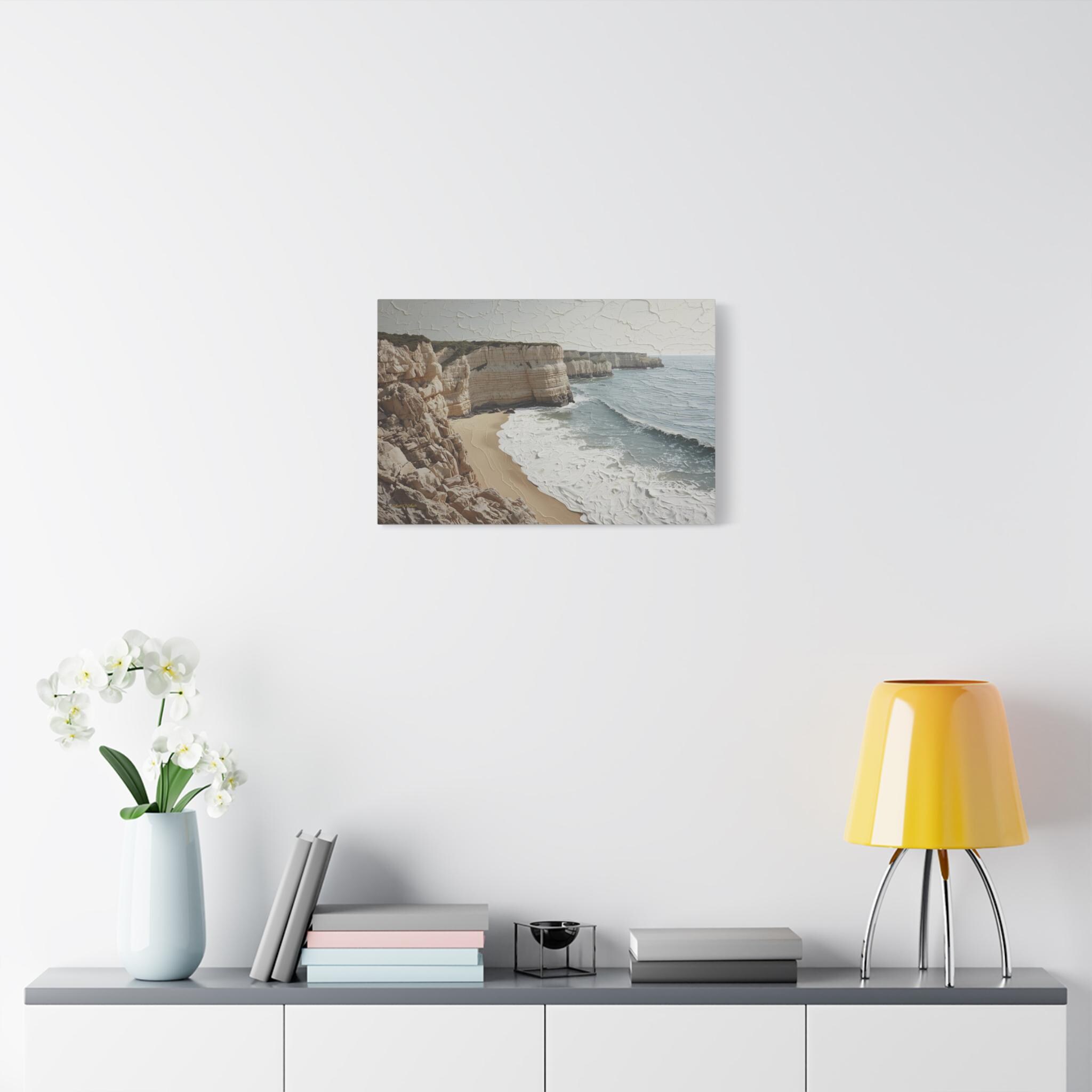 Bring the fresh, airy beauty of the coast into your home with this stunning neutral seascape canvas. This modern artwork captures towering limestone cliffs overlooking a churning ocean, rendered in a sophisticated palette of creamy whites, soft sands, and muted grey-blues.