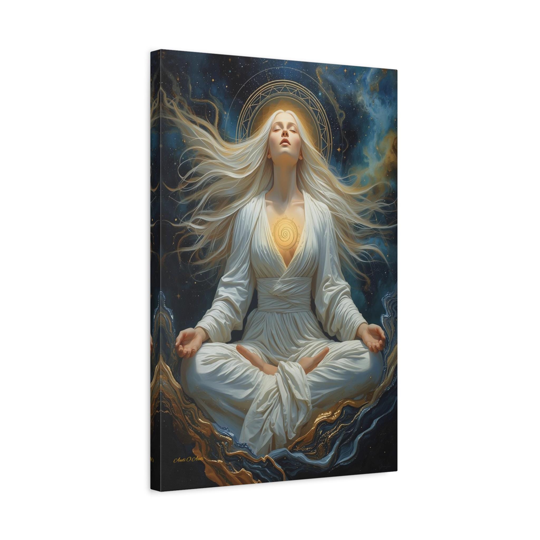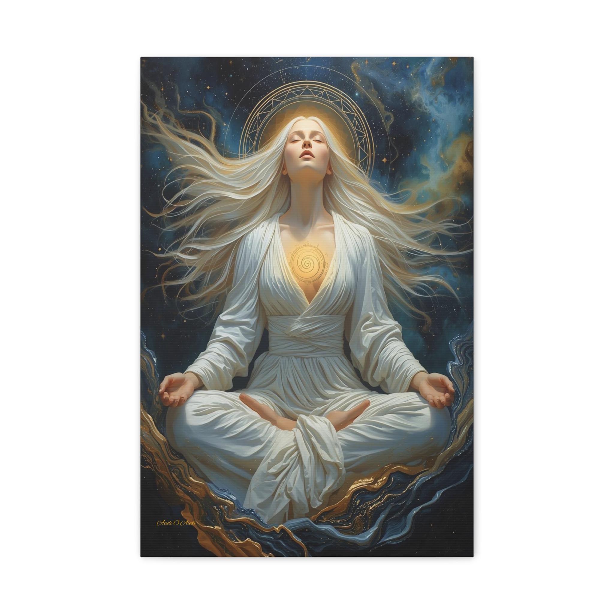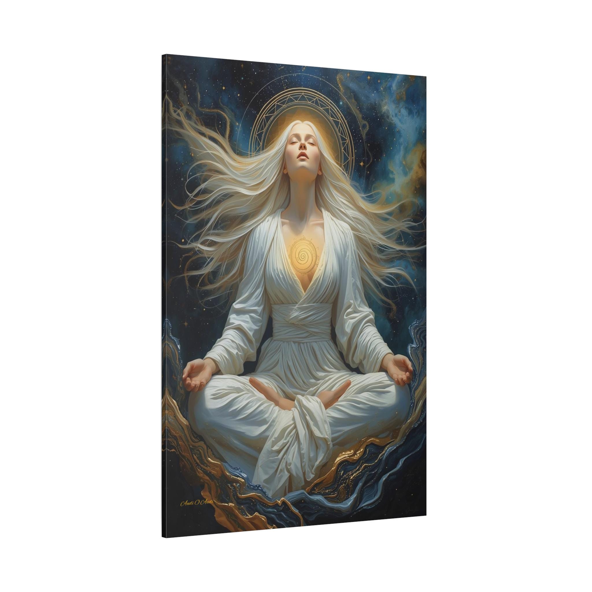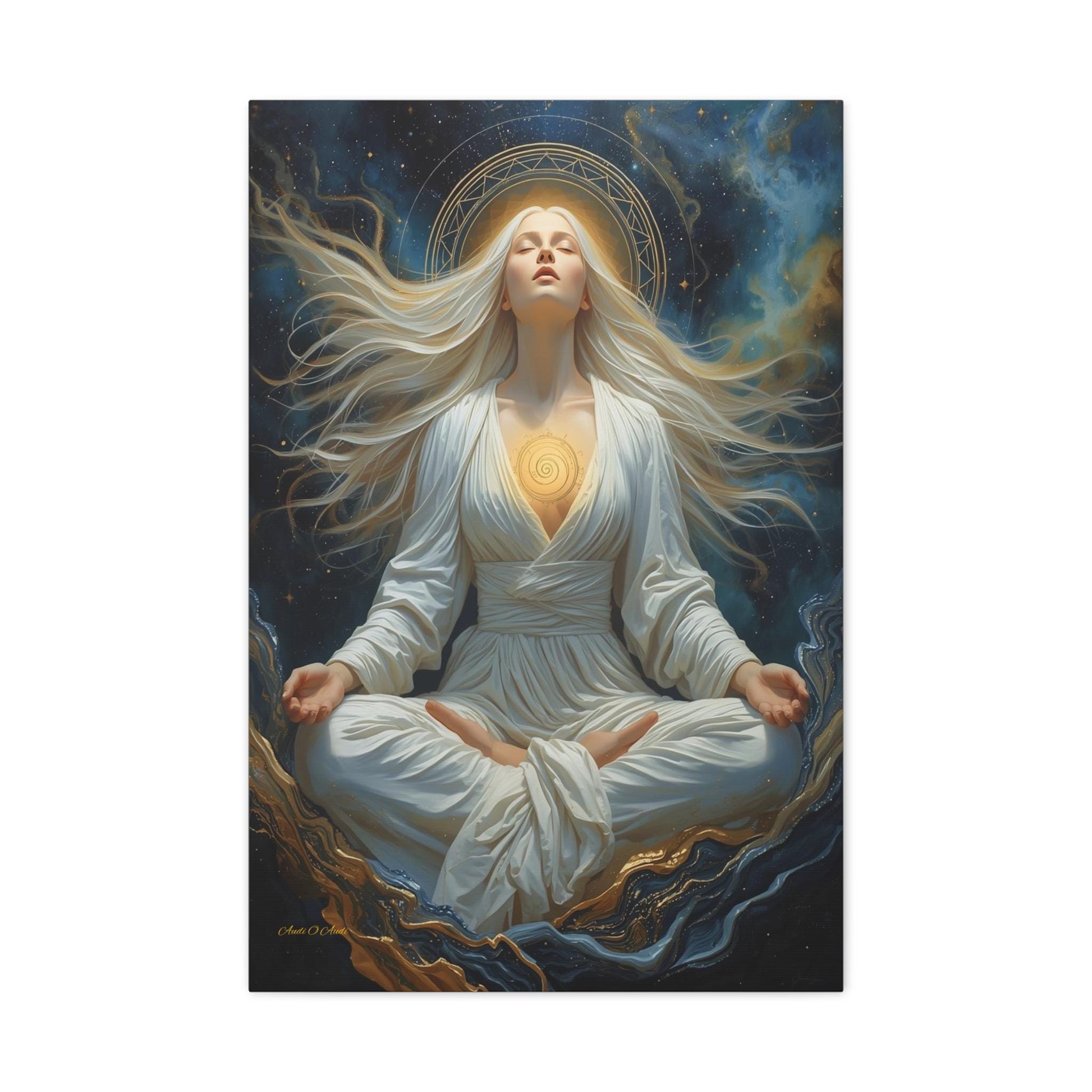 Center your space and your spirit with this breathtaking canvas print of a meditating celestial goddess. This deeply tranquil artwork features a serene figure seated in a classic lotus pose, her face lifted toward the glowing light of the cosmos.