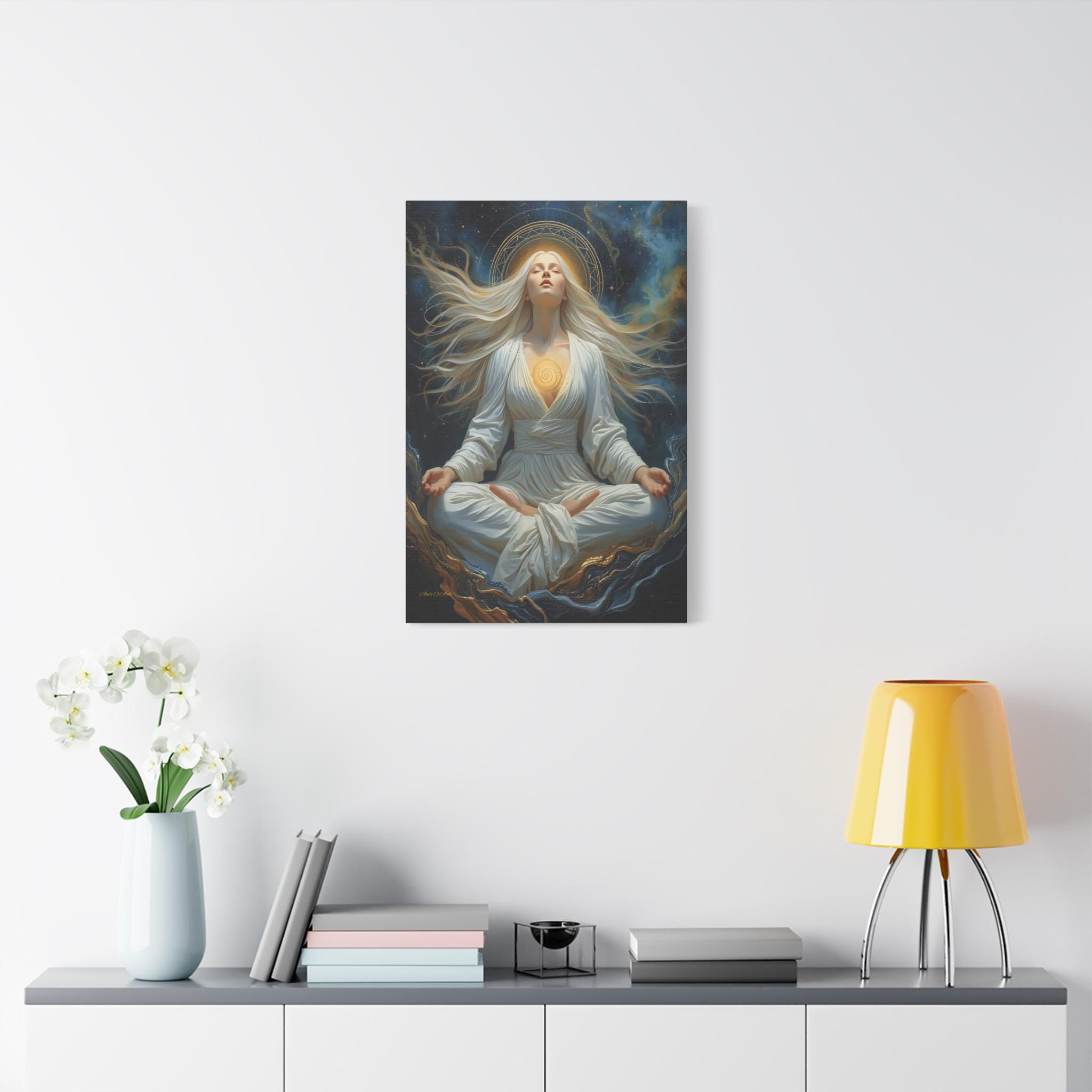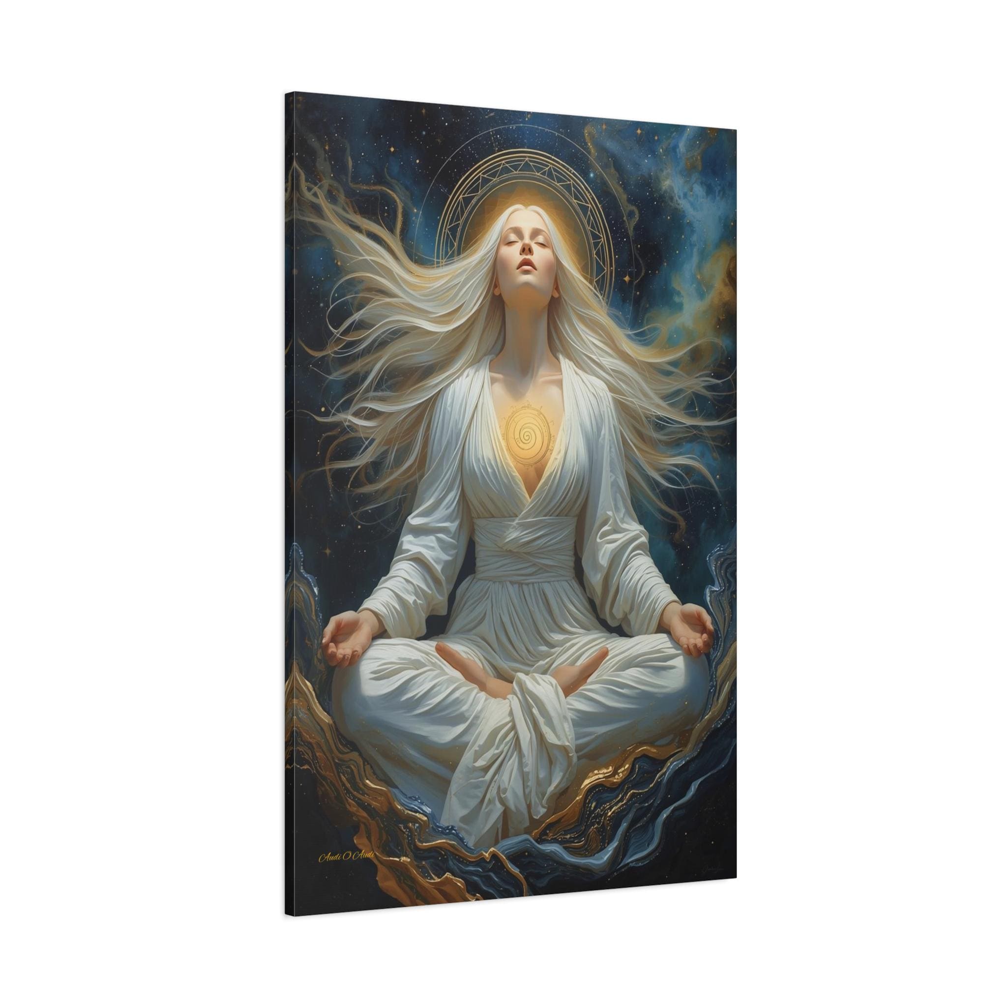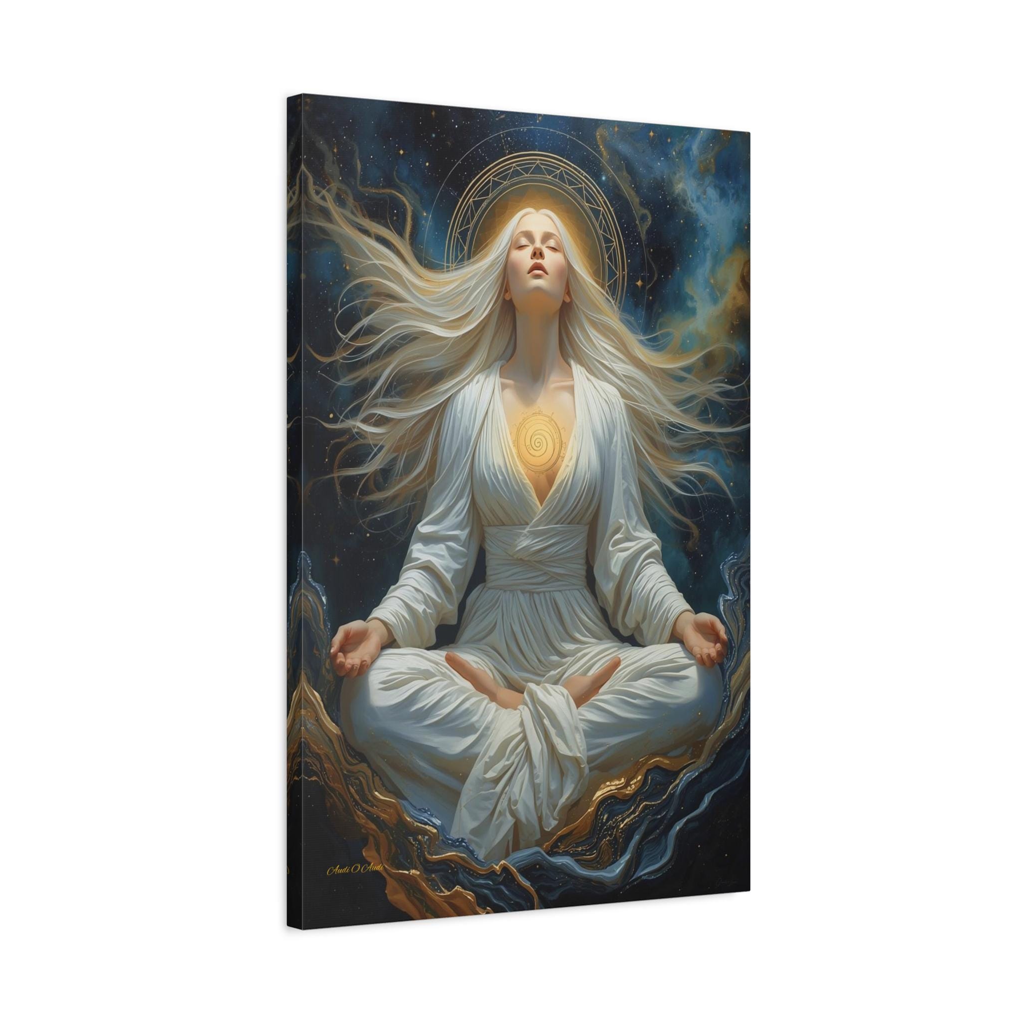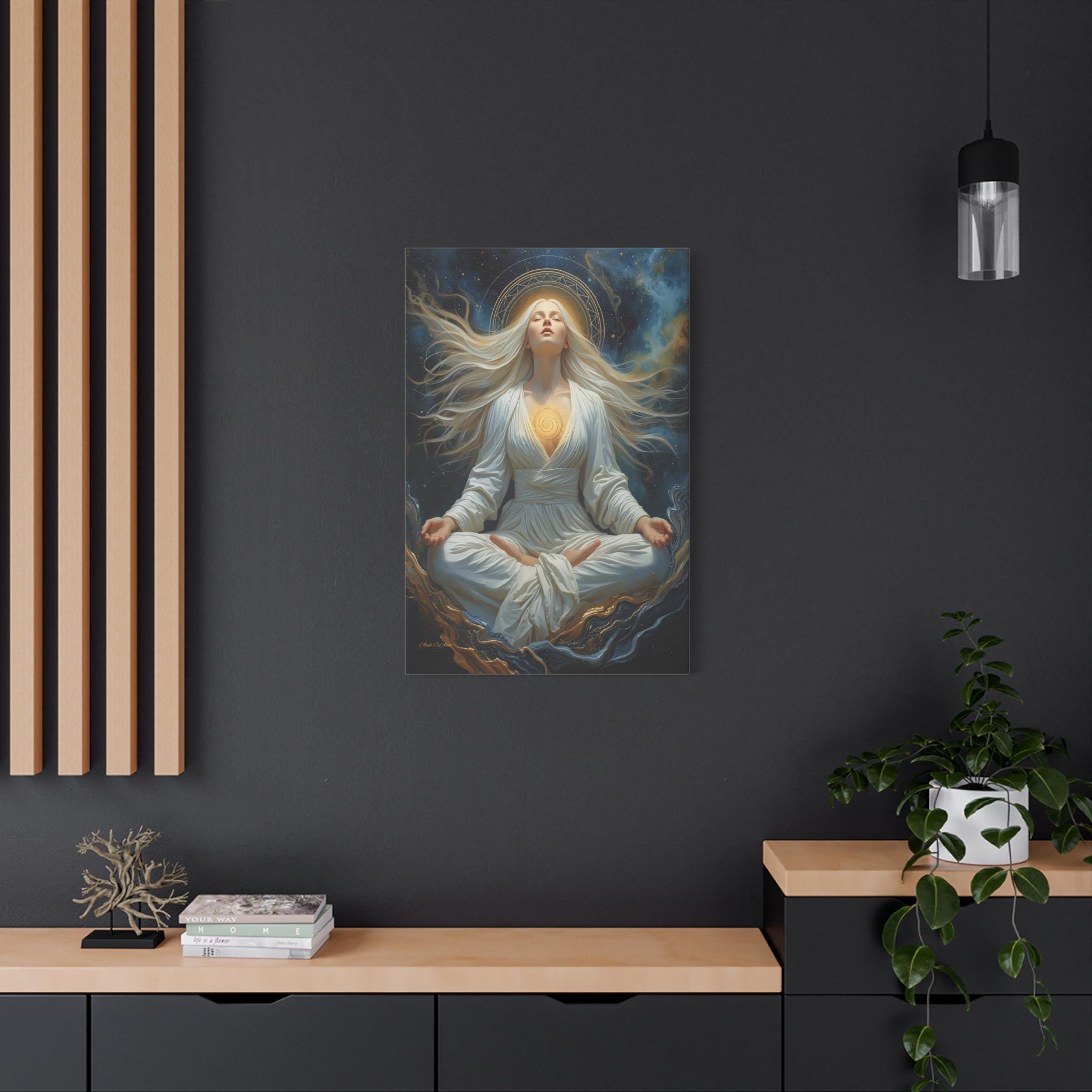 Center your space and your spirit with this breathtaking canvas print of a meditating celestial goddess. This deeply tranquil artwork features a serene figure seated in a classic lotus pose, her face lifted toward the glowing light of the cosmos.