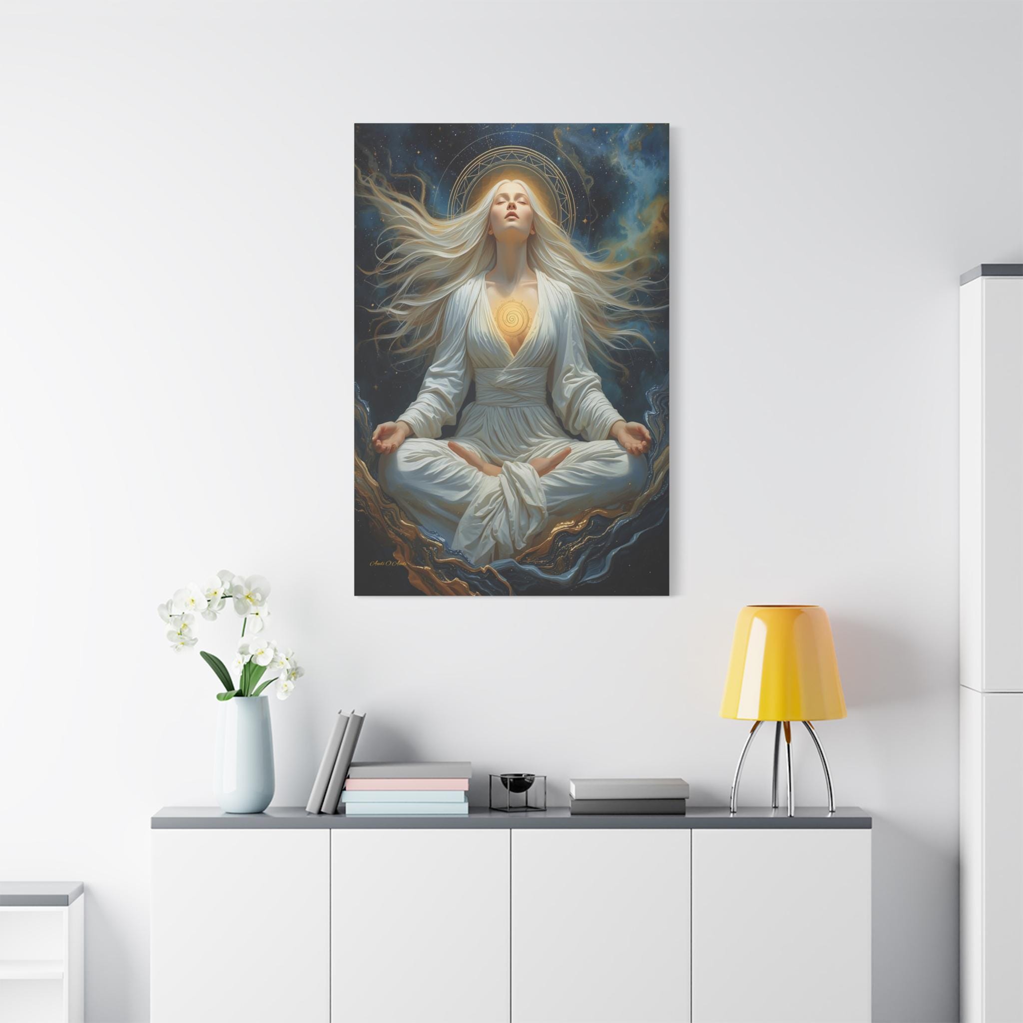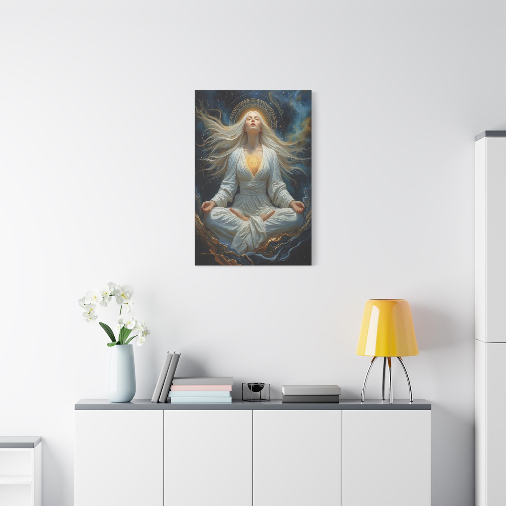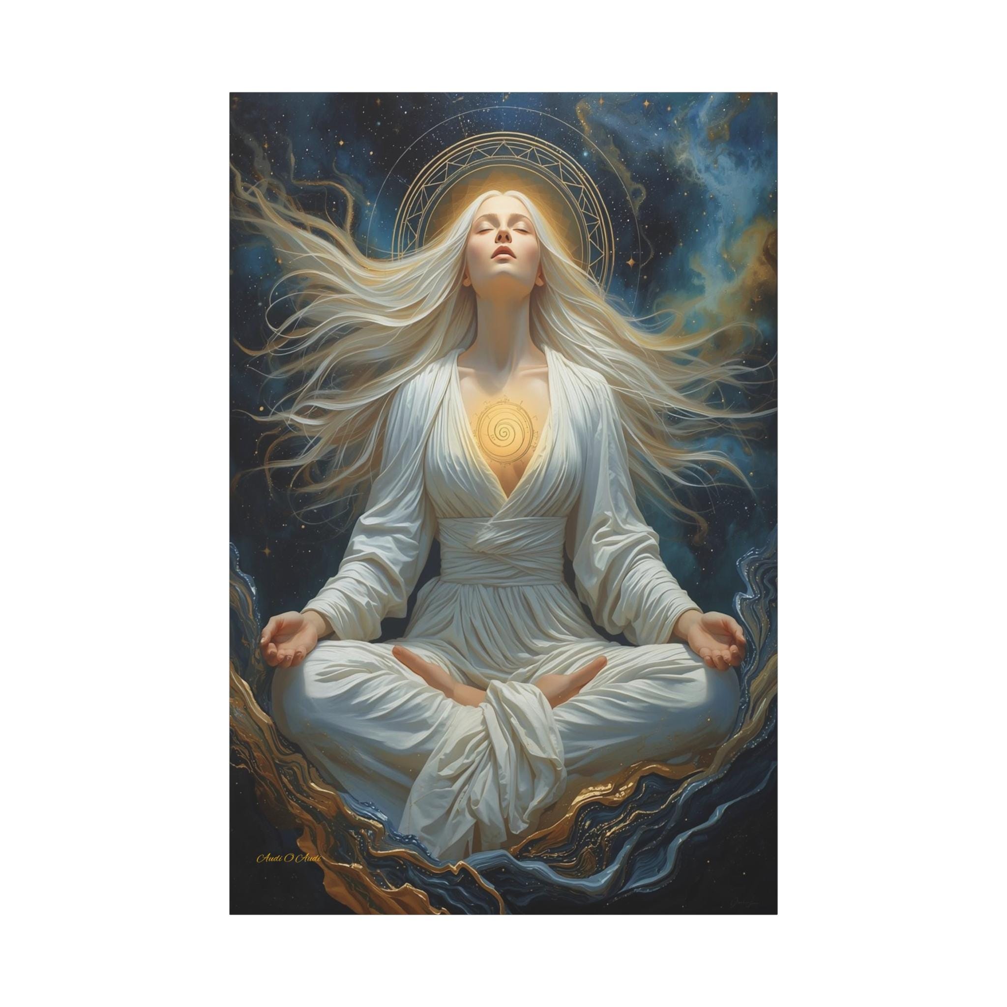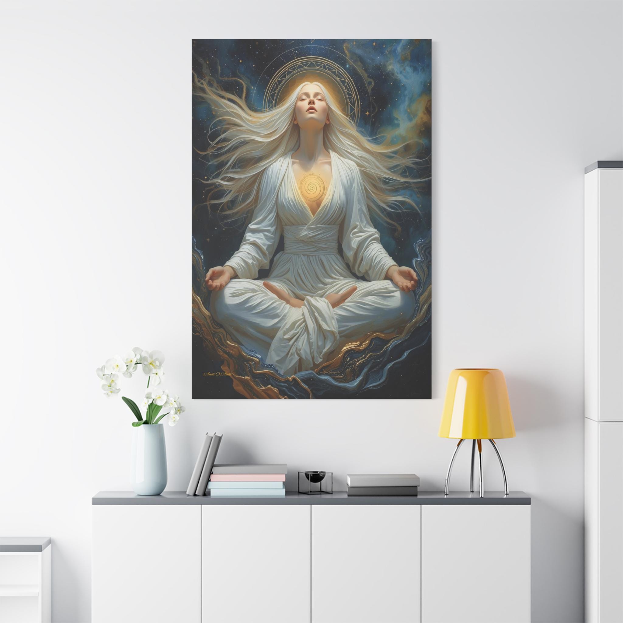 Center your space and your spirit with this breathtaking canvas print of a meditating celestial goddess. This deeply tranquil artwork features a serene figure seated in a classic lotus pose, her face lifted toward the glowing light of the cosmos.