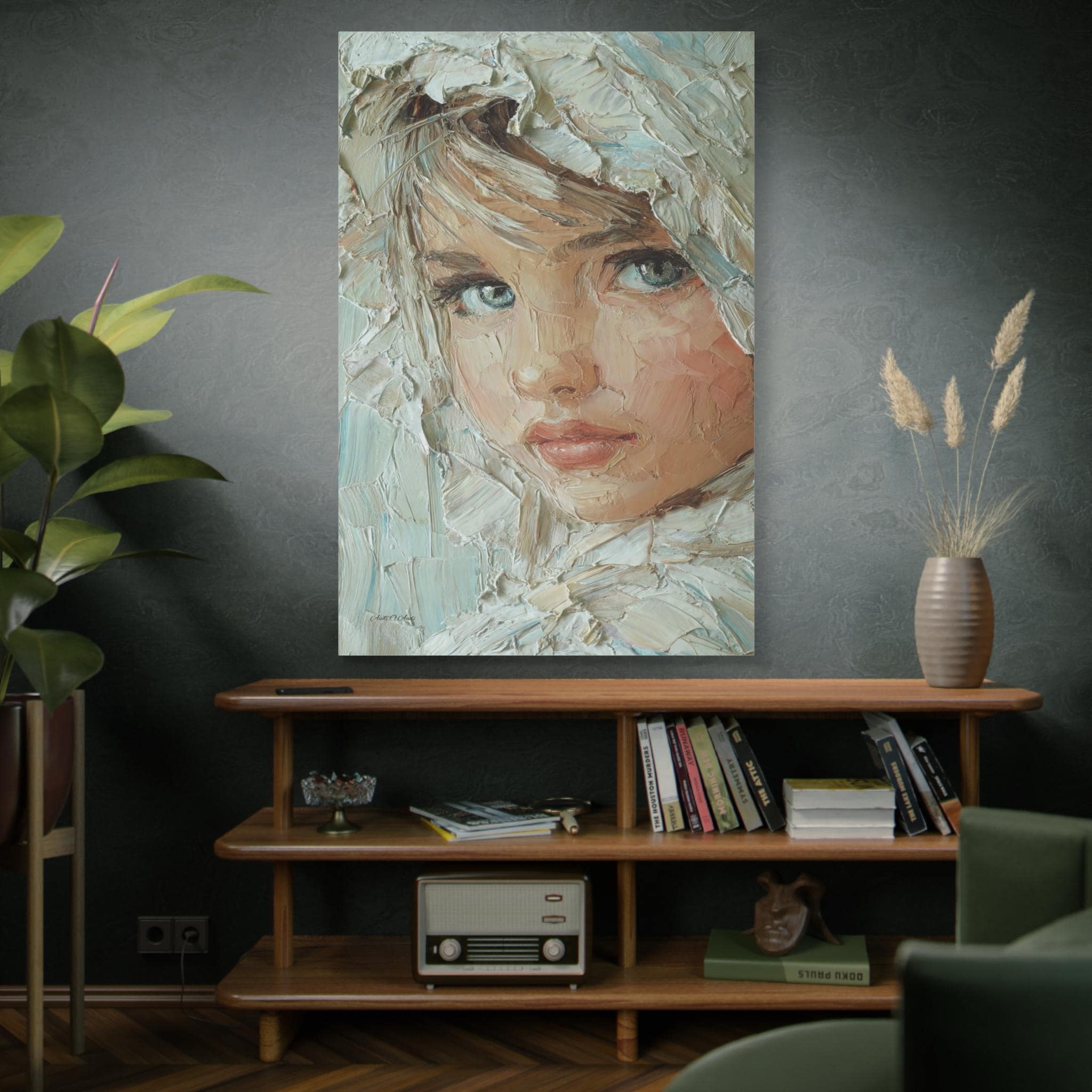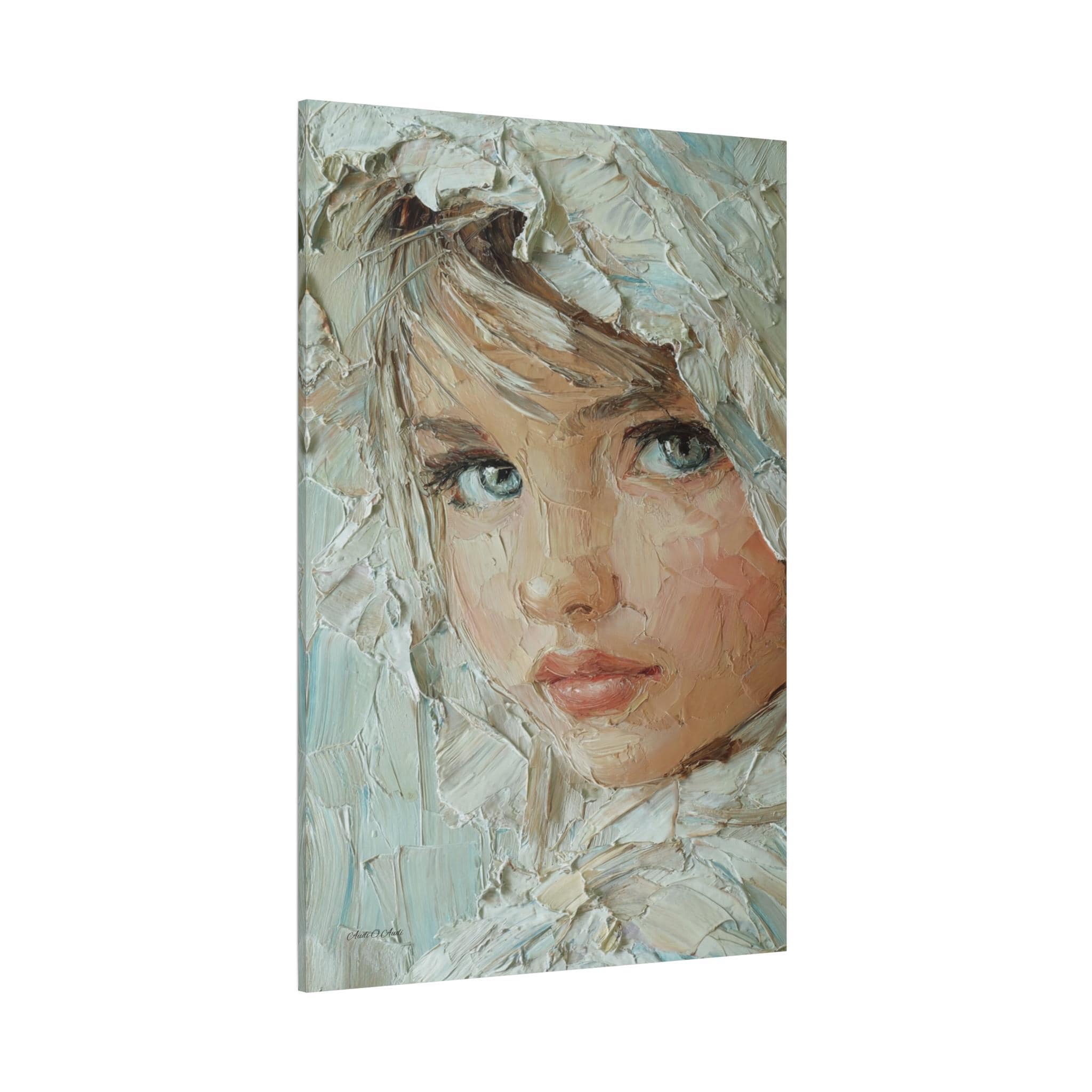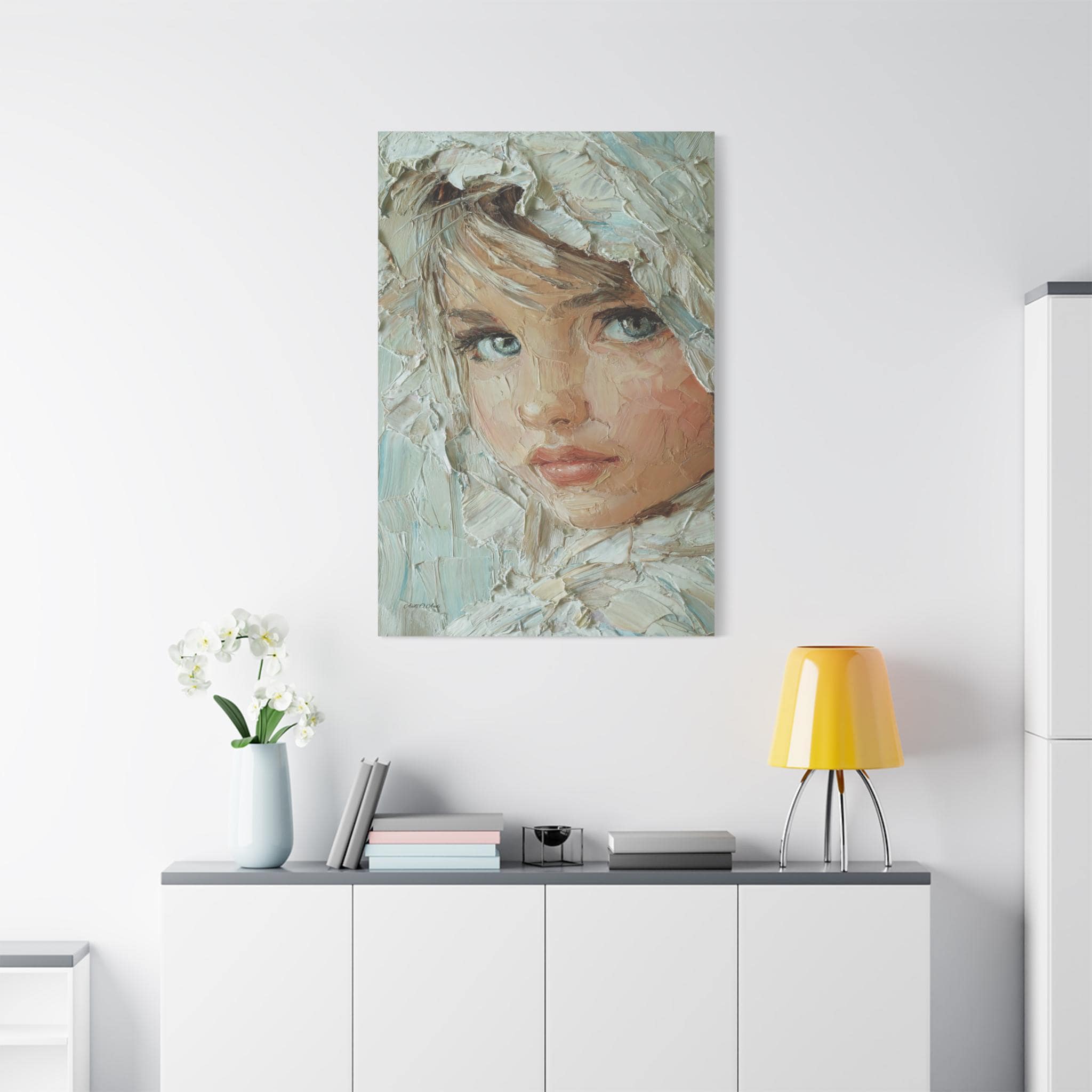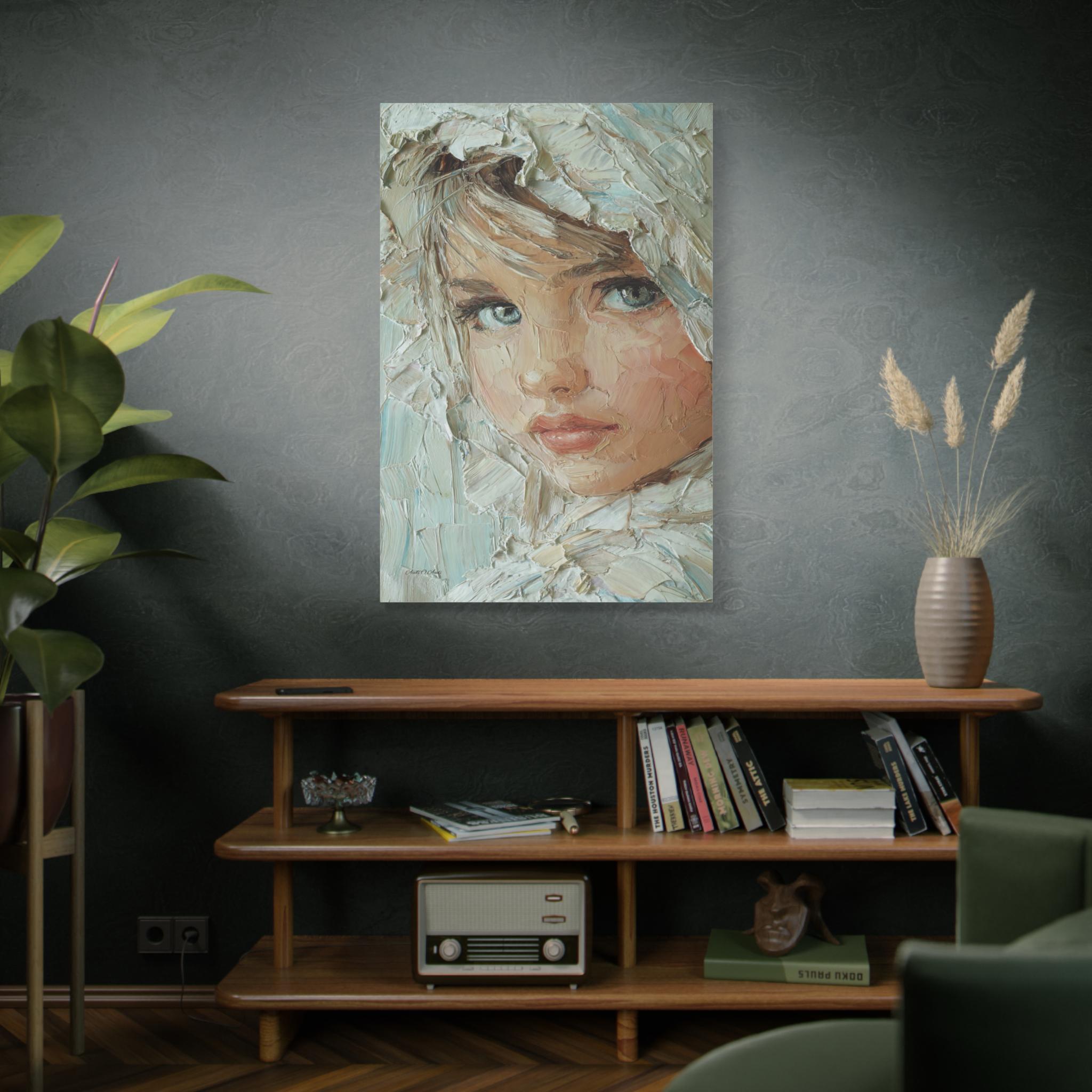 Bring a touch of tender, ethereal beauty into your home with this captivating canvas print of a young girl's portrait. This intimate artwork features a close-up of a child with striking blue eyes and a soft, peaceful expression, surrounded by a dramatic, heavily textured background.