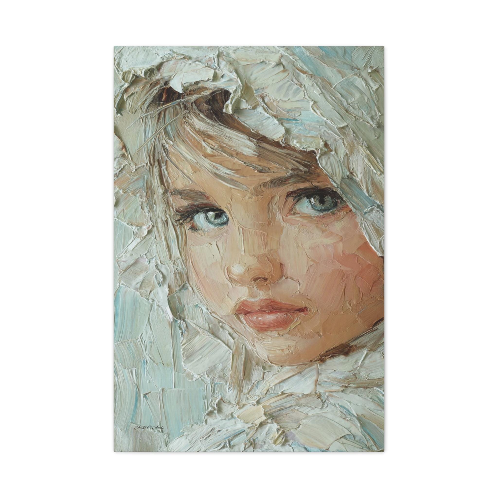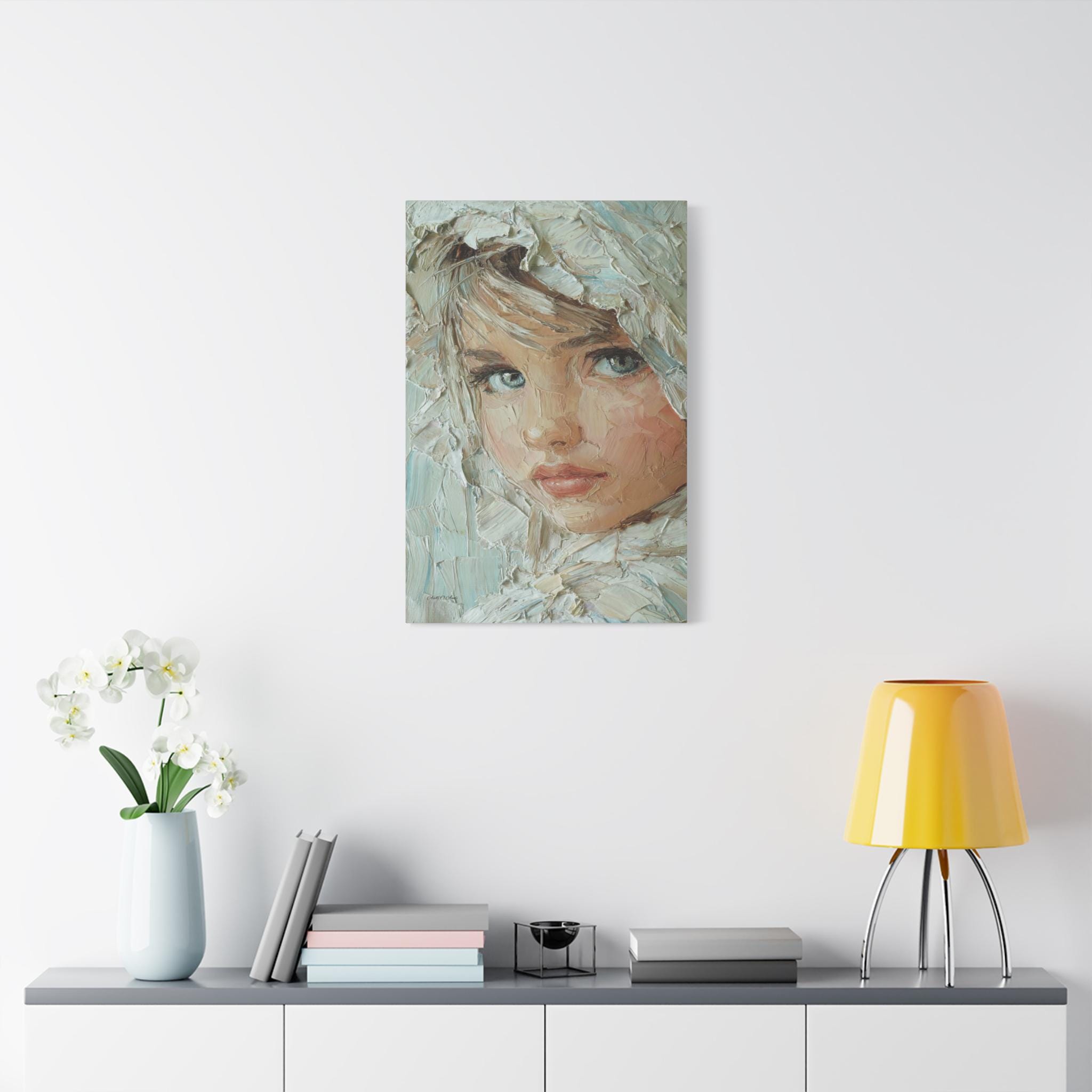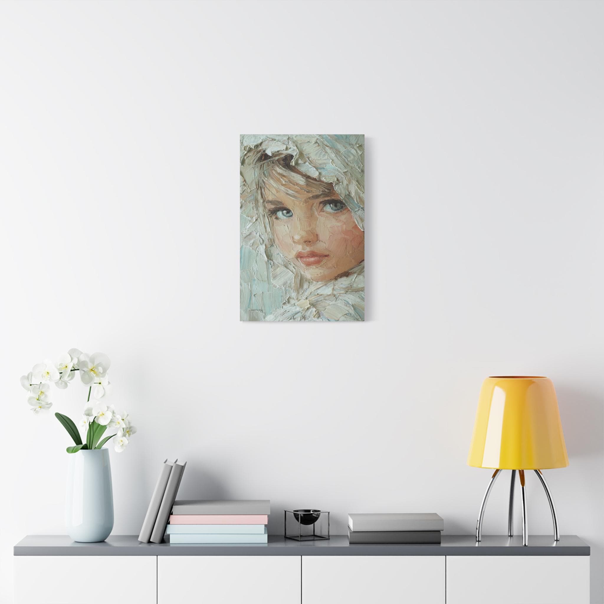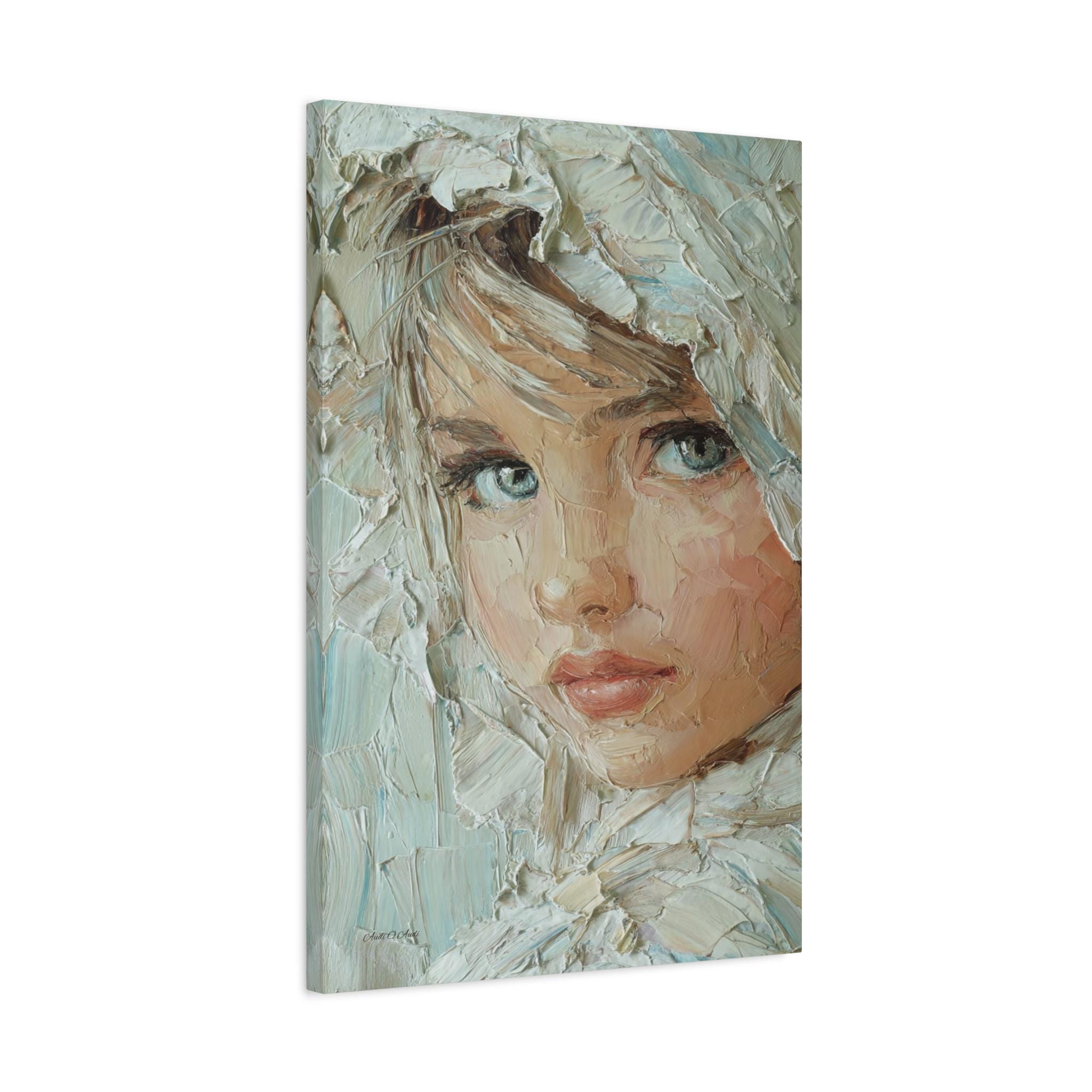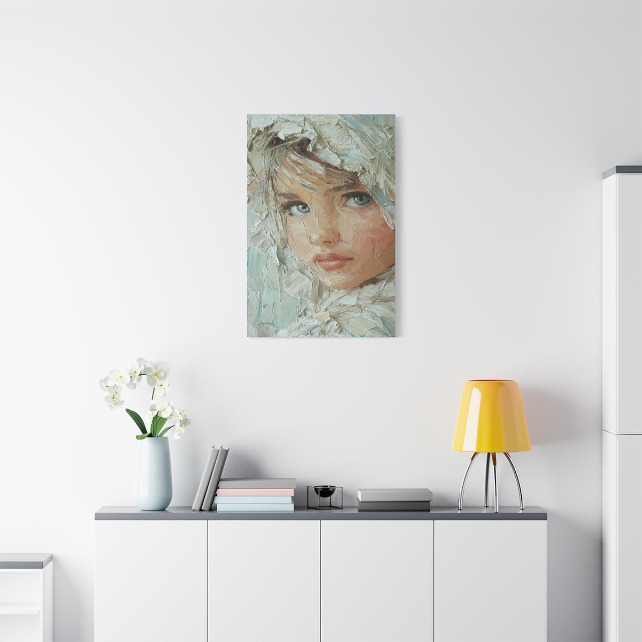 Bring a touch of tender, ethereal beauty into your home with this captivating canvas print of a young girl's portrait. This intimate artwork features a close-up of a child with striking blue eyes and a soft, peaceful expression, surrounded by a dramatic, heavily textured background.