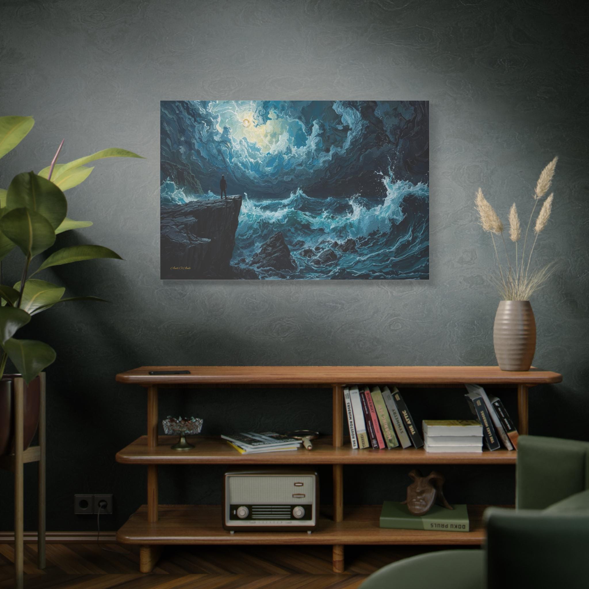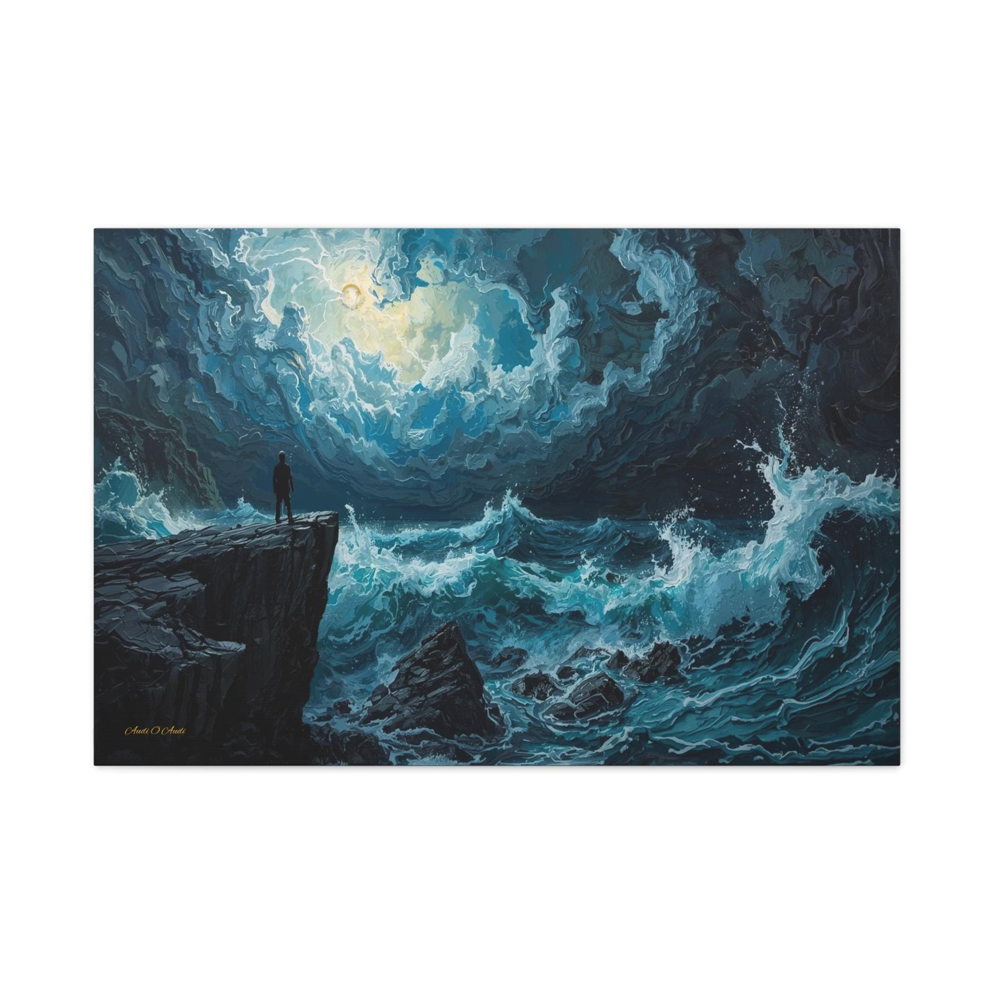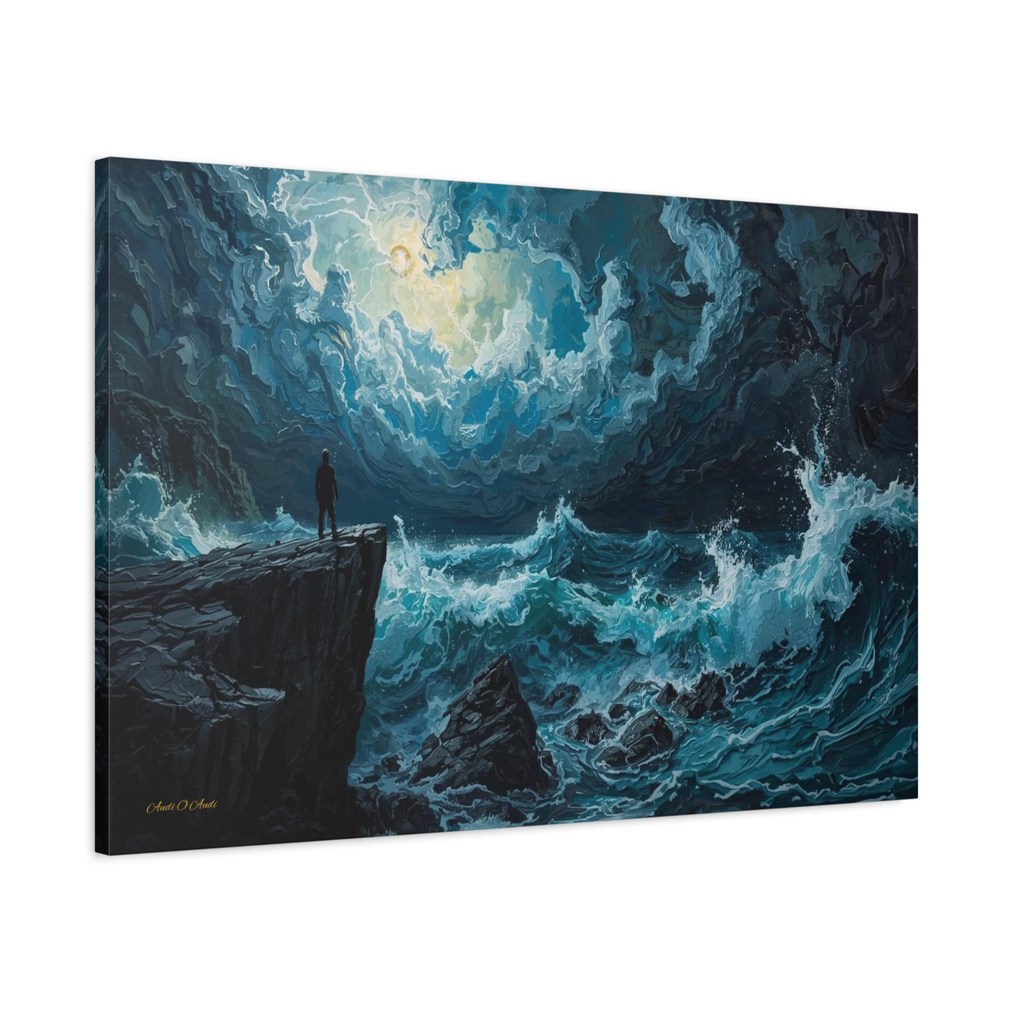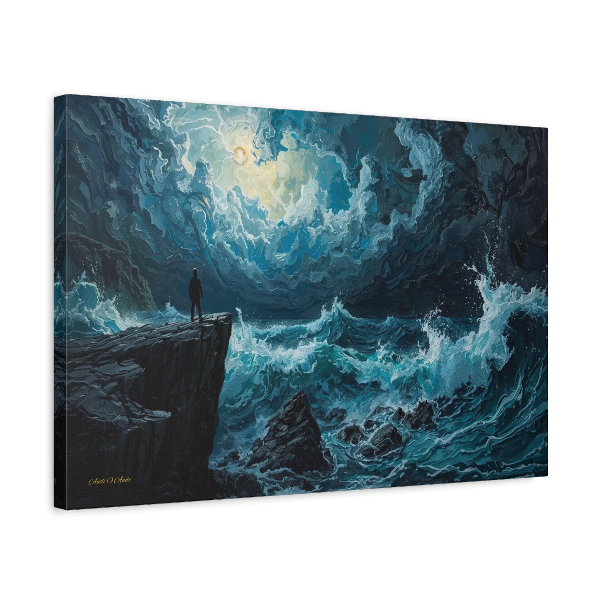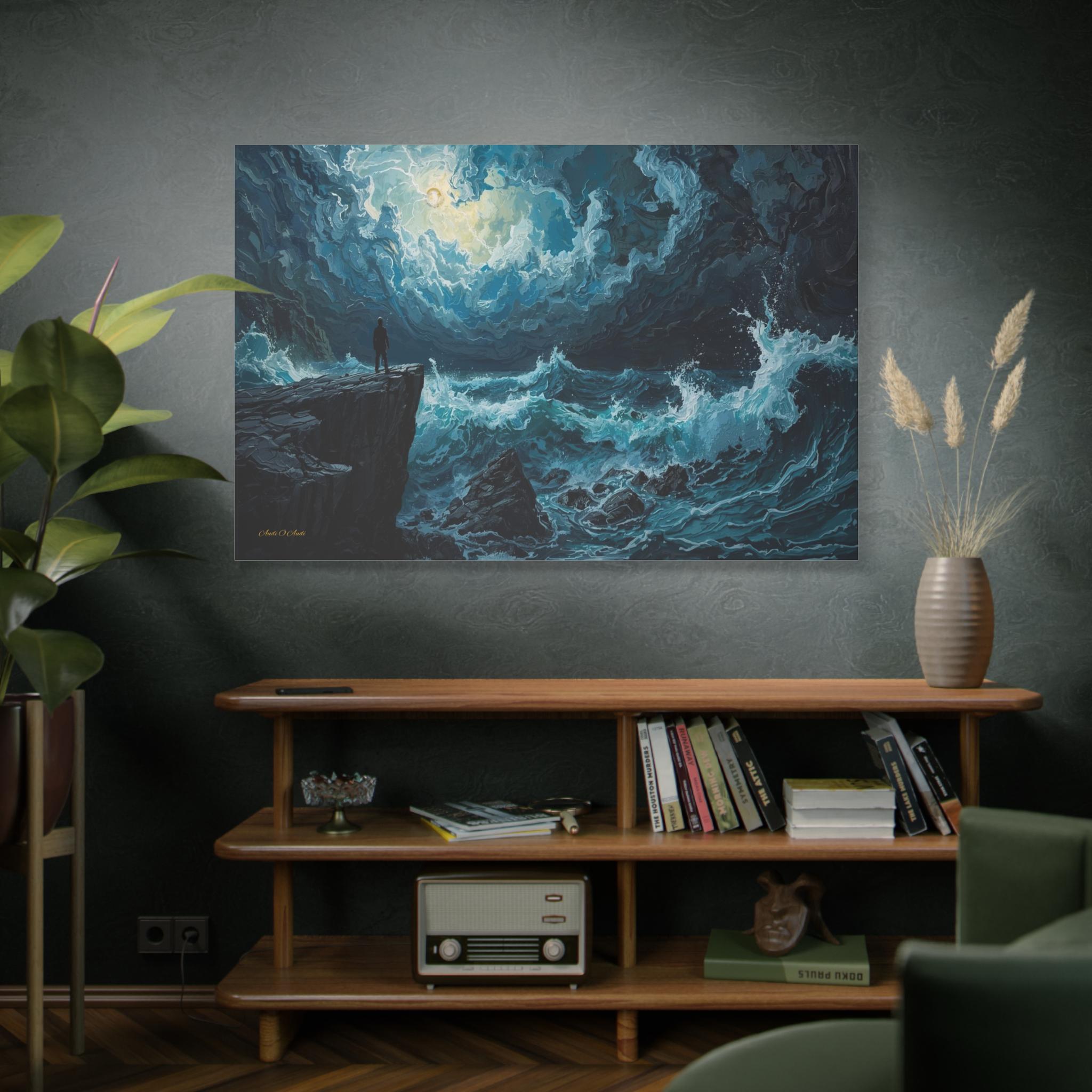 Embrace the awe-inspiring power of nature with this dramatic canvas print of a storm-tossed sea. This epic landscape artwork features a solitary figure standing firm on a jagged cliff edge, facing down massive, crashing ocean waves beneath a swirling, tempestuous sky.
