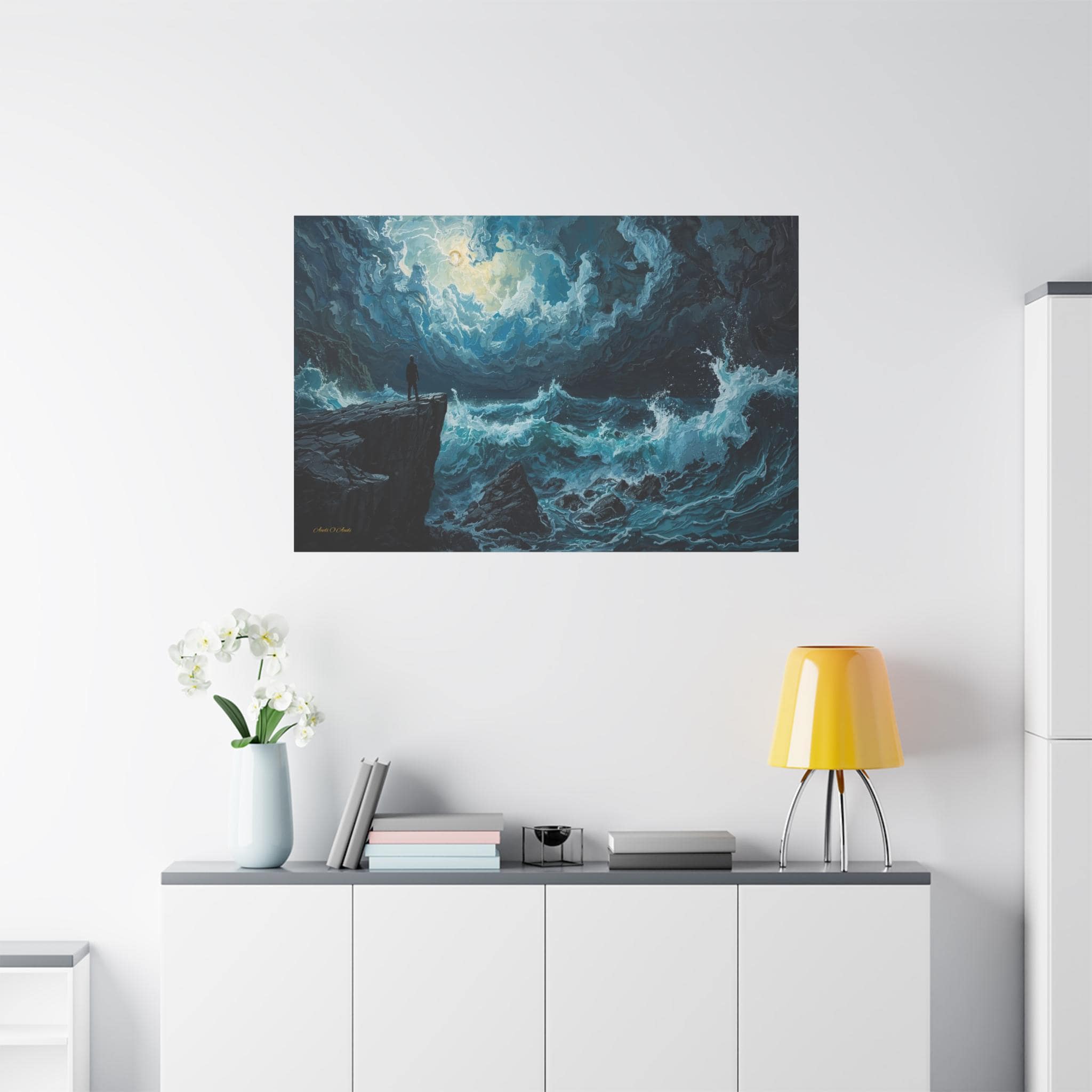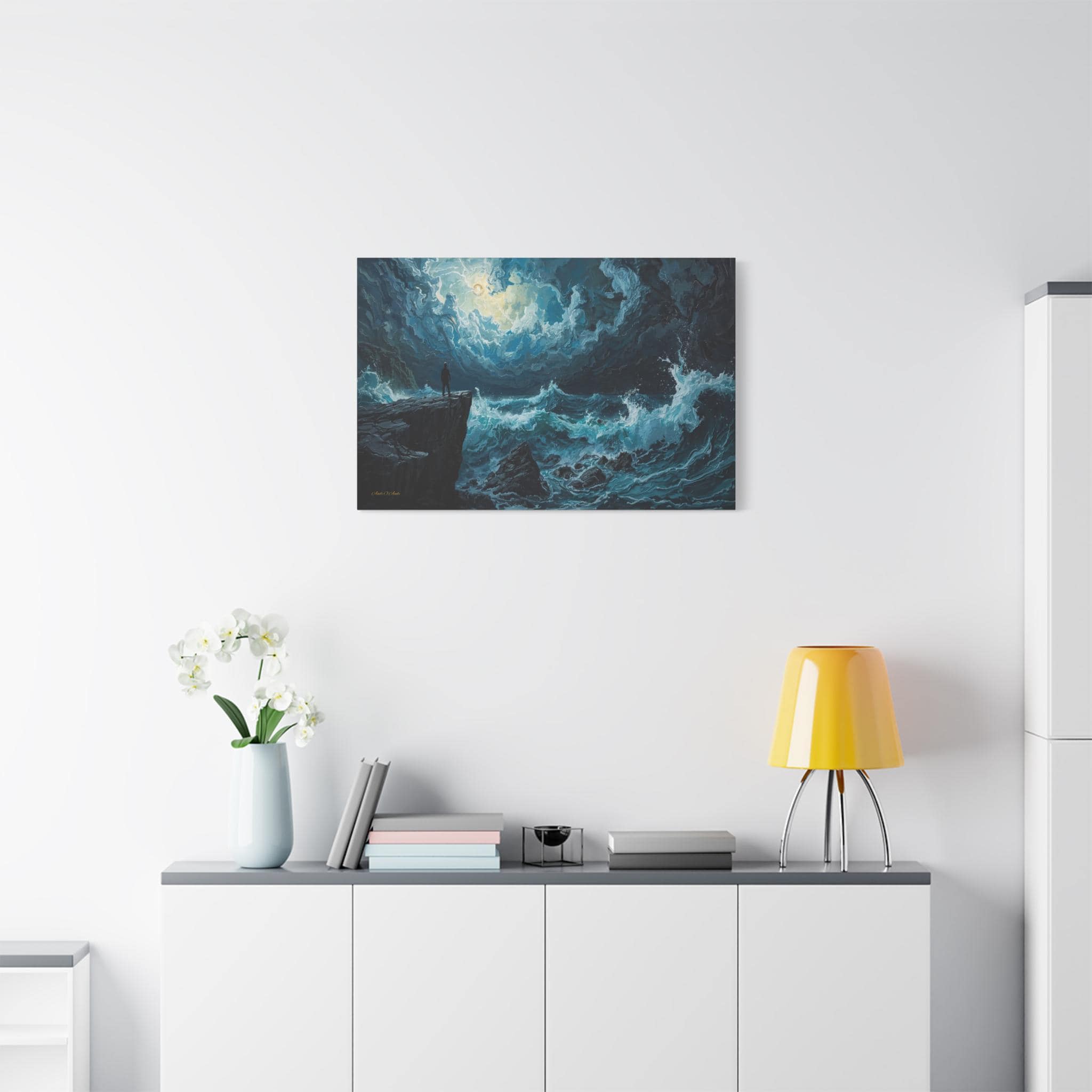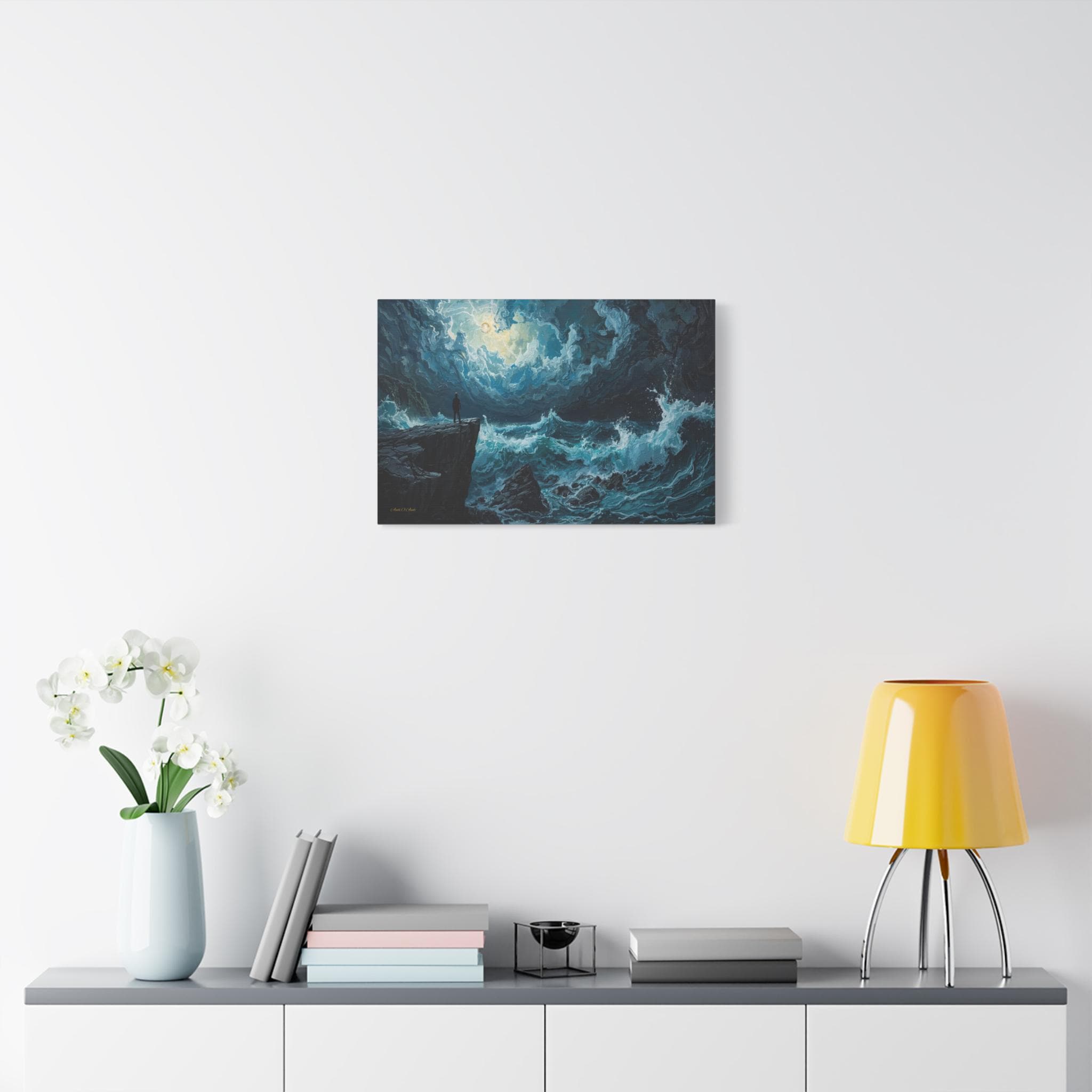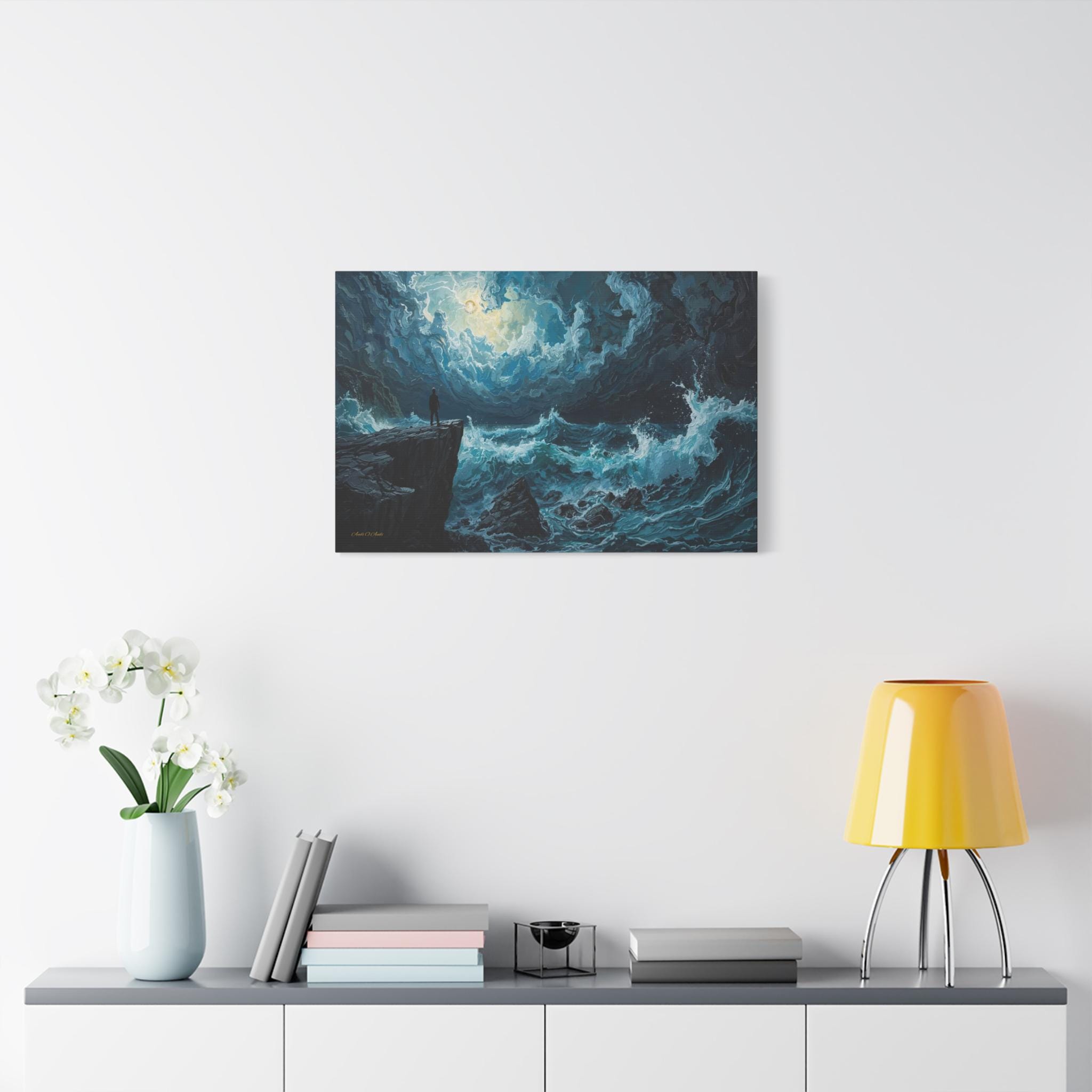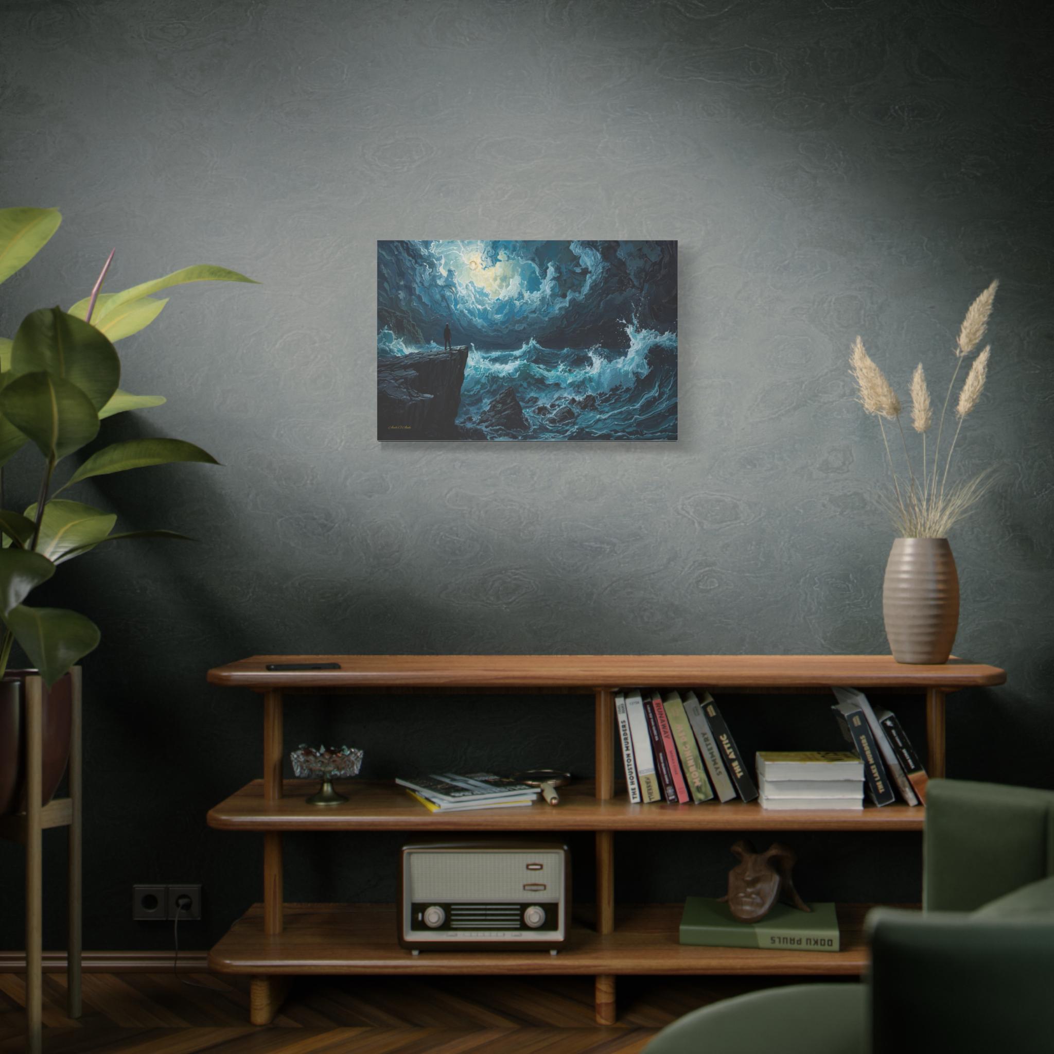 Embrace the awe-inspiring power of nature with this dramatic canvas print of a storm-tossed sea. This epic landscape artwork features a solitary figure standing firm on a jagged cliff edge, facing down massive, crashing ocean waves beneath a swirling, tempestuous sky.