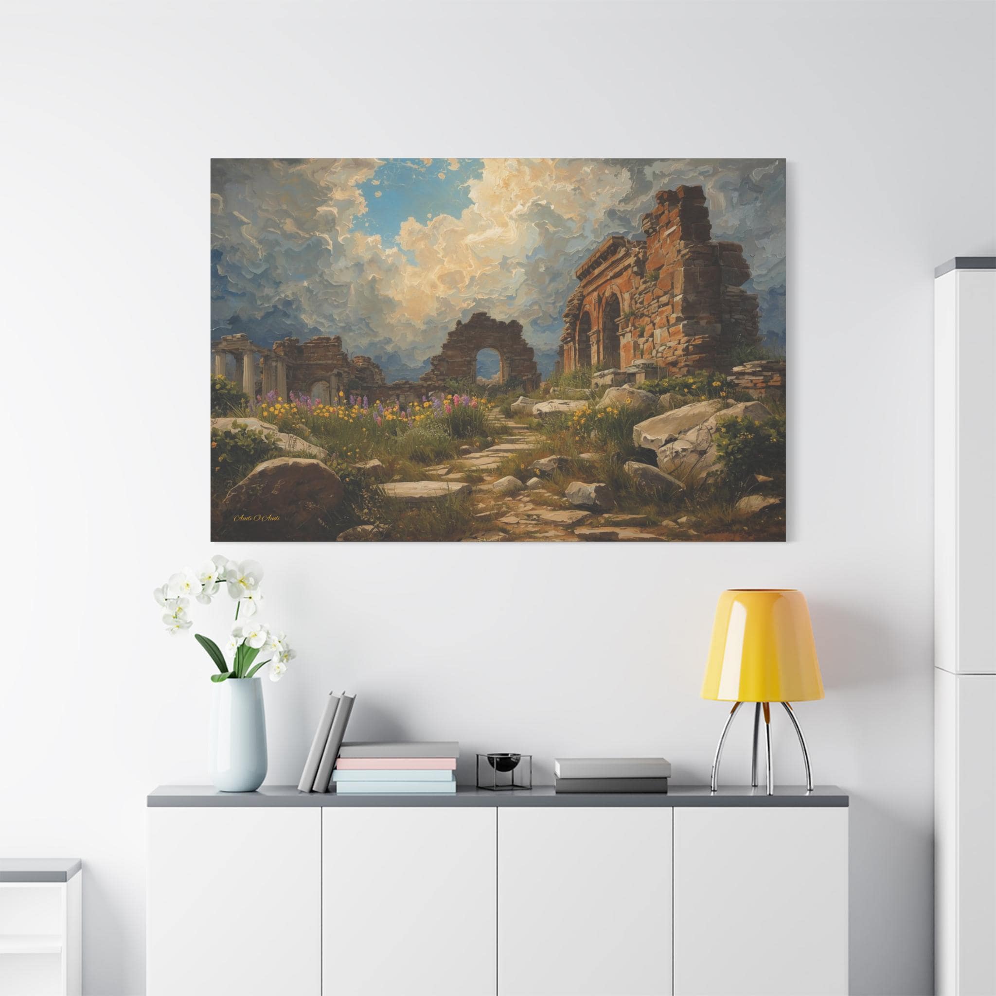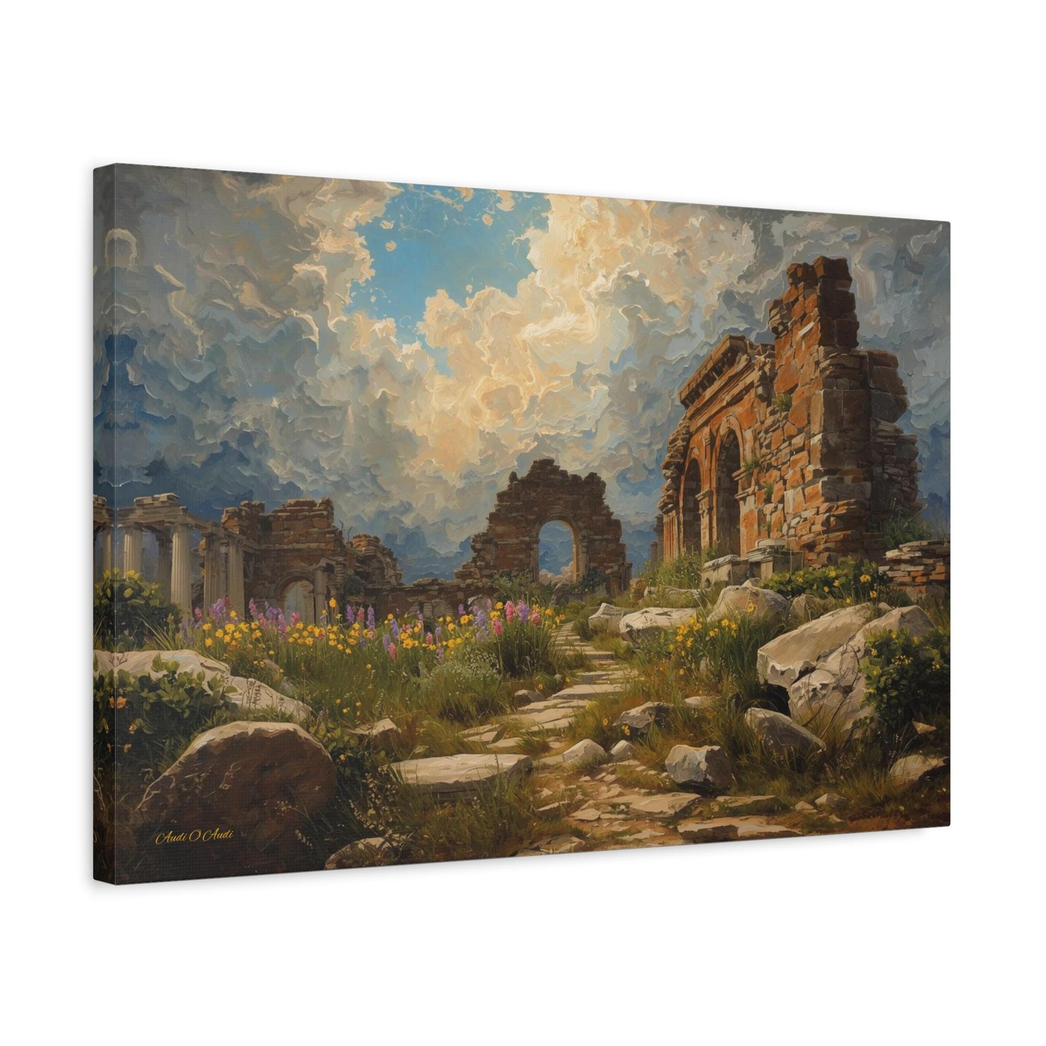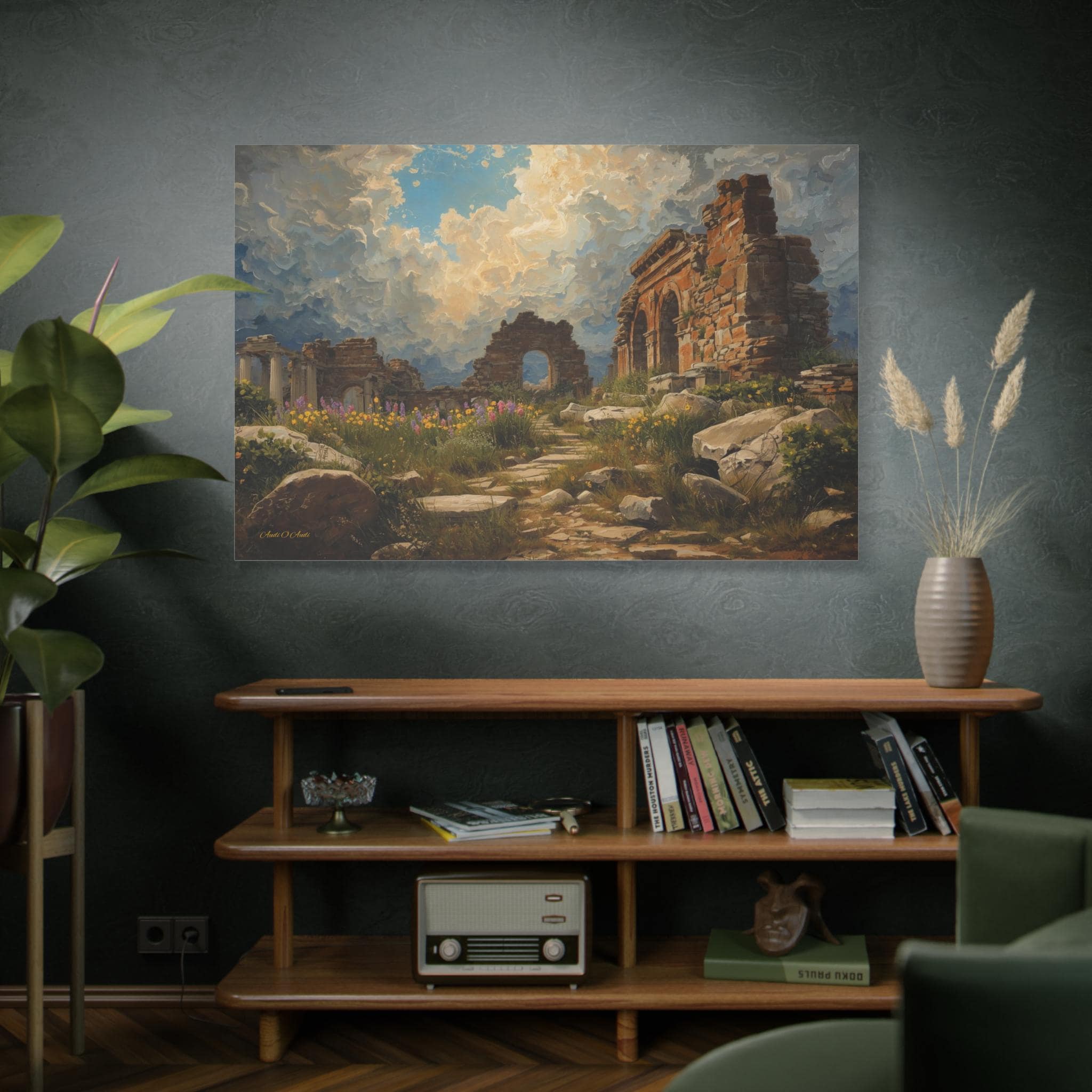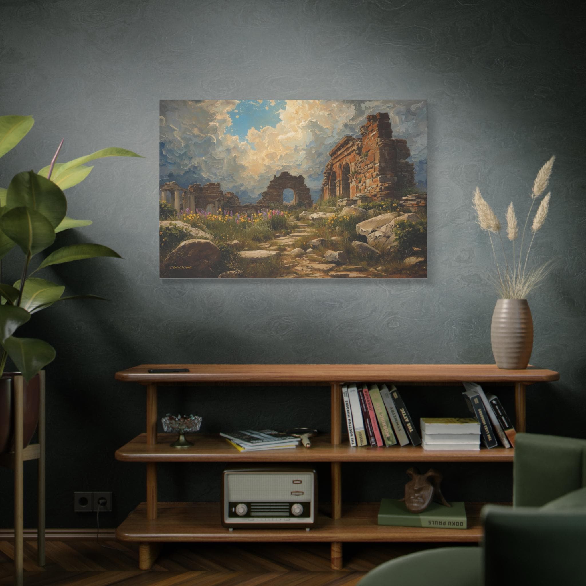 Discover beauty in unexpected places with this enchanting canvas print of sunlit ancient ruins. This captivating landscape artwork features a crumbling historical stone archway being gently reclaimed by nature, with vibrant yellow and purple wildflowers blooming along an old stone path.