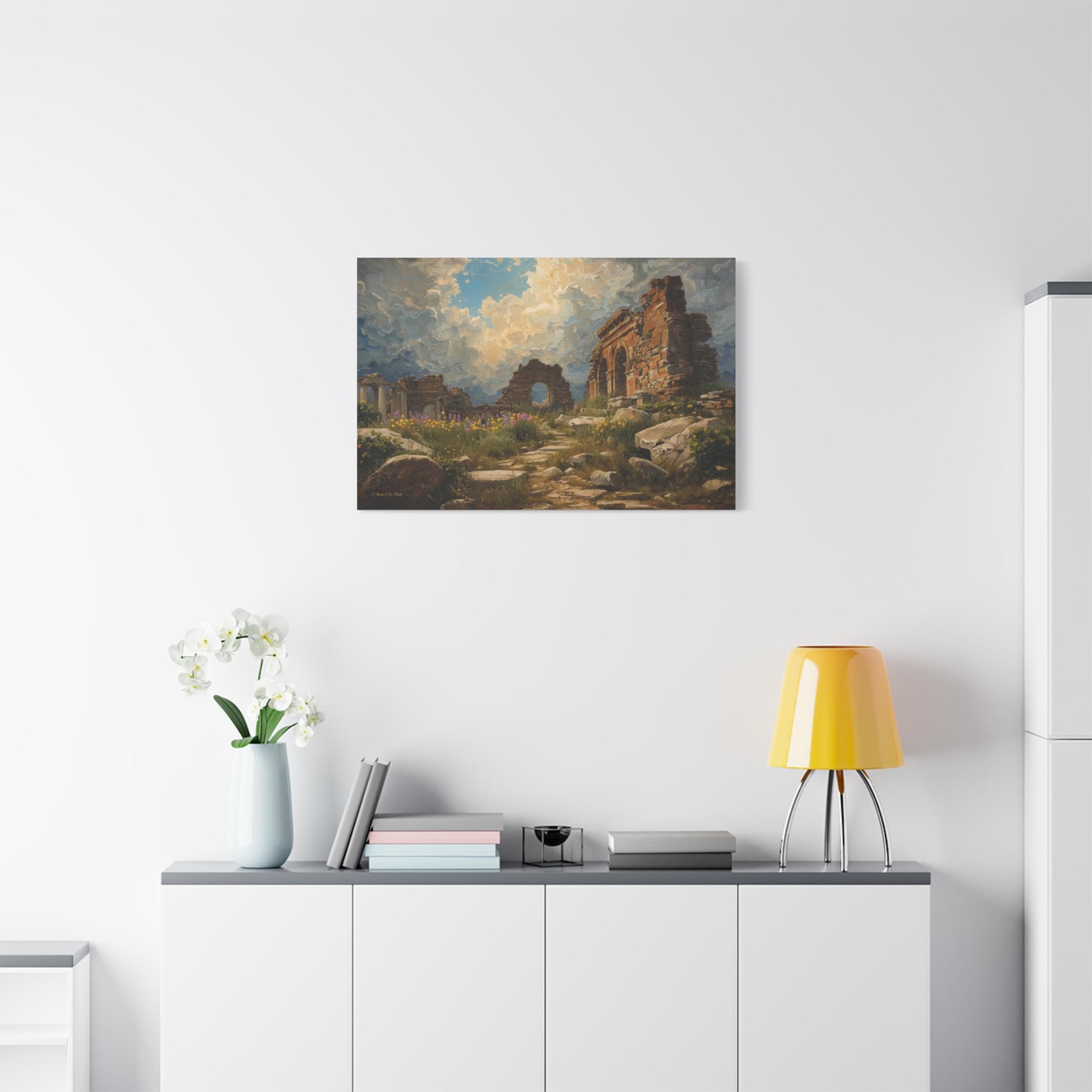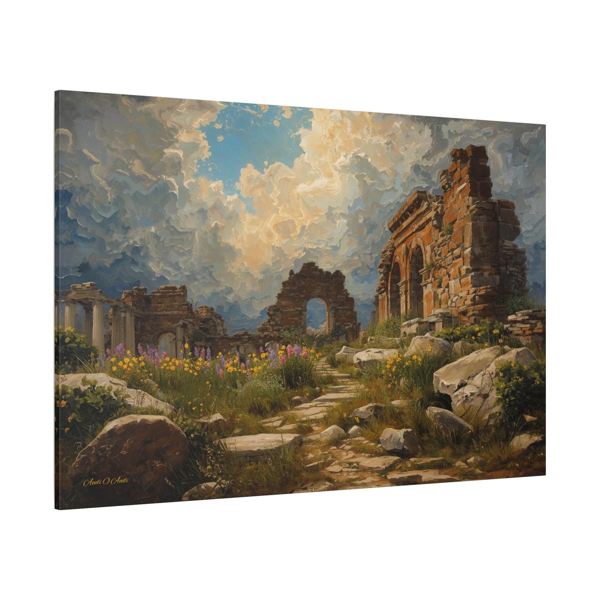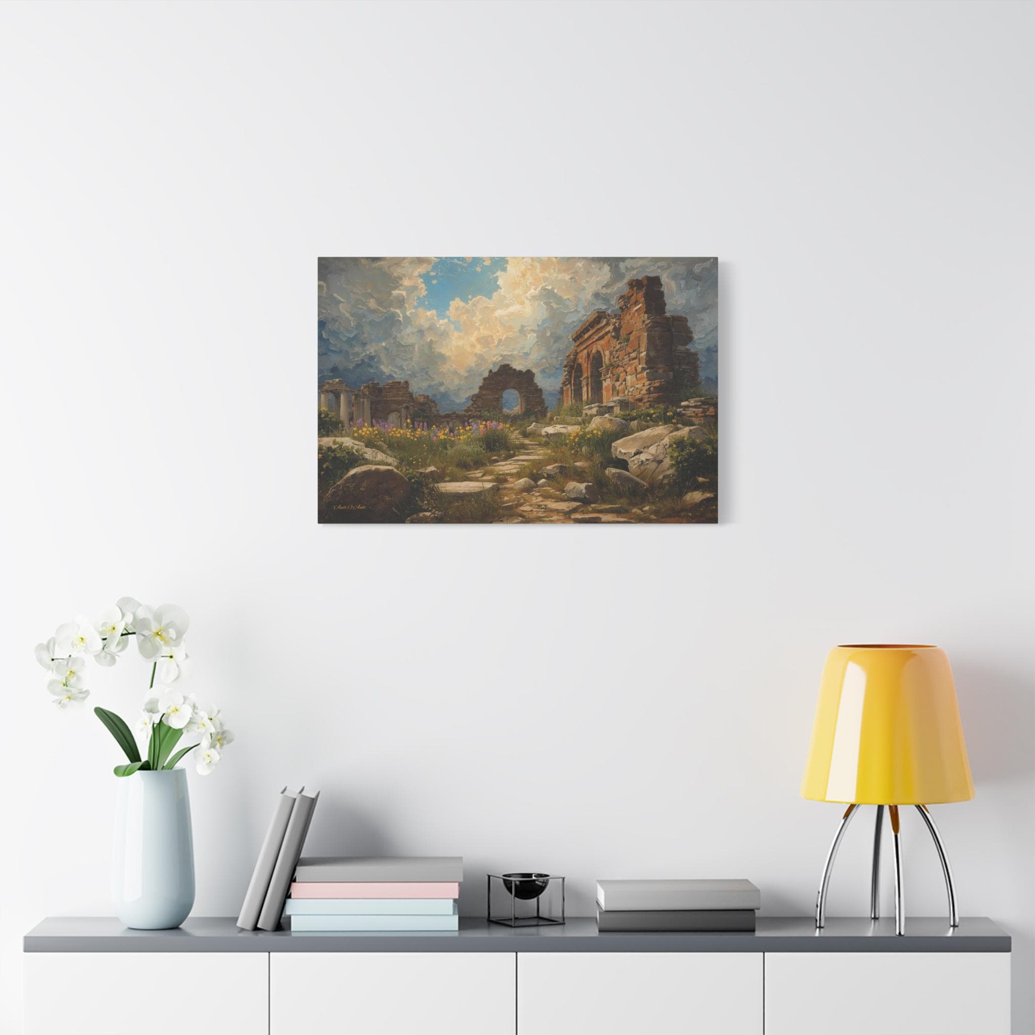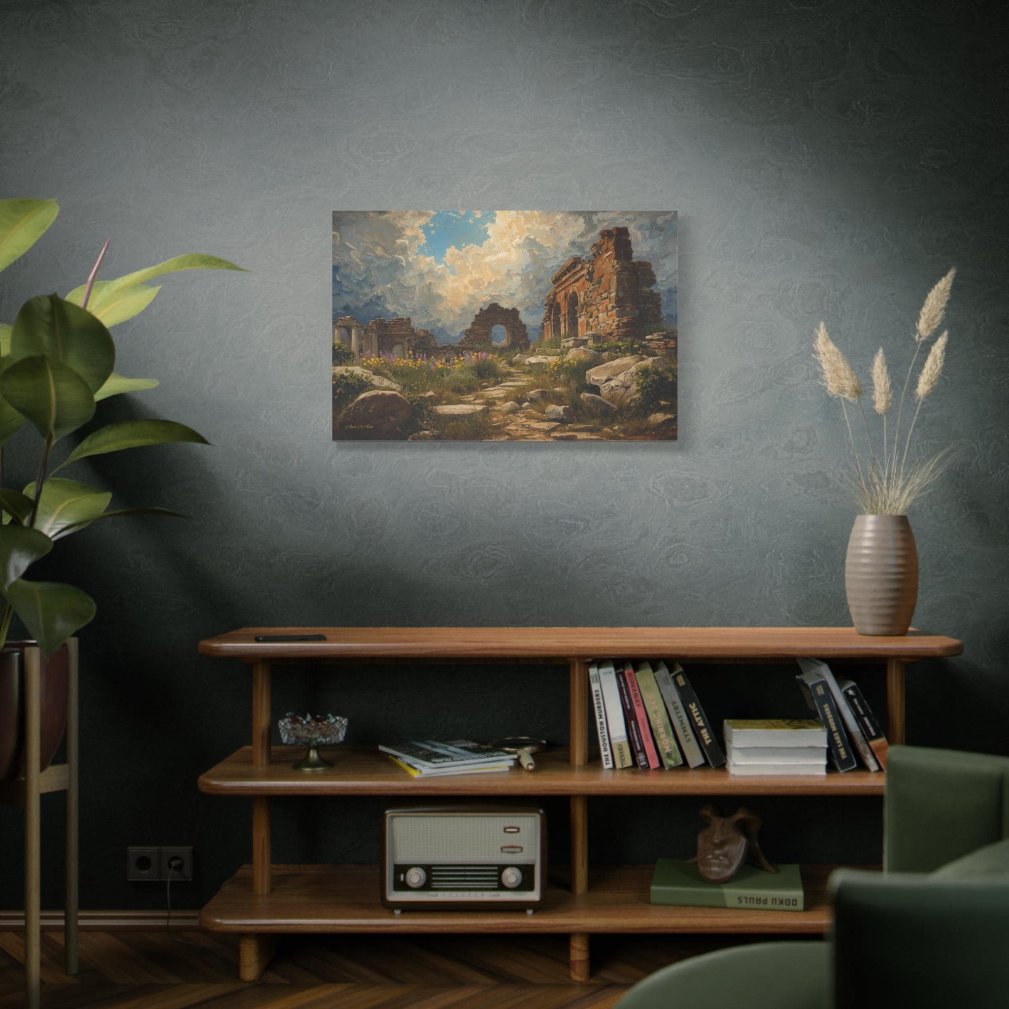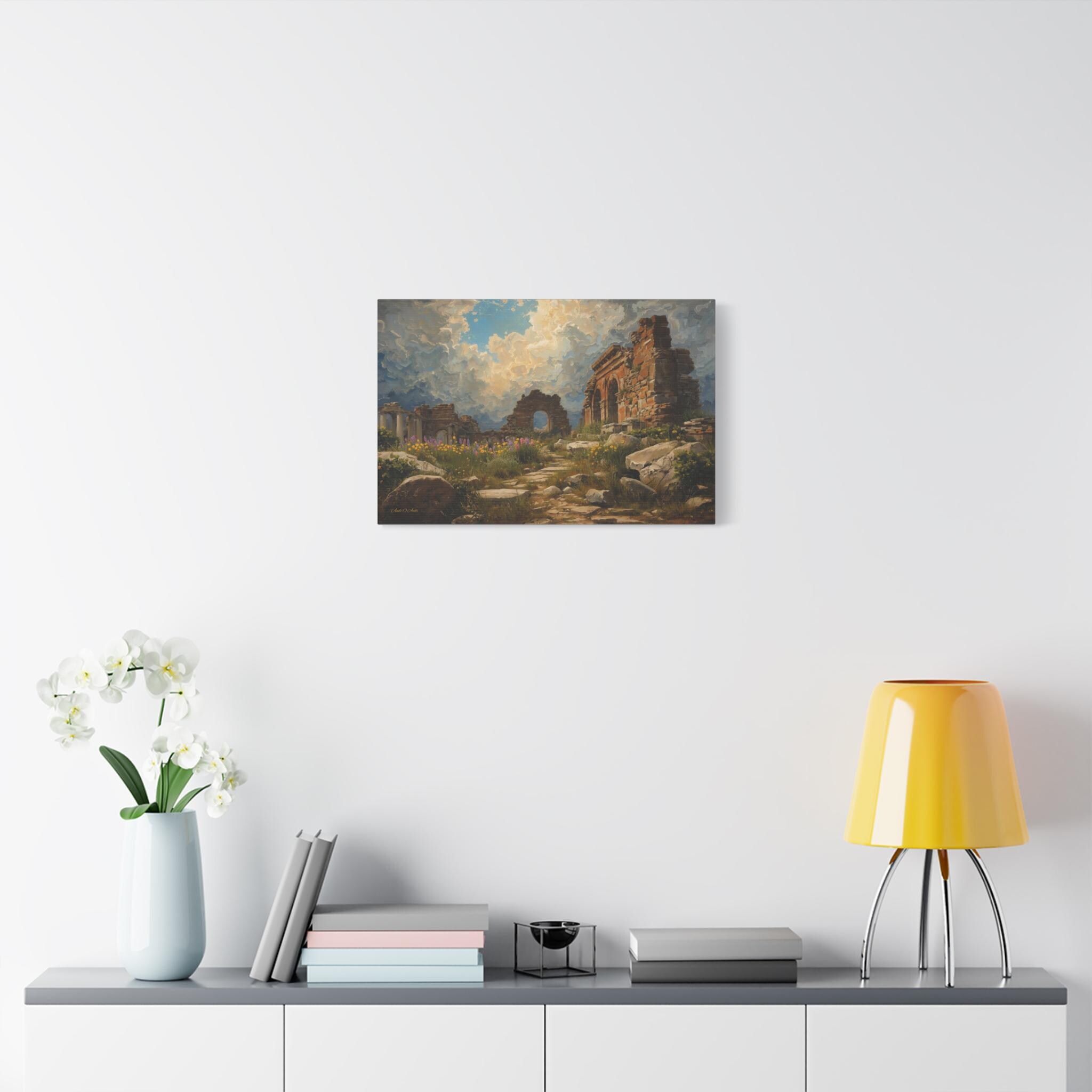 Discover beauty in unexpected places with this enchanting canvas print of sunlit ancient ruins. This captivating landscape artwork features a crumbling historical stone archway being gently reclaimed by nature, with vibrant yellow and purple wildflowers blooming along an old stone path.