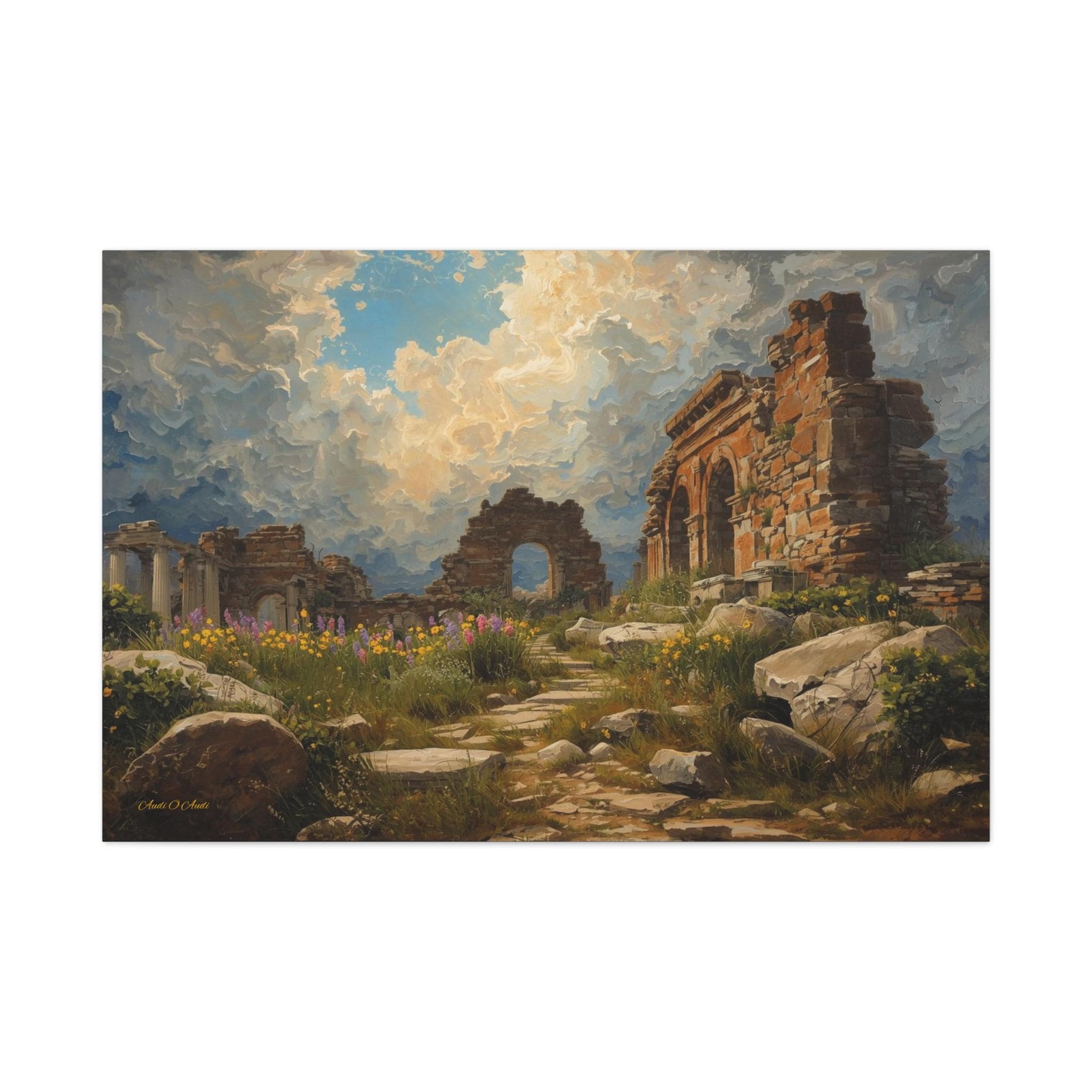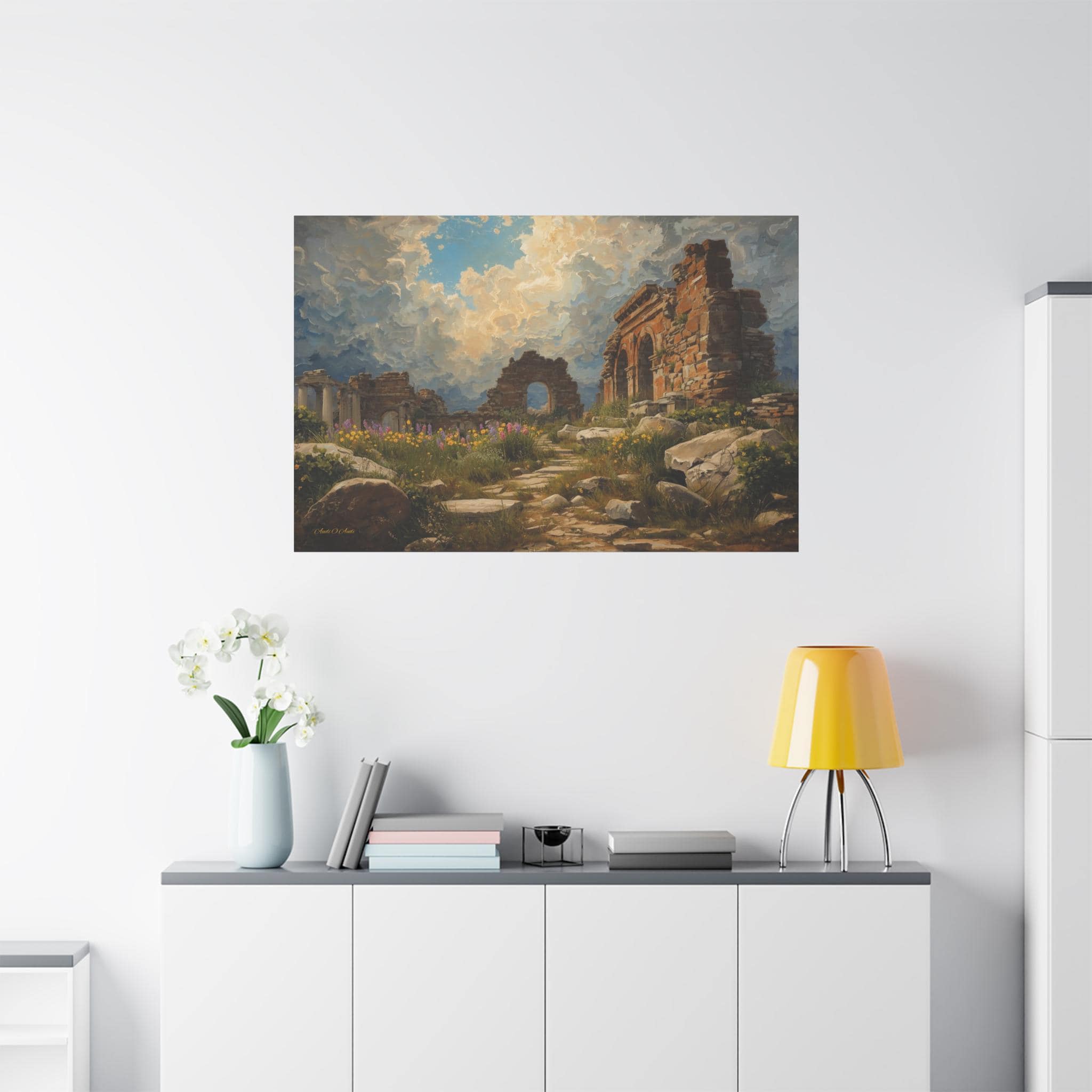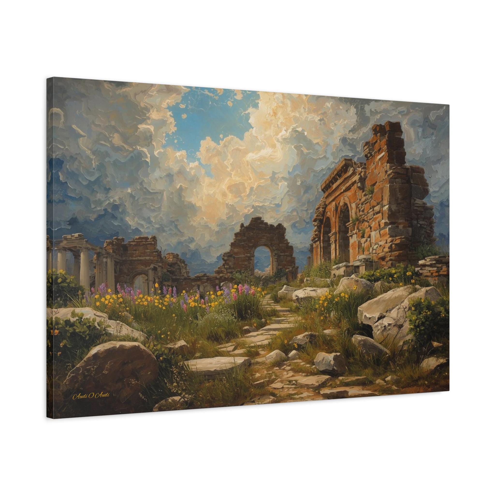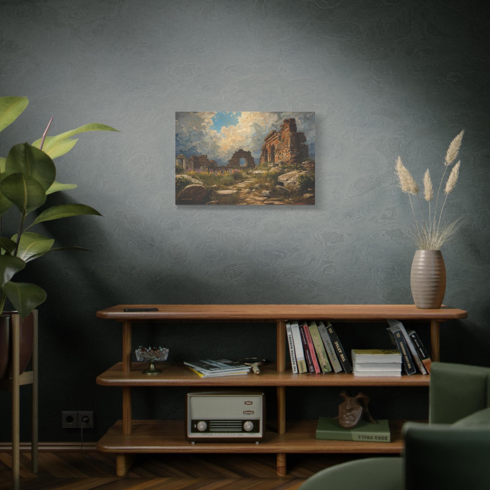 Discover beauty in unexpected places with this enchanting canvas print of sunlit ancient ruins. This captivating landscape artwork features a crumbling historical stone archway being gently reclaimed by nature, with vibrant yellow and purple wildflowers blooming along an old stone path.
