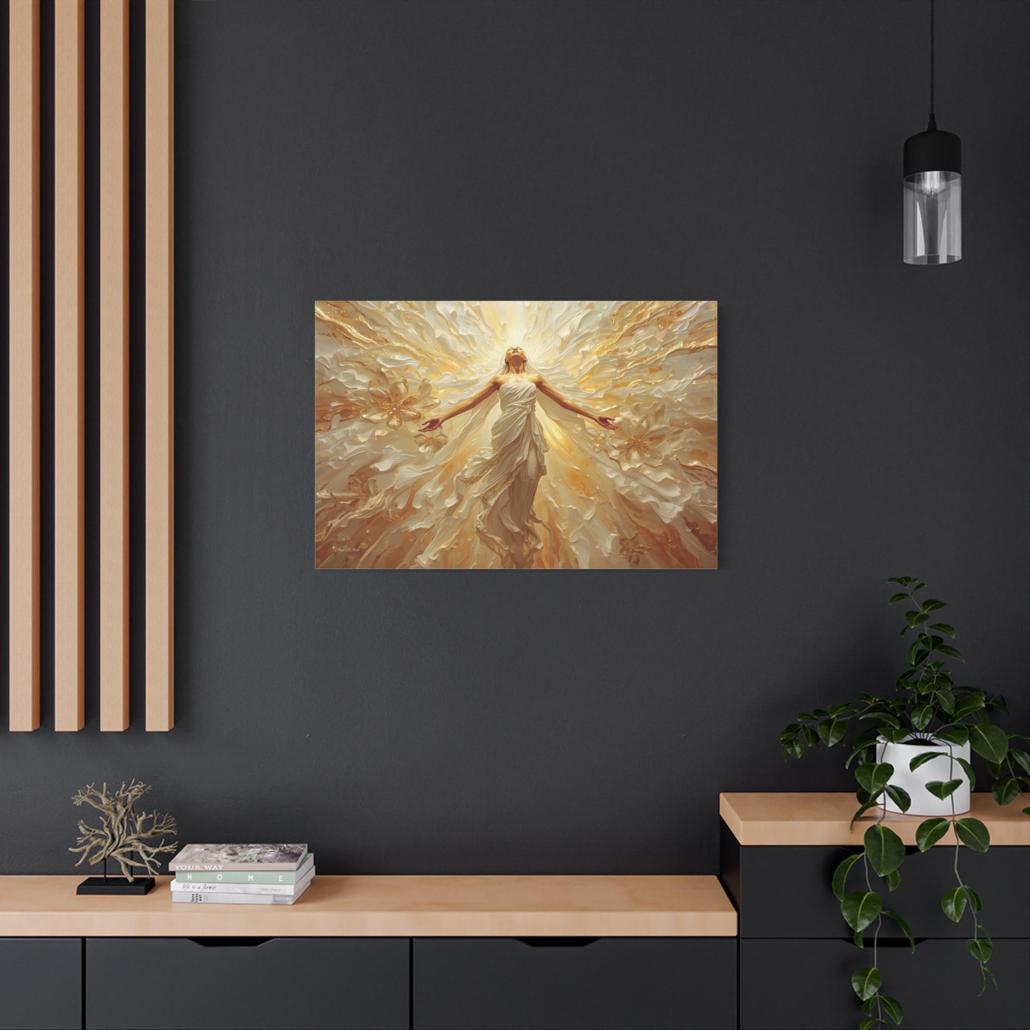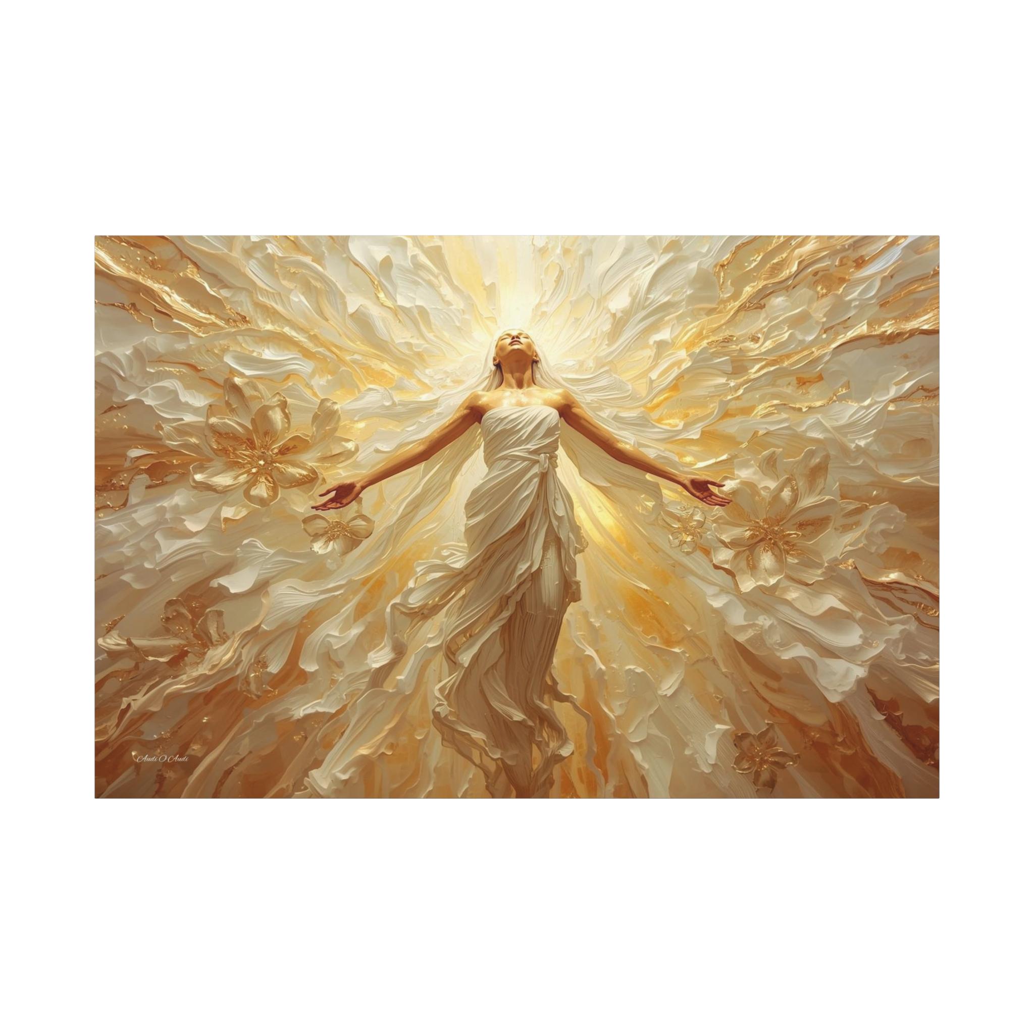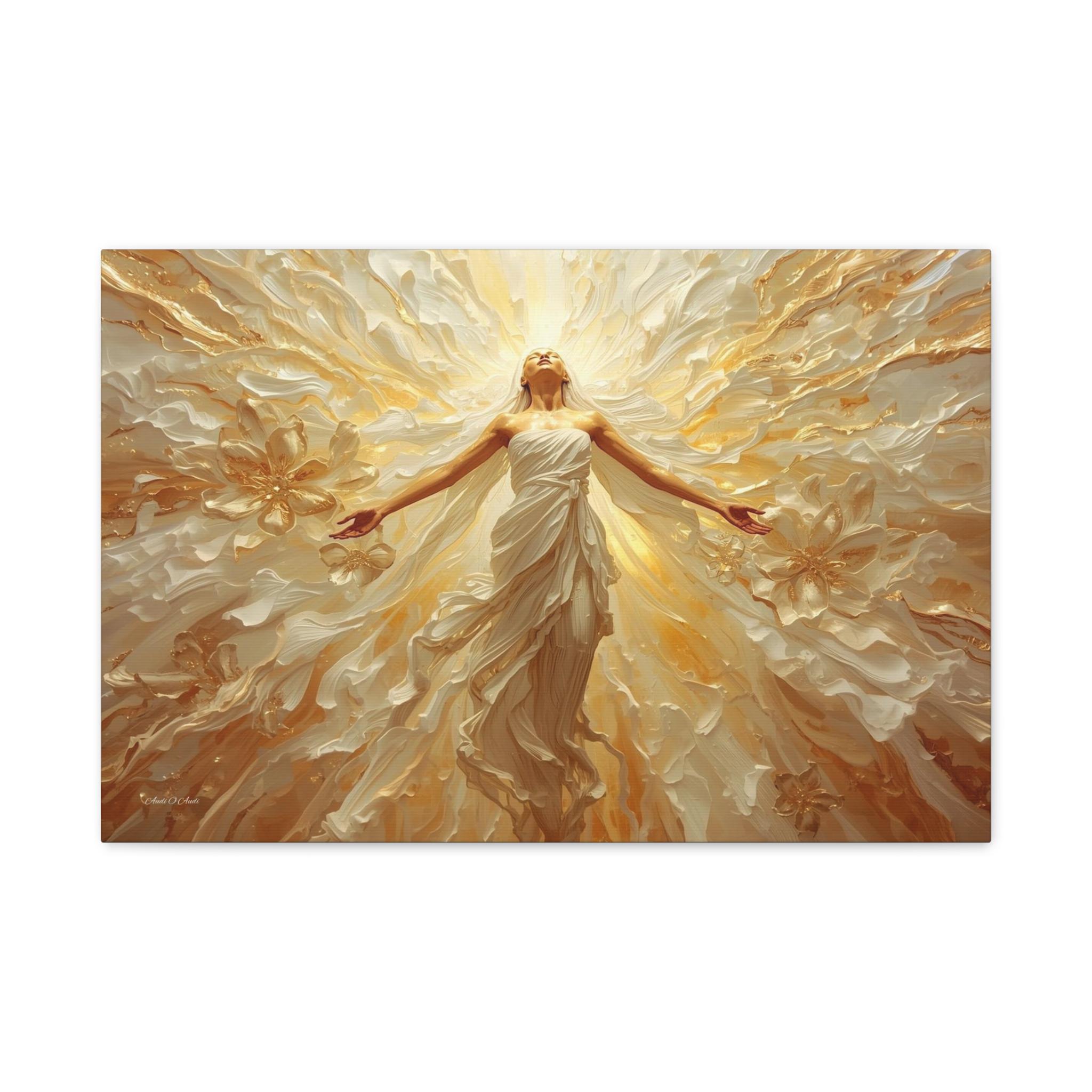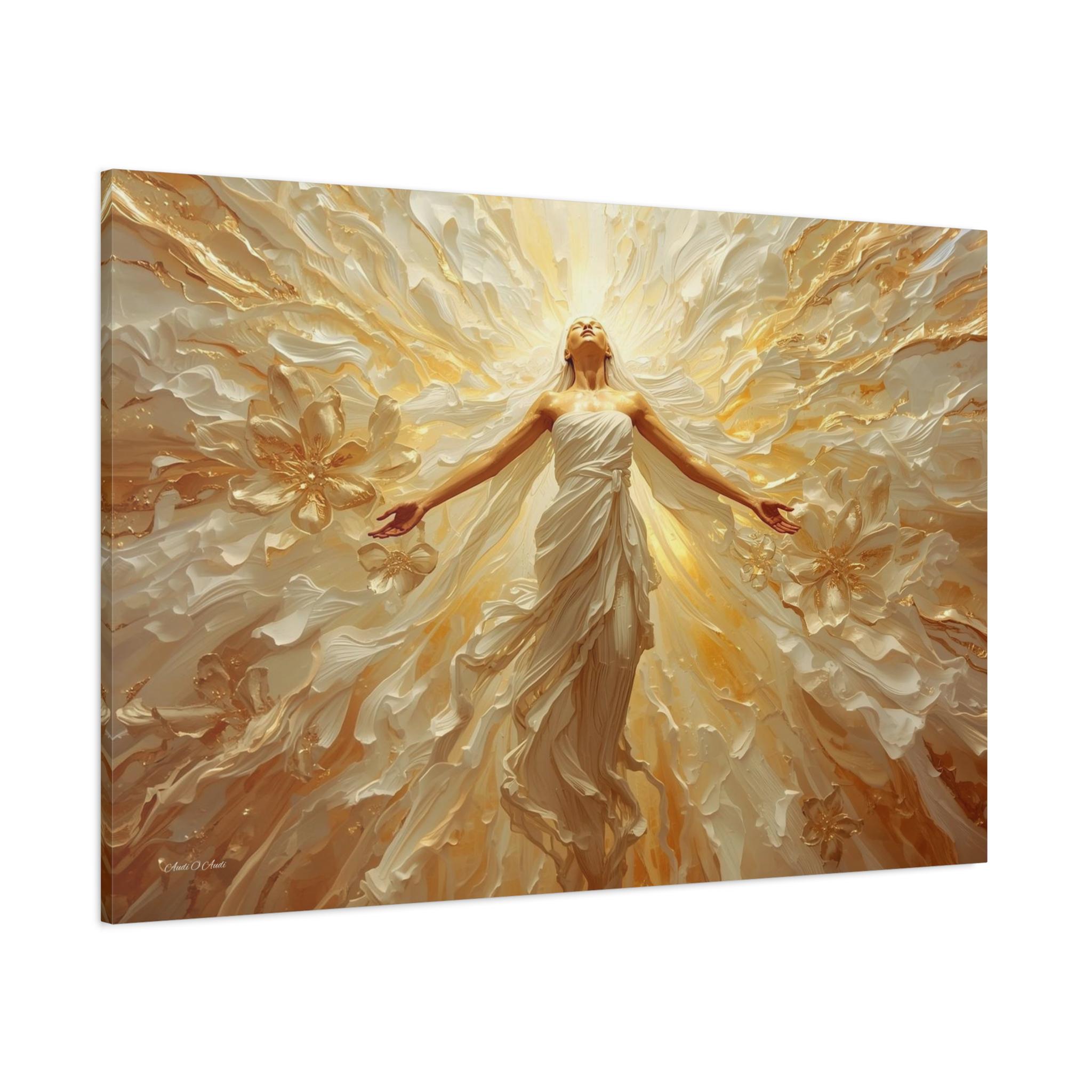 Fill your space with overwhelming light and positivity with this breathtaking canvas print of radiant joy. This triumphant artwork features a glowing, ethereal figure with her arms outstretched, bathed in brilliant golden light and surrounded by a sweeping, dynamic explosion of abstract floral and wave patterns.