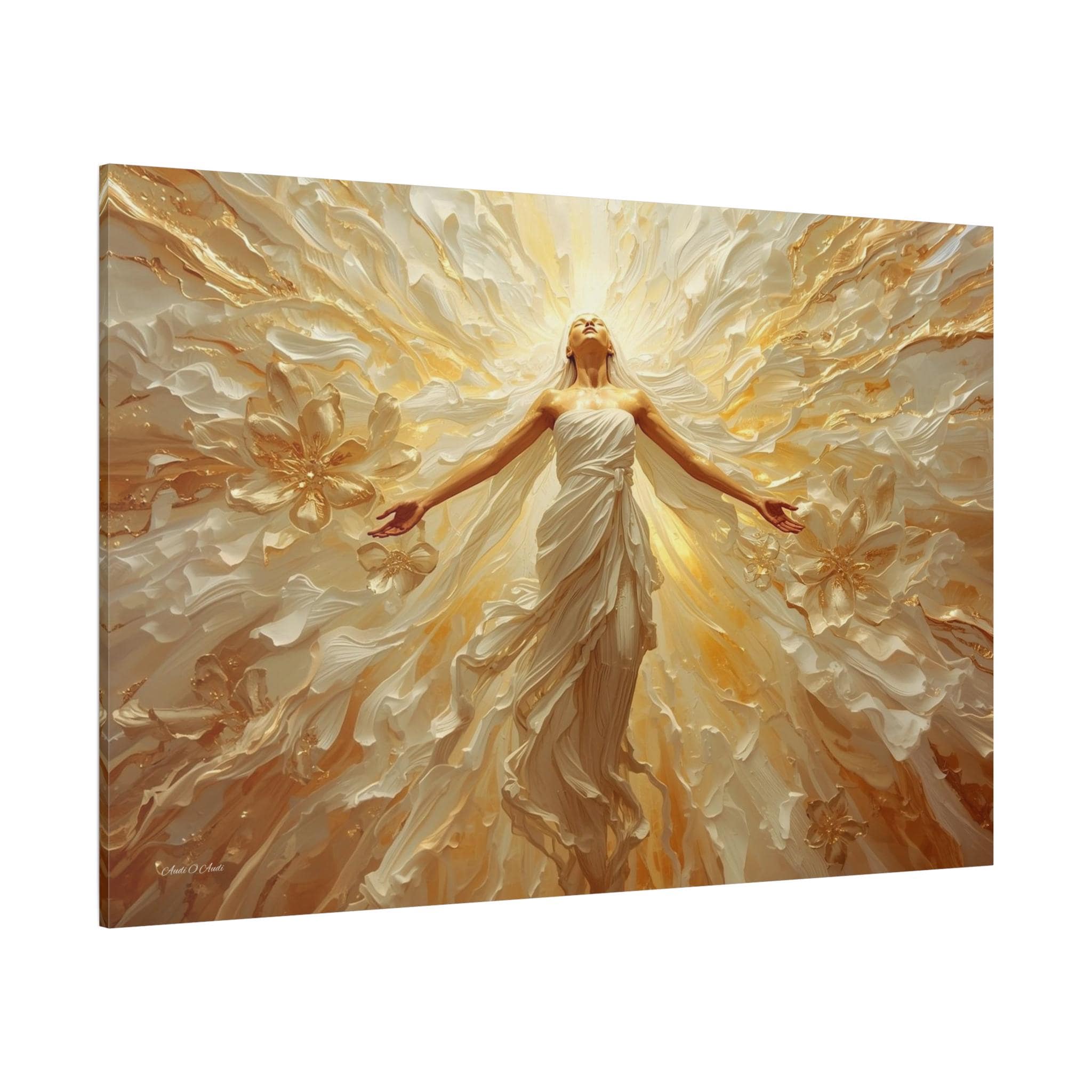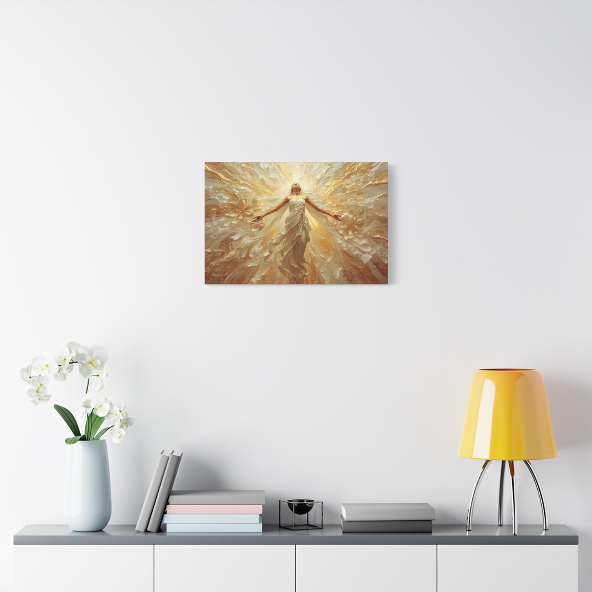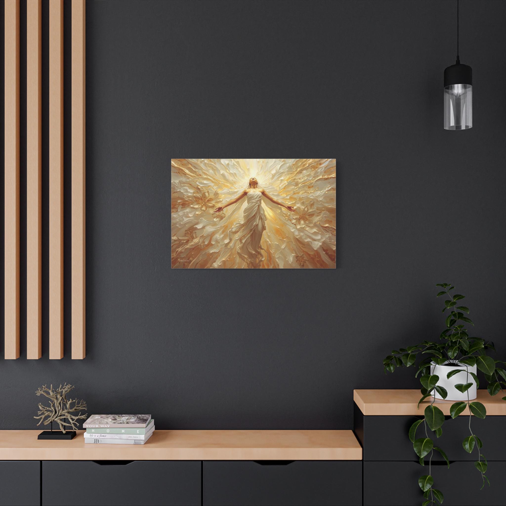Fill your space with overwhelming light and positivity with this breathtaking canvas print of radiant joy. This triumphant artwork features a glowing, ethereal figure with her arms outstretched, bathed in brilliant golden light and surrounded by a sweeping, dynamic explosion of abstract floral and wave patterns.