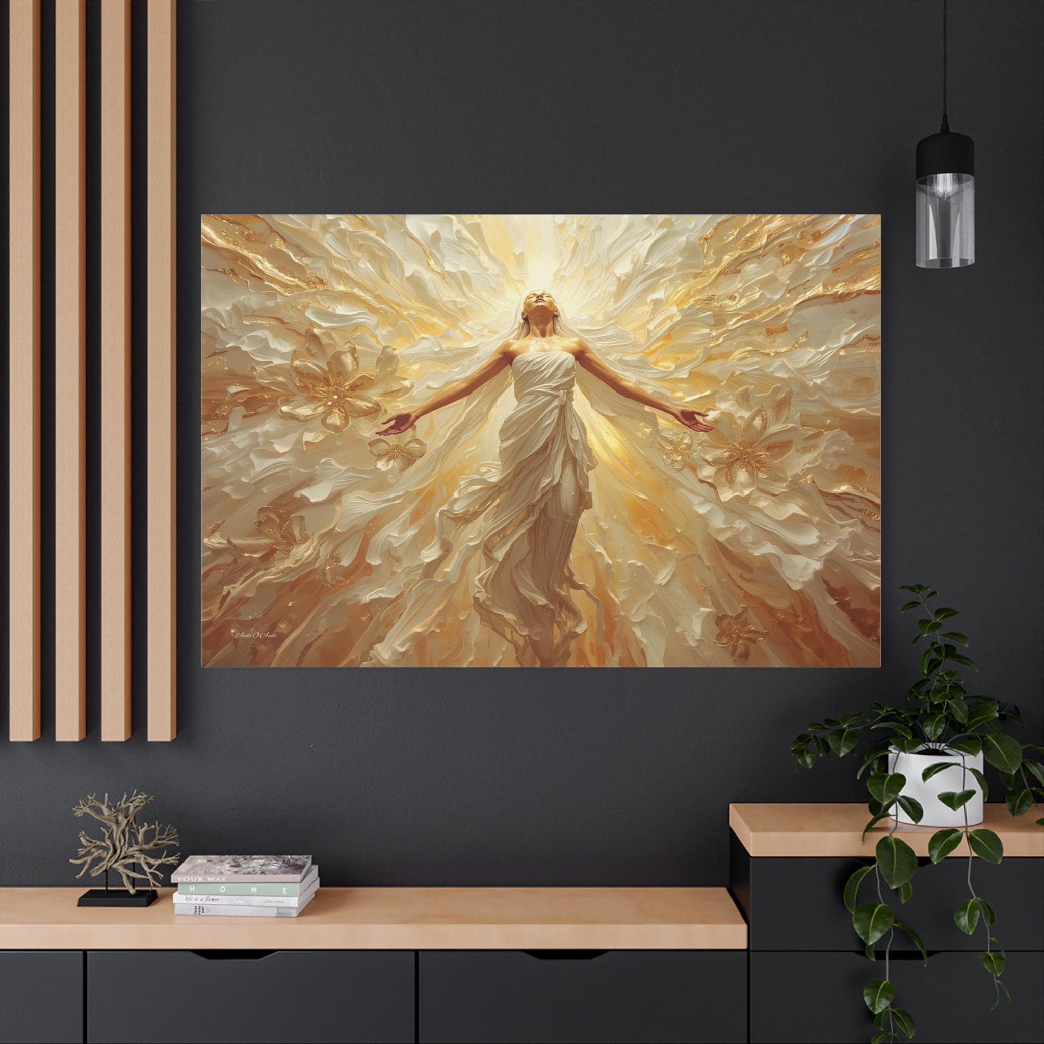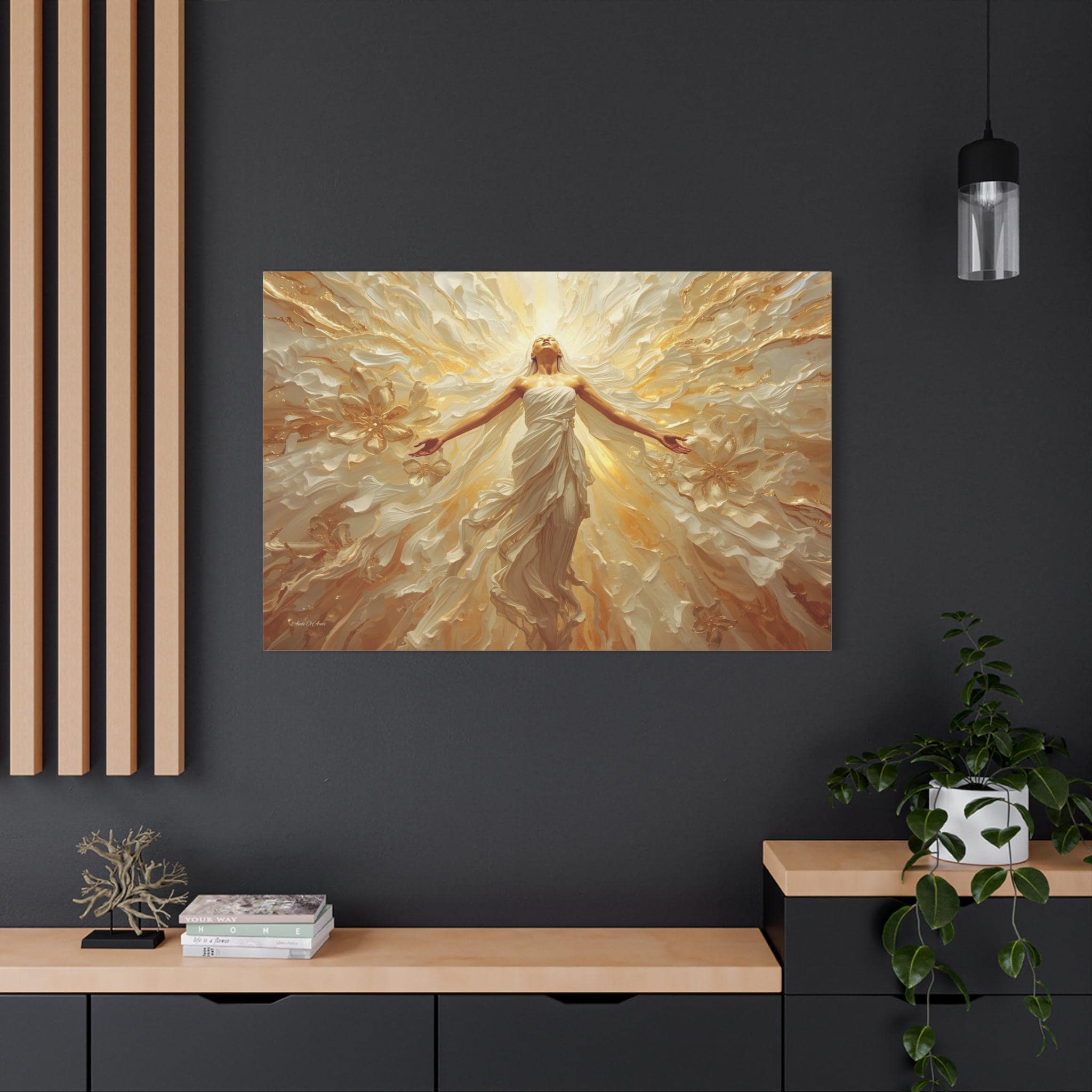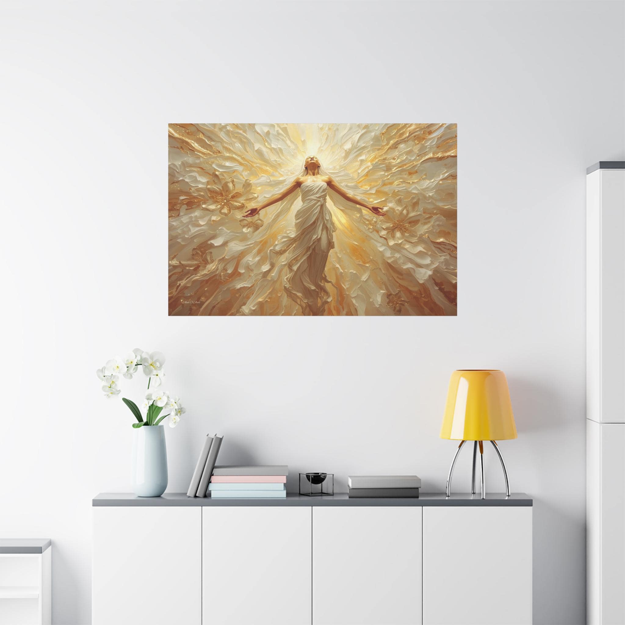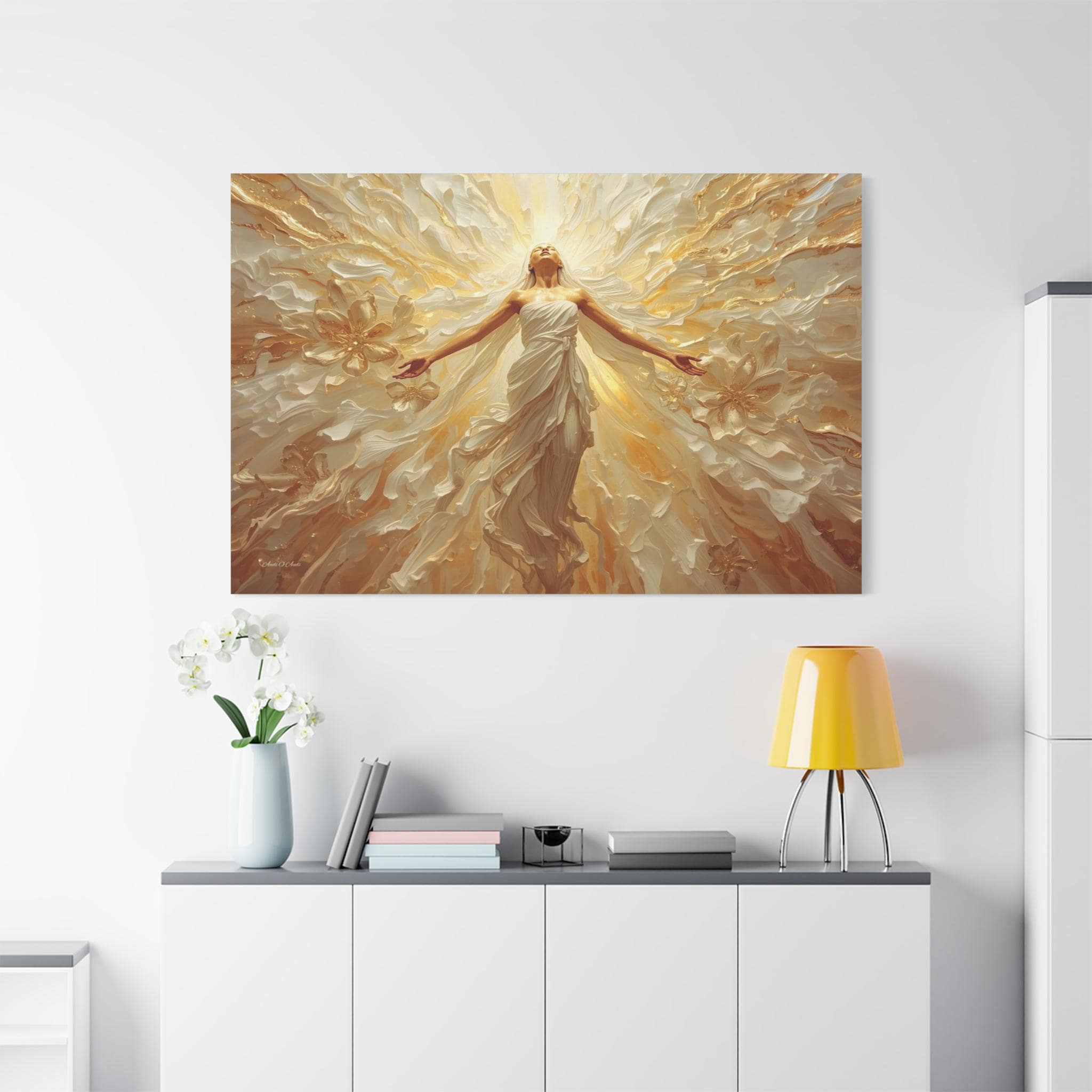 Fill your space with overwhelming light and positivity with this breathtaking canvas print of radiant joy. This triumphant artwork features a glowing, ethereal figure with her arms outstretched, bathed in brilliant golden light and surrounded by a sweeping, dynamic explosion of abstract floral and wave patterns.