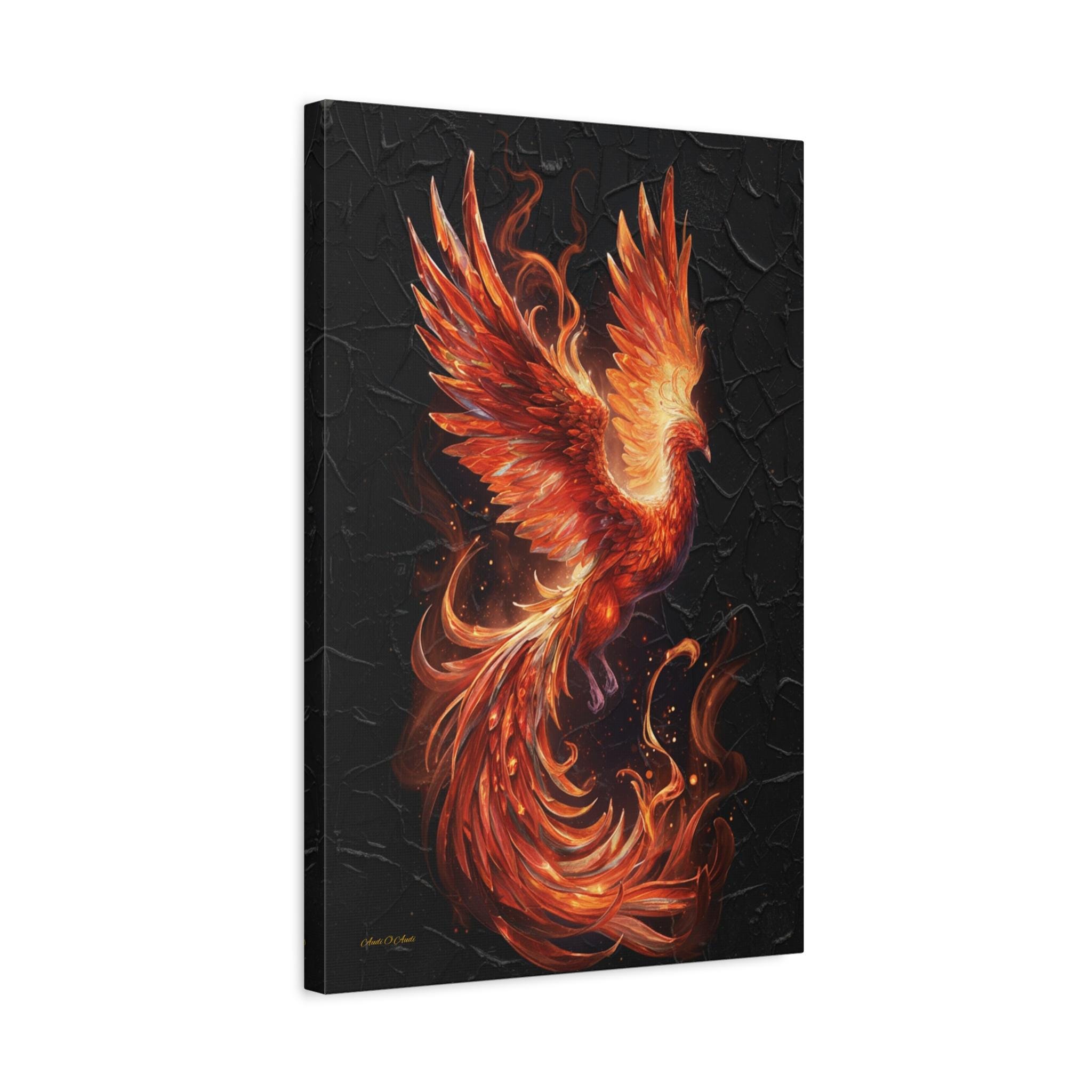 Color and Contrast: The composition is defined by extreme contrast. The Phoenix's radiant, warm palette—dominated by scarlet, amber, and gold—erupts from a stark, unyielding charcoal black background. This deep, textured black creates a dramatic, negative space that makes the glowing flames and the bird’s fiery aura appear to pulse with energy.