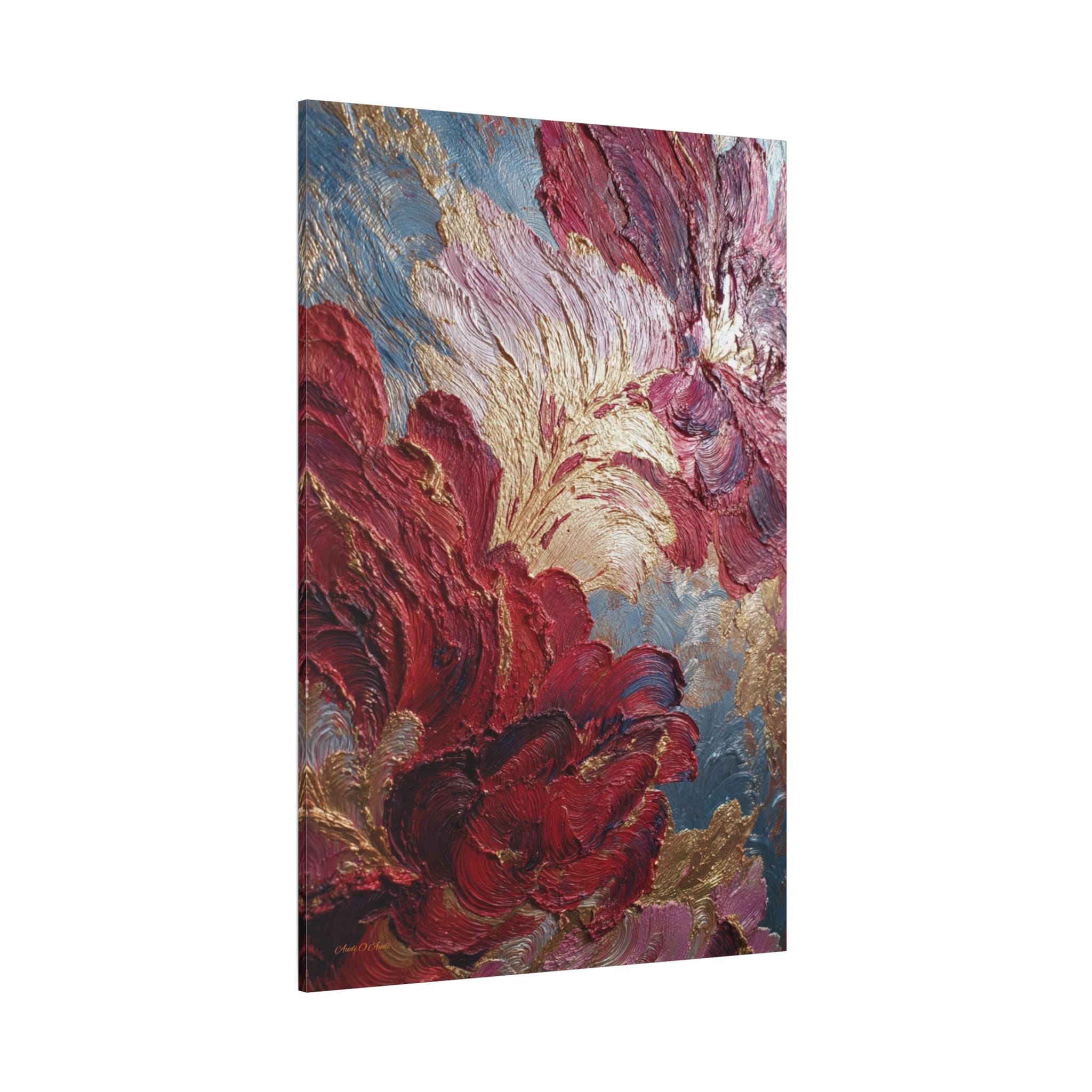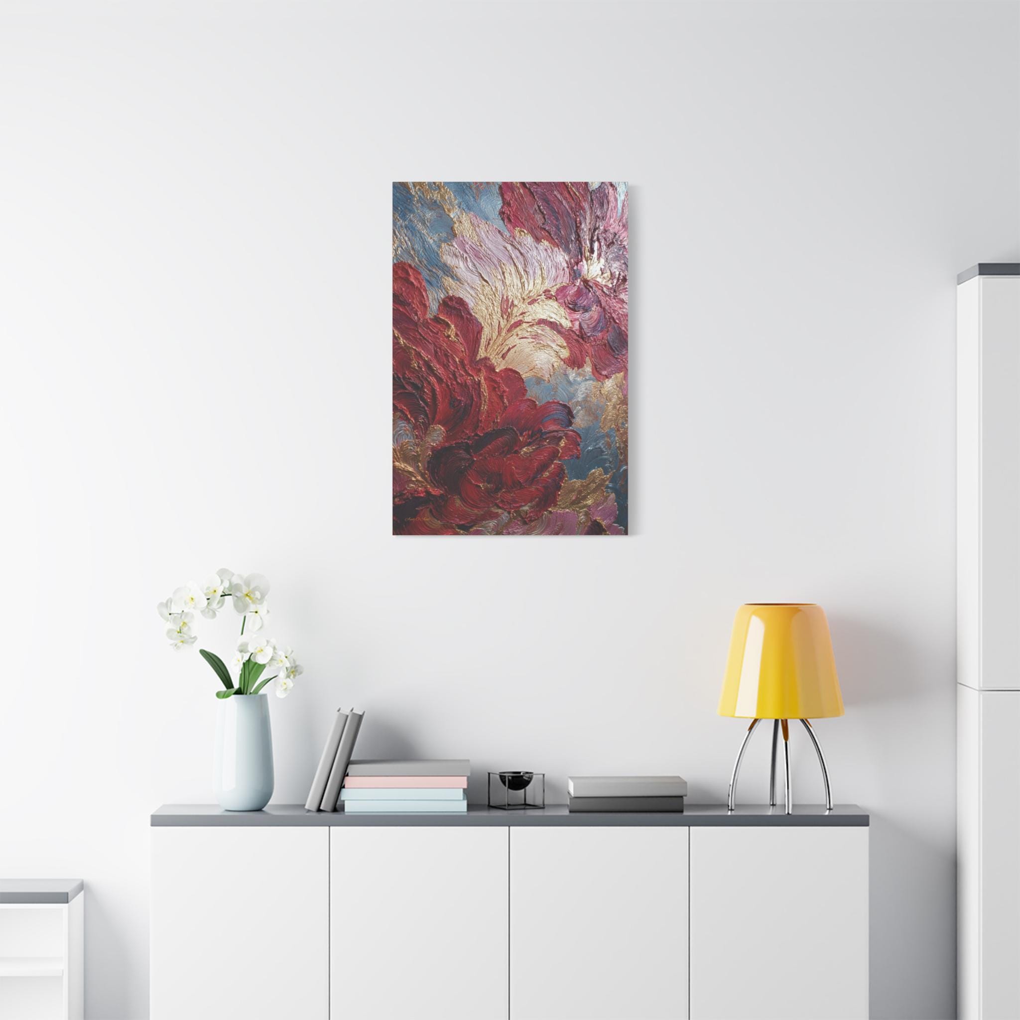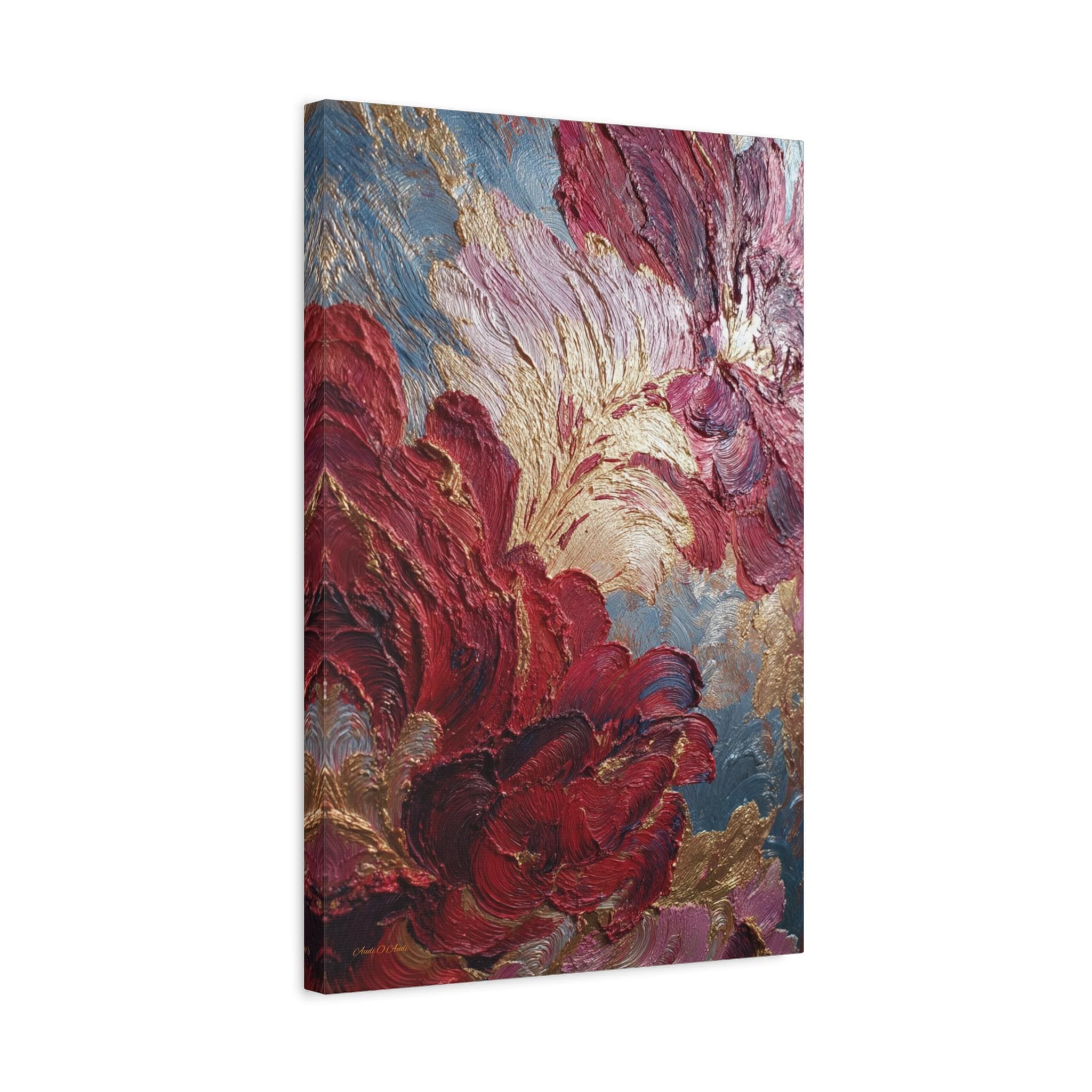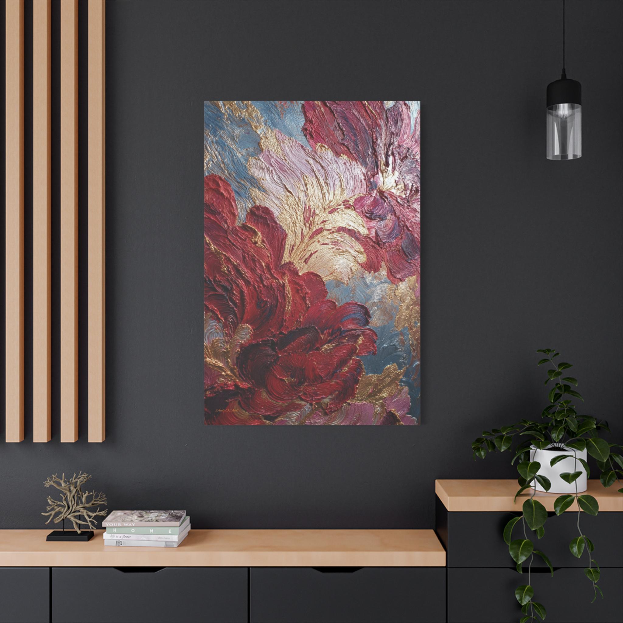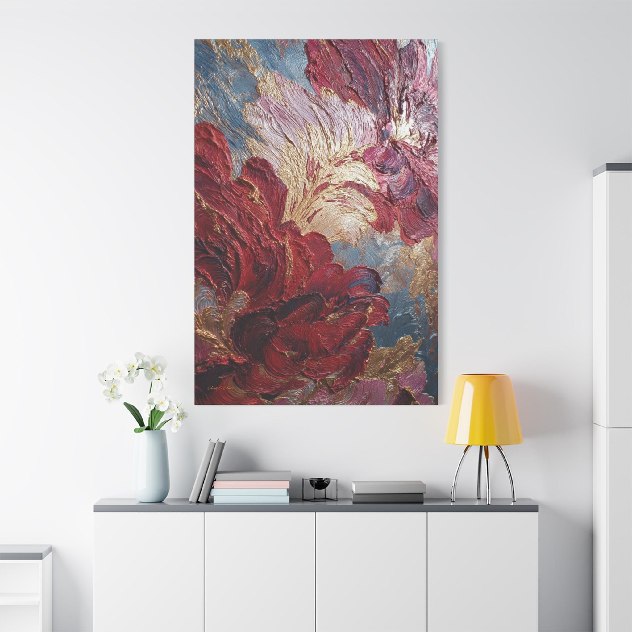 Rich crimson and rose mingle with gold leaf-like accents. Subtle blue-gray depth holds the composition. The stretched edge keeps the image continuous and gallery-ready. Works especially well in living rooms, entryways, or intimate dining corners where conversation lingers.