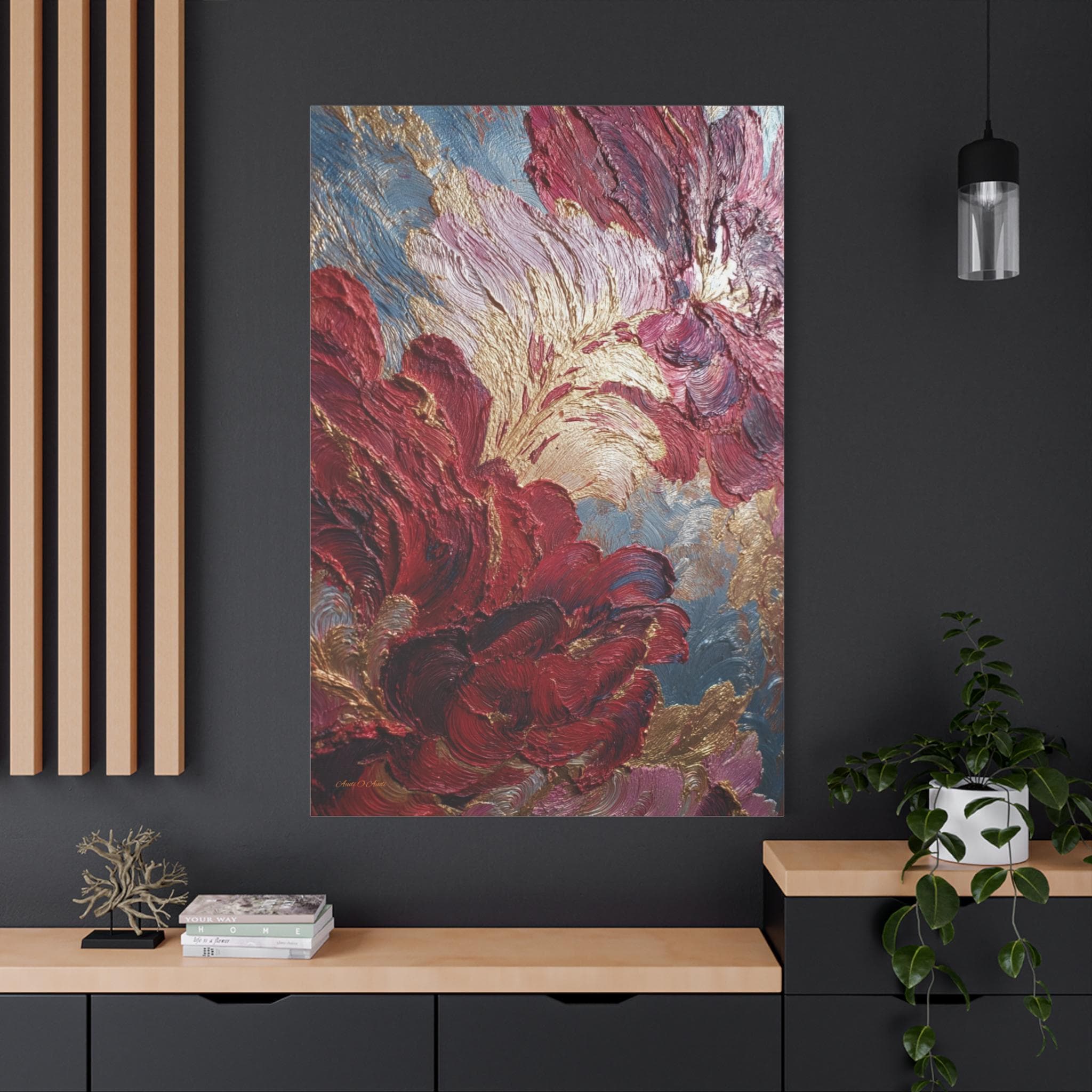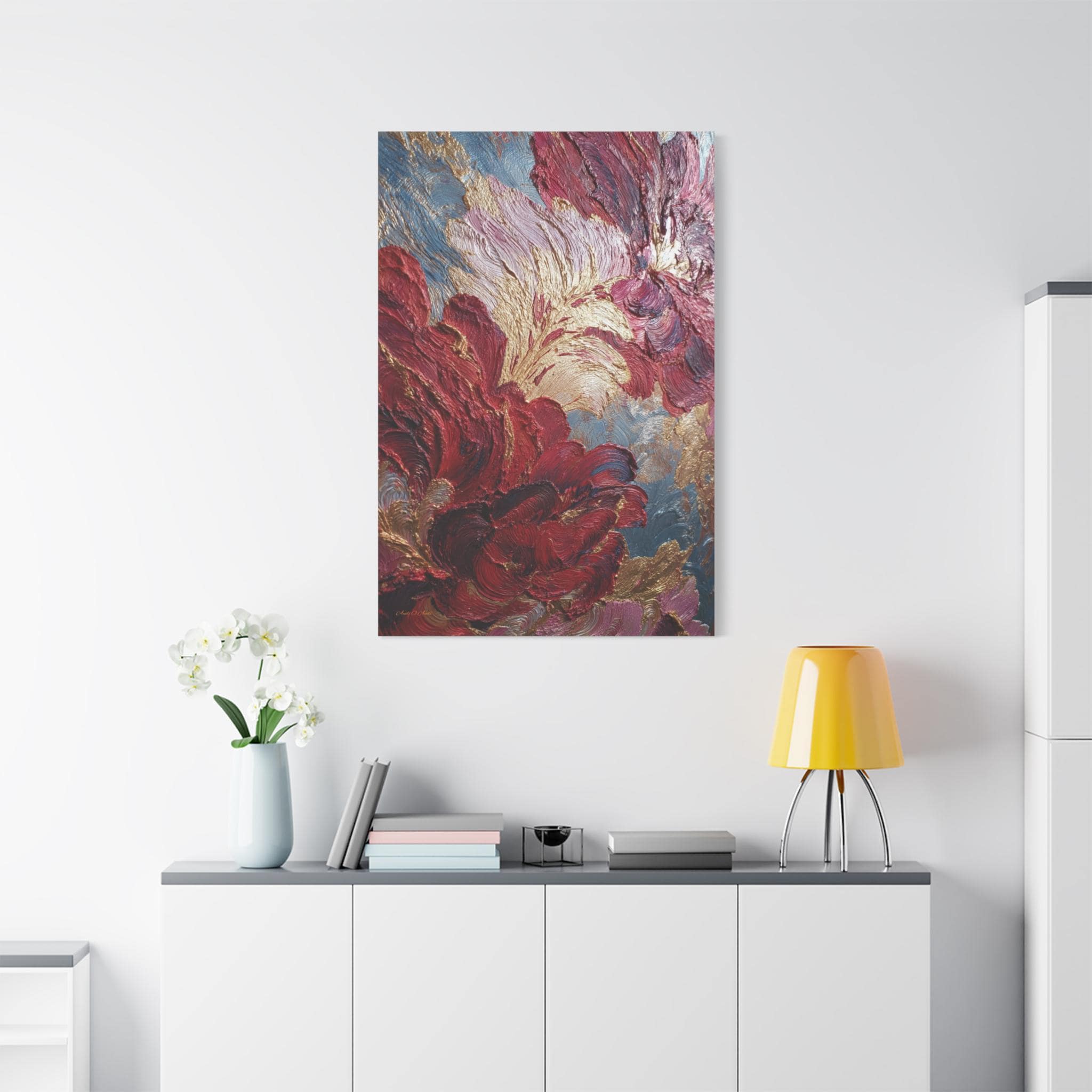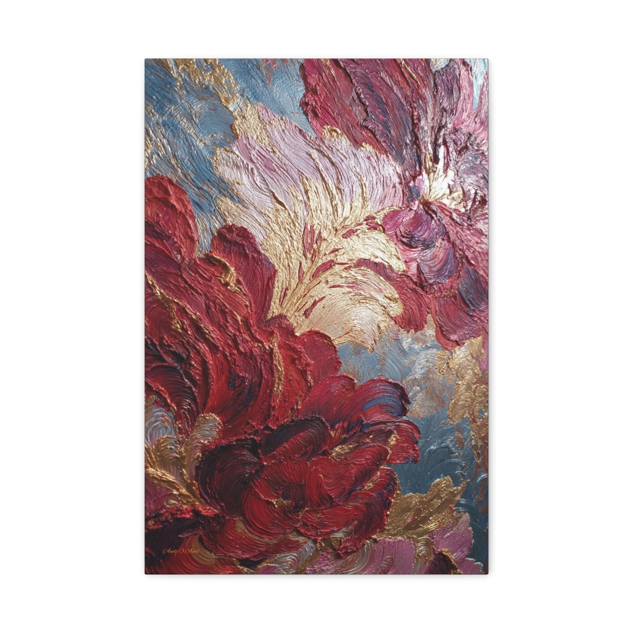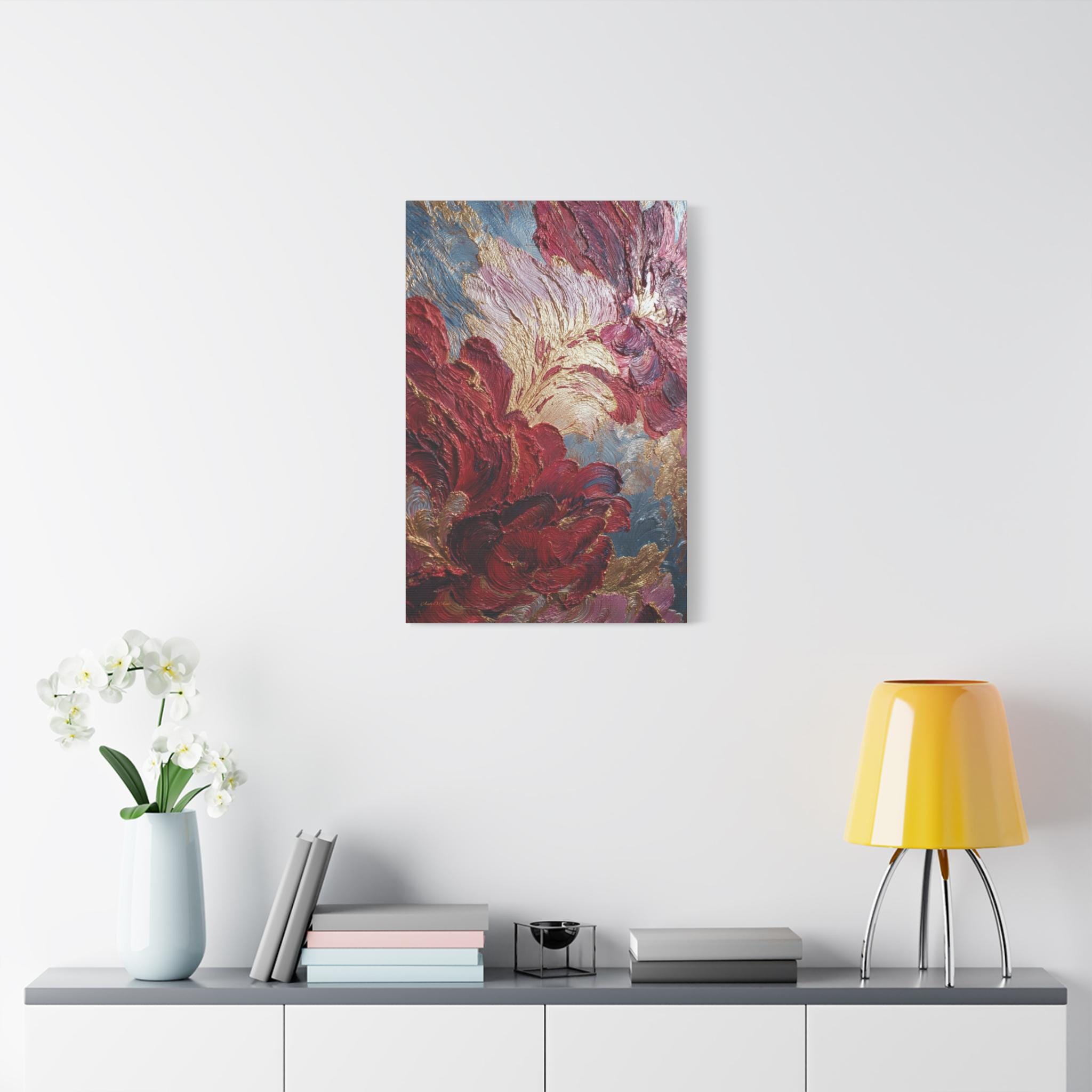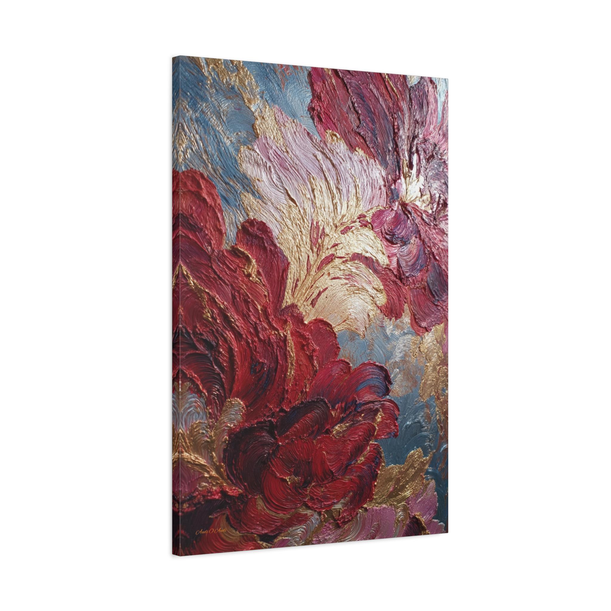 Rich crimson and rose mingle with gold leaf-like accents. Subtle blue-gray depth holds the composition. The stretched edge keeps the image continuous and gallery-ready. Works especially well in living rooms, entryways, or intimate dining corners where conversation lingers.