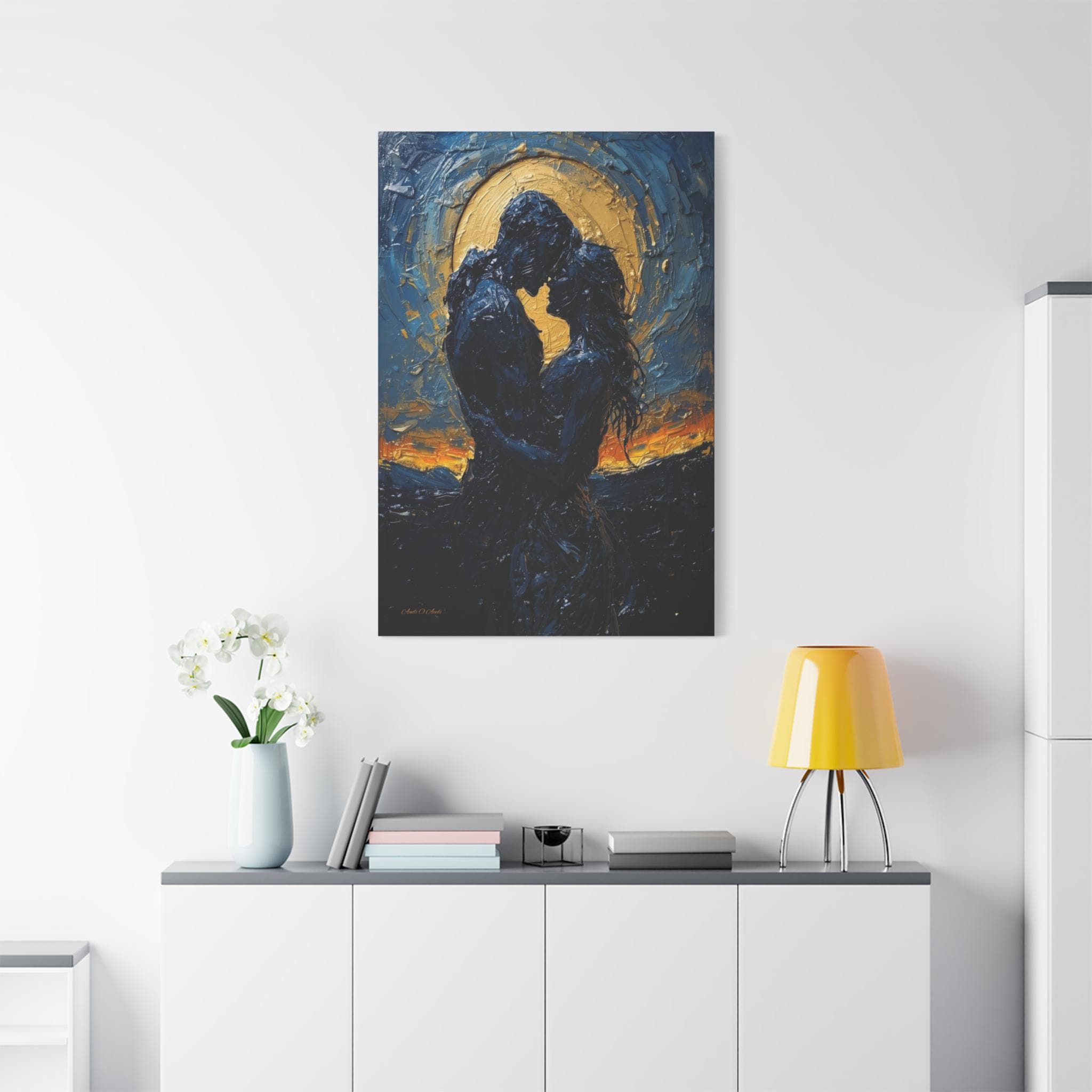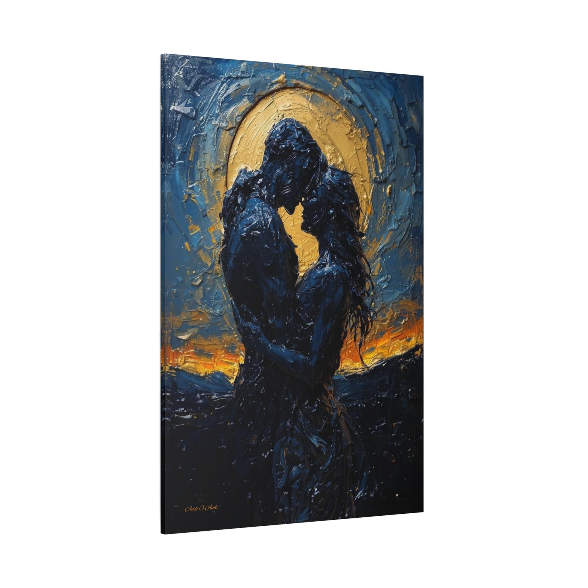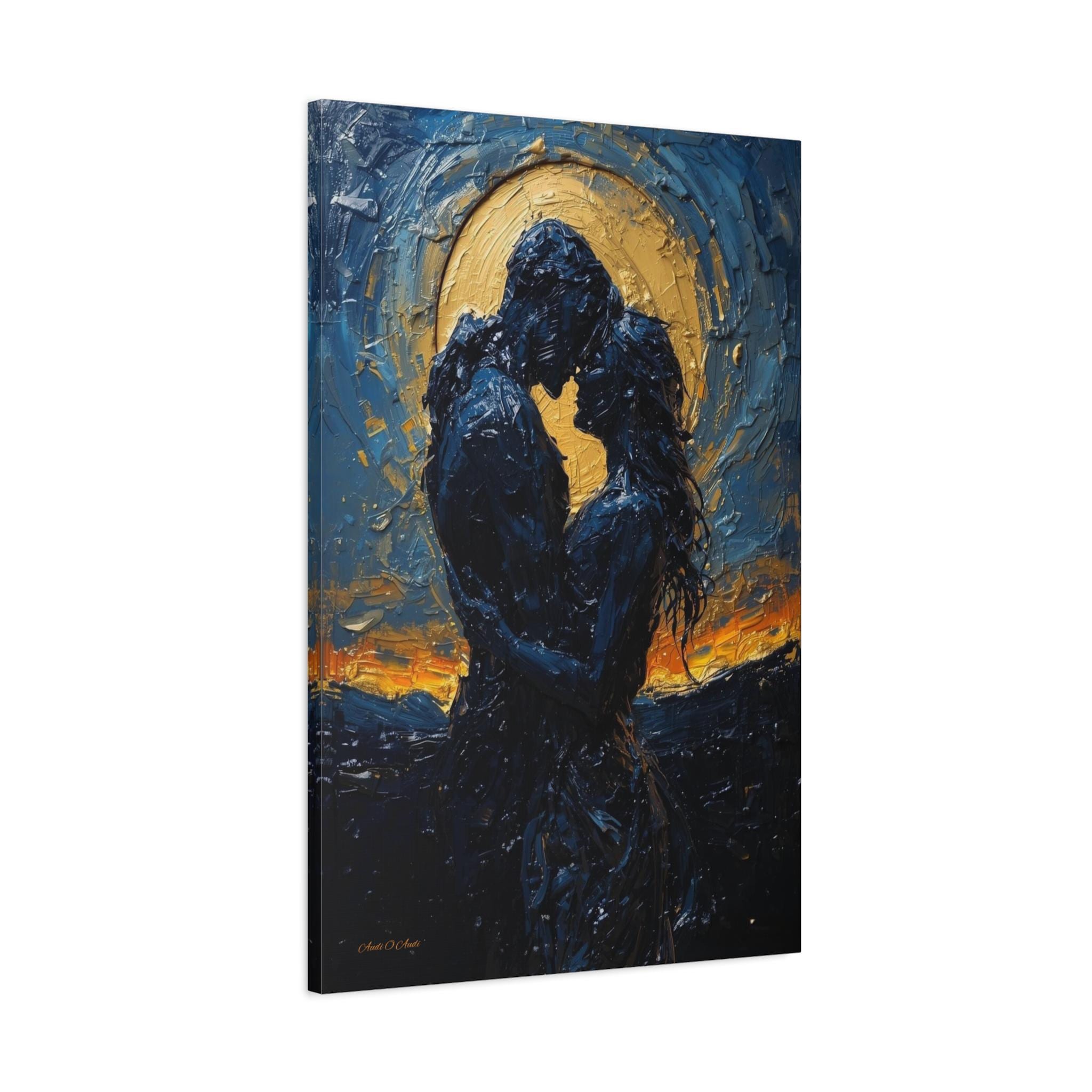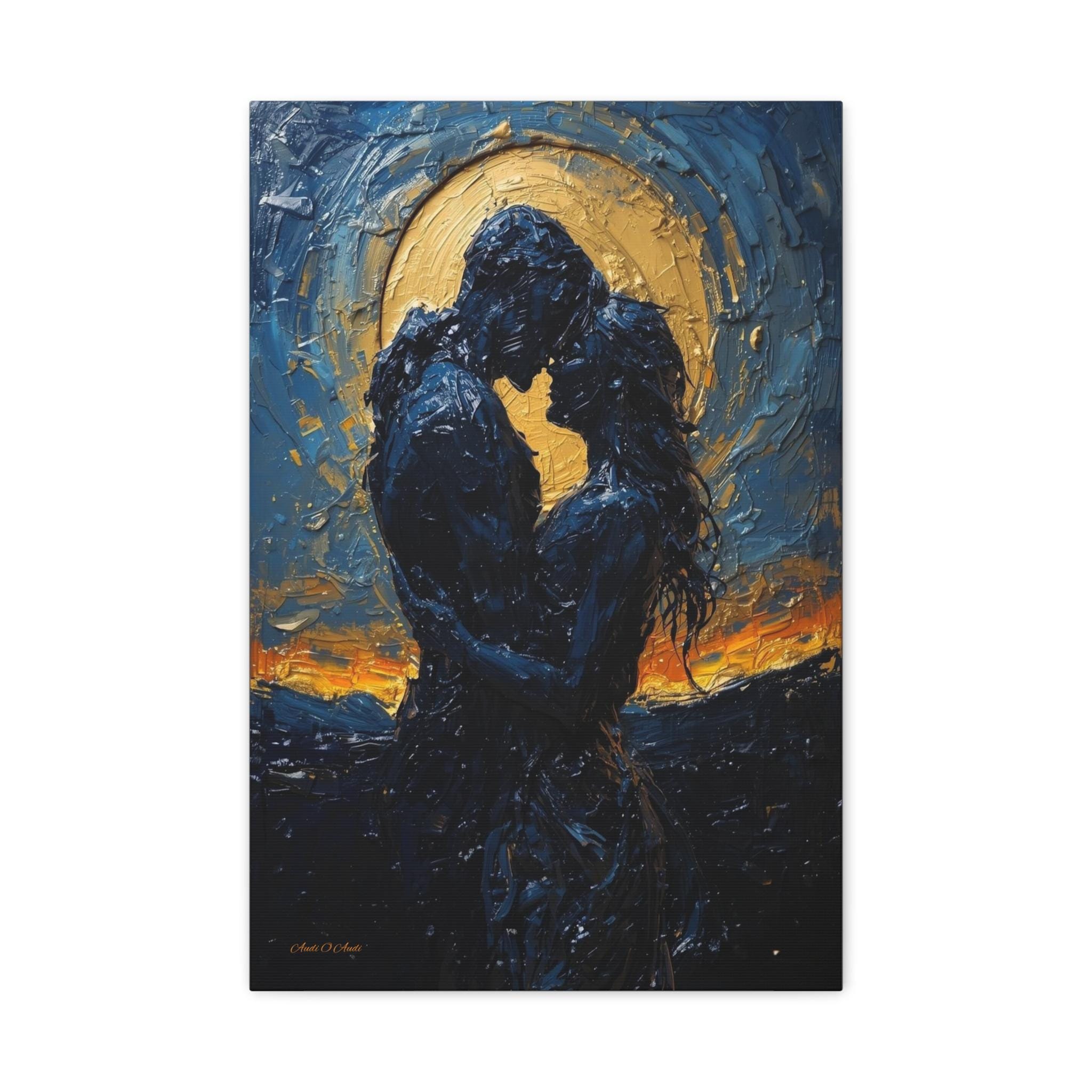Celebrate a love that is written in the stars with this breathtaking romantic canvas print. This moody, deeply emotional artwork features the silhouettes of a couple in a passionate embrace, set against a magnificent, glowing golden moon and a swirling midnight blue sky.