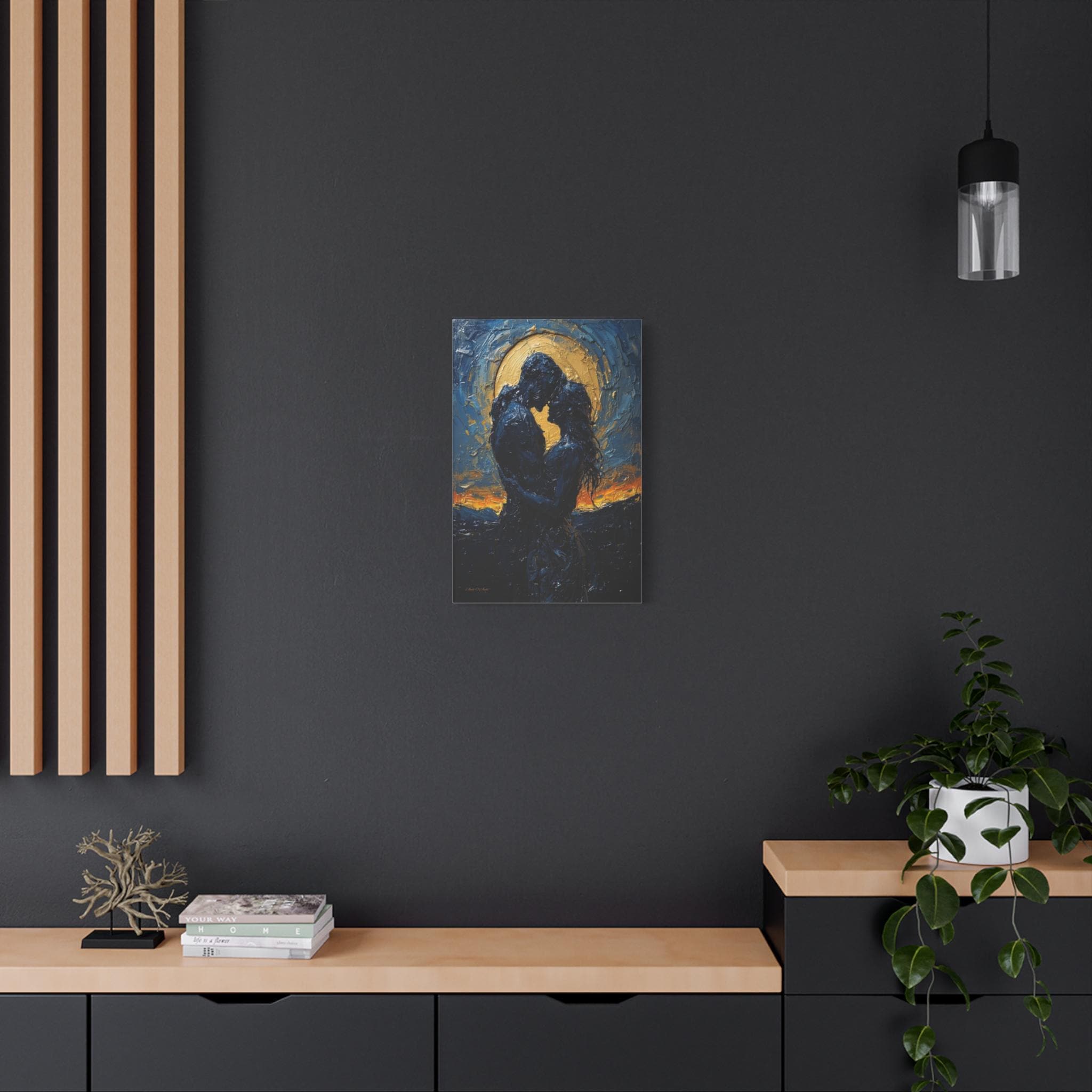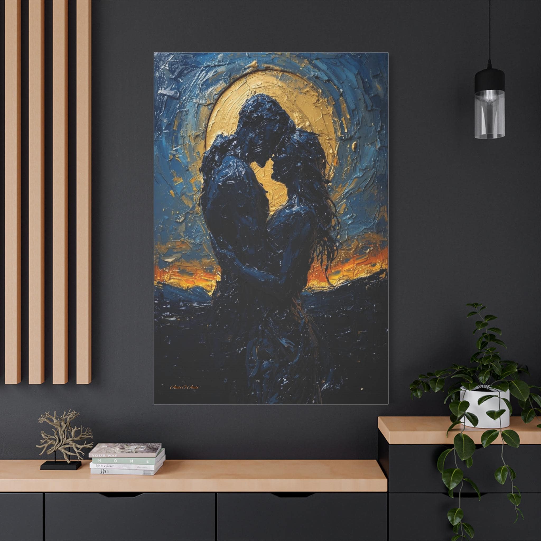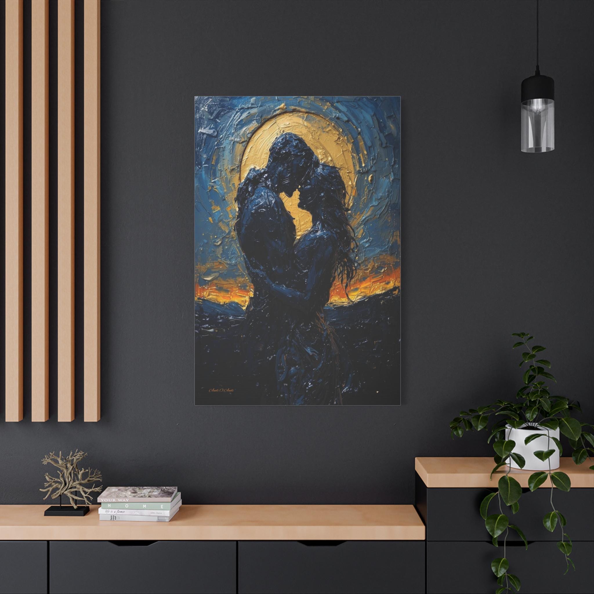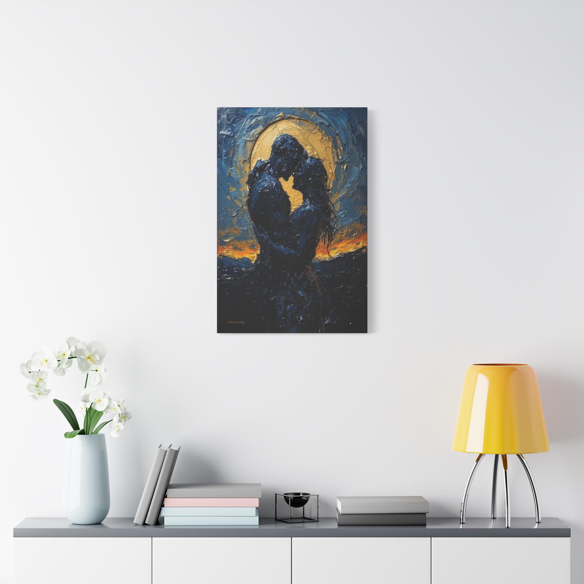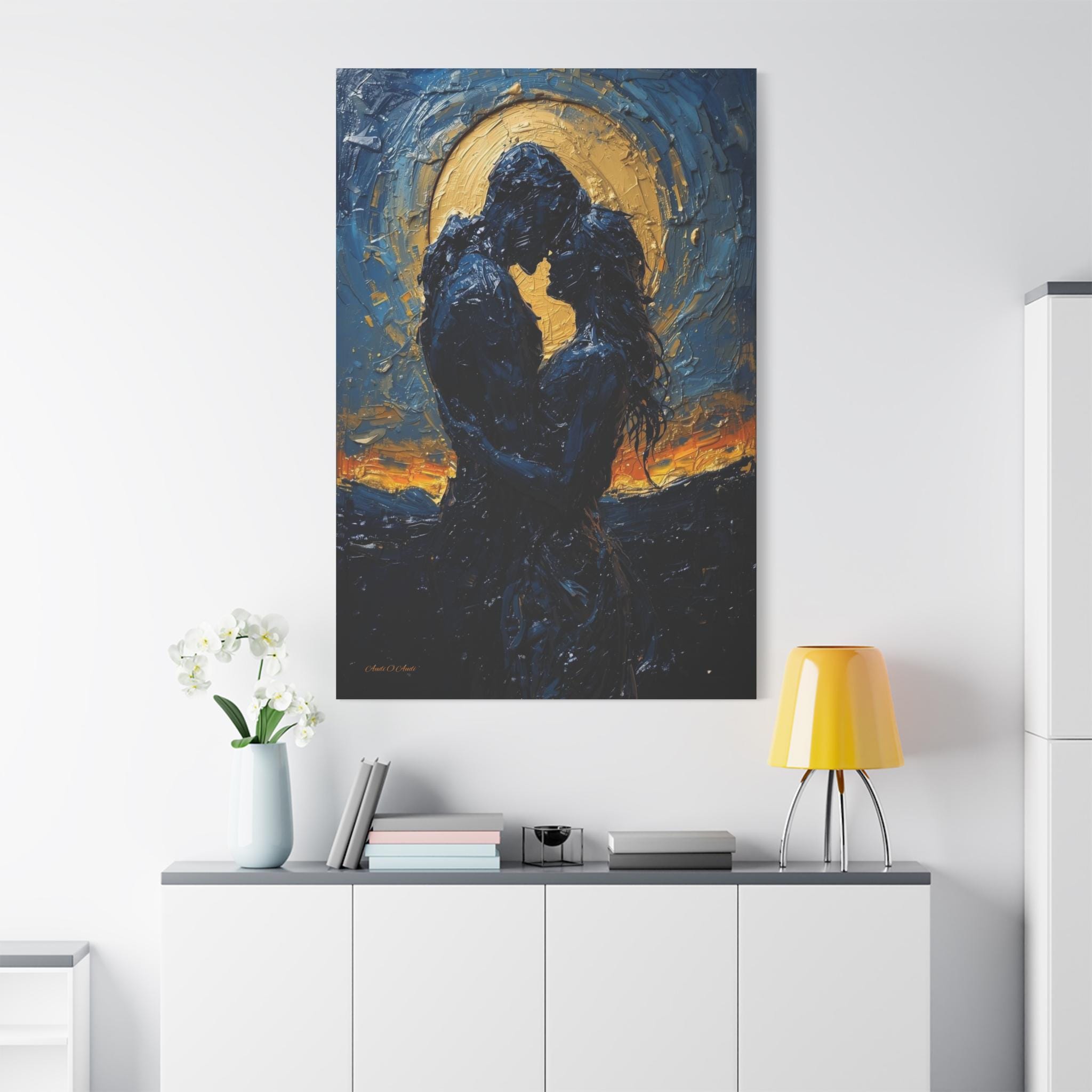 Celebrate a love that is written in the stars with this breathtaking romantic canvas print. This moody, deeply emotional artwork features the silhouettes of a couple in a passionate embrace, set against a magnificent, glowing golden moon and a swirling midnight blue sky.