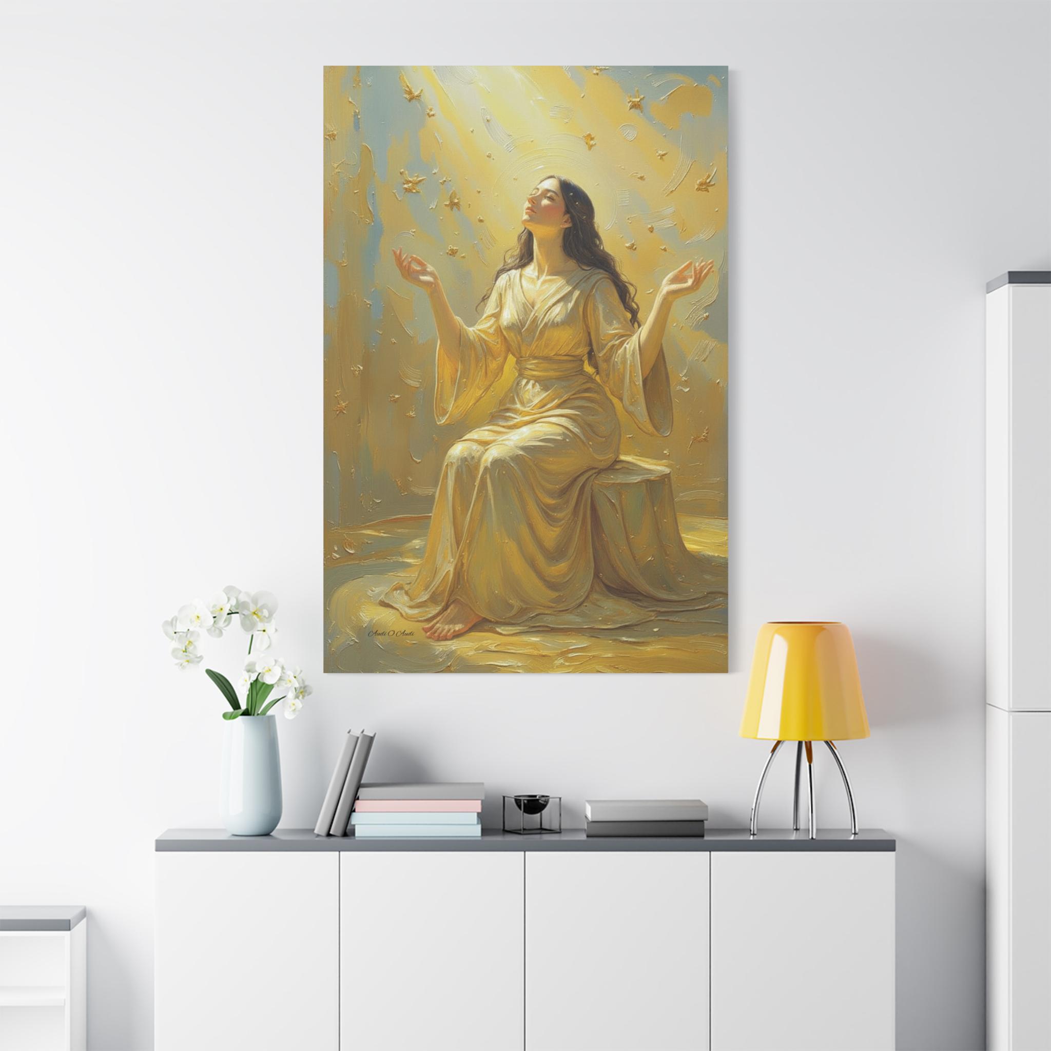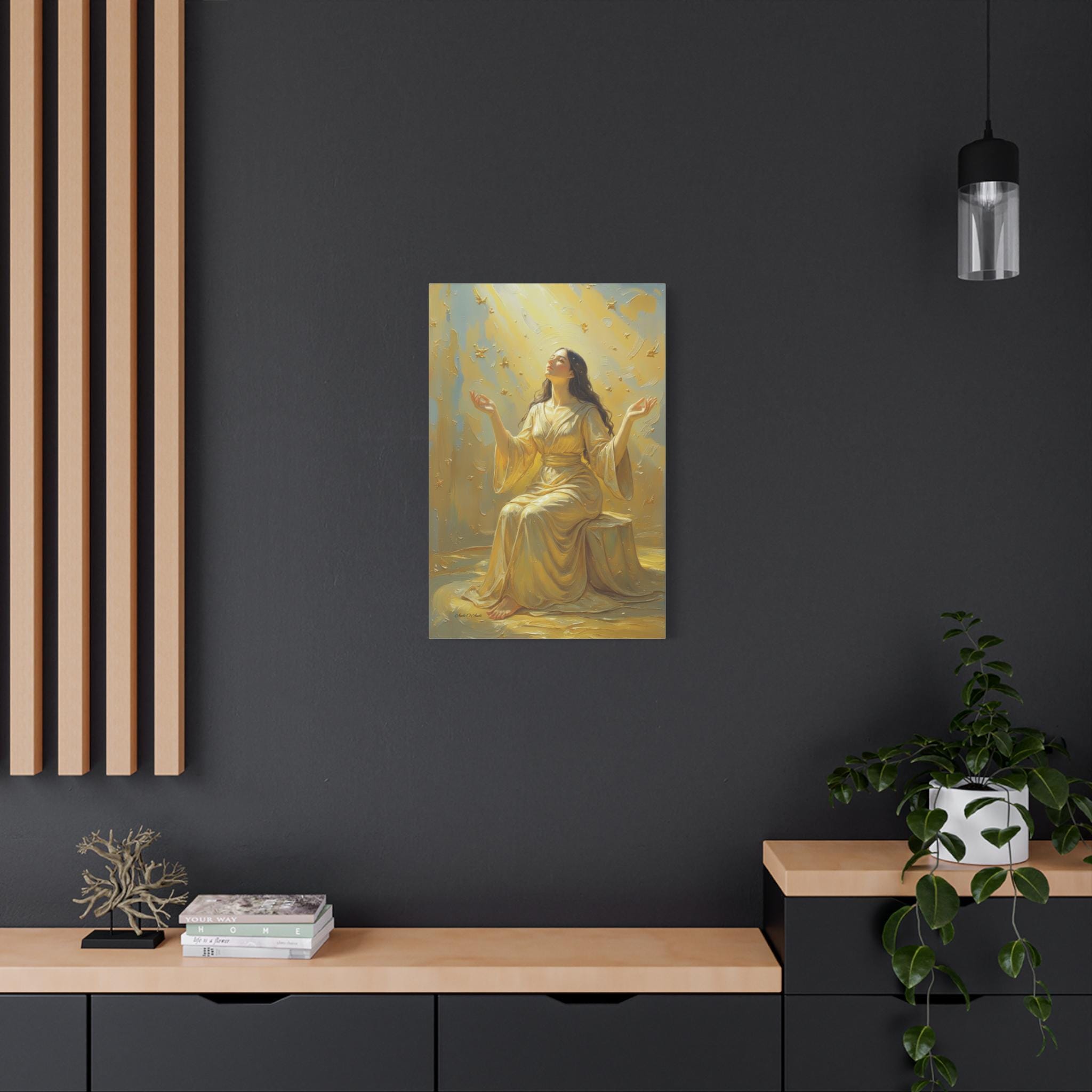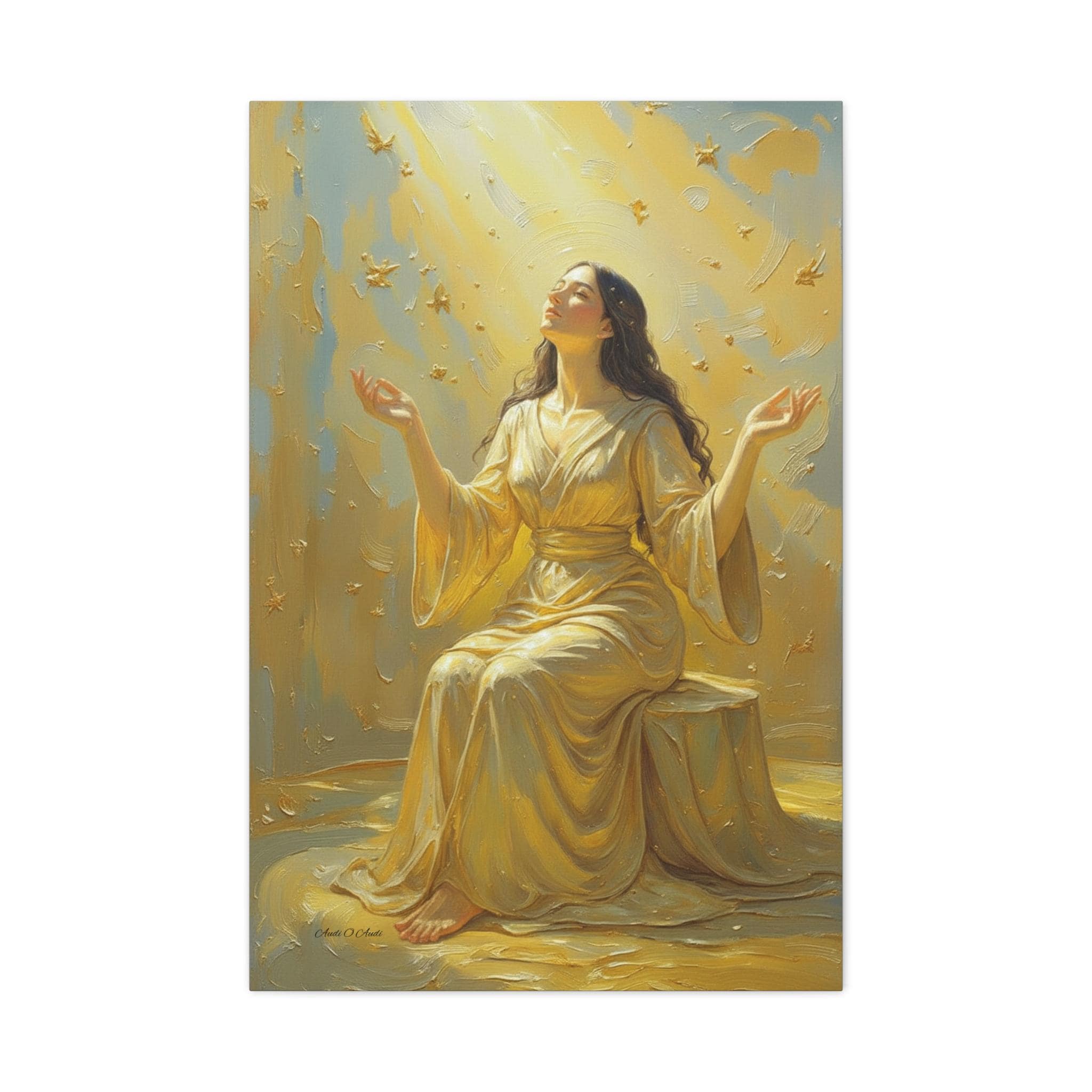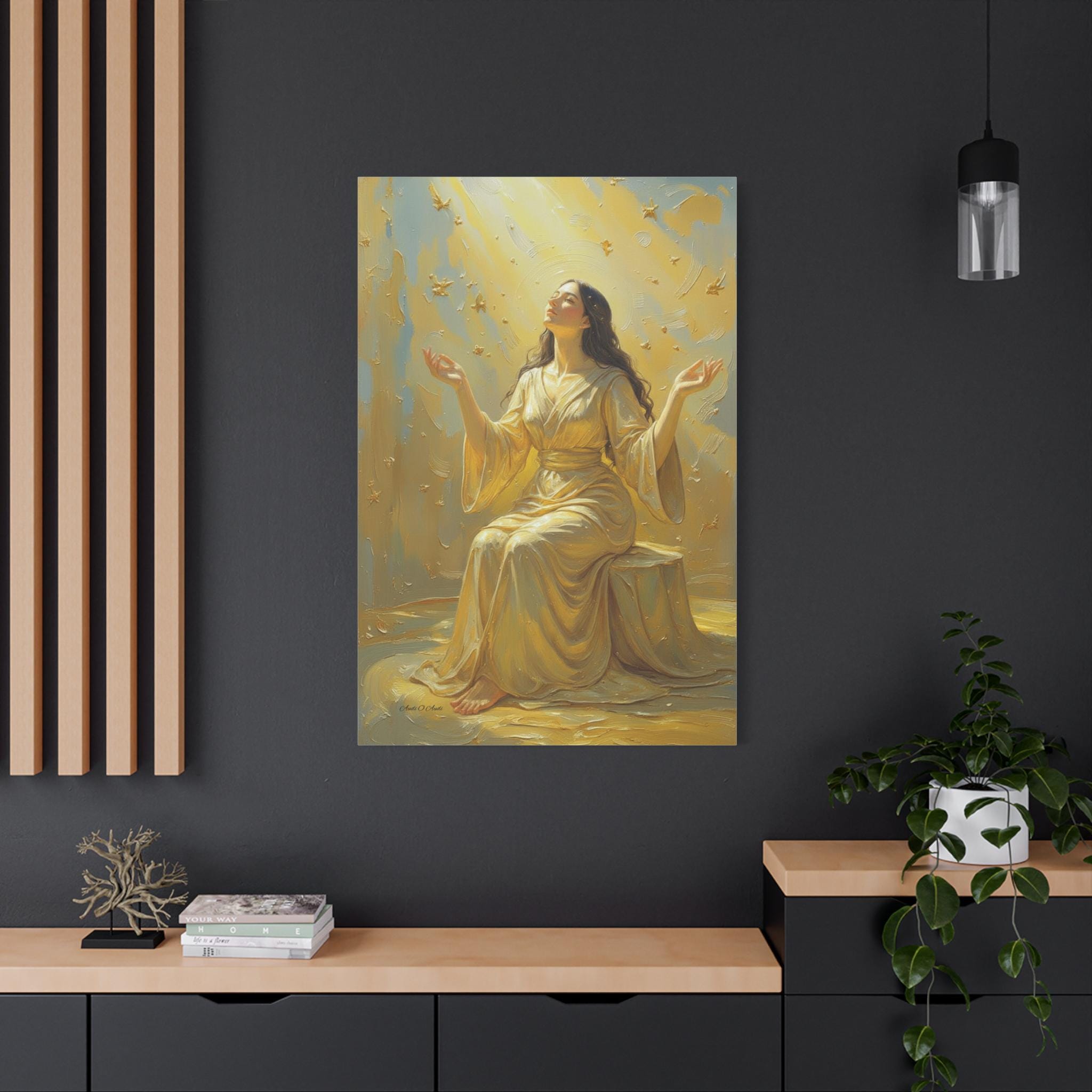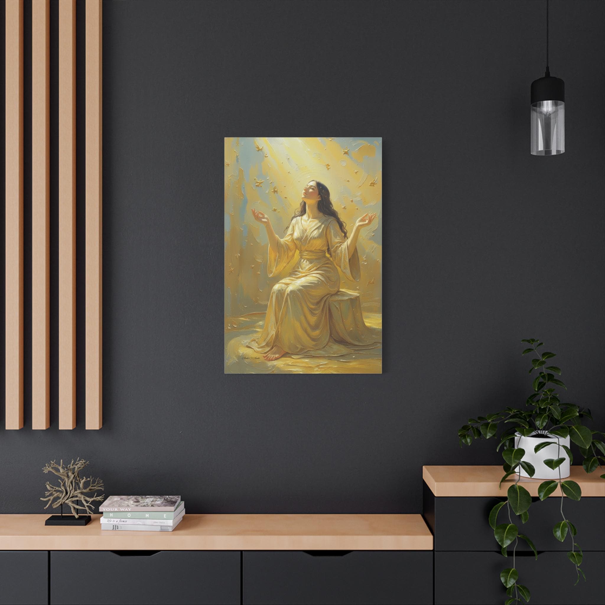 Fill your sanctuary with warmth and spiritual peace with this breathtaking golden canvas print. This uplifting, ethereal artwork features a serene female figure seated in a moment of quiet joy, her arms gently raised as she basks in a radiant, glowing light filled with floating golden embers.