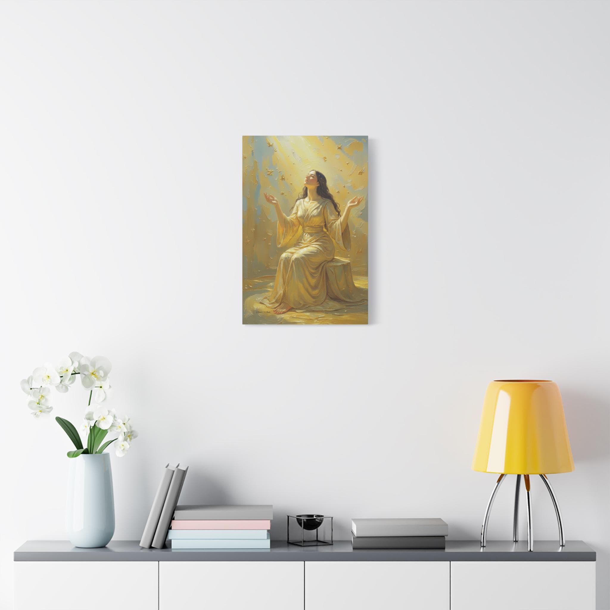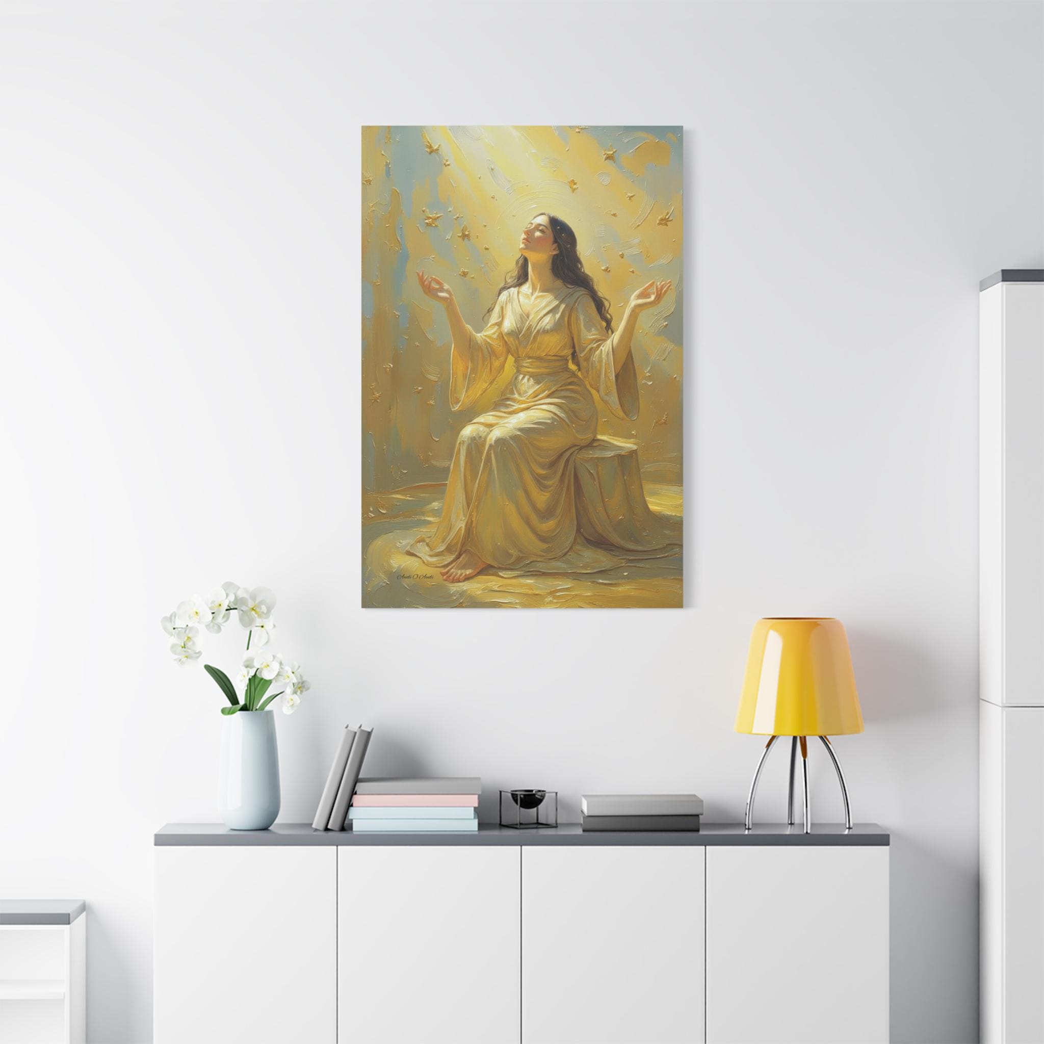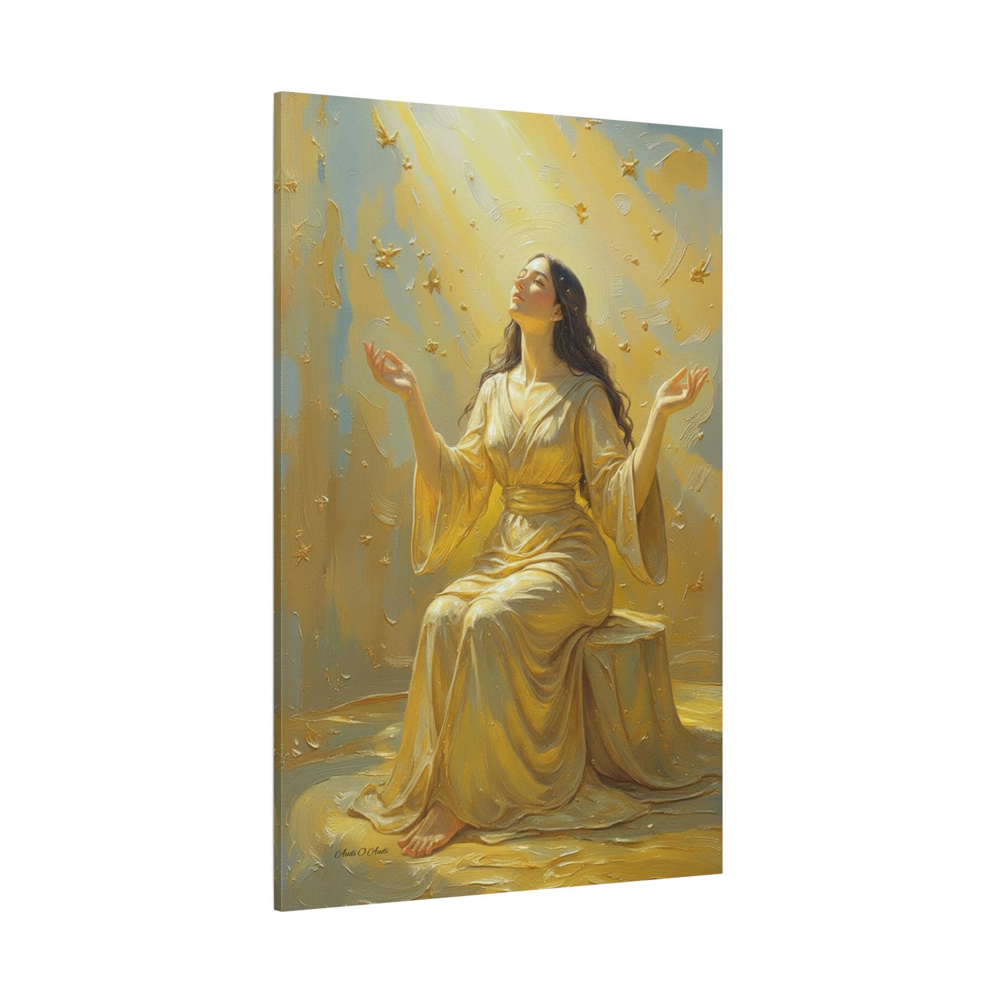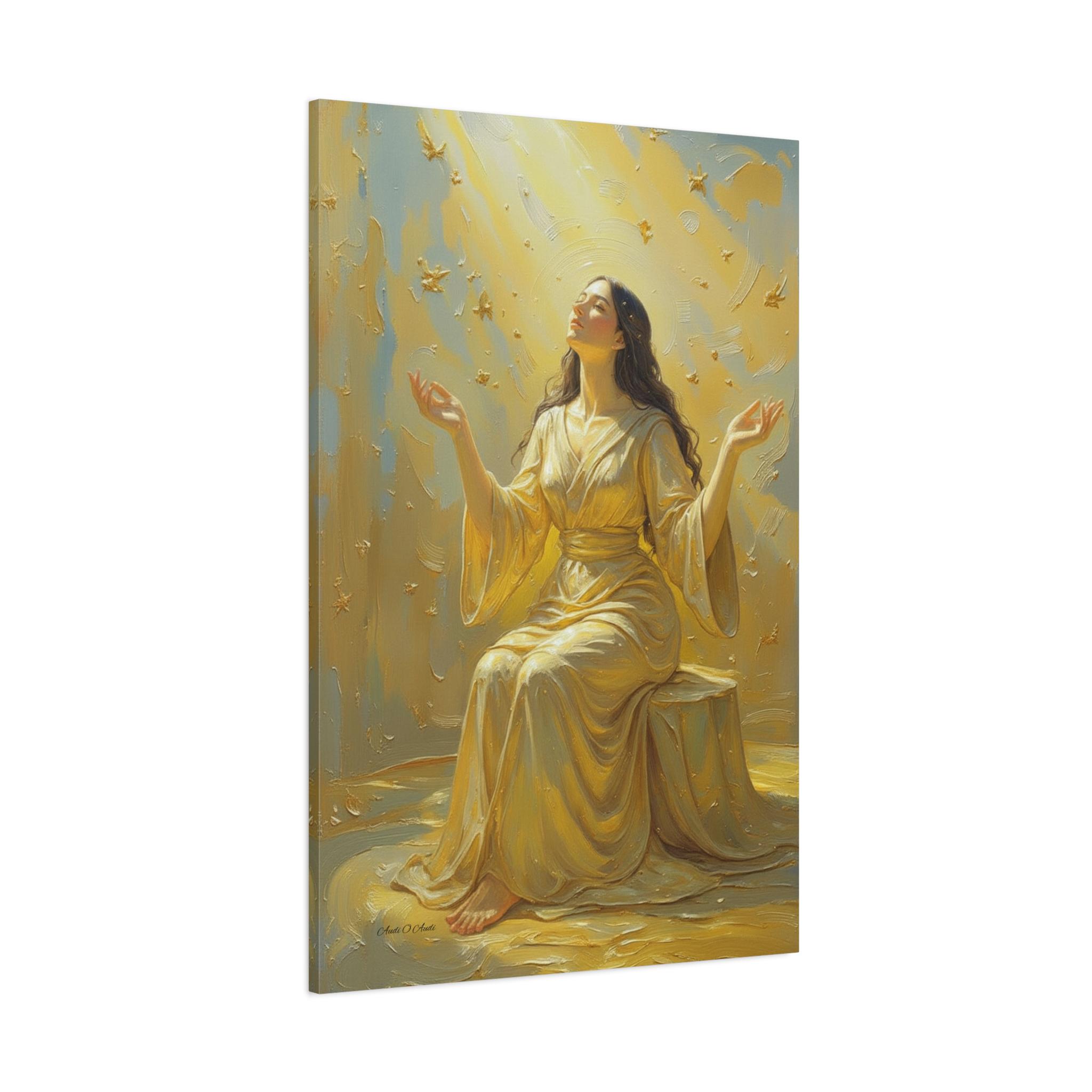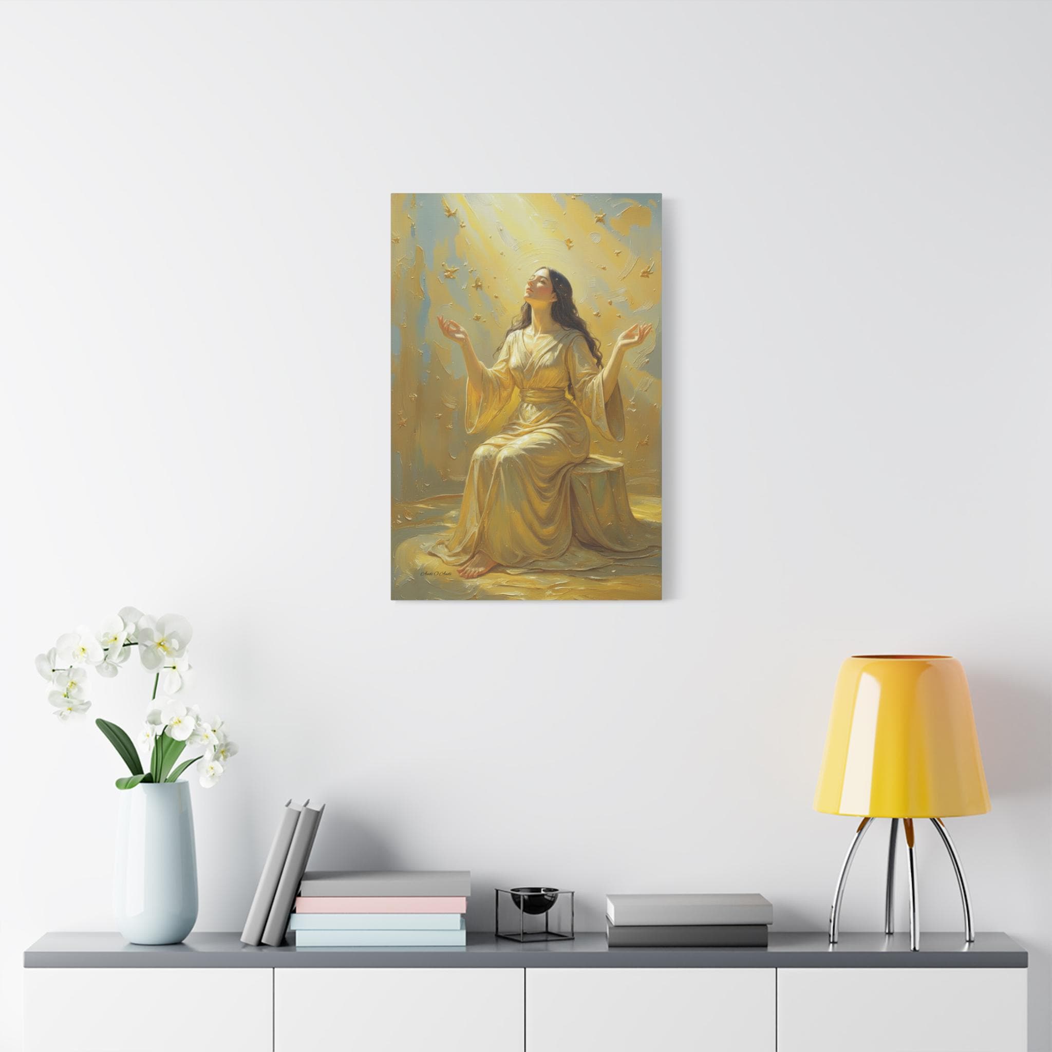Fill your sanctuary with warmth and spiritual peace with this breathtaking golden canvas print. This uplifting, ethereal artwork features a serene female figure seated in a moment of quiet joy, her arms gently raised as she basks in a radiant, glowing light filled with floating golden embers.