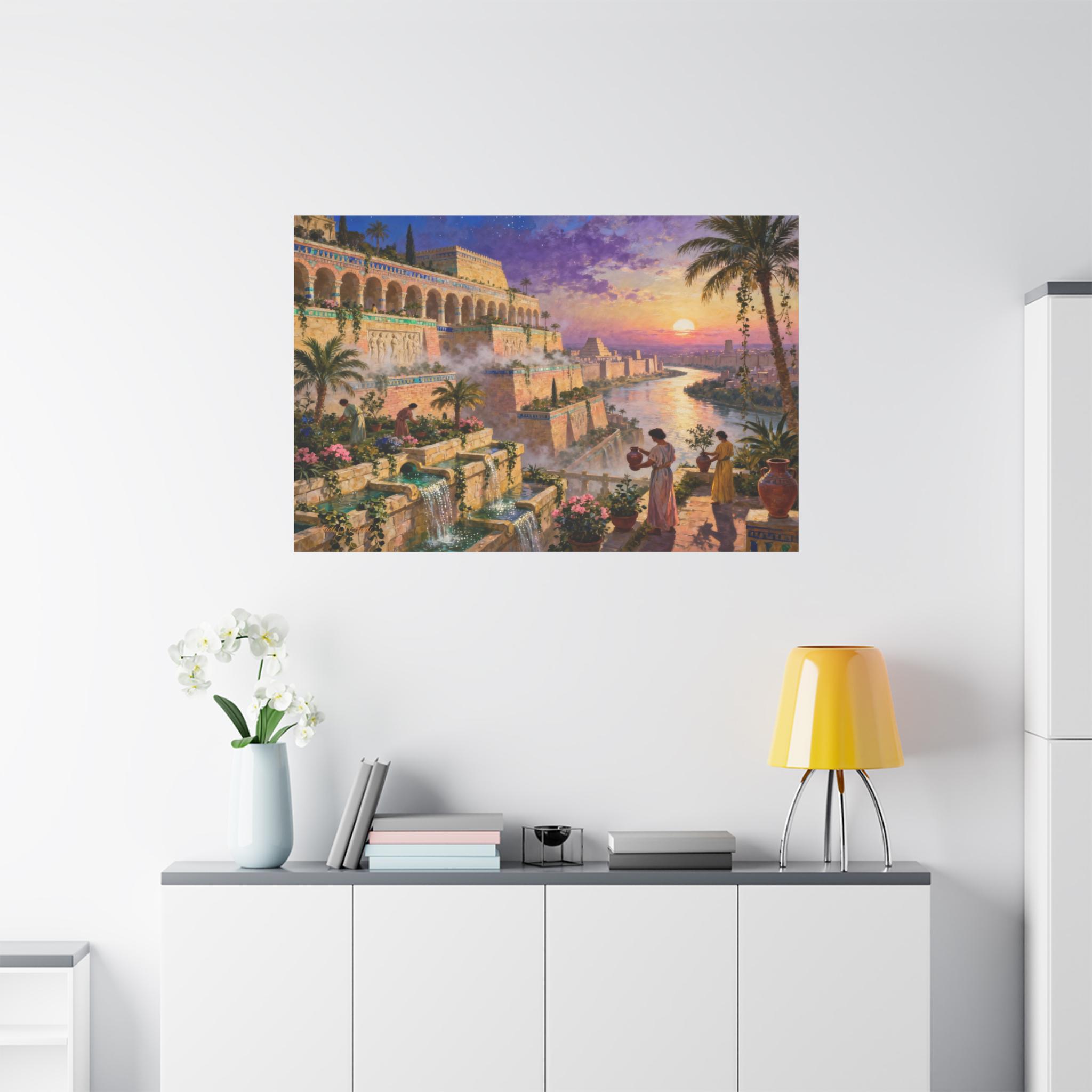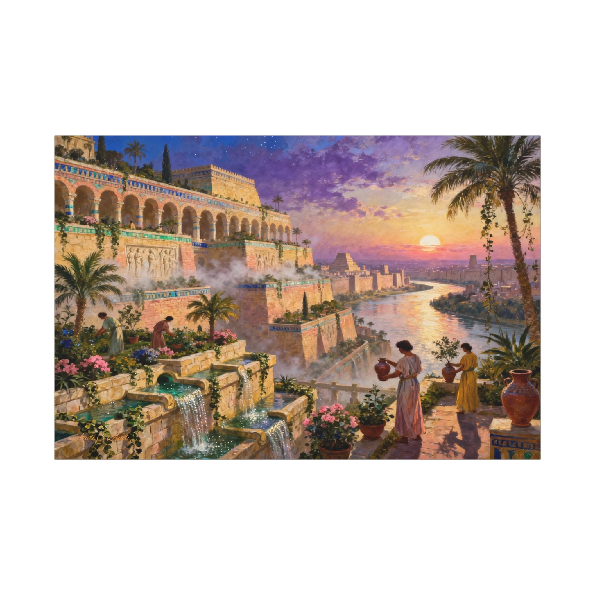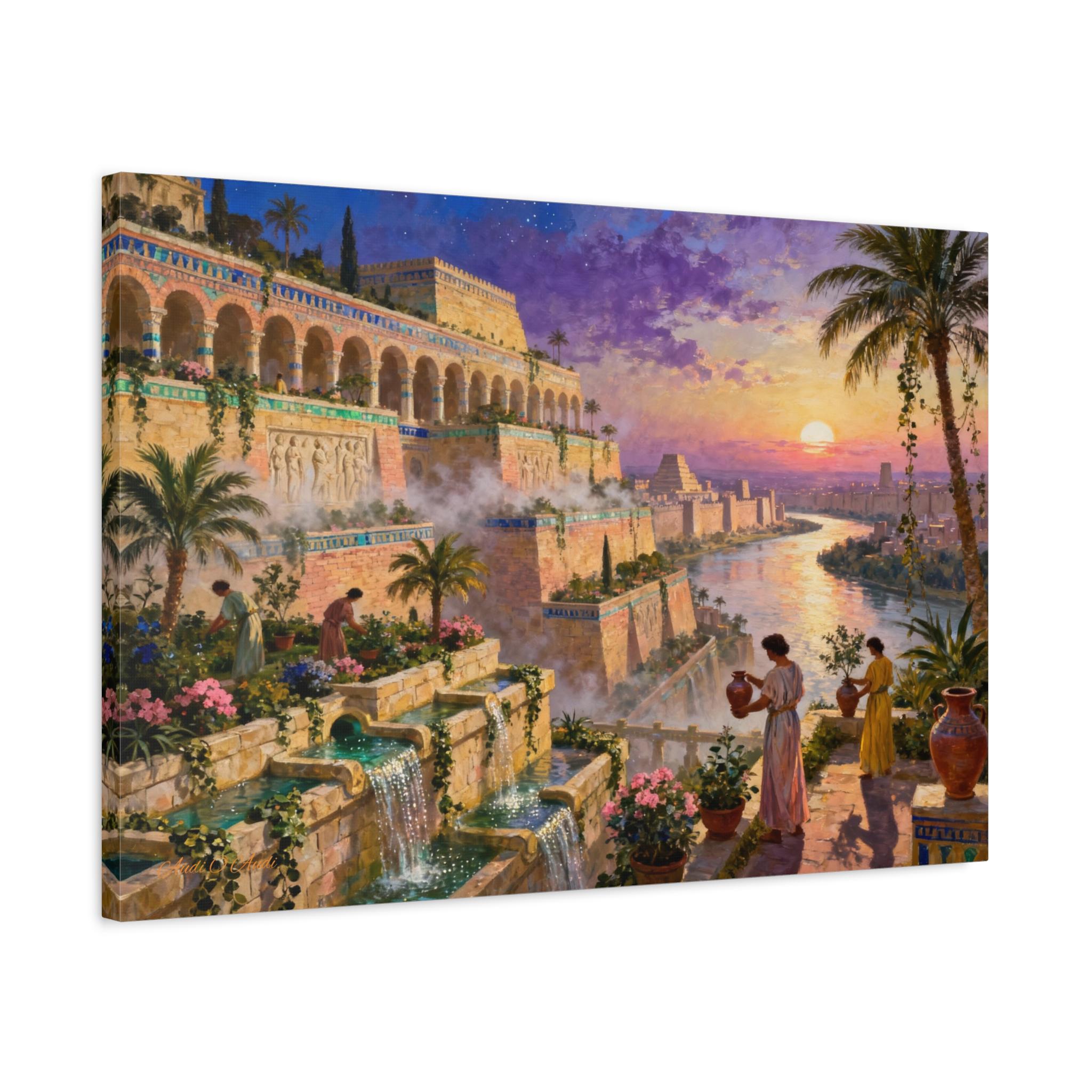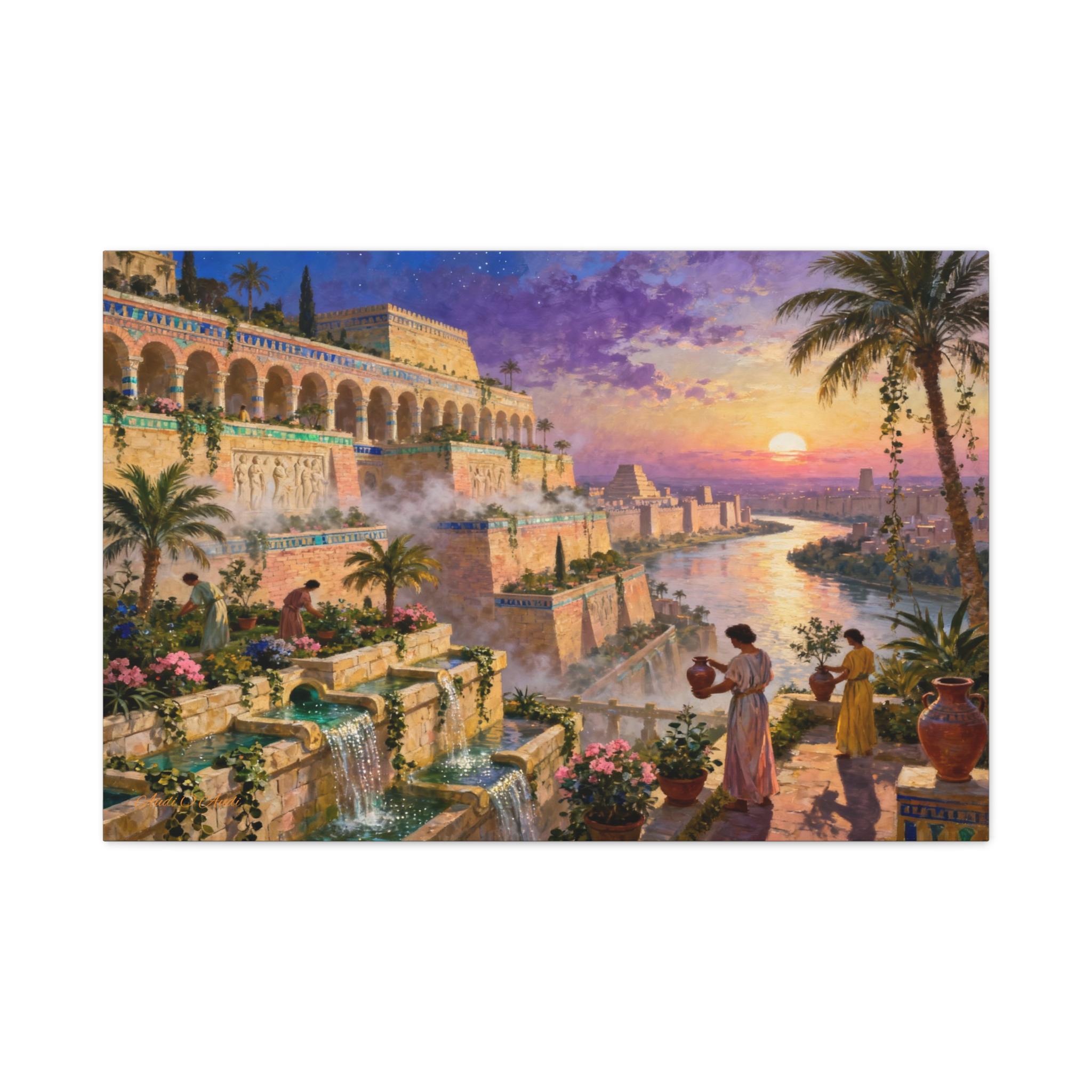 Step into a world of legendary beauty and ancient grandeur with this breathtaking epic landscape canvas print. This magnificent artwork captures the spirit of the mythical Hanging Gardens, featuring sprawling architectural terraces, cascading turquoise waterfalls, and lush botanical gardens set against a radiant, colorful sunset sky.