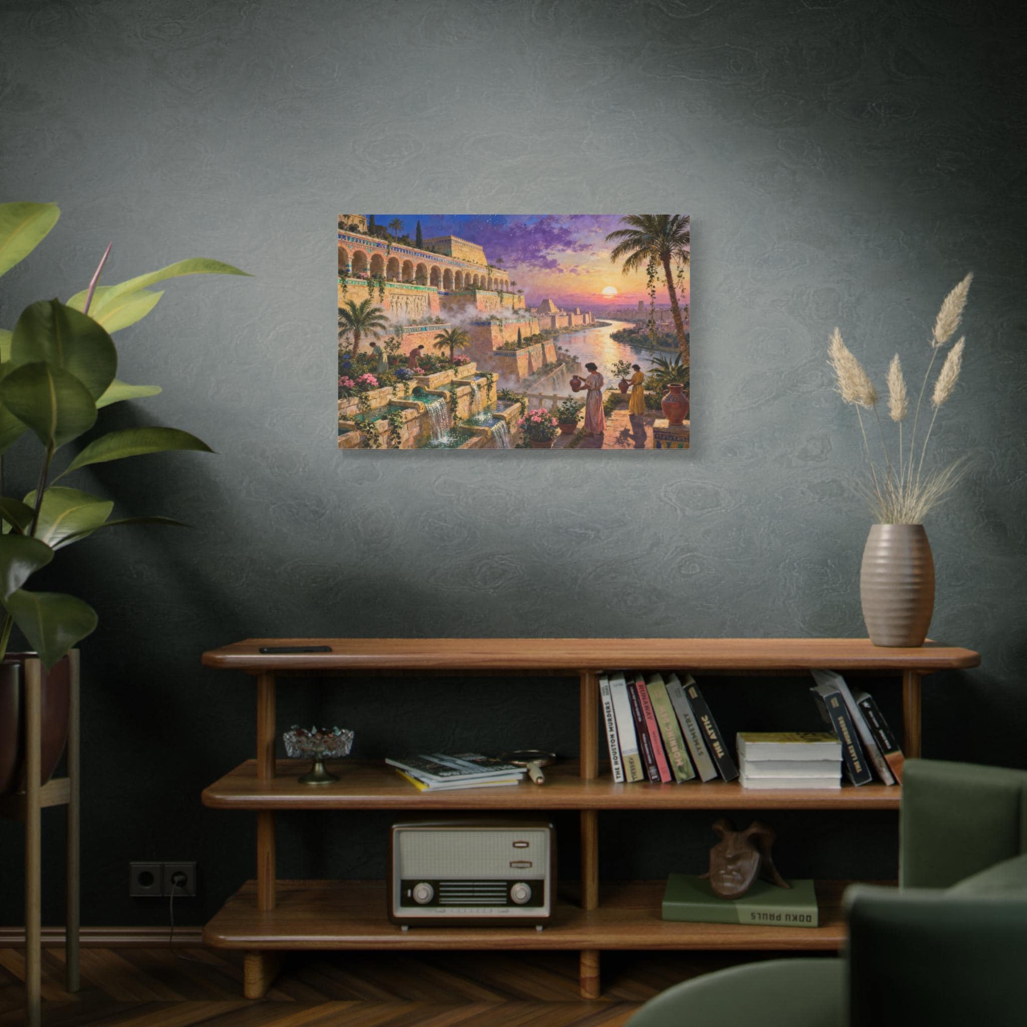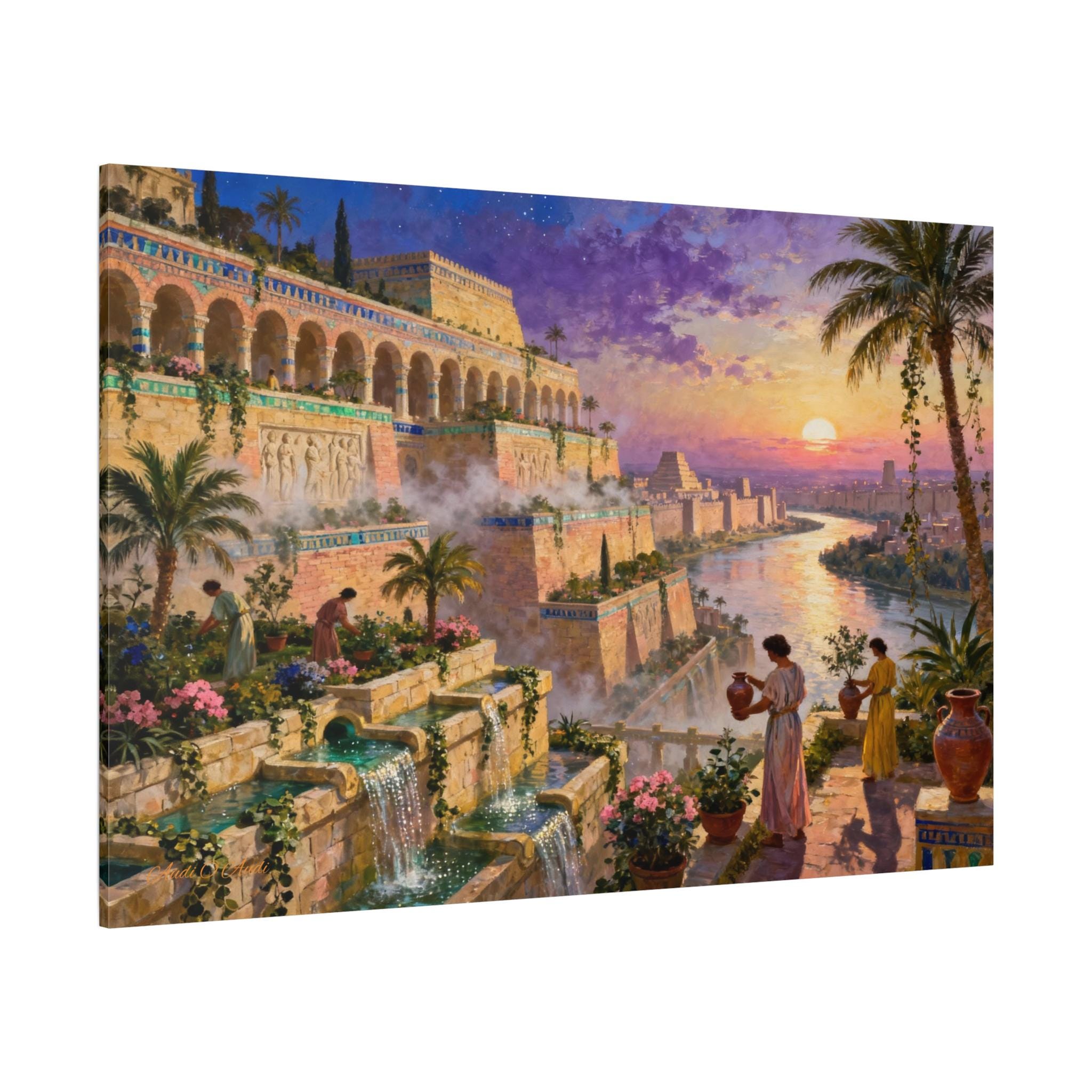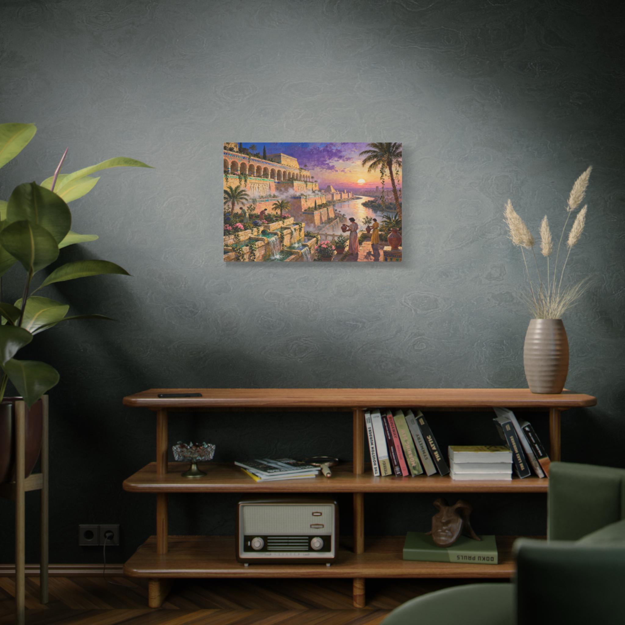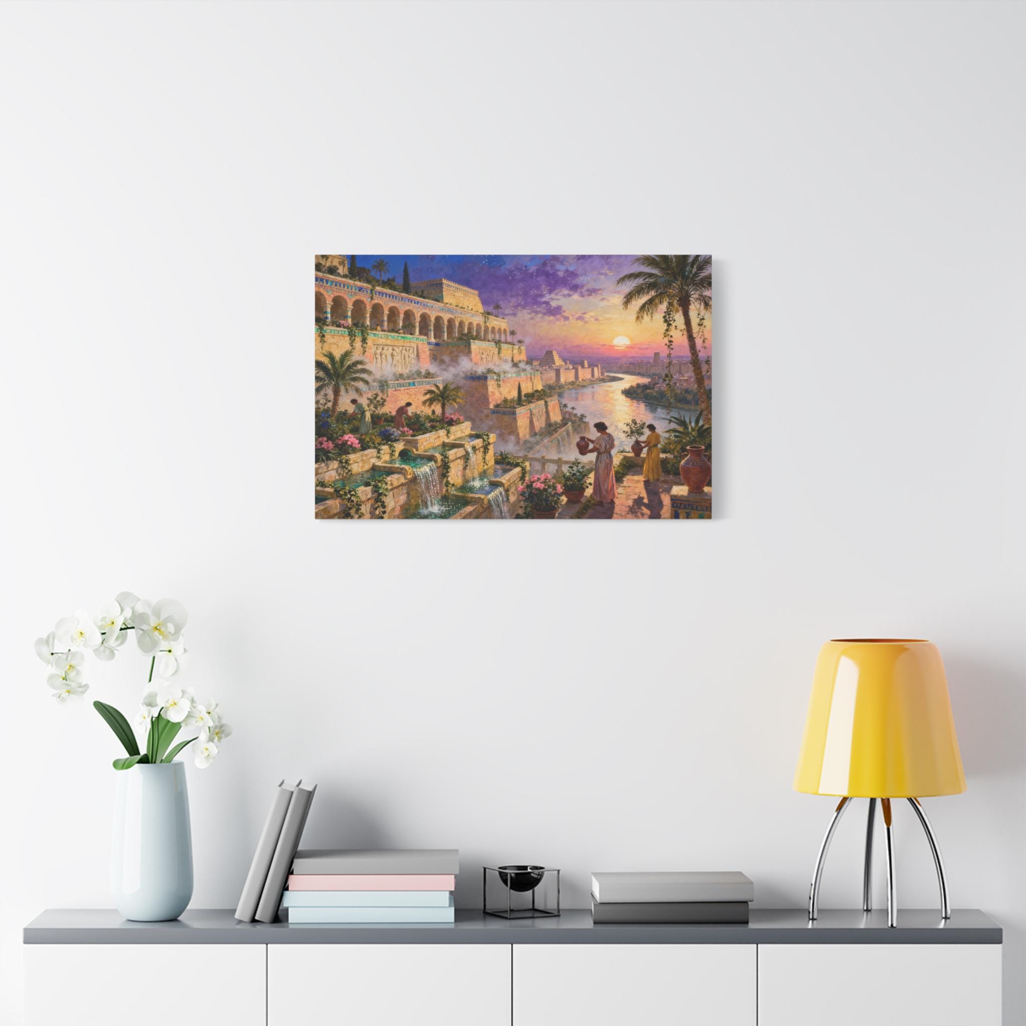 Step into a world of legendary beauty and ancient grandeur with this breathtaking epic landscape canvas print. This magnificent artwork captures the spirit of the mythical Hanging Gardens, featuring sprawling architectural terraces, cascading turquoise waterfalls, and lush botanical gardens set against a radiant, colorful sunset sky.
