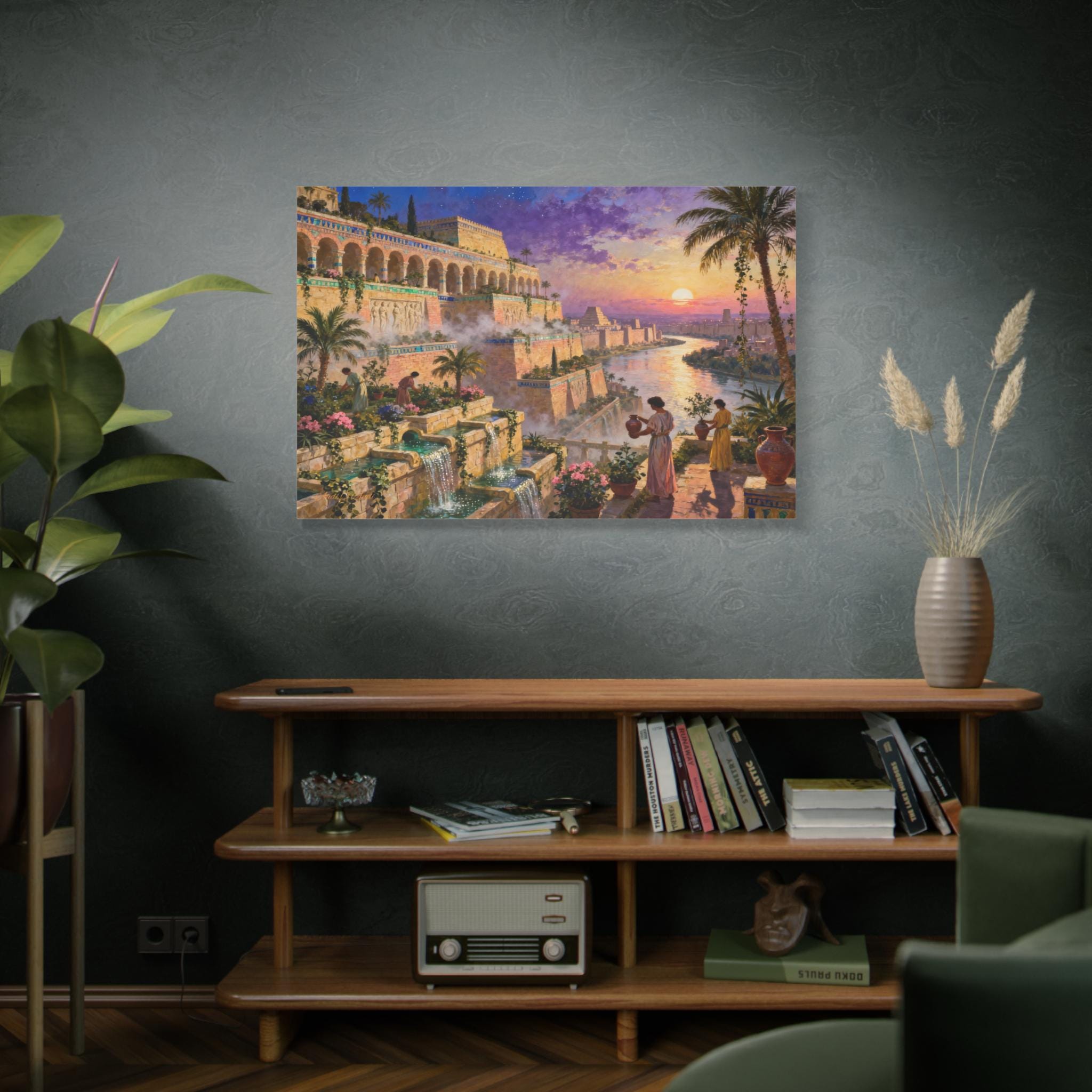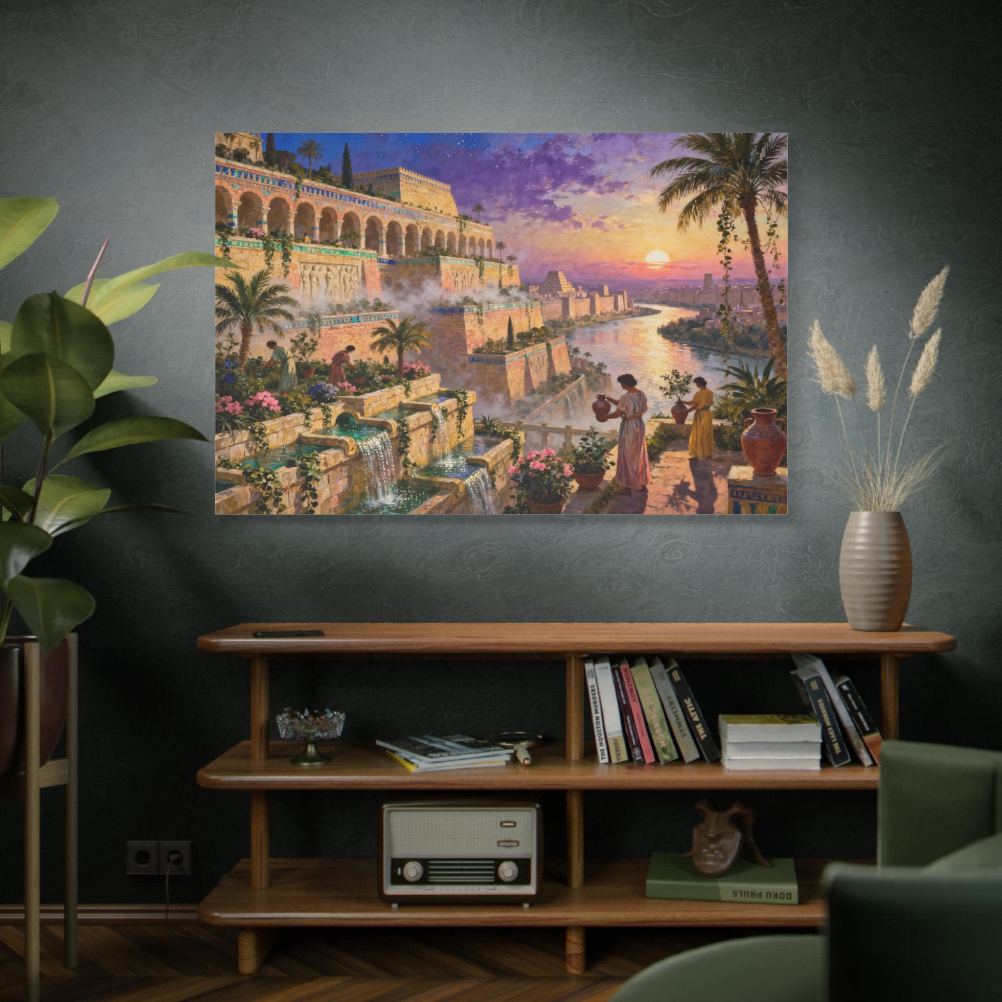 The composition is incredibly immersive, with figures in classical draping tending to the blooming flowers and palm trees, overlooking a glowing river and distant city walls. The vivid colors and cinematic lighting make this an awe-inspiring statement piece, perfect for bringing a touch of mythological wonder and historical elegance to your library, study, or living space.