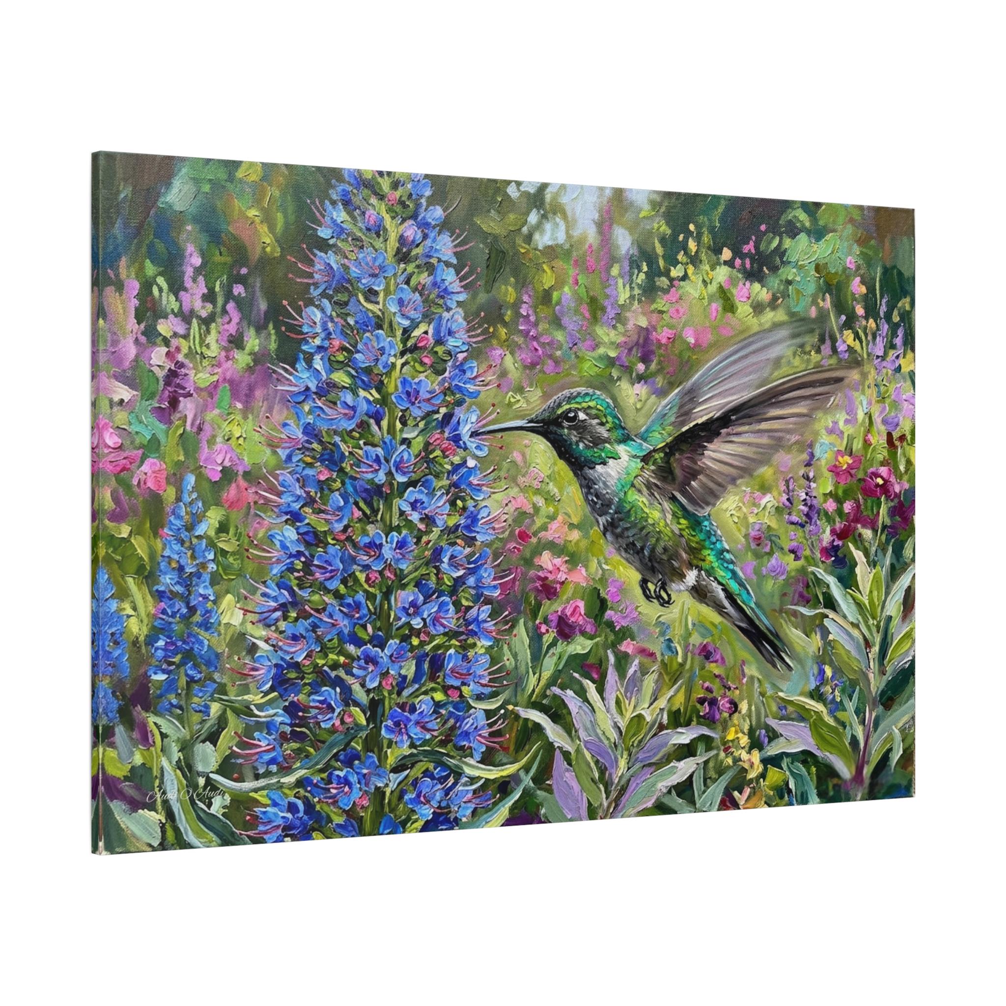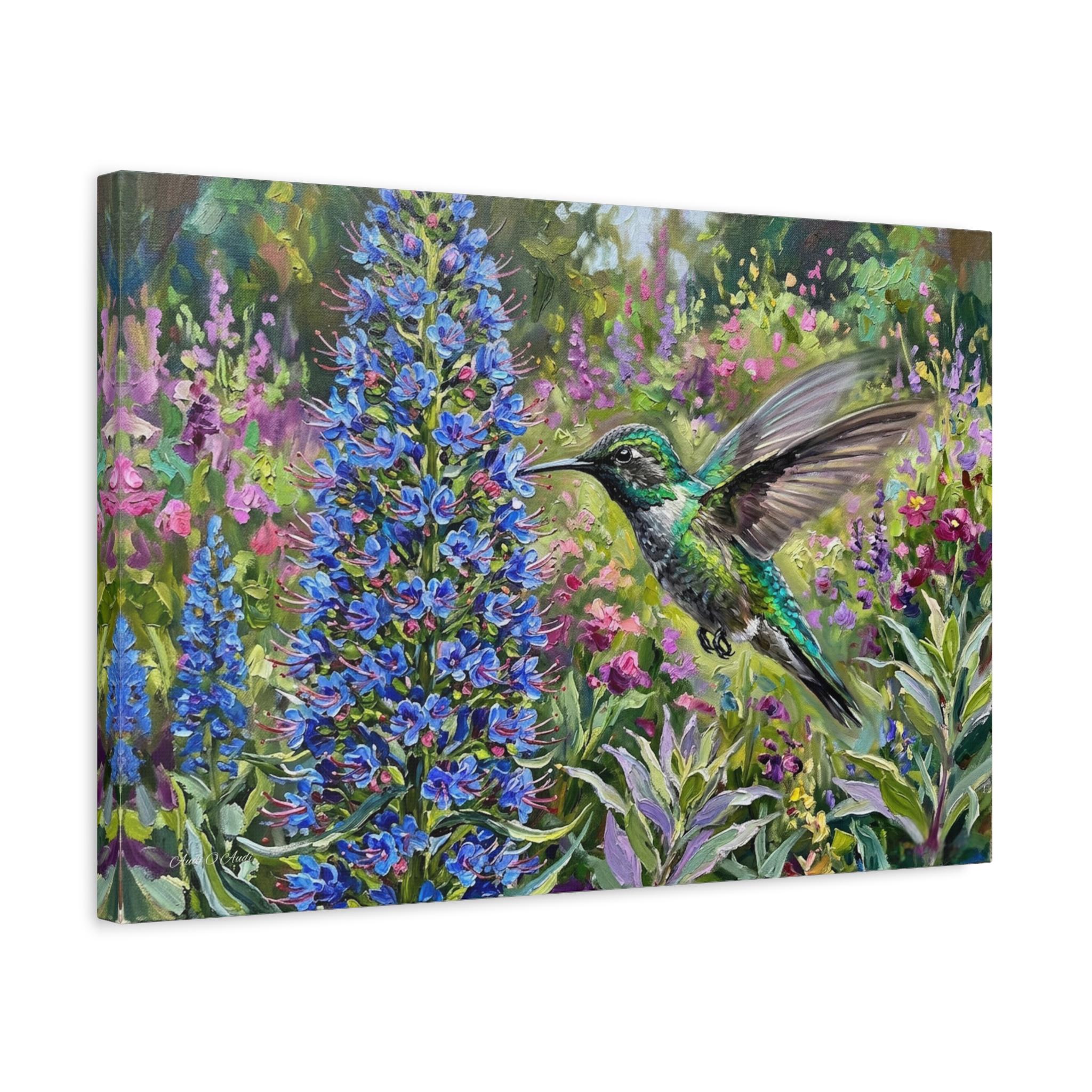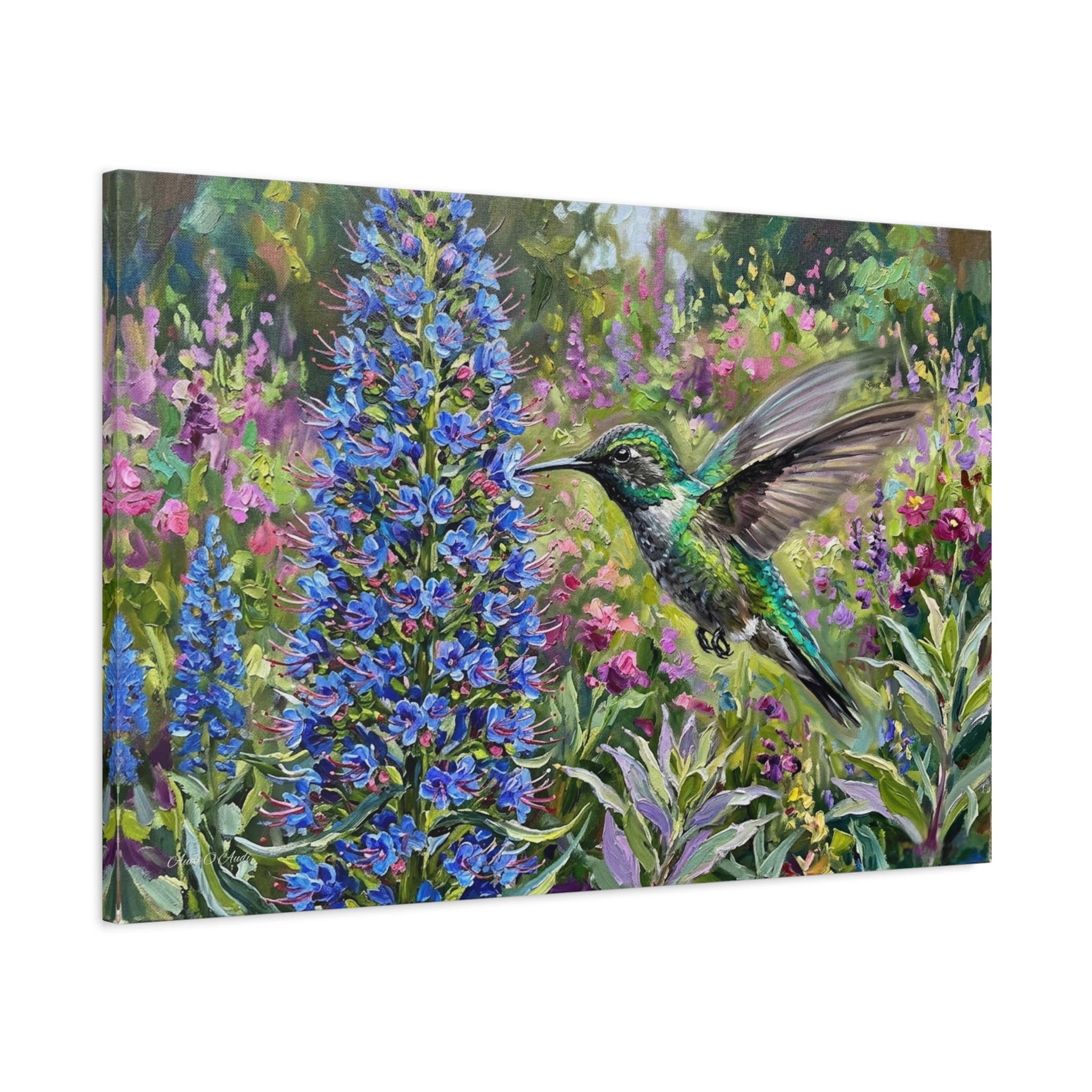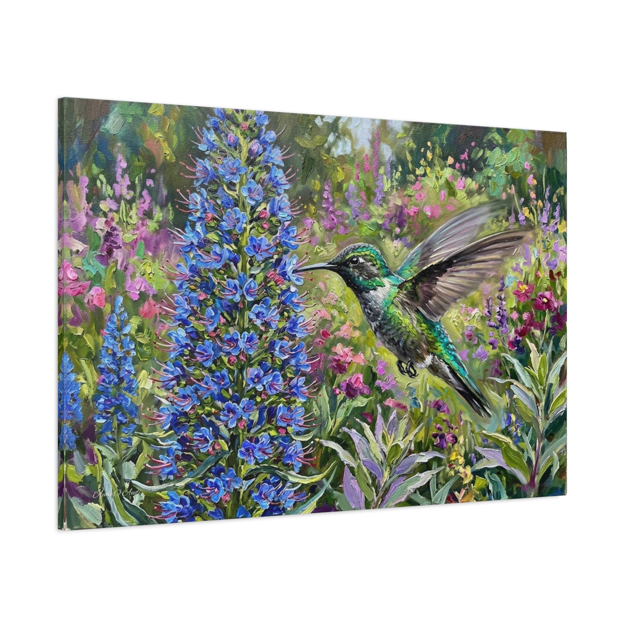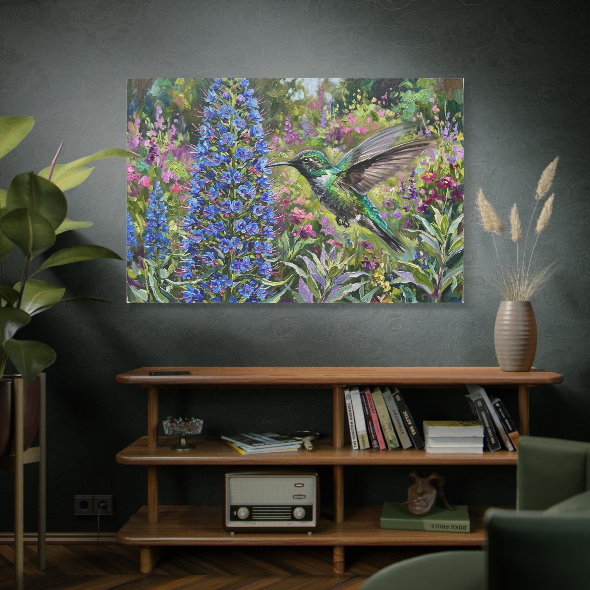 Bring the vibrant, joyful energy of a blooming spring garden into your home with this stunning hummingbird canvas print. This lively botanical artwork captures a brilliant emerald hummingbird mid-flight as it feeds from a towering spire of blue and purple wildflowers, surrounded by lush greenery and soft pink blooms.