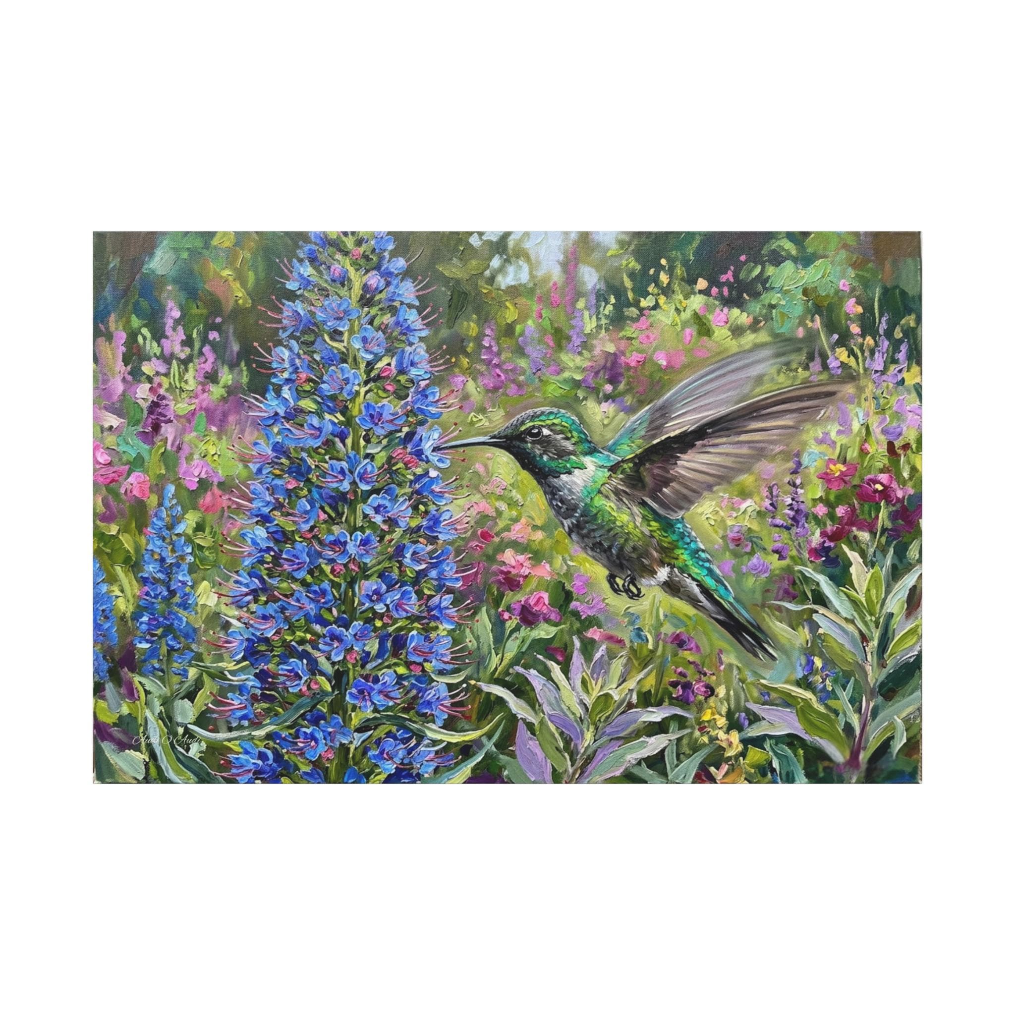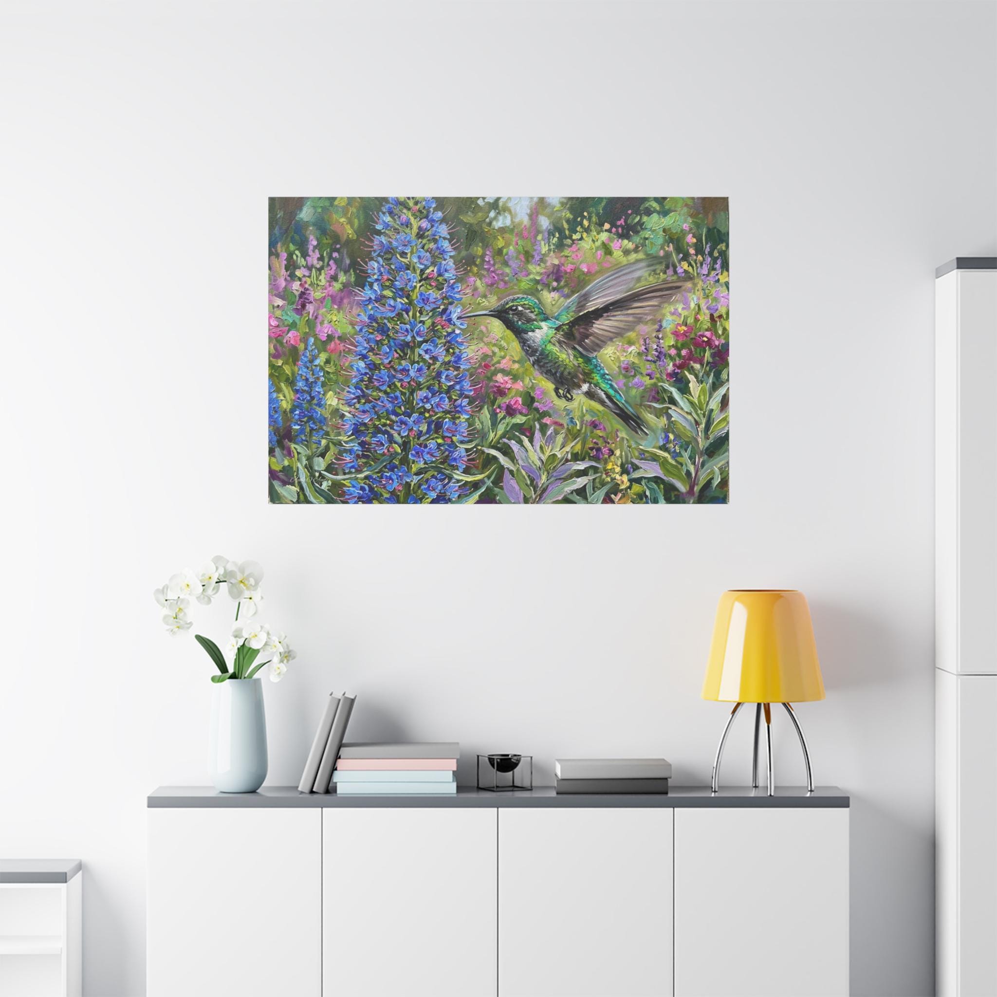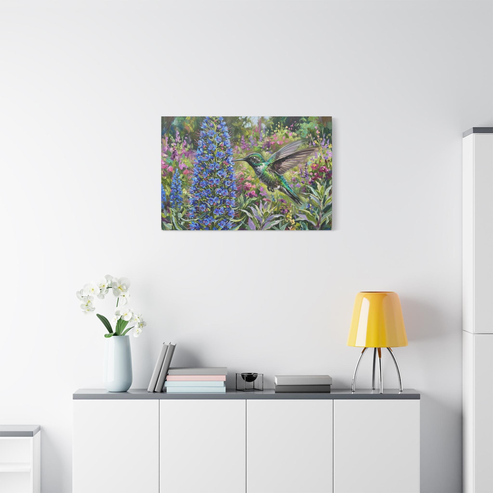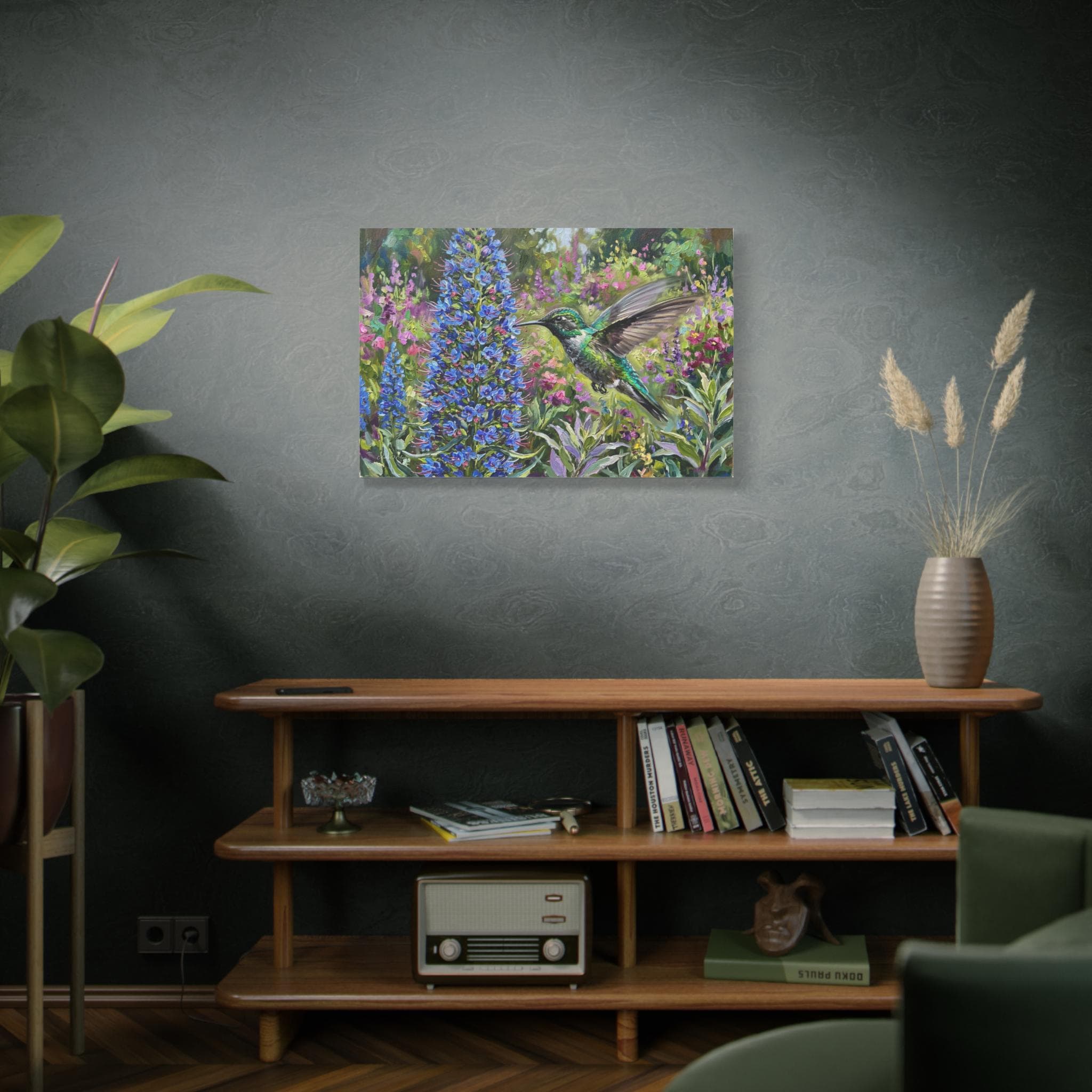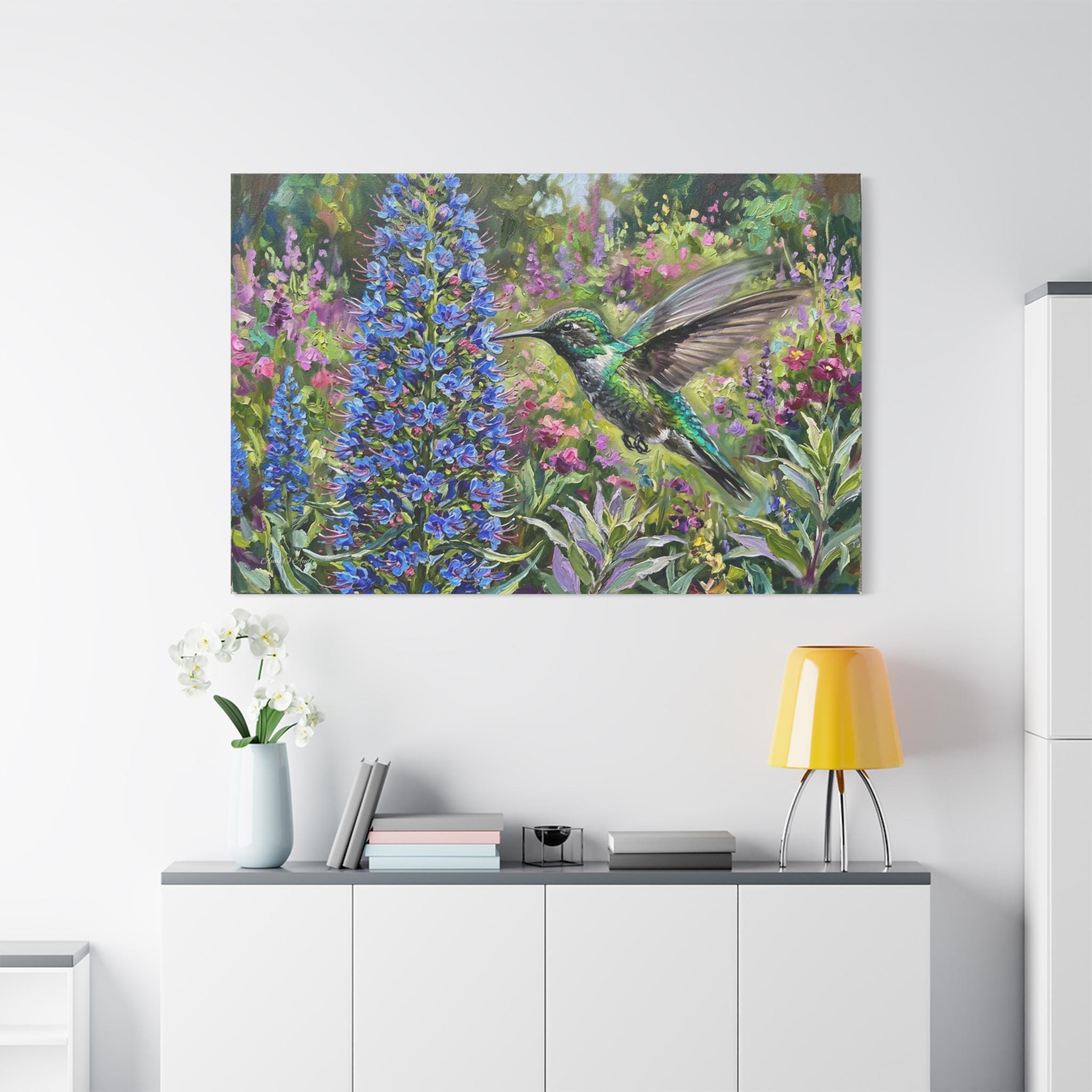 Bring the vibrant, joyful energy of a blooming spring garden into your home with this stunning hummingbird canvas print. This lively botanical artwork captures a brilliant emerald hummingbird mid-flight as it feeds from a towering spire of blue and purple wildflowers, surrounded by lush greenery and soft pink blooms.