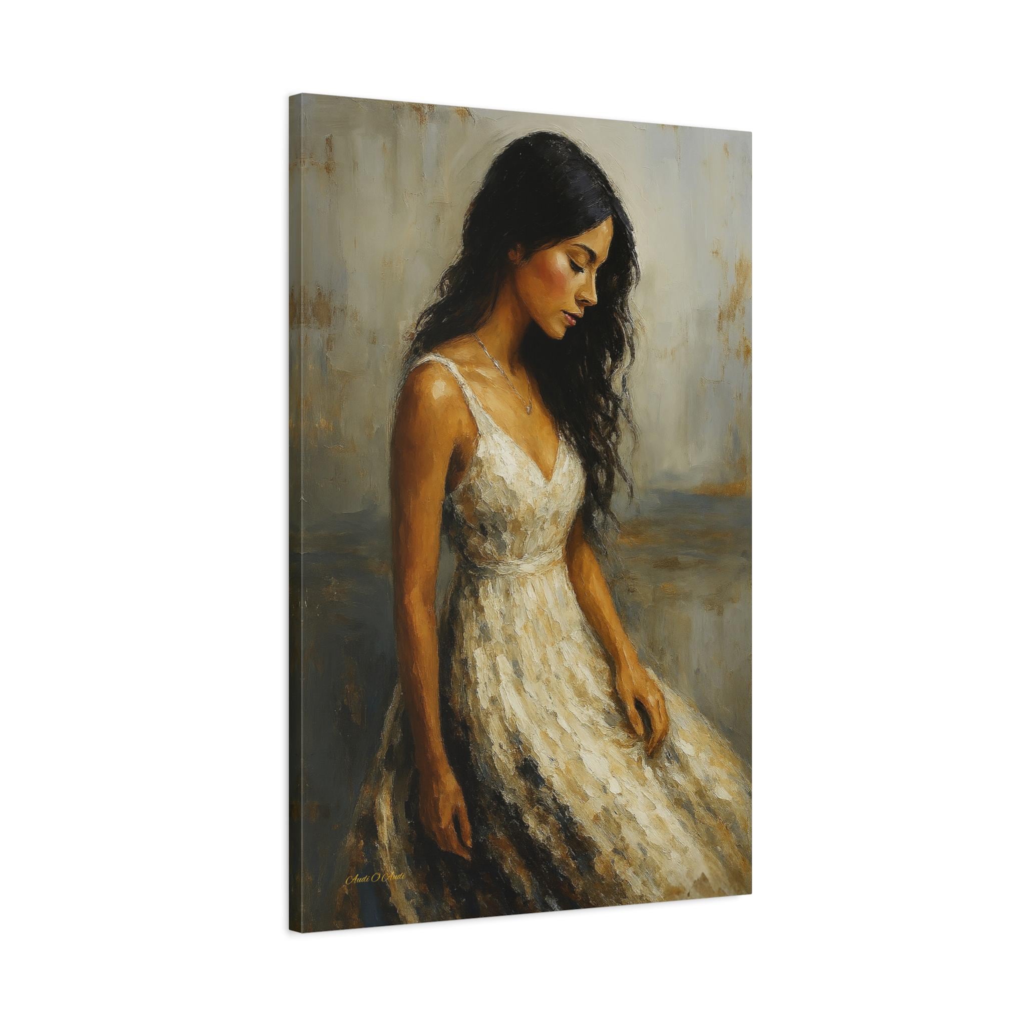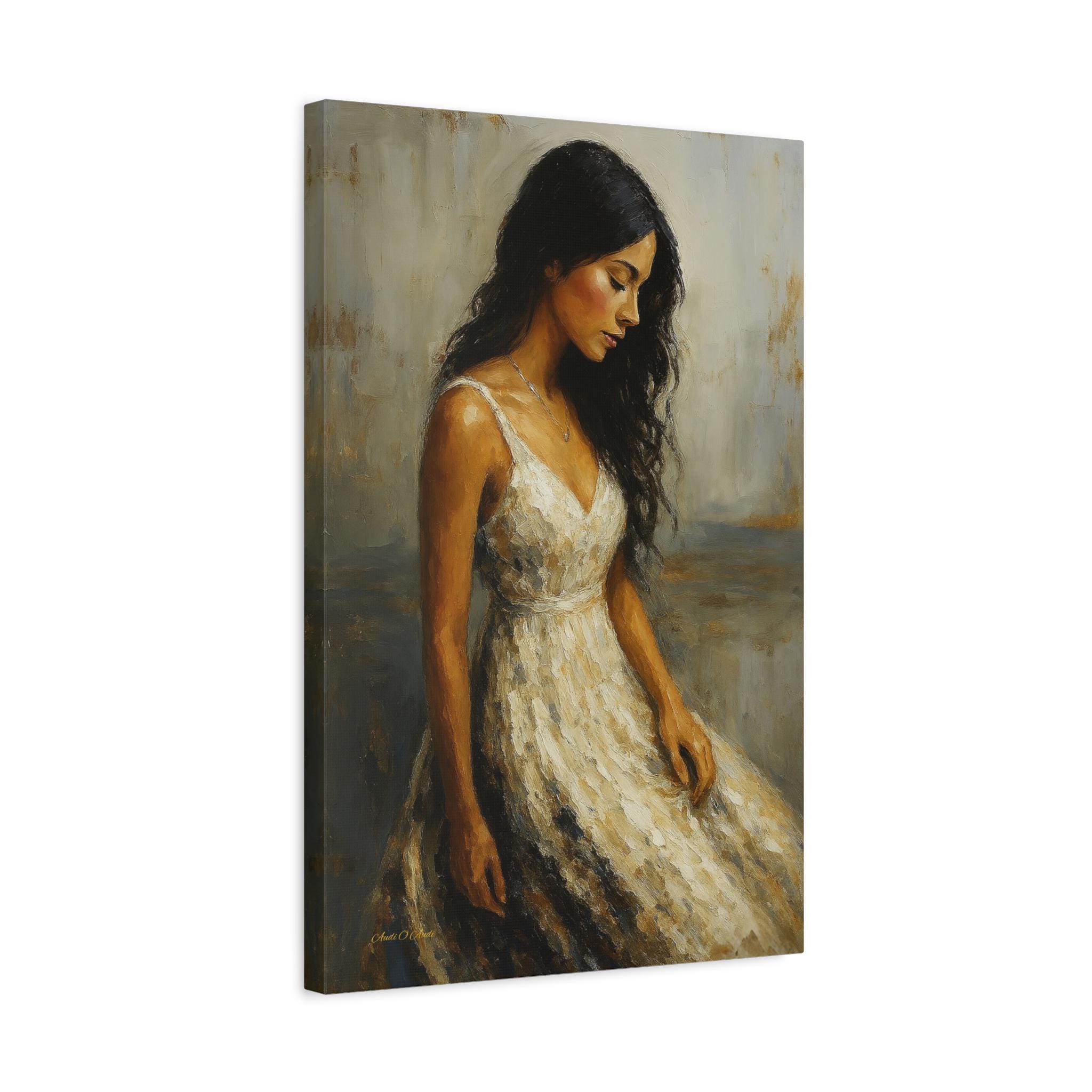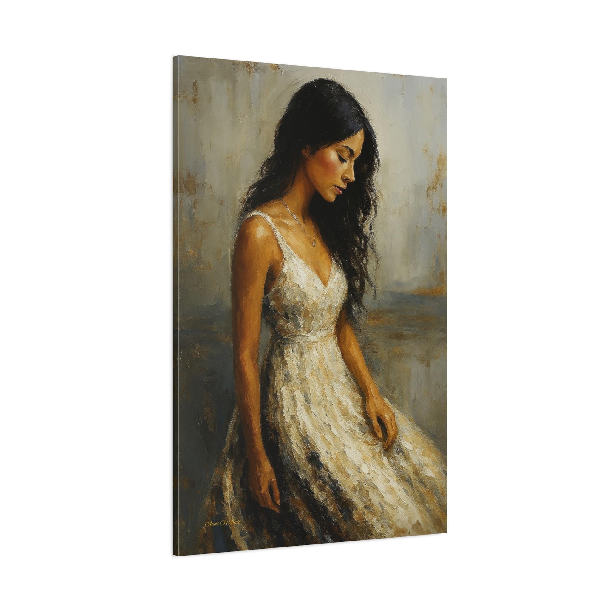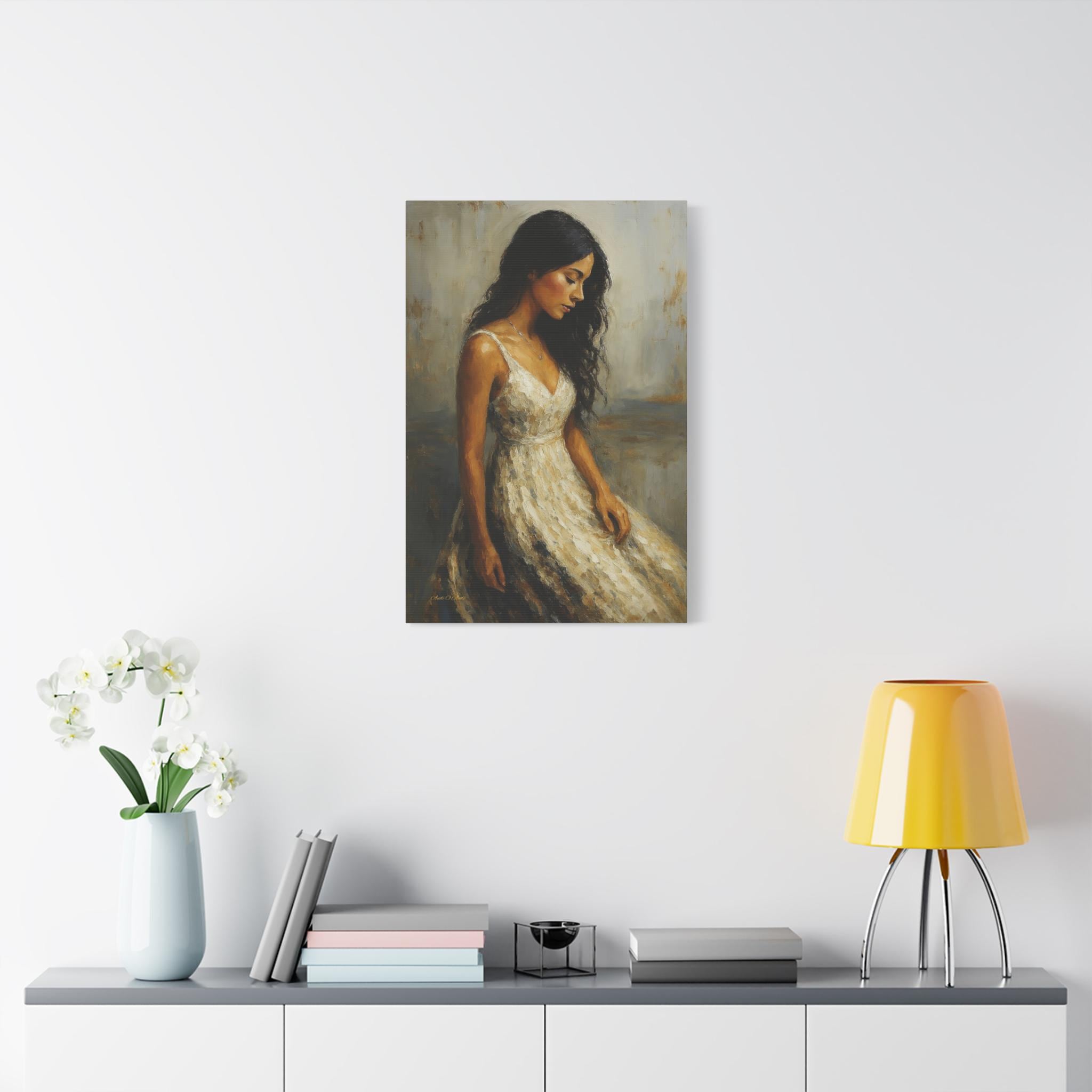 Bring a touch of timeless romance and quiet elegance to your space with this captivating female portrait canvas print. This beautiful artwork features a serene young woman with flowing dark hair, wearing a classic white dress, cast in a warm, nostalgic golden light. Her downward gaze creates a peaceful, contemplative mood that softens any room.
