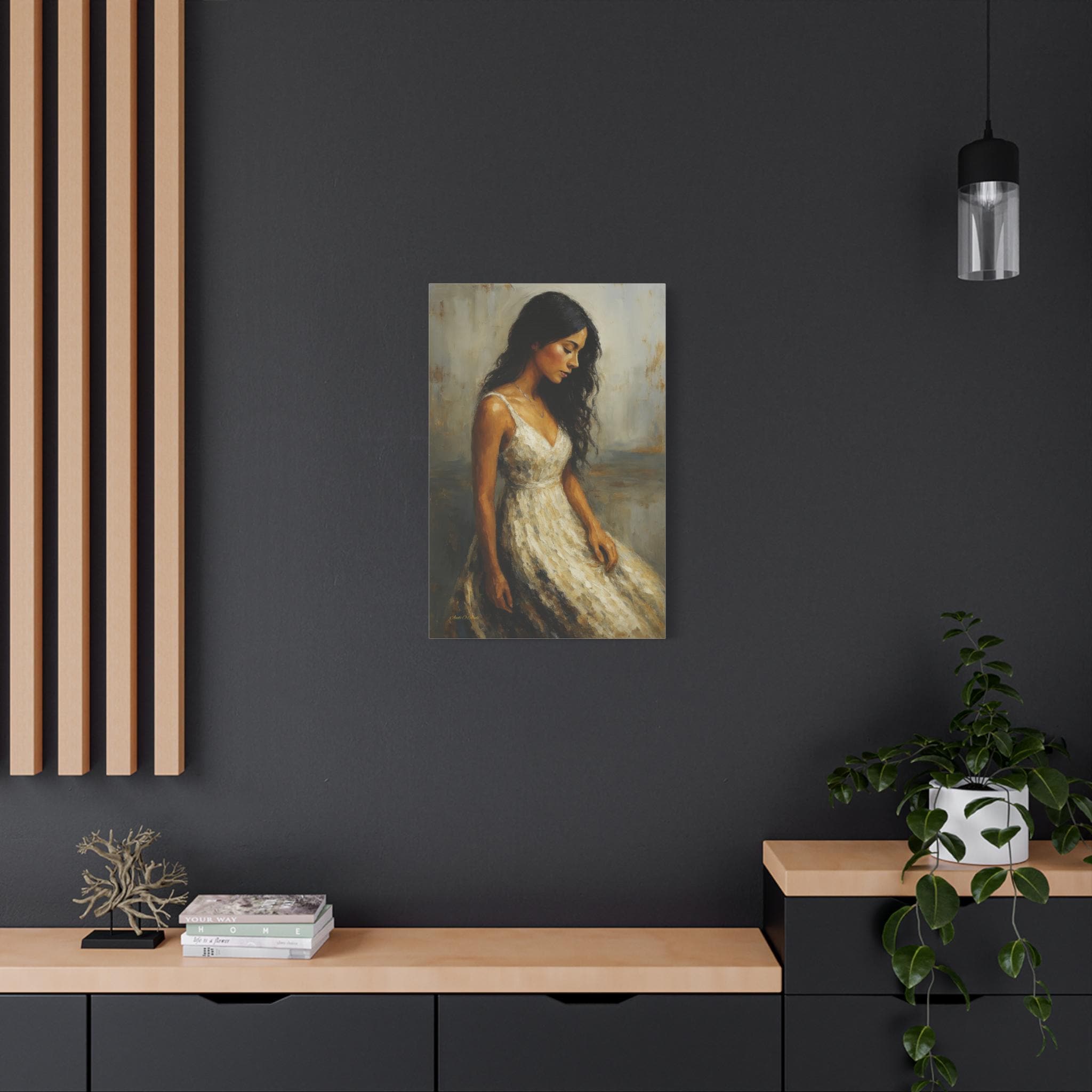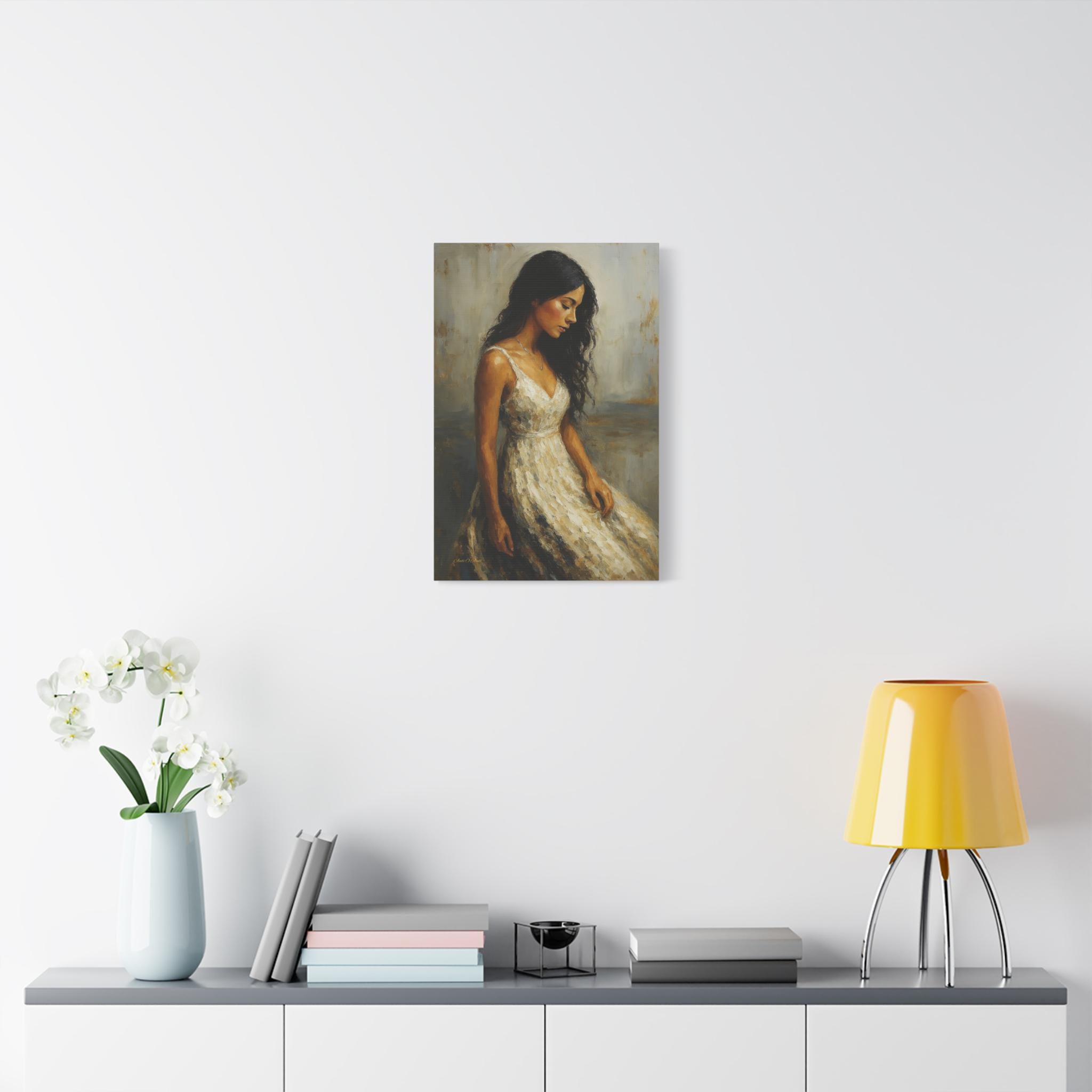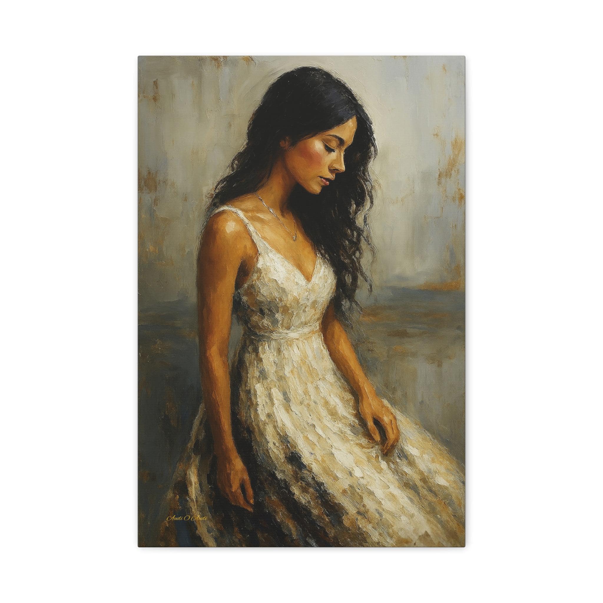 Bring a touch of timeless romance and quiet elegance to your space with this captivating female portrait canvas print. This beautiful artwork features a serene young woman with flowing dark hair, wearing a classic white dress, cast in a warm, nostalgic golden light. Her downward gaze creates a peaceful, contemplative mood that softens any room.
