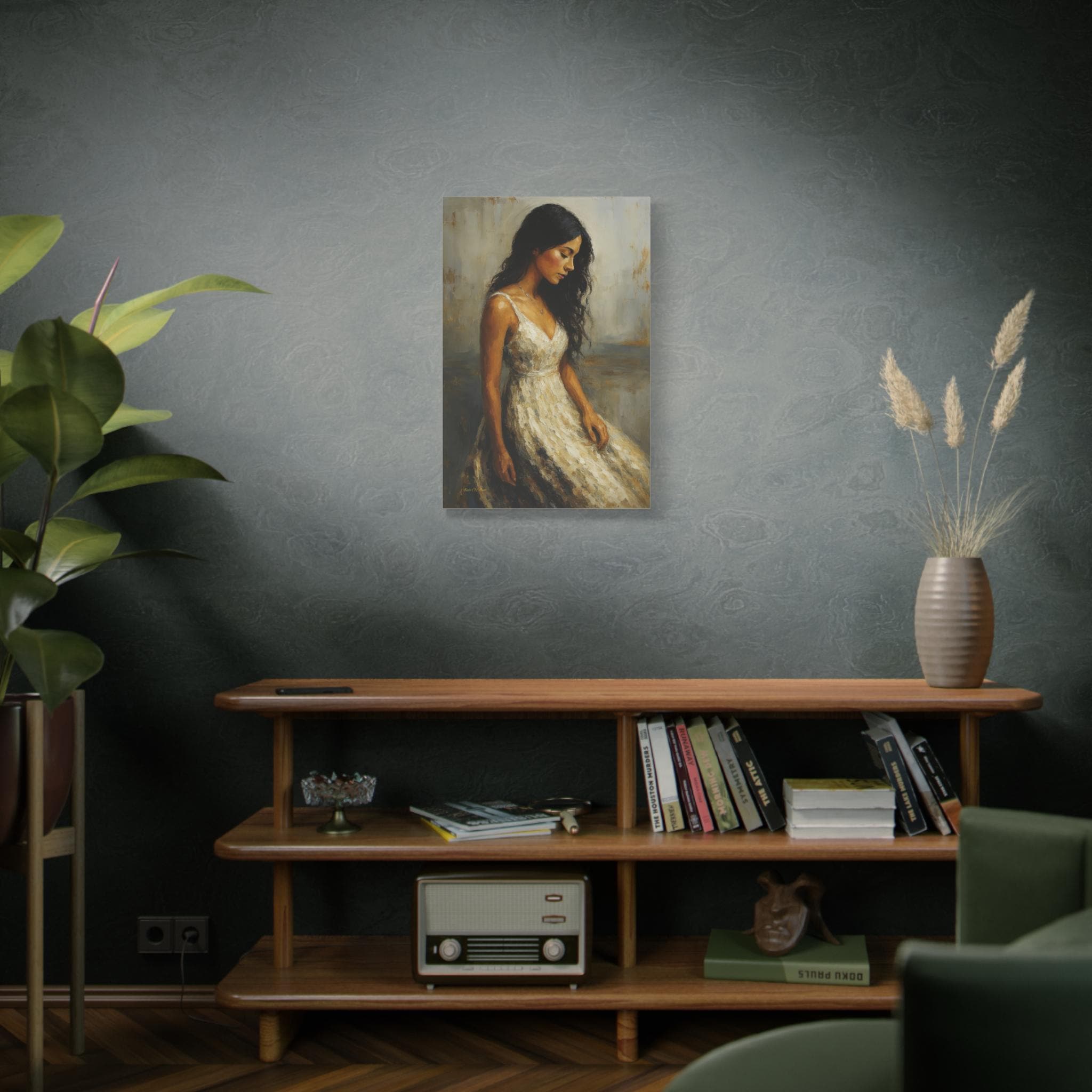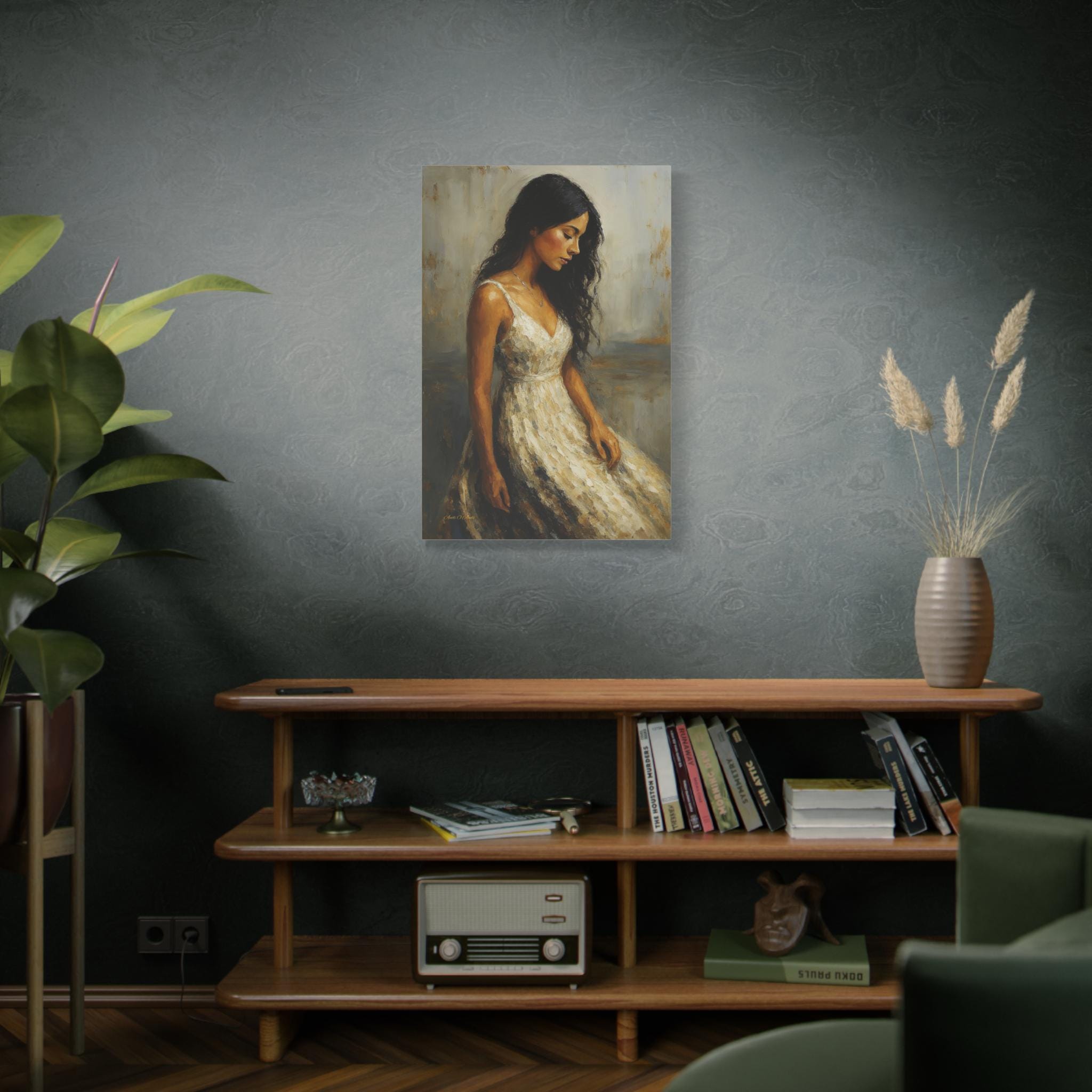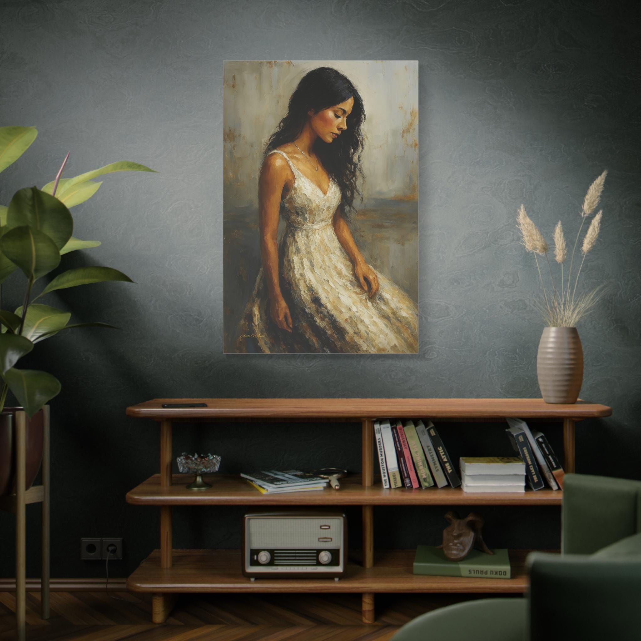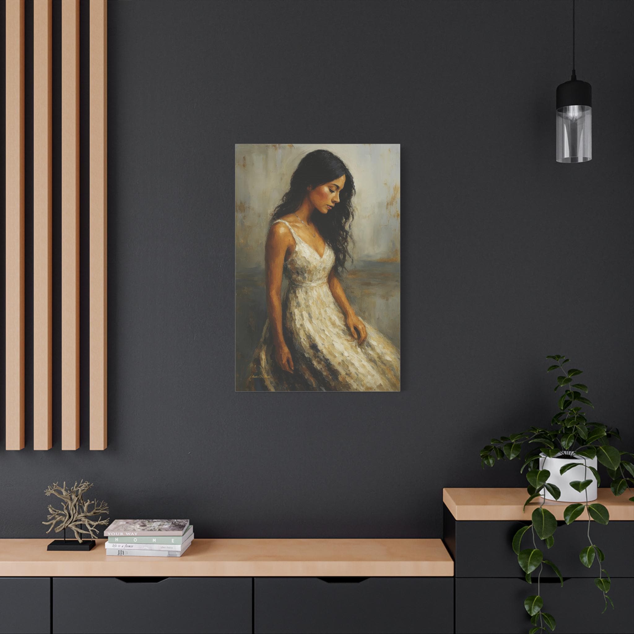 Bring a touch of timeless romance and quiet elegance to your space with this captivating female portrait canvas print. This beautiful artwork features a serene young woman with flowing dark hair, wearing a classic white dress, cast in a warm, nostalgic golden light. Her downward gaze creates a peaceful, contemplative mood that softens any room.