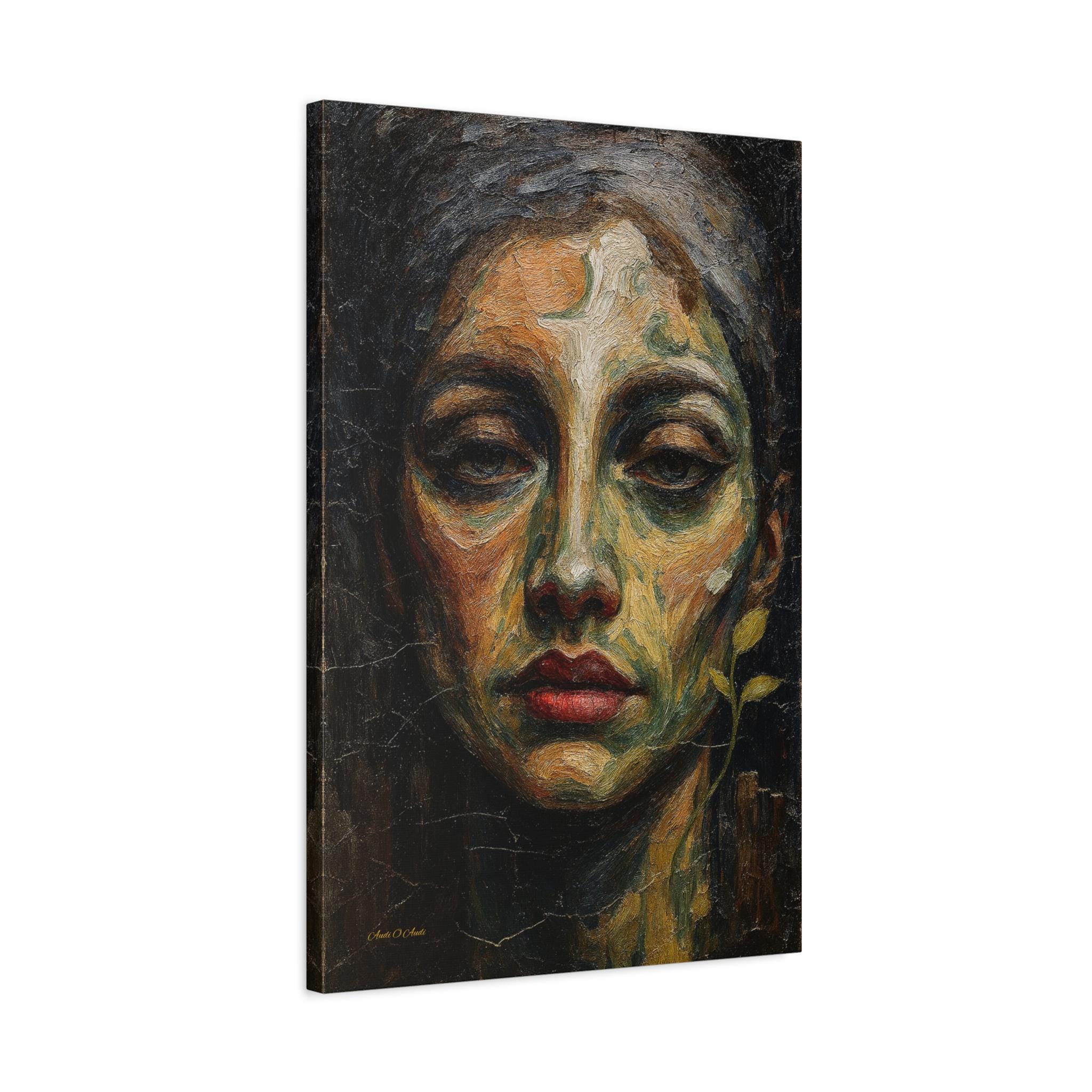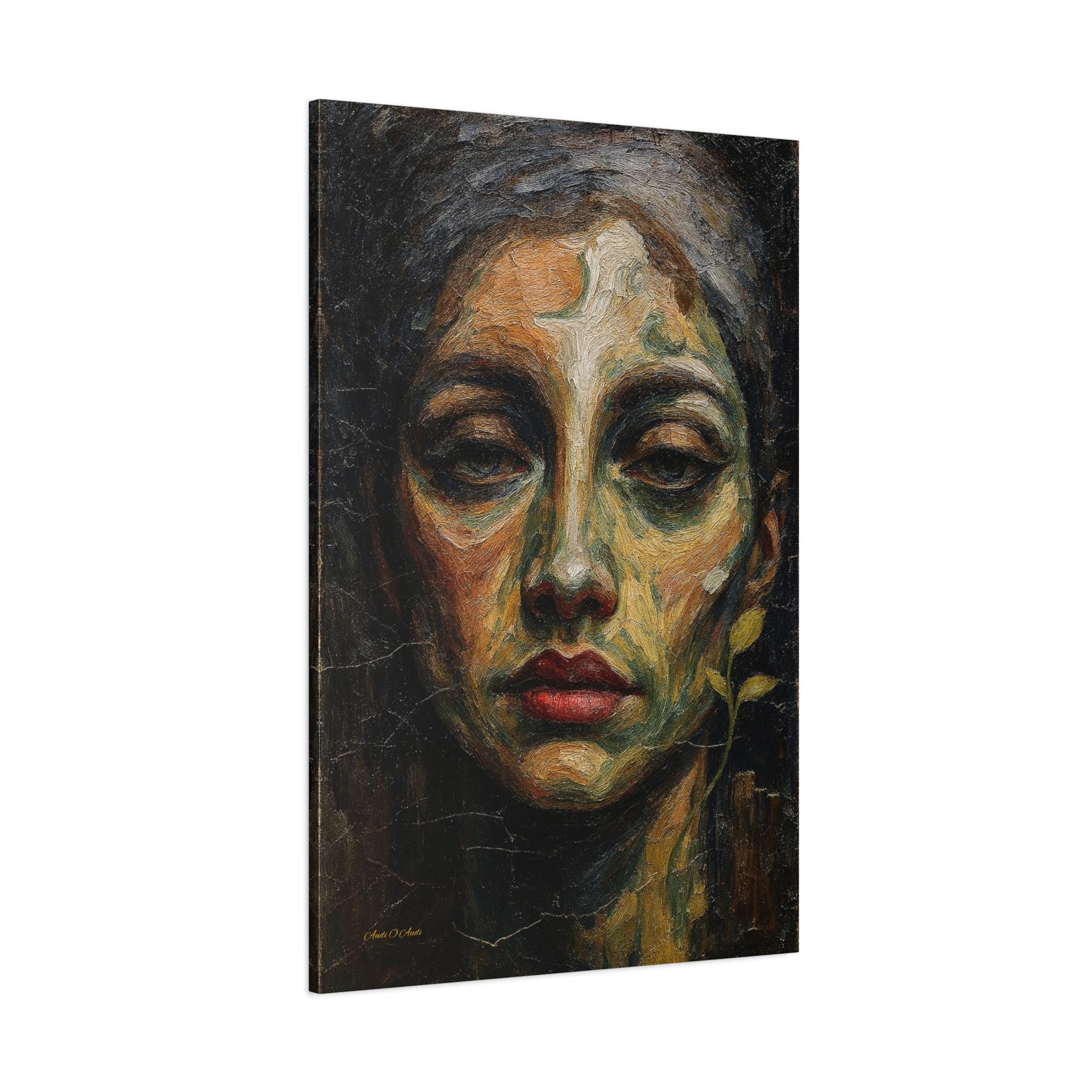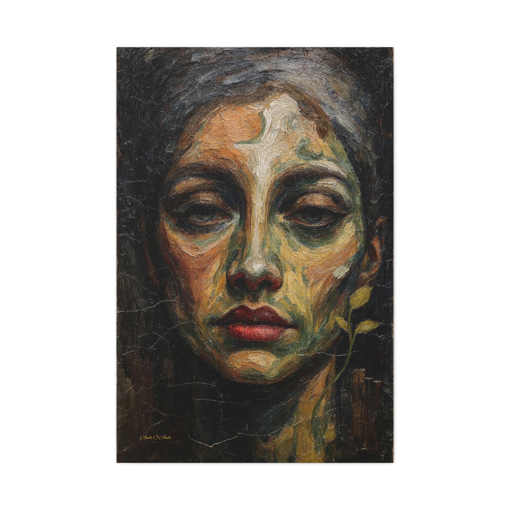 Add a touch of profound, earthy drama to your space with this striking moody female portrait canvas print. This captivating artwork features a close-up, highly textured portrait of a woman with a soulful gaze and vivid red lips. Rendered in deep olive greens, warm ochres, and dark shadows, the composition is enhanced by a delicate, surreal botanical sprout curving along her jawline.