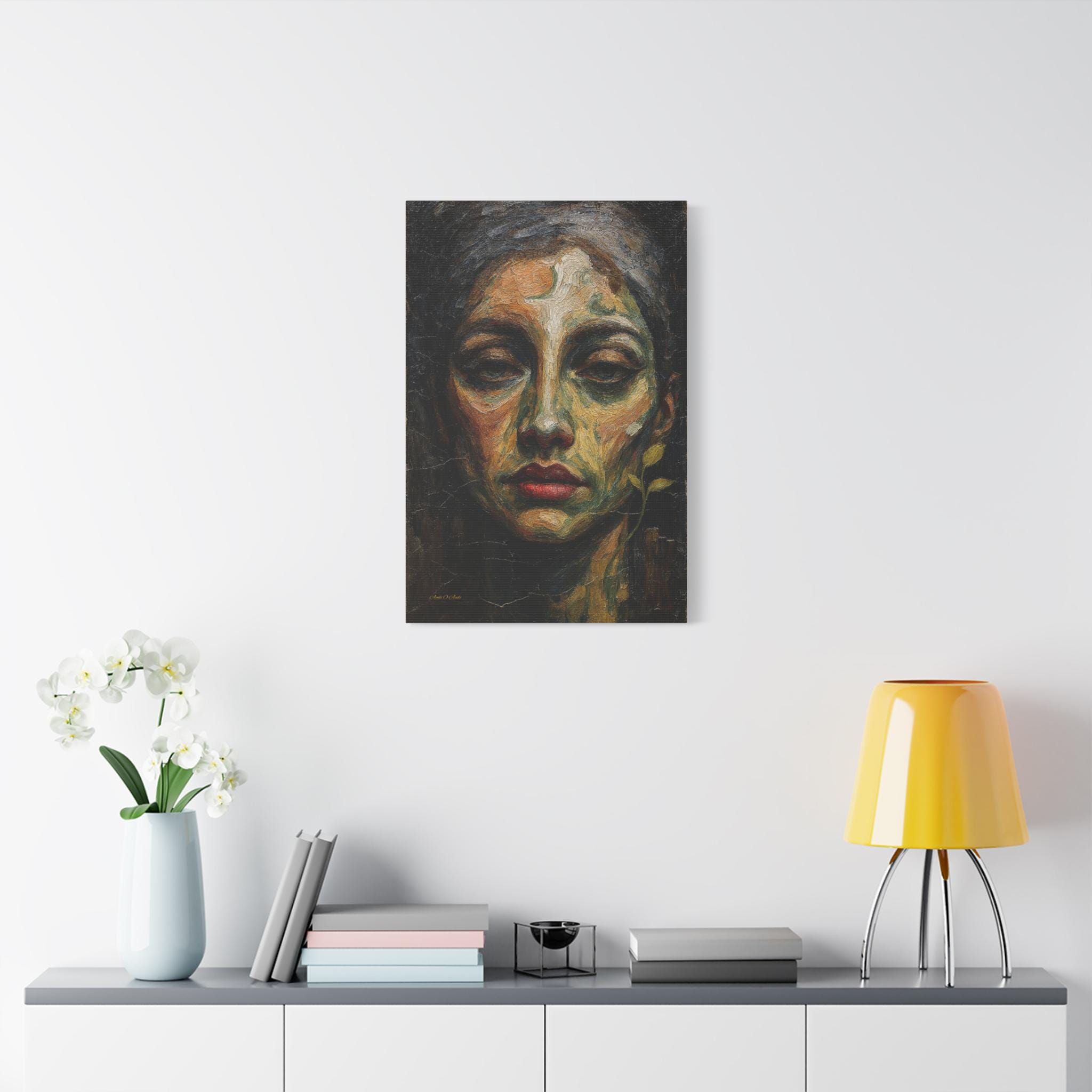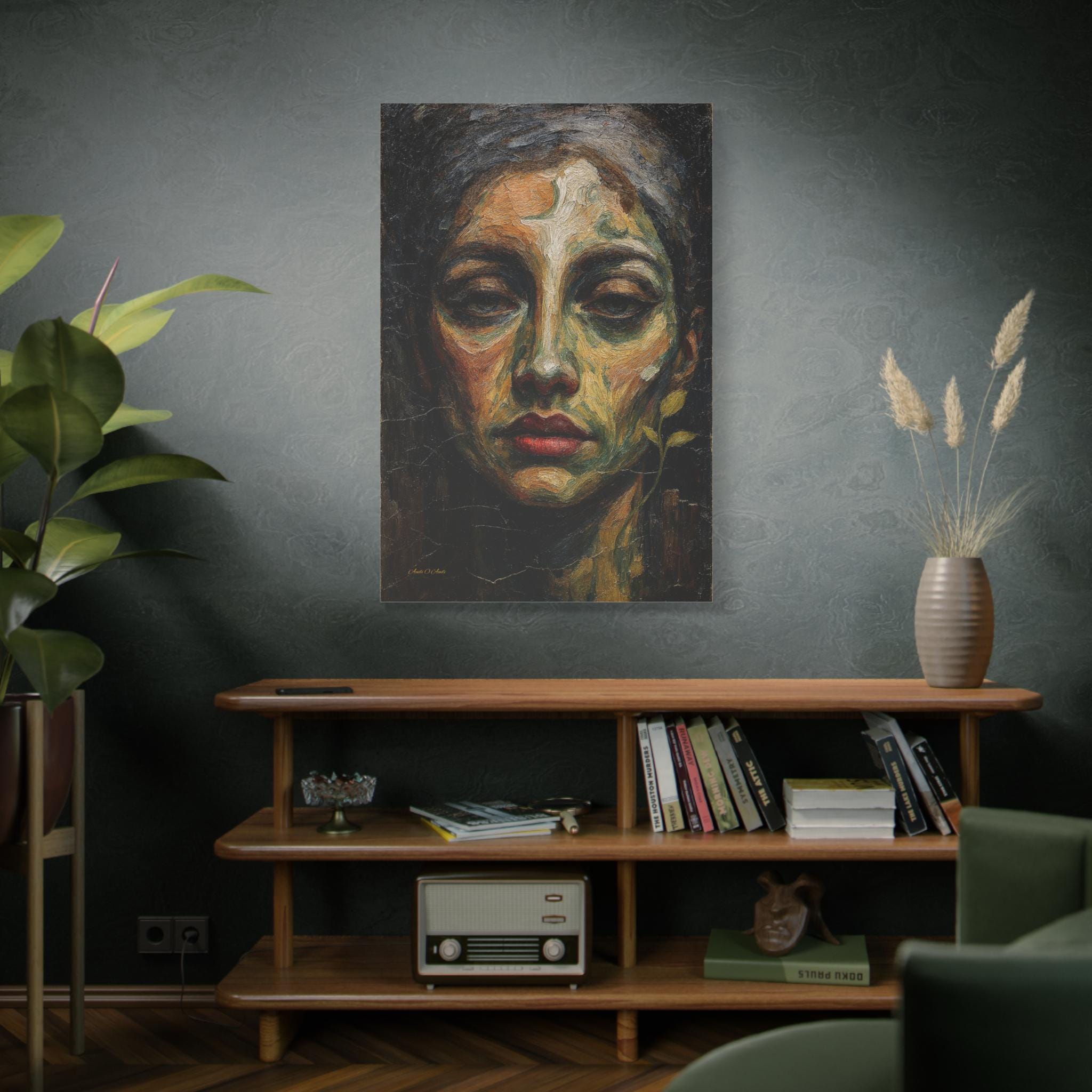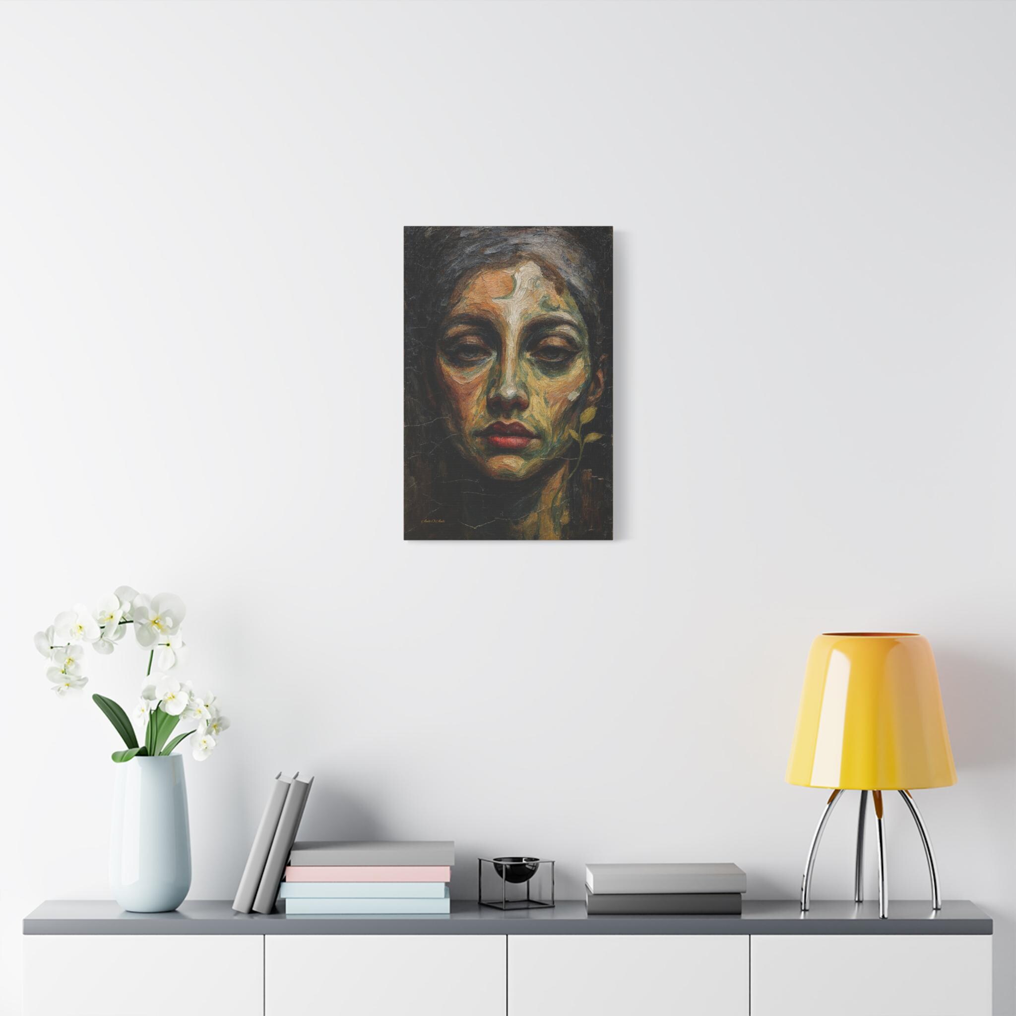 Add a touch of profound, earthy drama to your space with this striking moody female portrait canvas print. This captivating artwork features a close-up, highly textured portrait of a woman with a soulful gaze and vivid red lips. Rendered in deep olive greens, warm ochres, and dark shadows, the composition is enhanced by a delicate, surreal botanical sprout curving along her jawline.