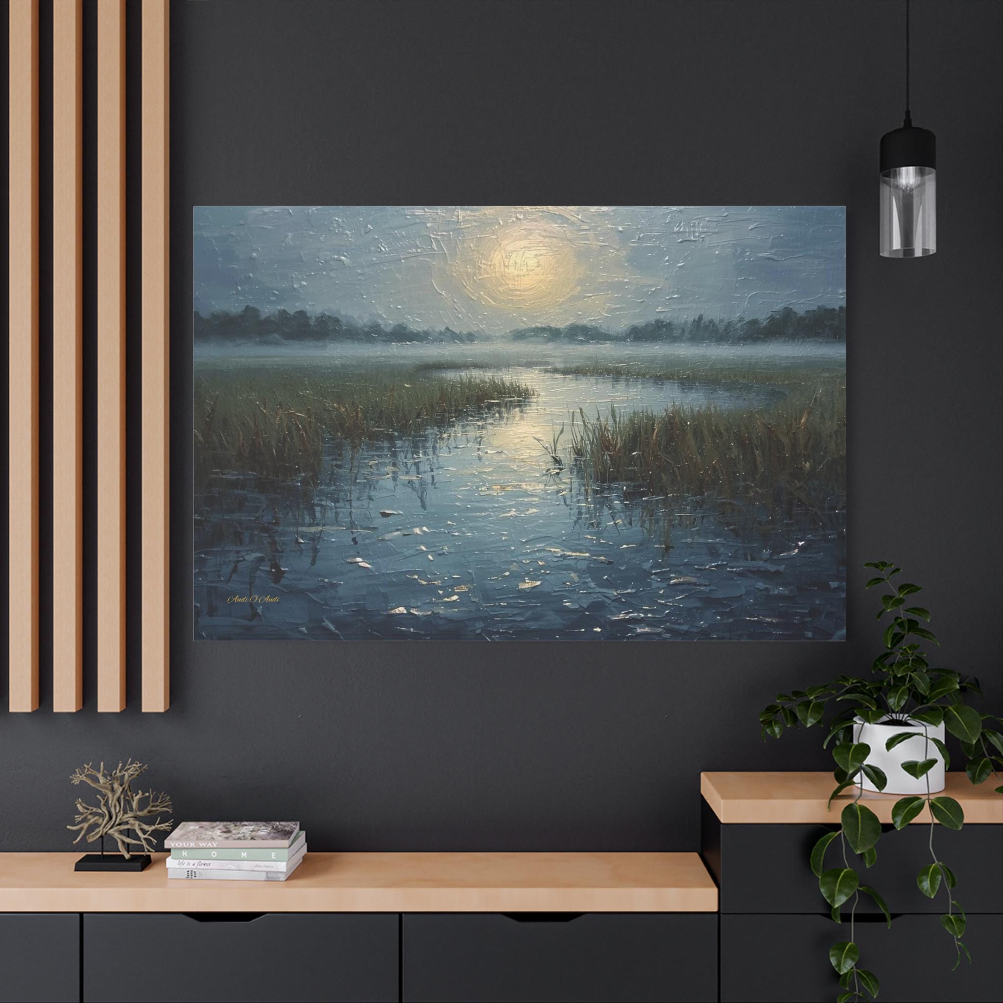 The composition bridges the gap between classic coastal landscapes and modern moody decor. The design utilizes a heavy impasto oil painting style, where thick, expressive palette knife strokes give the water and the marshland an incredibly rich, 3D-like depth. It is the perfect, show-stopping statement piece to elevate a relaxing bathroom sanctuary, a moody bedroom, or a modern coastal living room.