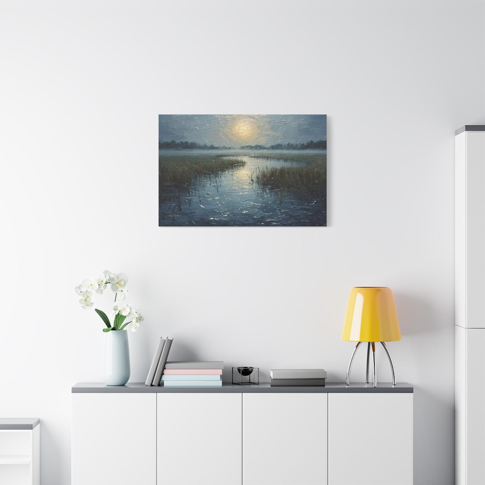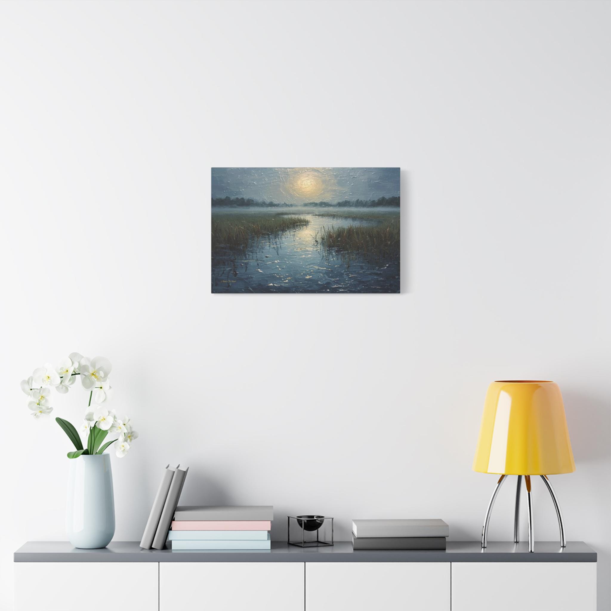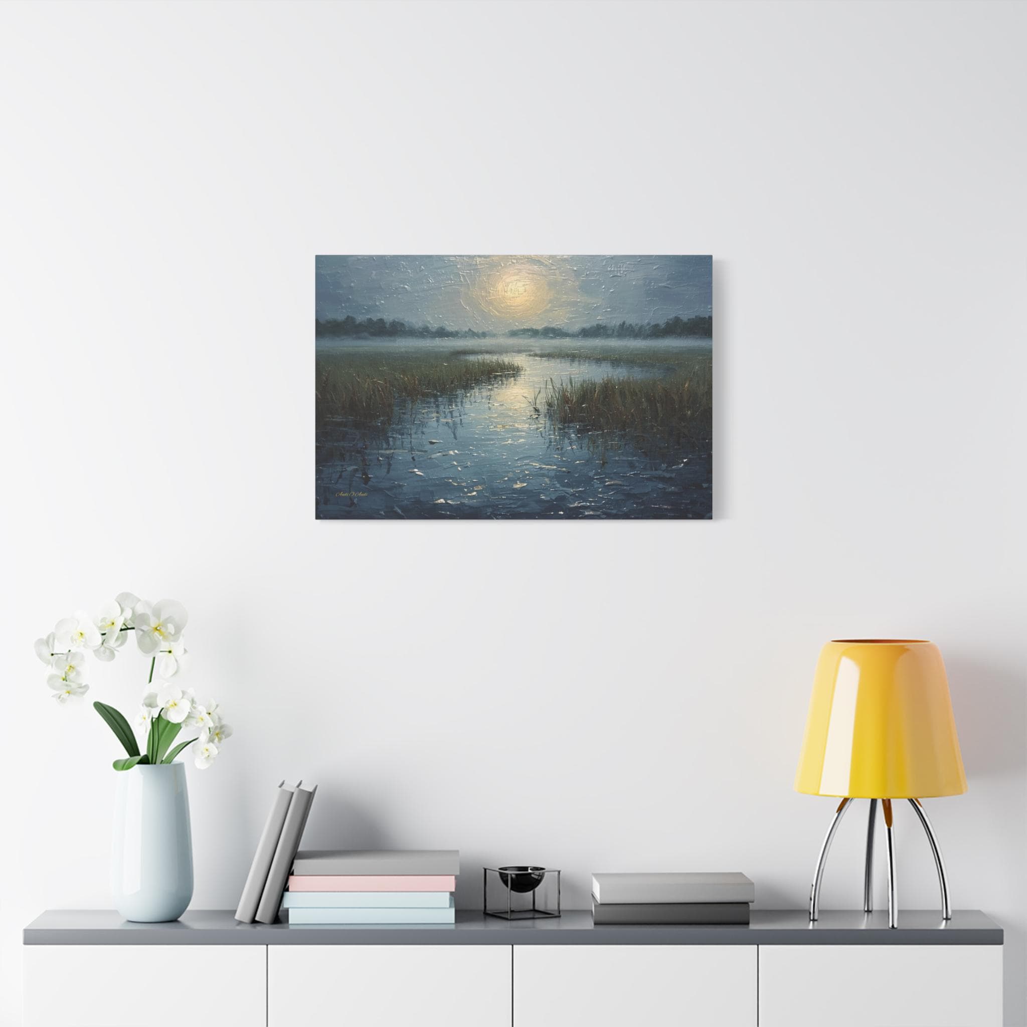 Bring a profound sense of peace and atmospheric beauty to your space with this stunning misty marsh canvas print. This captivating artwork features a quiet wetland waterway cutting through tall grasses, blanketed in a heavy, serene morning fog. A diffused, glowing sun casts a soft, silvery light that reflects beautifully across the textured, rippling water.