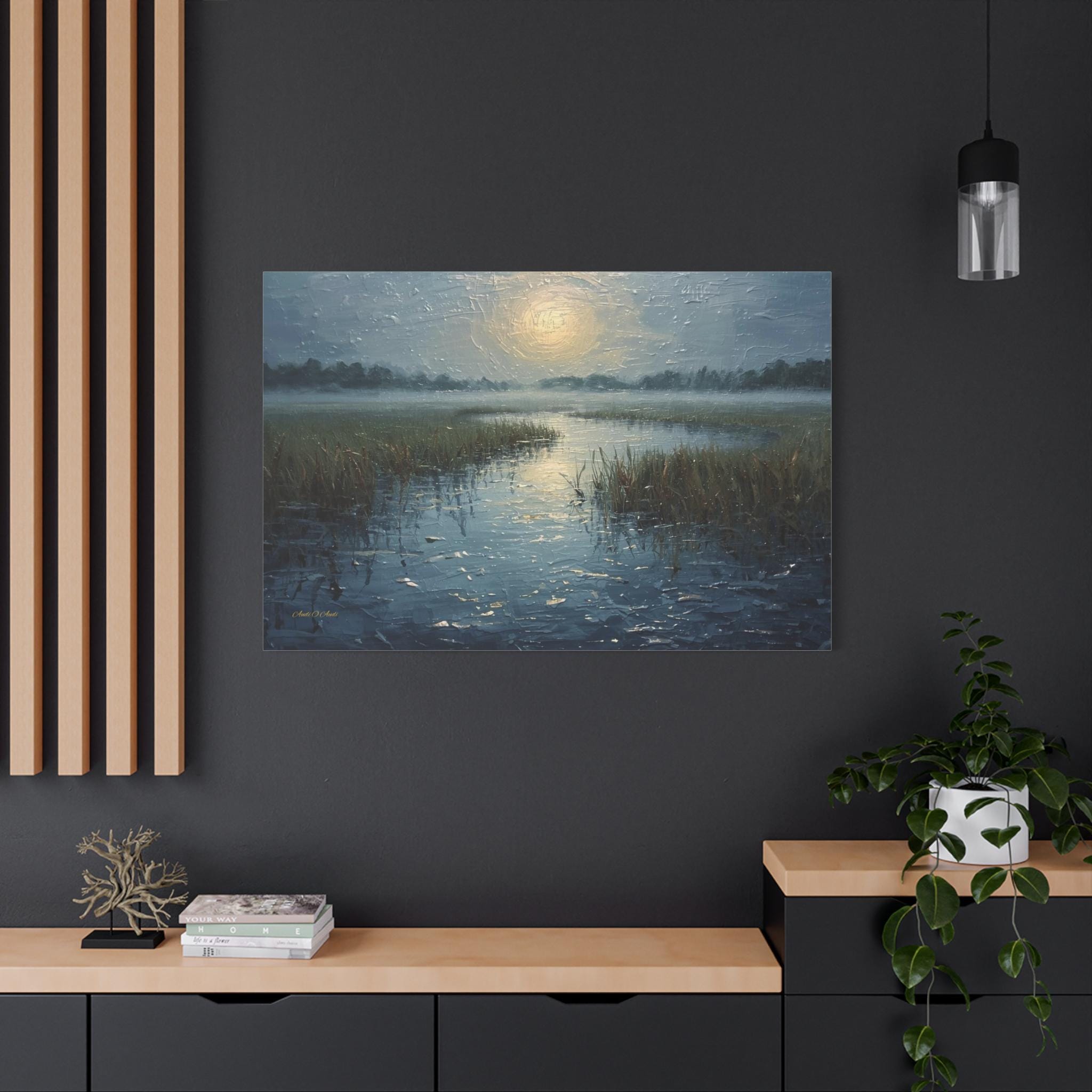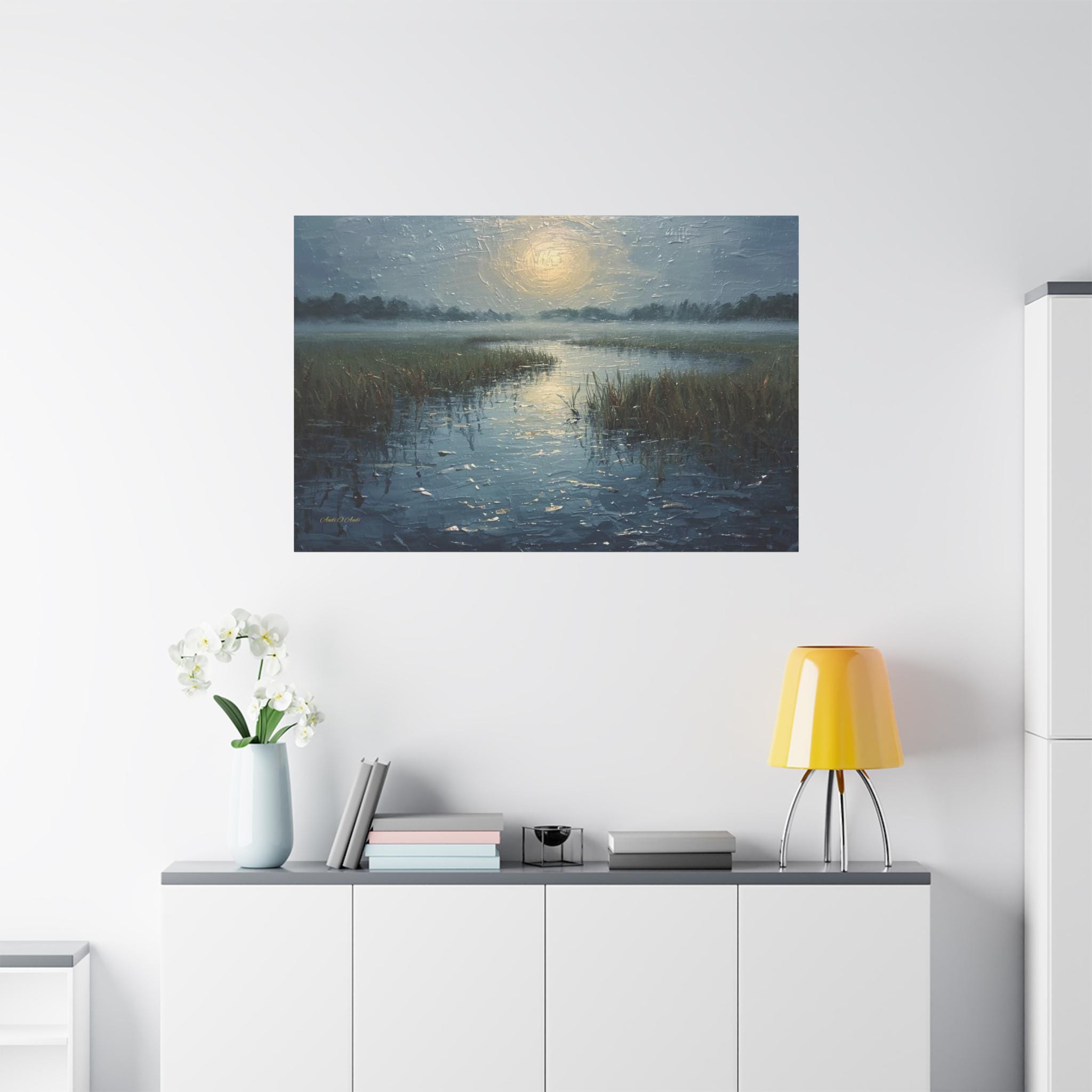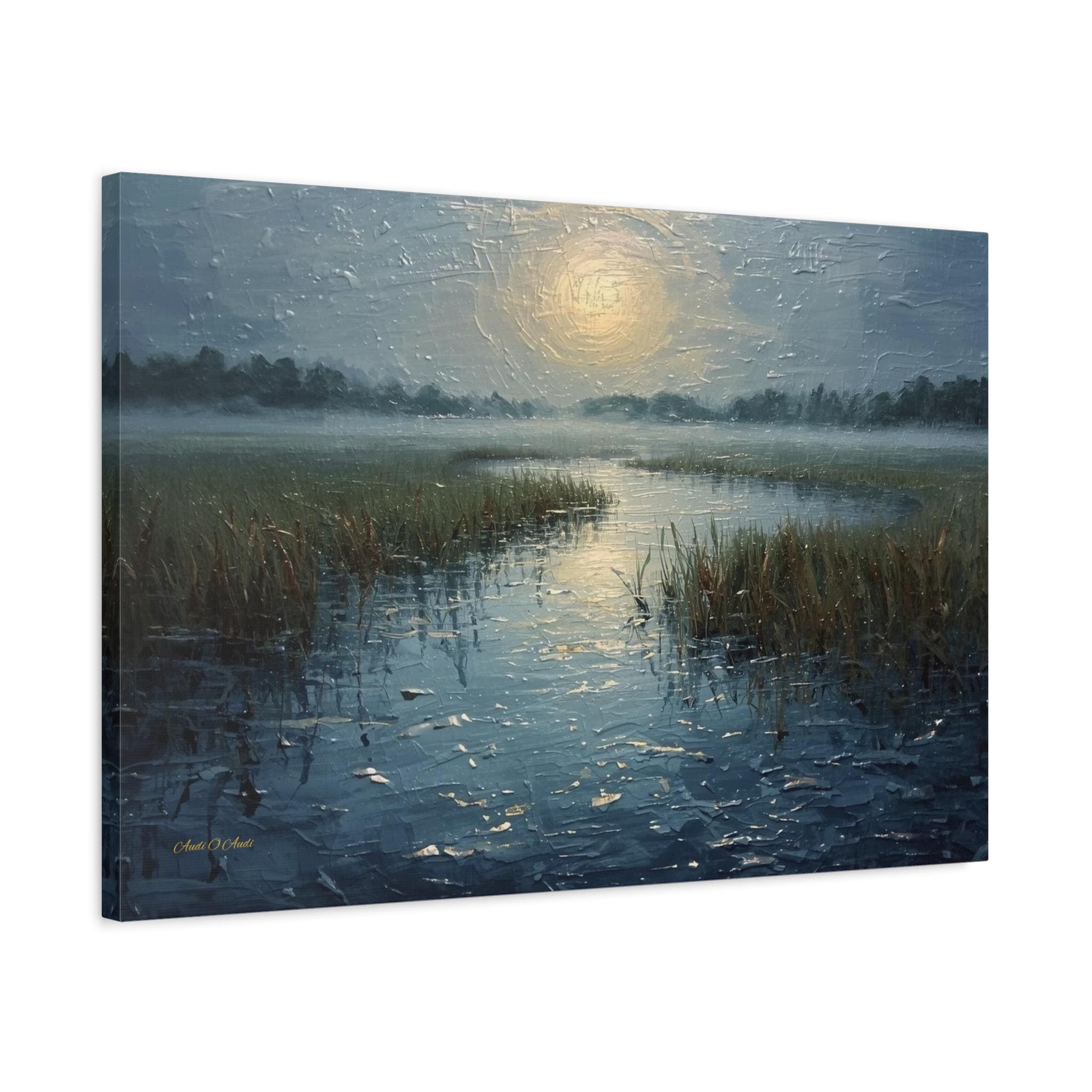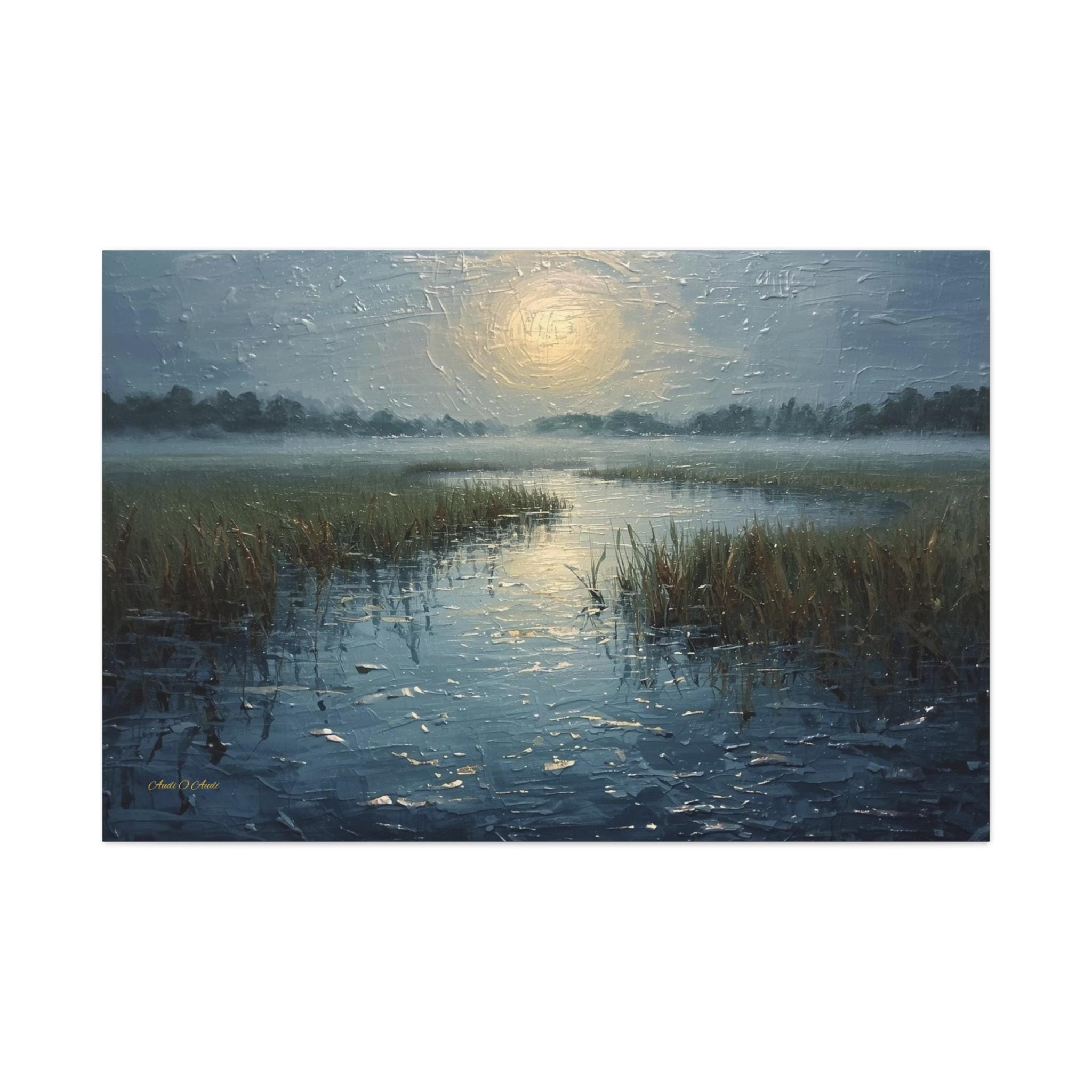Bring a profound sense of peace and atmospheric beauty to your space with this stunning misty marsh canvas print. This captivating artwork features a quiet wetland waterway cutting through tall grasses, blanketed in a heavy, serene morning fog. A diffused, glowing sun casts a soft, silvery light that reflects beautifully across the textured, rippling water.