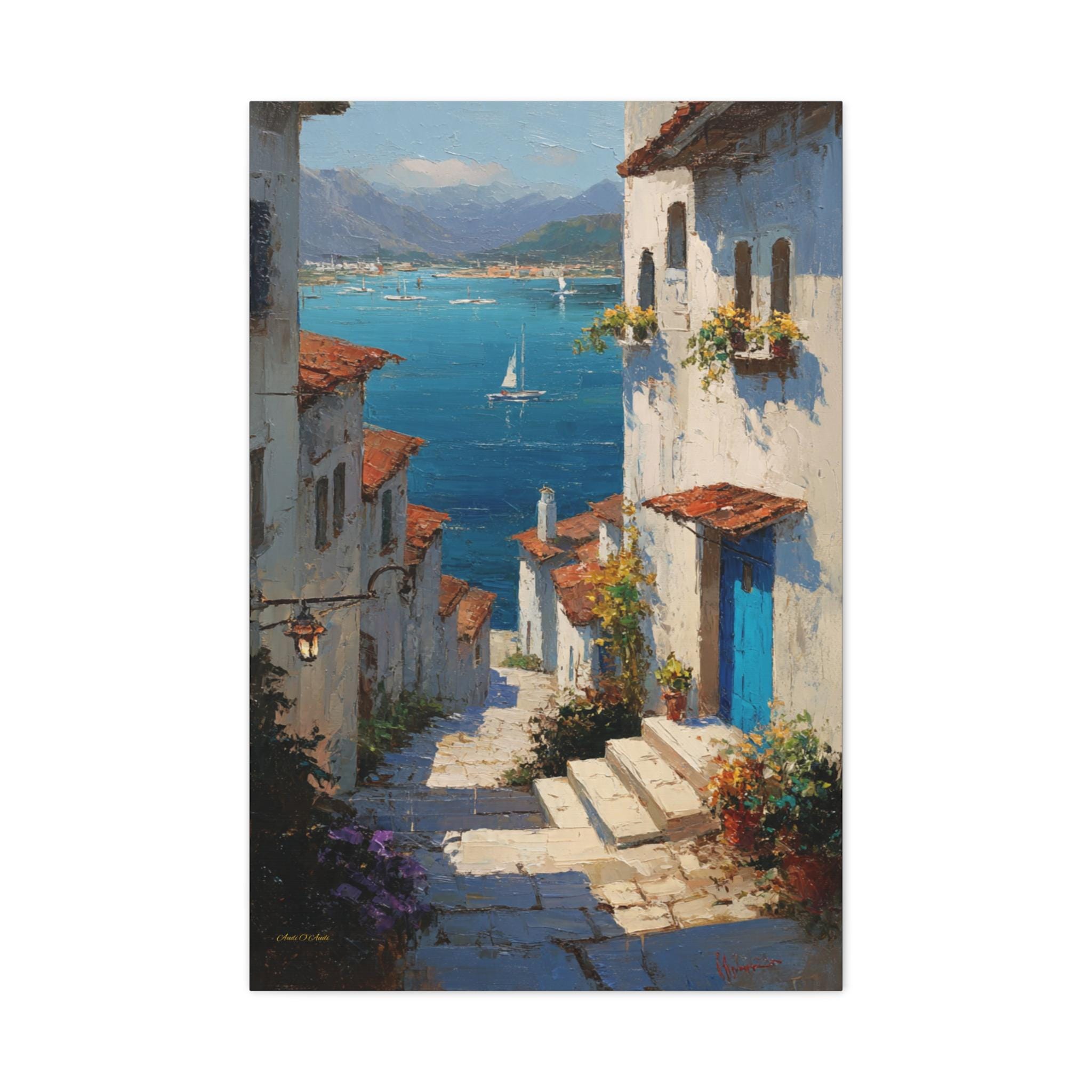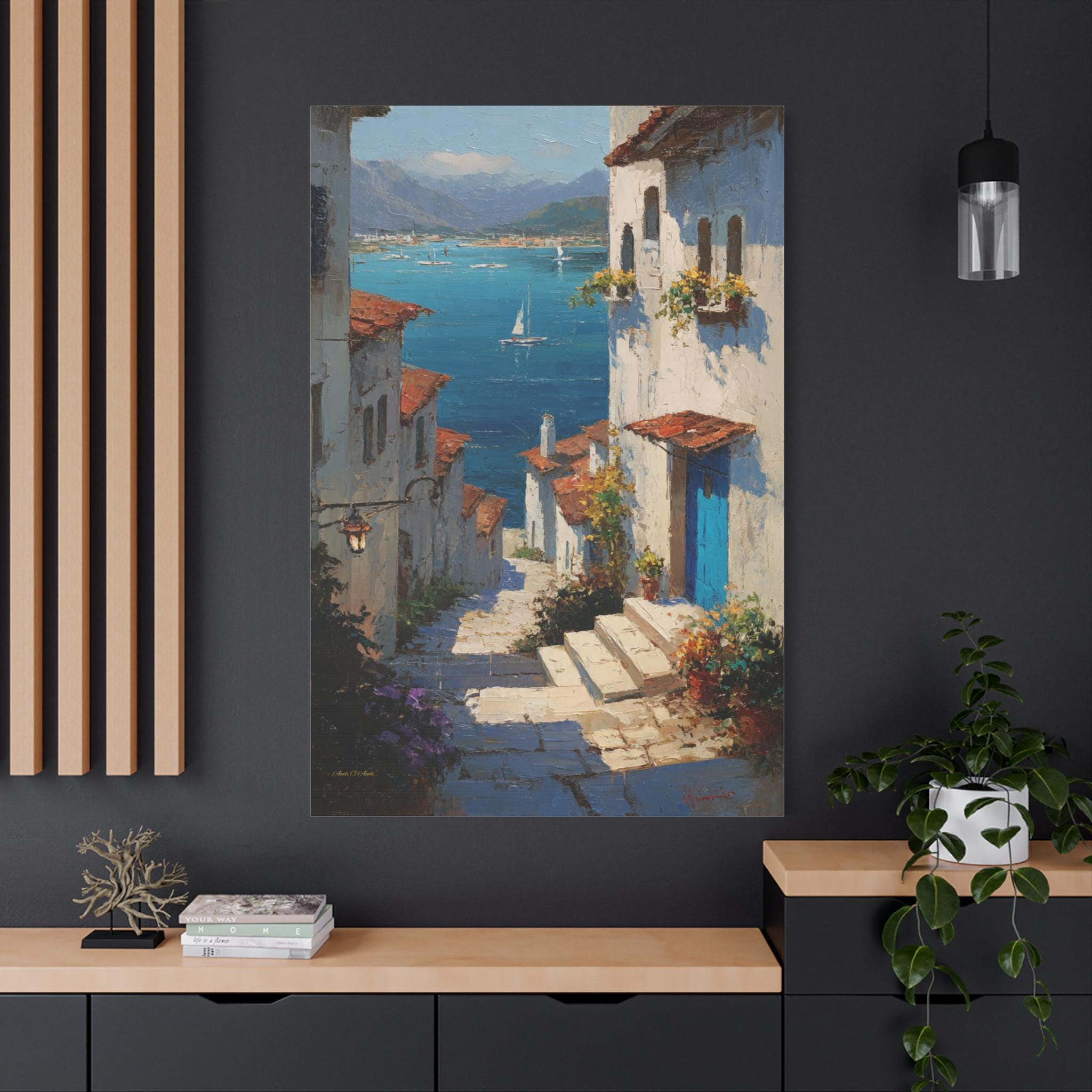 Bring the breathtaking, sun-drenched romance of the European coastline into your home with this stunning Mediterranean village canvas print. This captivating vertical artwork features a charming, narrow stairway winding down between classic white stucco homes with terracotta roofs and a vibrant blue door. At the end of the path, the view opens up to a brilliant, sparkling blue ocean dotted with sailboats beneath distant mountain peaks.