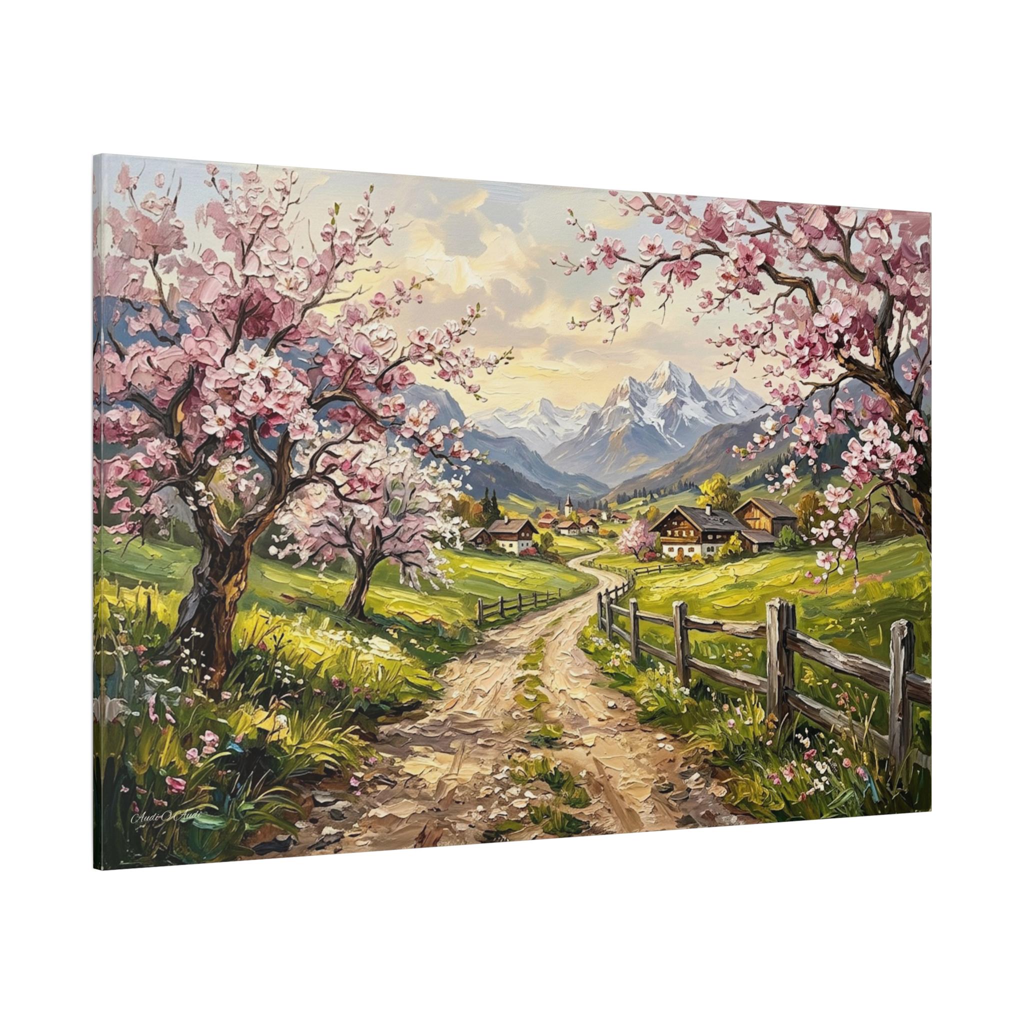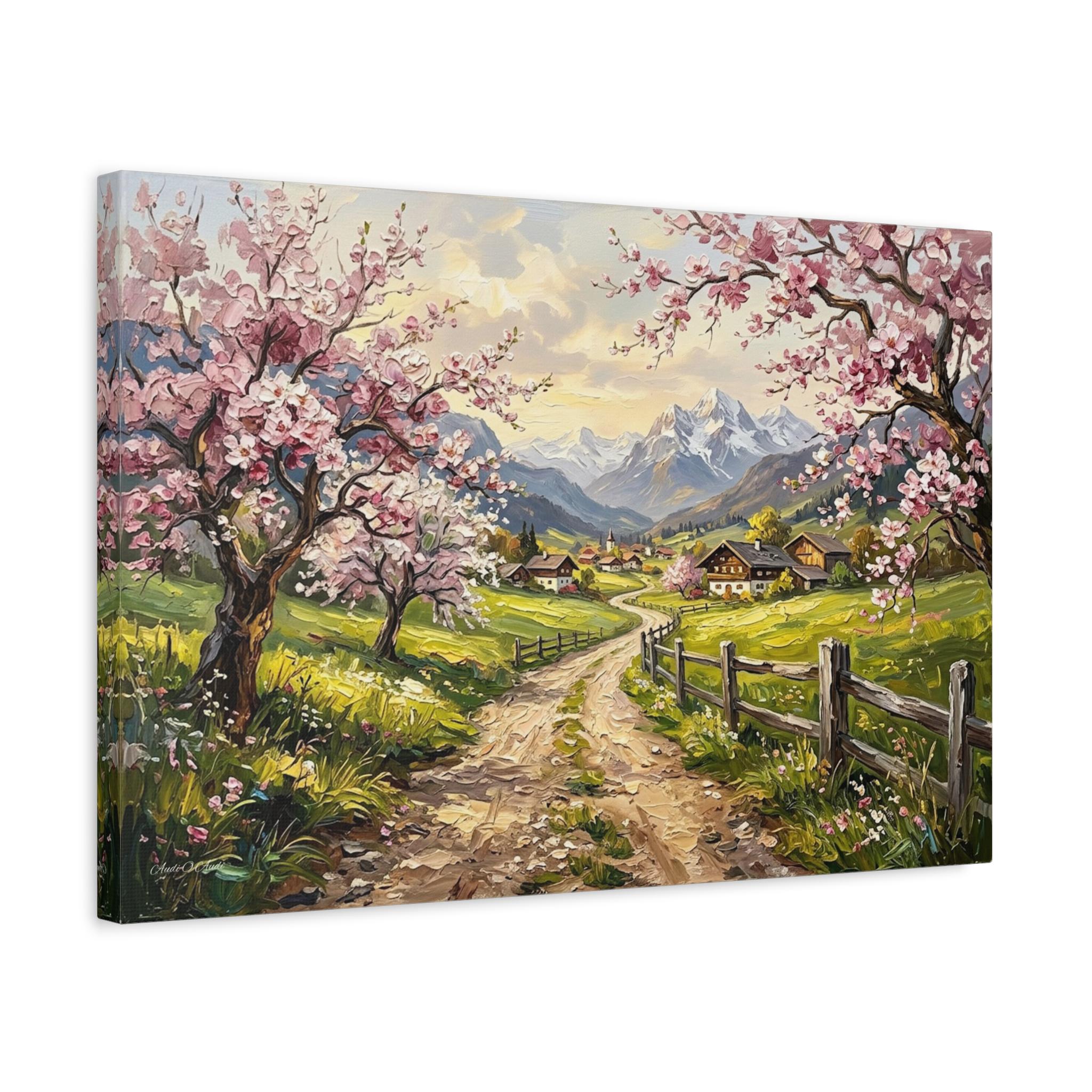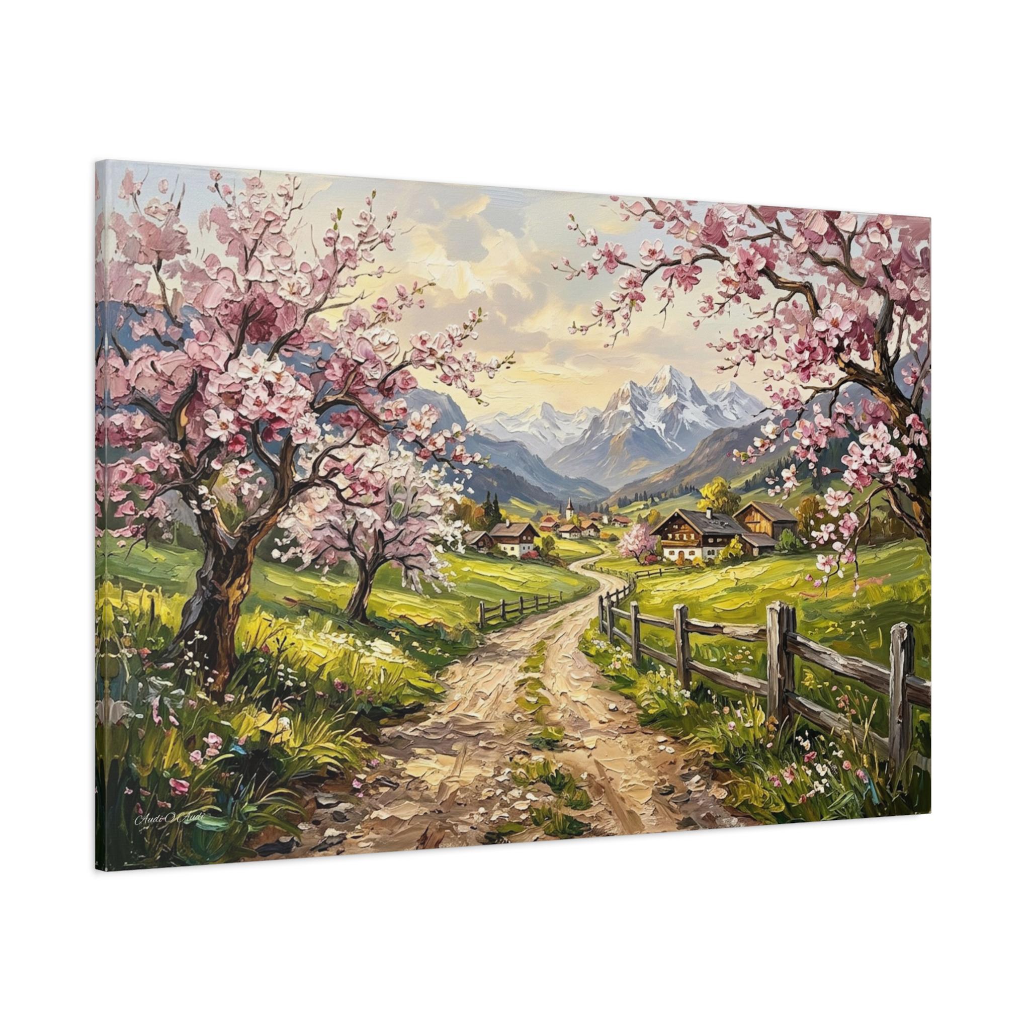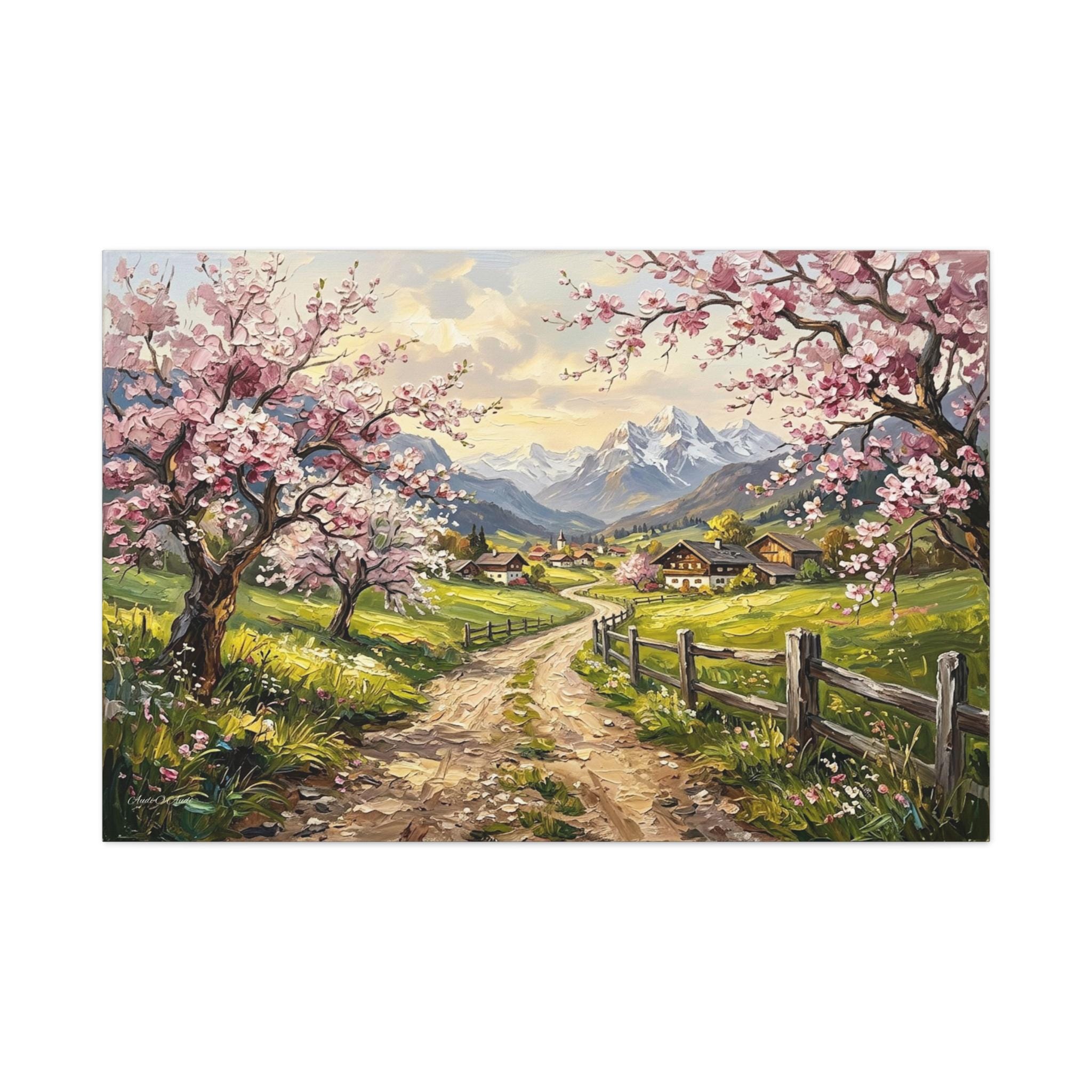 Bring the breathtaking, vibrant beauty of a spring morning in the mountains into your home with this stunning cherry blossom landscape canvas print. This captivating artwork features a rustic, winding dirt road leading through lush green pastures toward a quaint, peaceful alpine village. The scene is beautifully framed by blooming pink cherry blossom trees in the foreground and majestic, snow-capped mountain peaks in the distance.