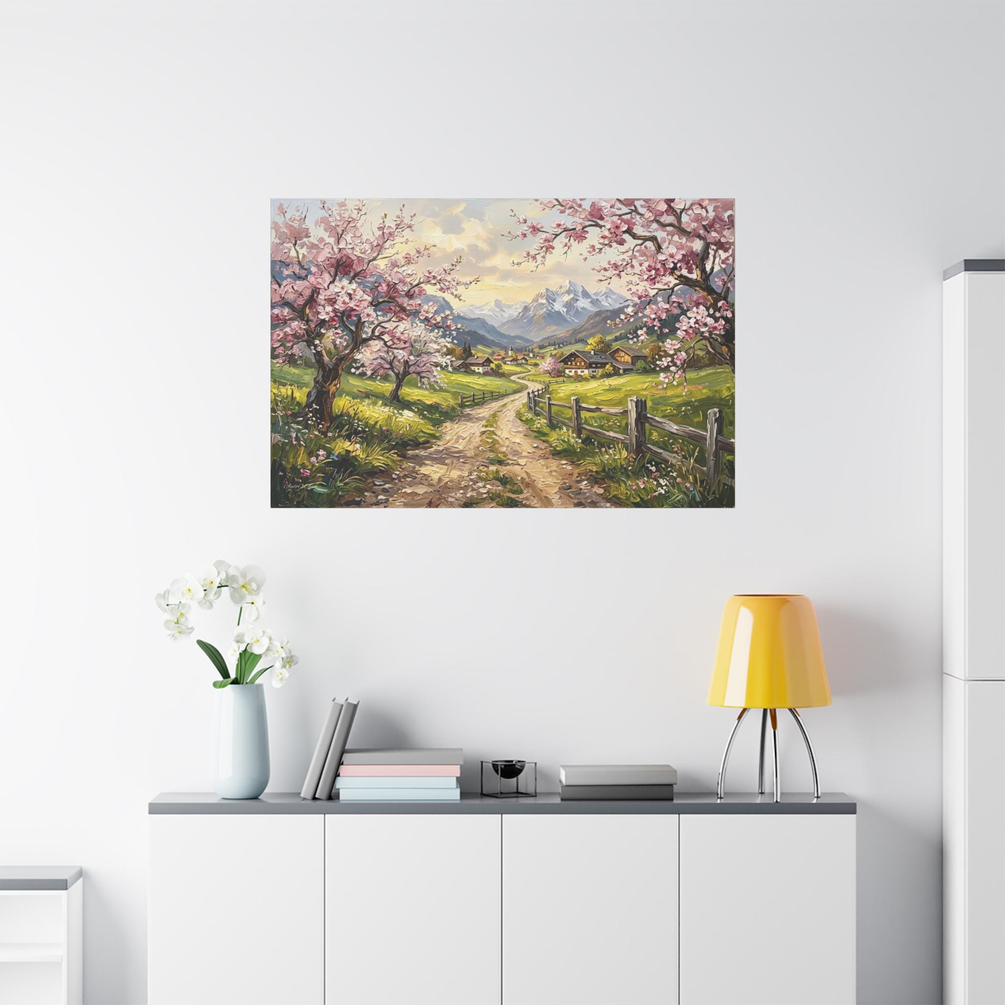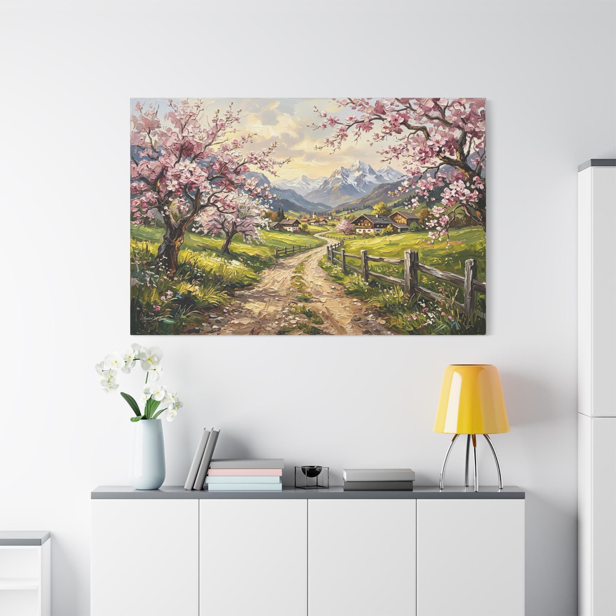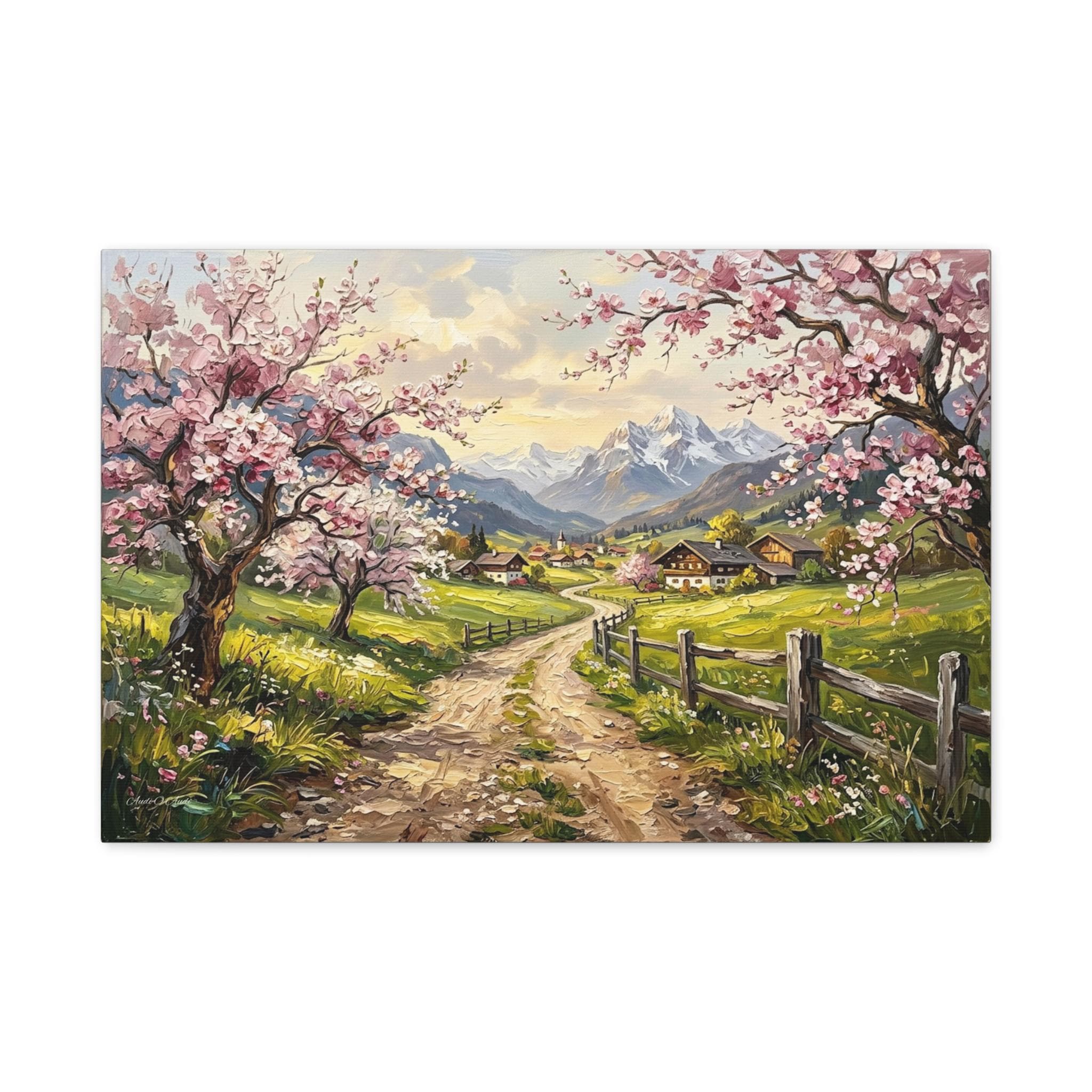 Bring the breathtaking, vibrant beauty of a spring morning in the mountains into your home with this stunning cherry blossom landscape canvas print. This captivating artwork features a rustic, winding dirt road leading through lush green pastures toward a quaint, peaceful alpine village. The scene is beautifully framed by blooming pink cherry blossom trees in the foreground and majestic, snow-capped mountain peaks in the distance.