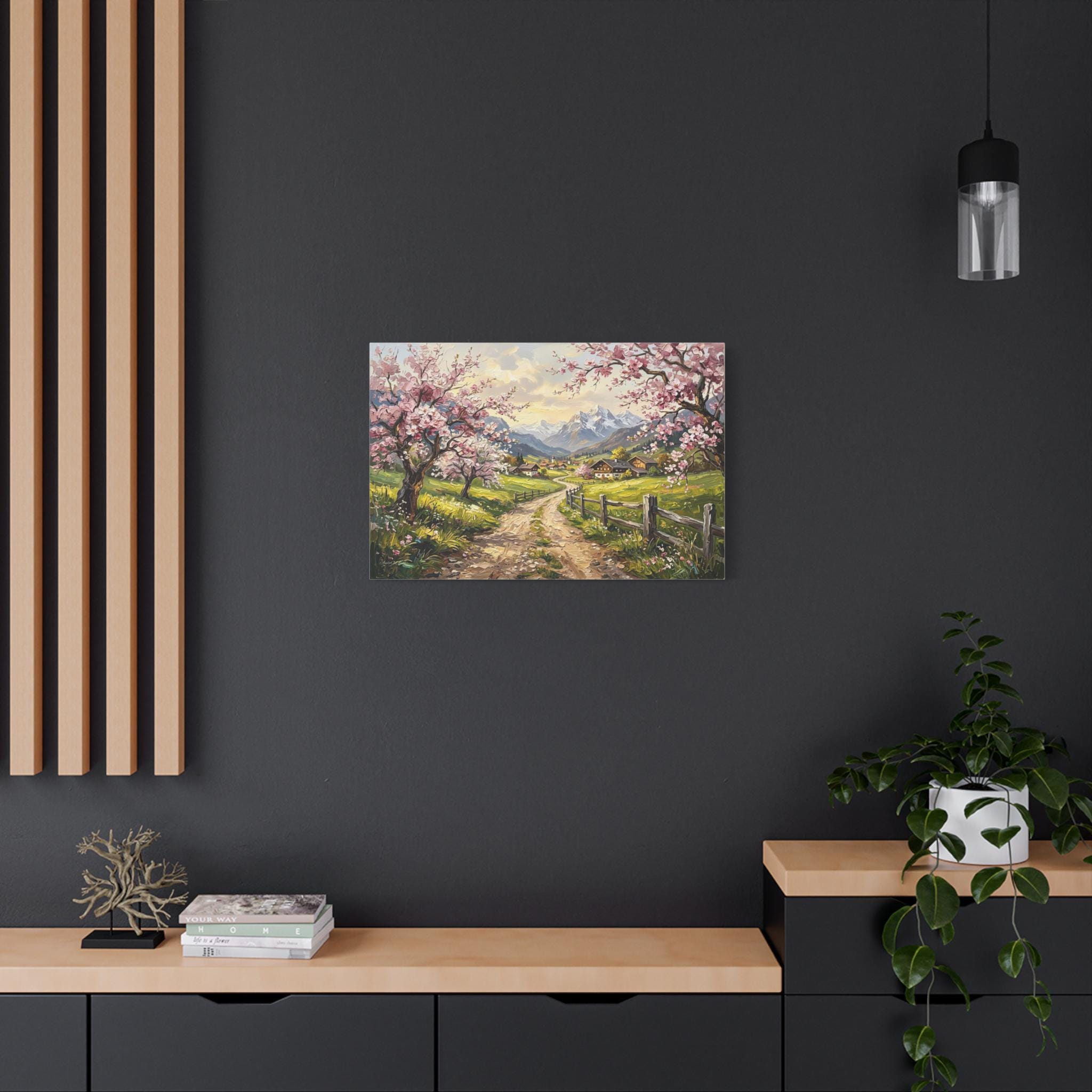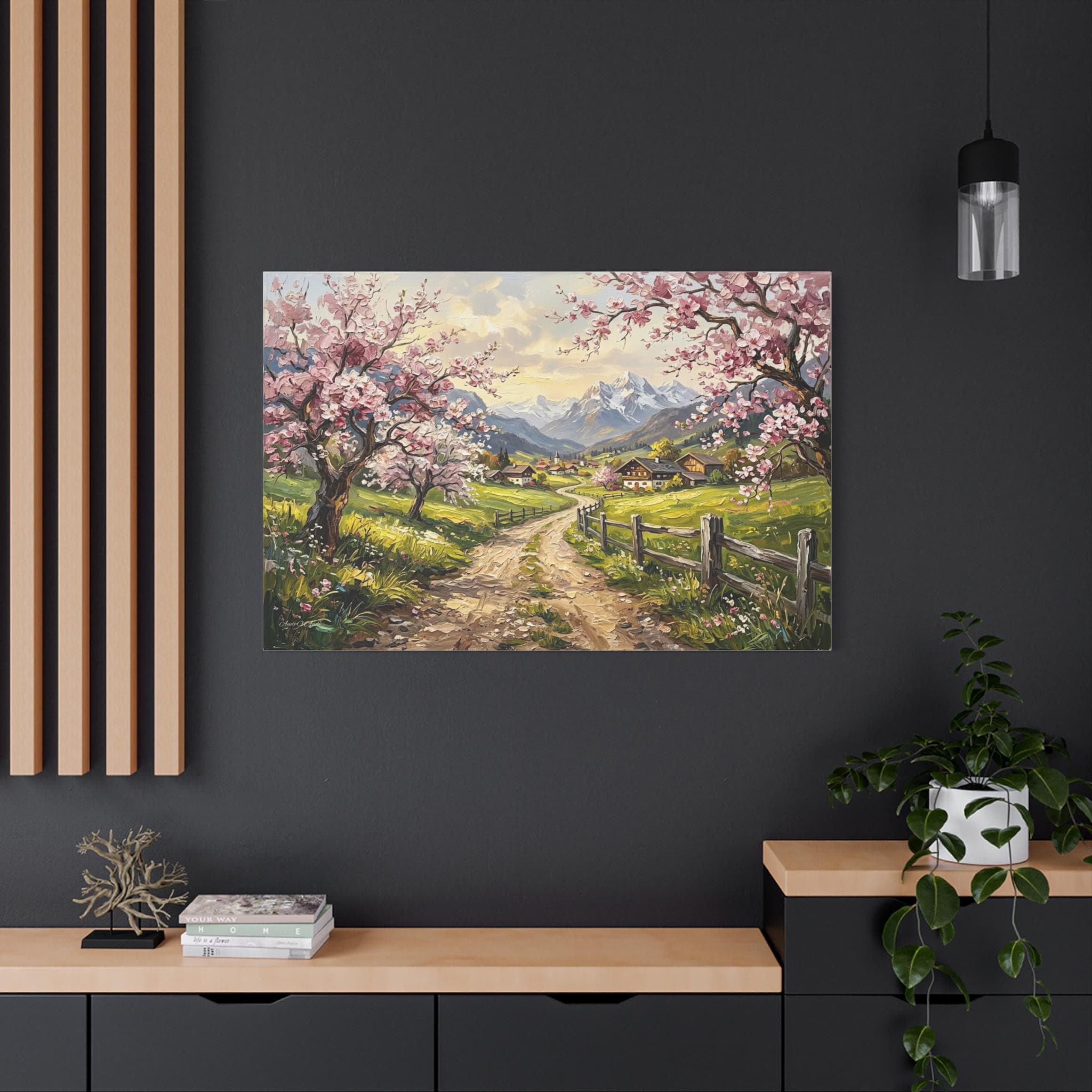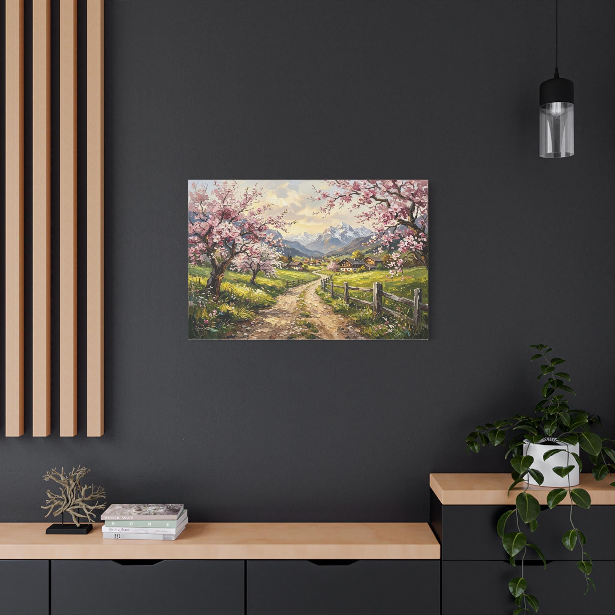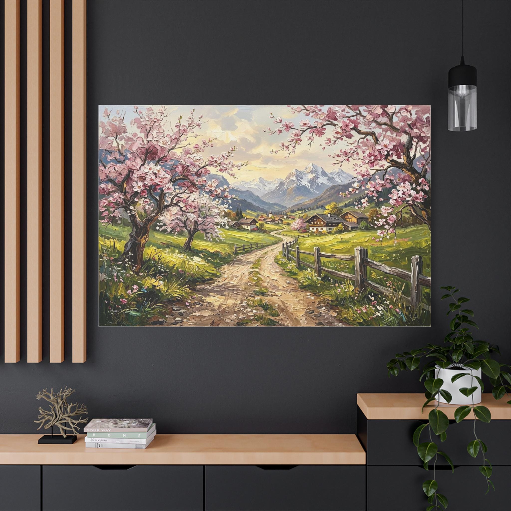 Bring the breathtaking, vibrant beauty of a spring morning in the mountains into your home with this stunning cherry blossom landscape canvas print. This captivating artwork features a rustic, winding dirt road leading through lush green pastures toward a quaint, peaceful alpine village. The scene is beautifully framed by blooming pink cherry blossom trees in the foreground and majestic, snow-capped mountain peaks in the distance.