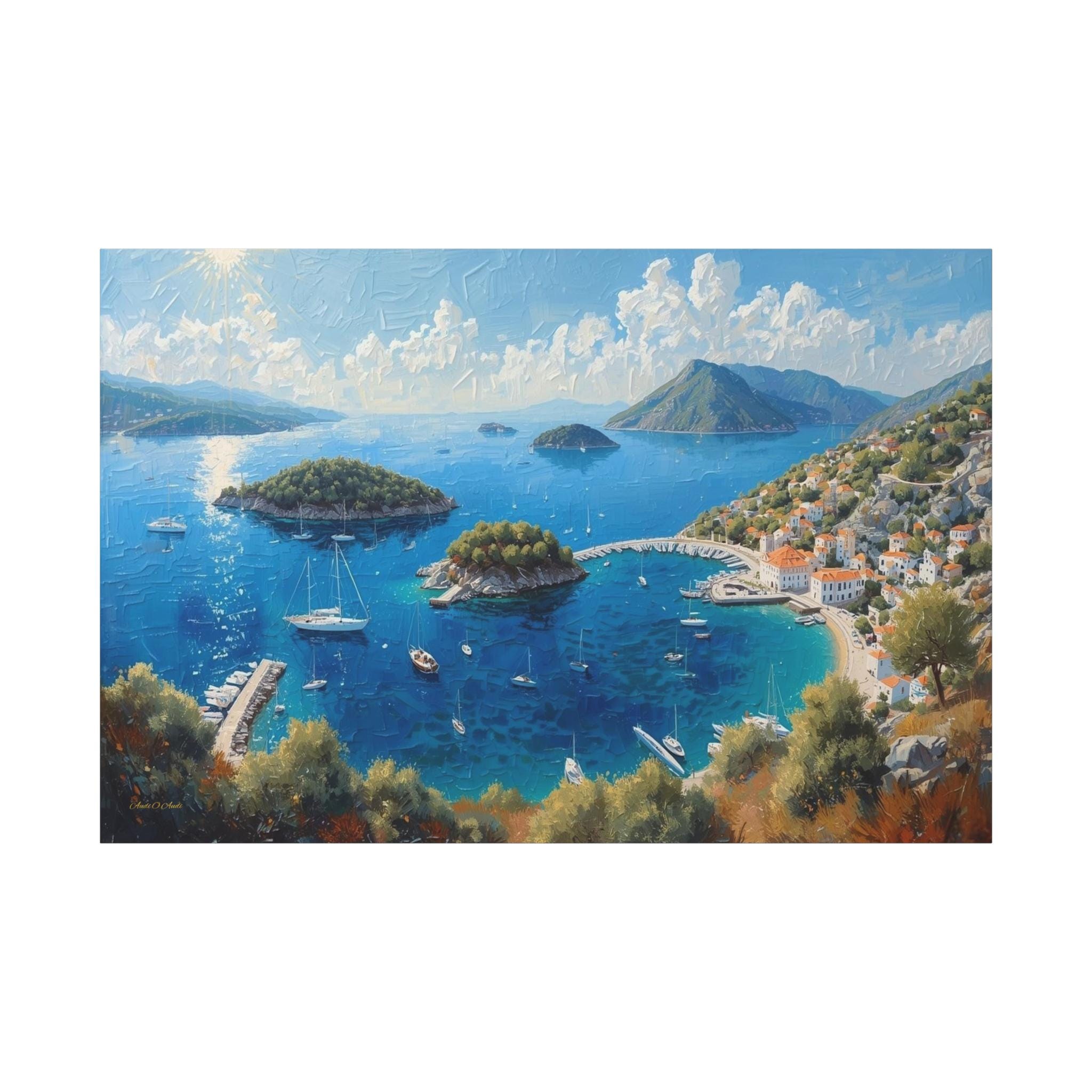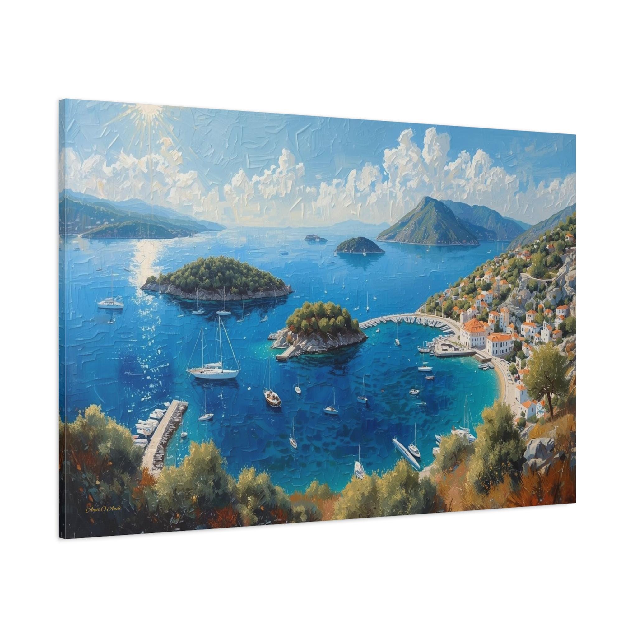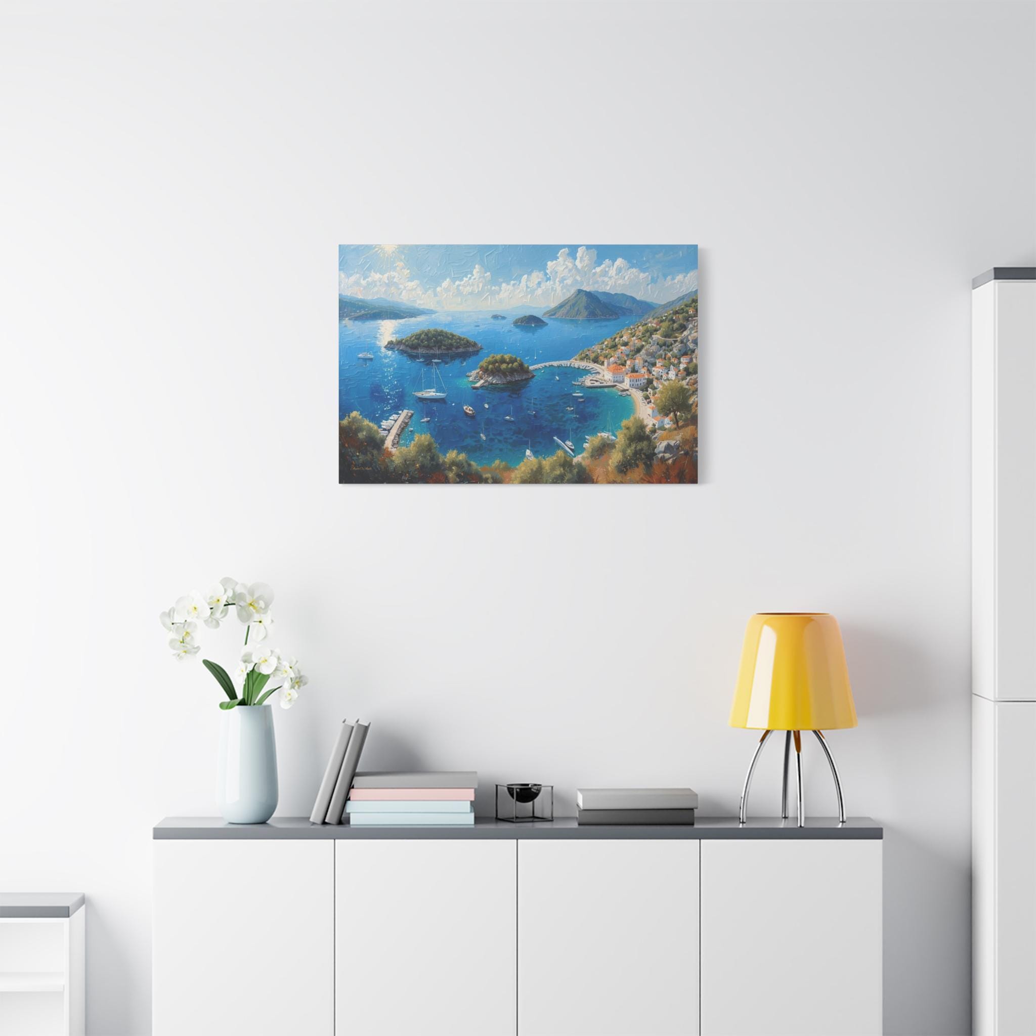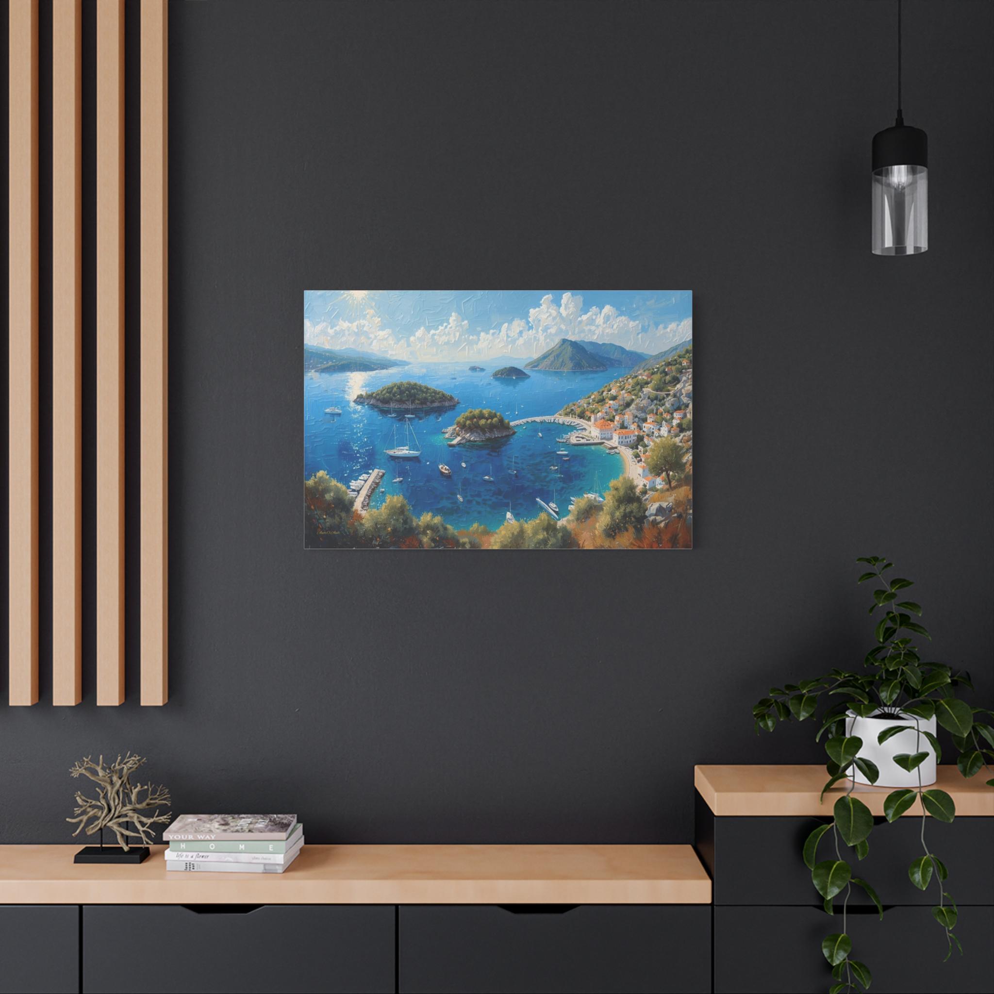 Bring the breathtaking, sun-drenched romance of the European coastline into your home with this stunning panoramic Mediterranean bay canvas print. This captivating artwork features a sweeping, aerial view of a vibrant blue gulf dotted with lush islands and pristine white sailboats. On the right, a charming coastal village with classic white stucco buildings and terracotta roofs nestles perfectly into the rolling green hillsides.