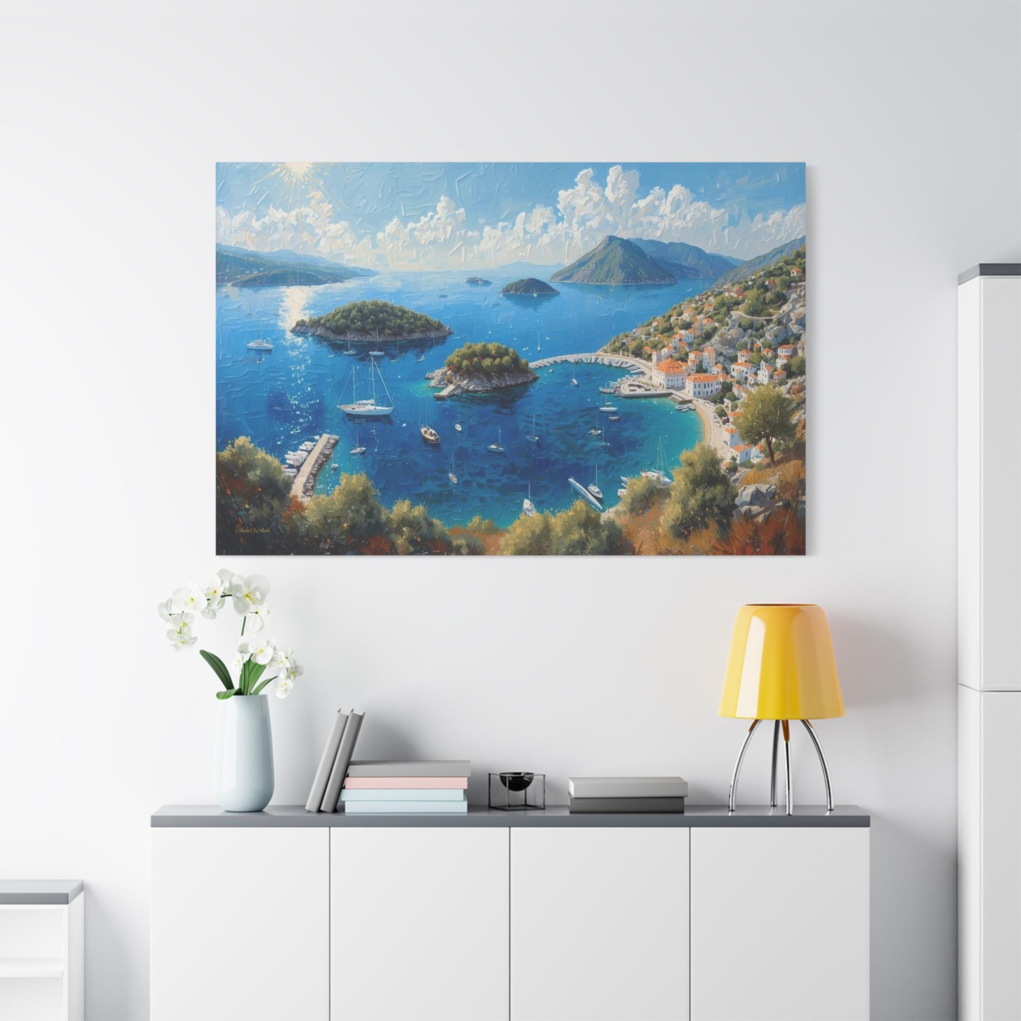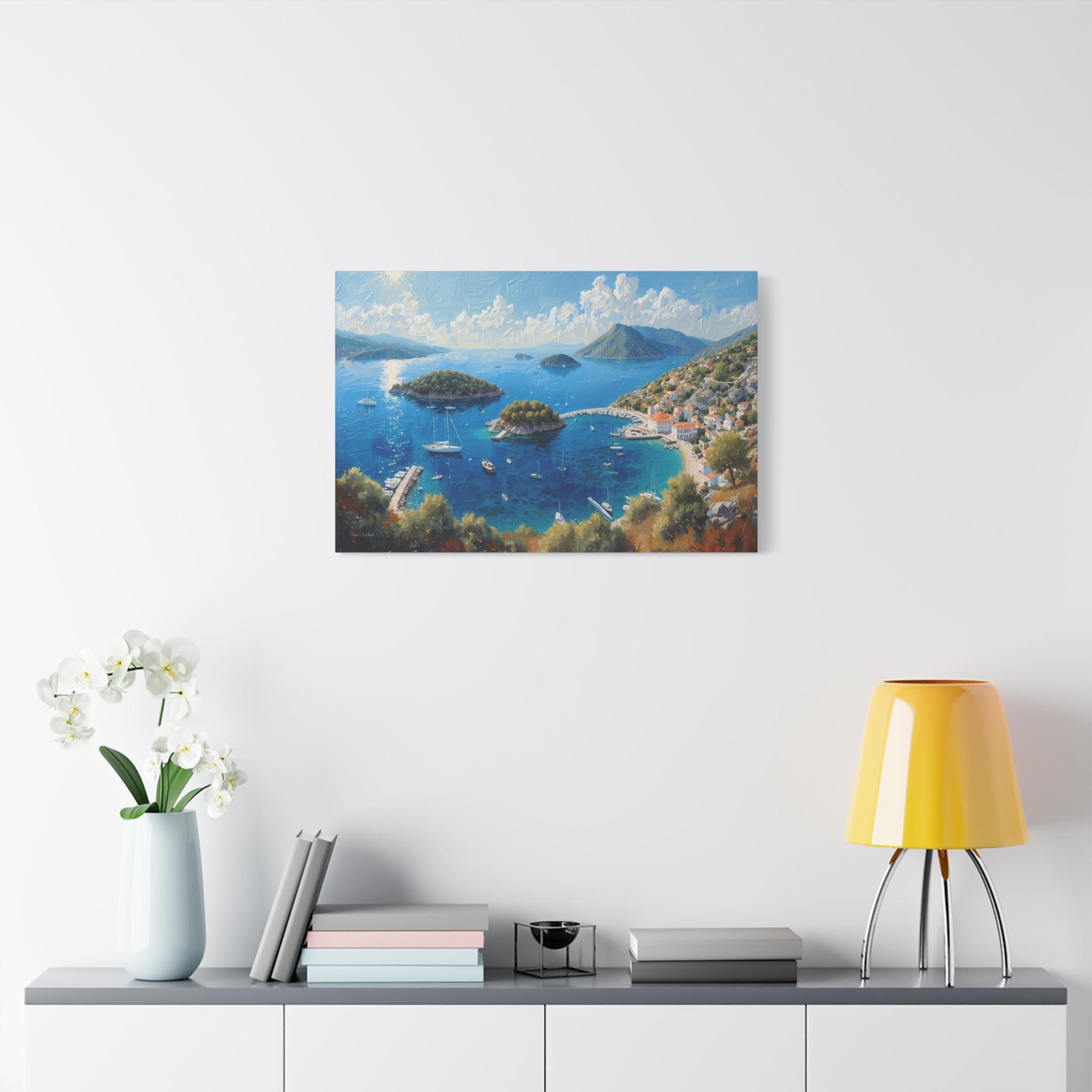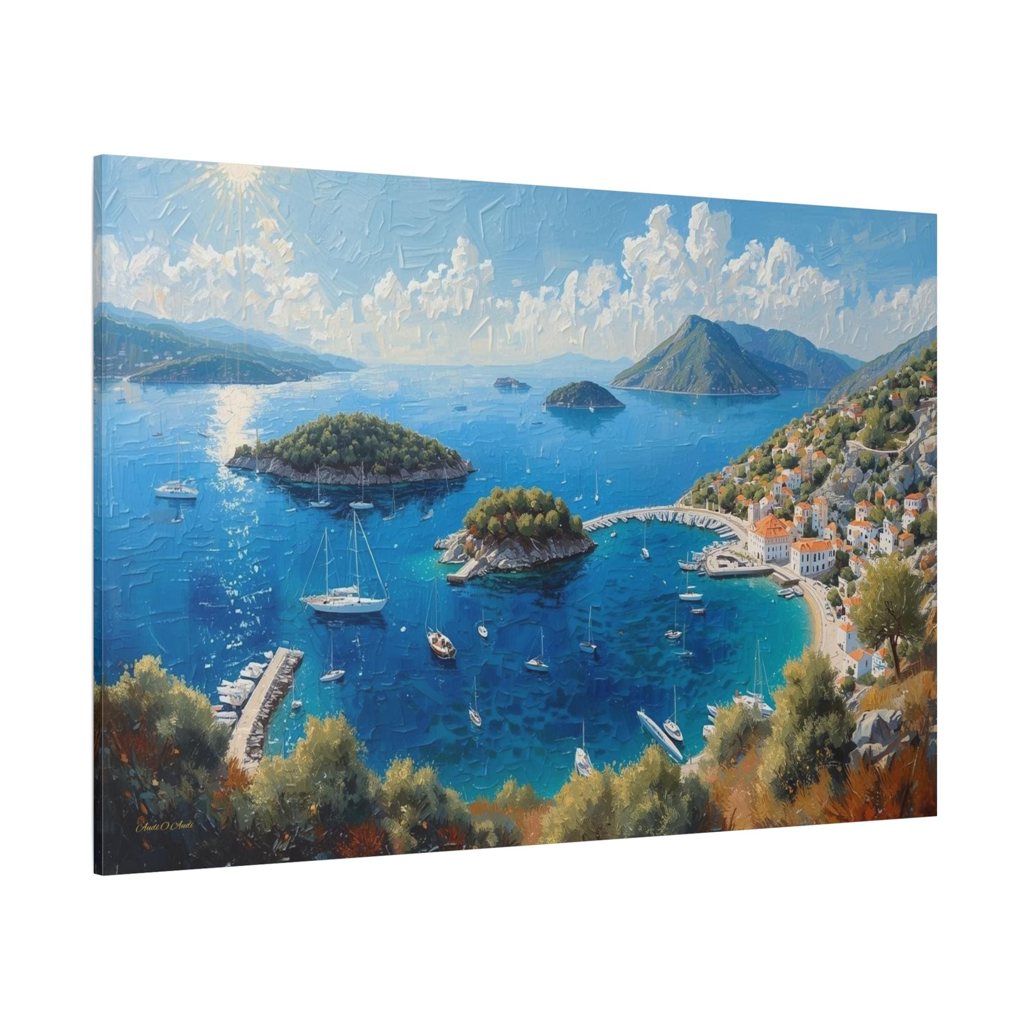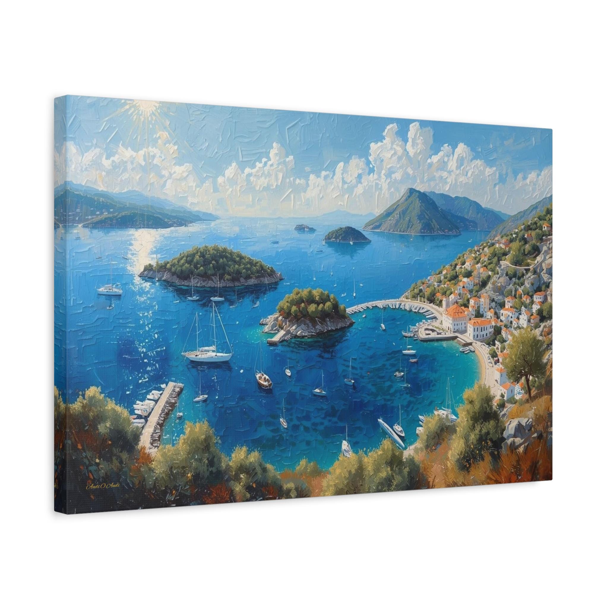 Bring the breathtaking, sun-drenched romance of the European coastline into your home with this stunning panoramic Mediterranean bay canvas print. This captivating artwork features a sweeping, aerial view of a vibrant blue gulf dotted with lush islands and pristine white sailboats. On the right, a charming coastal village with classic white stucco buildings and terracotta roofs nestles perfectly into the rolling green hillsides.